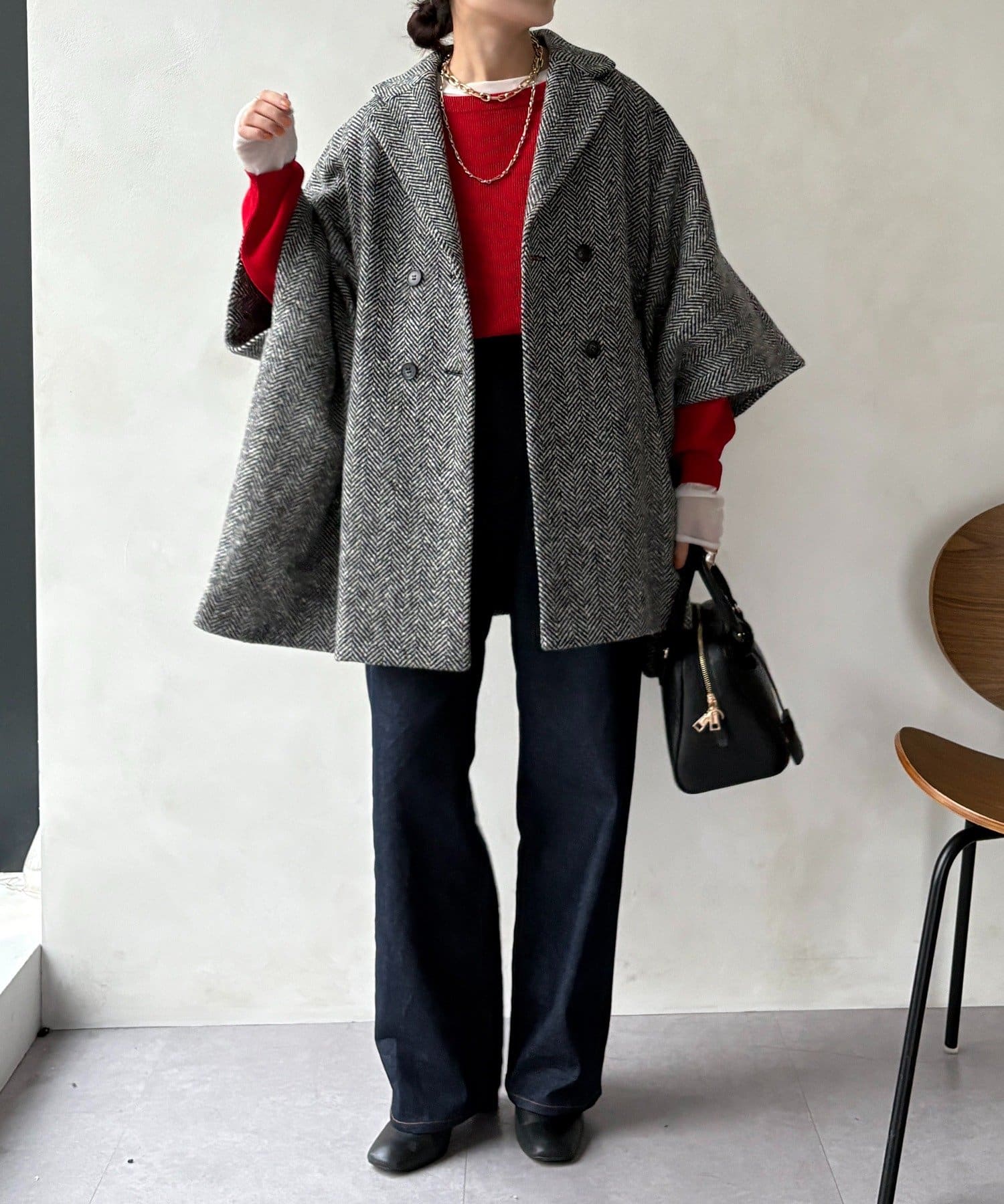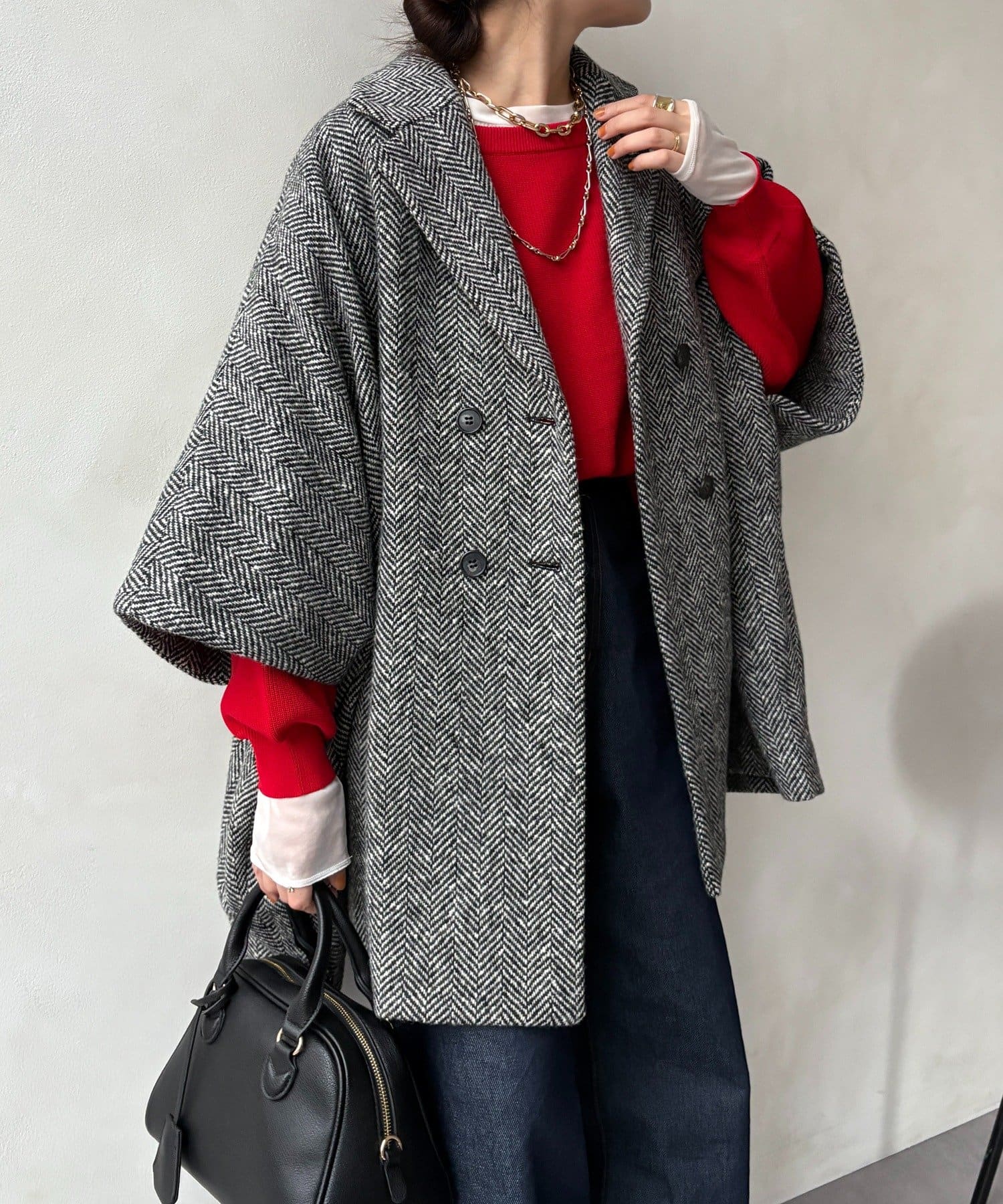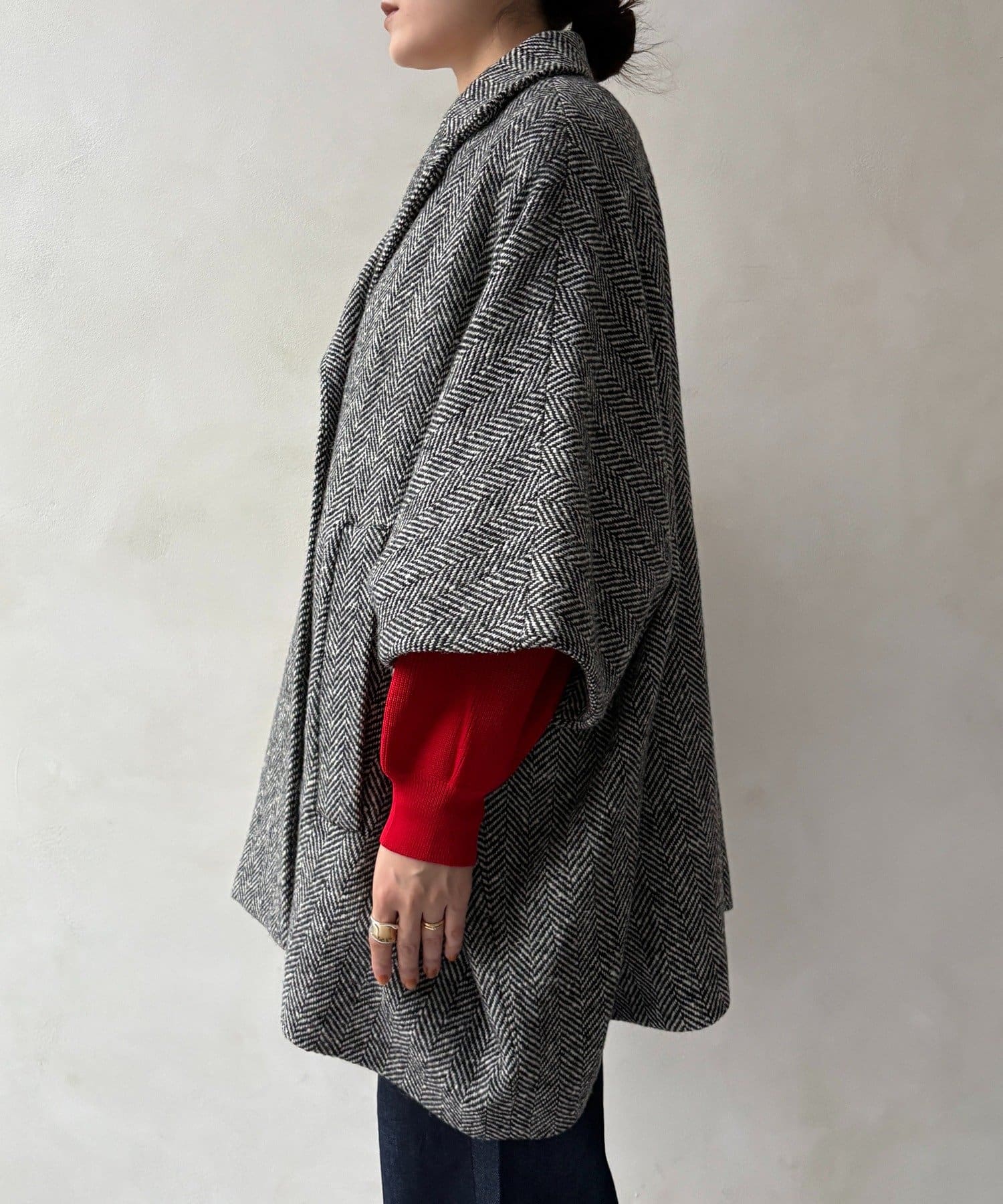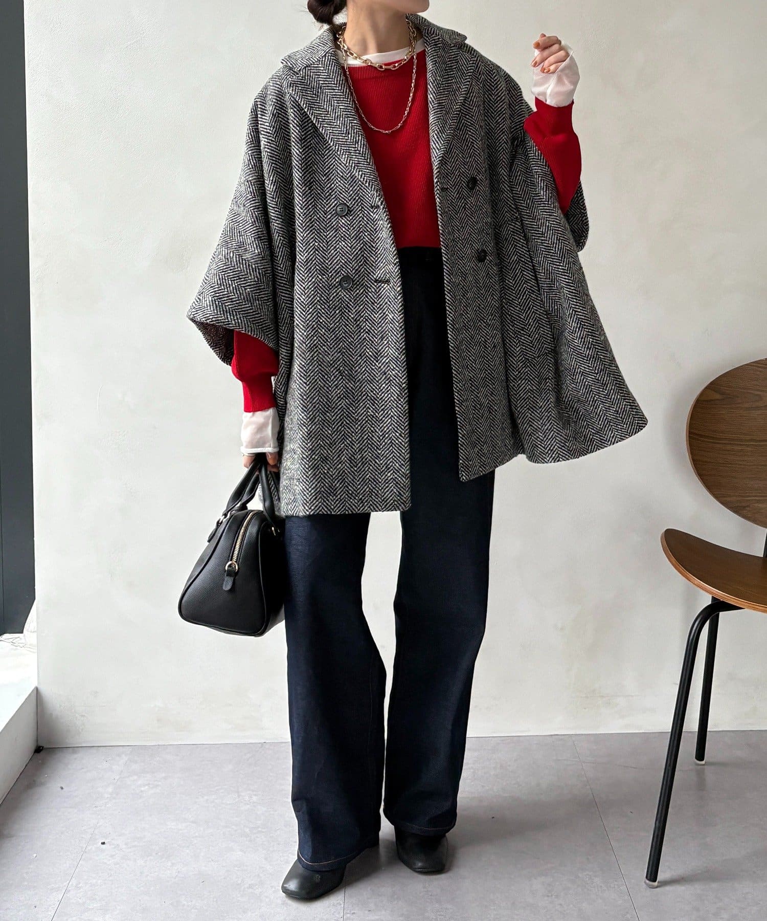 いつものコーデに、さっと羽織るだけでトレンド感あふれるスタイルが完成する、ヘリンボーンポンチョコート。