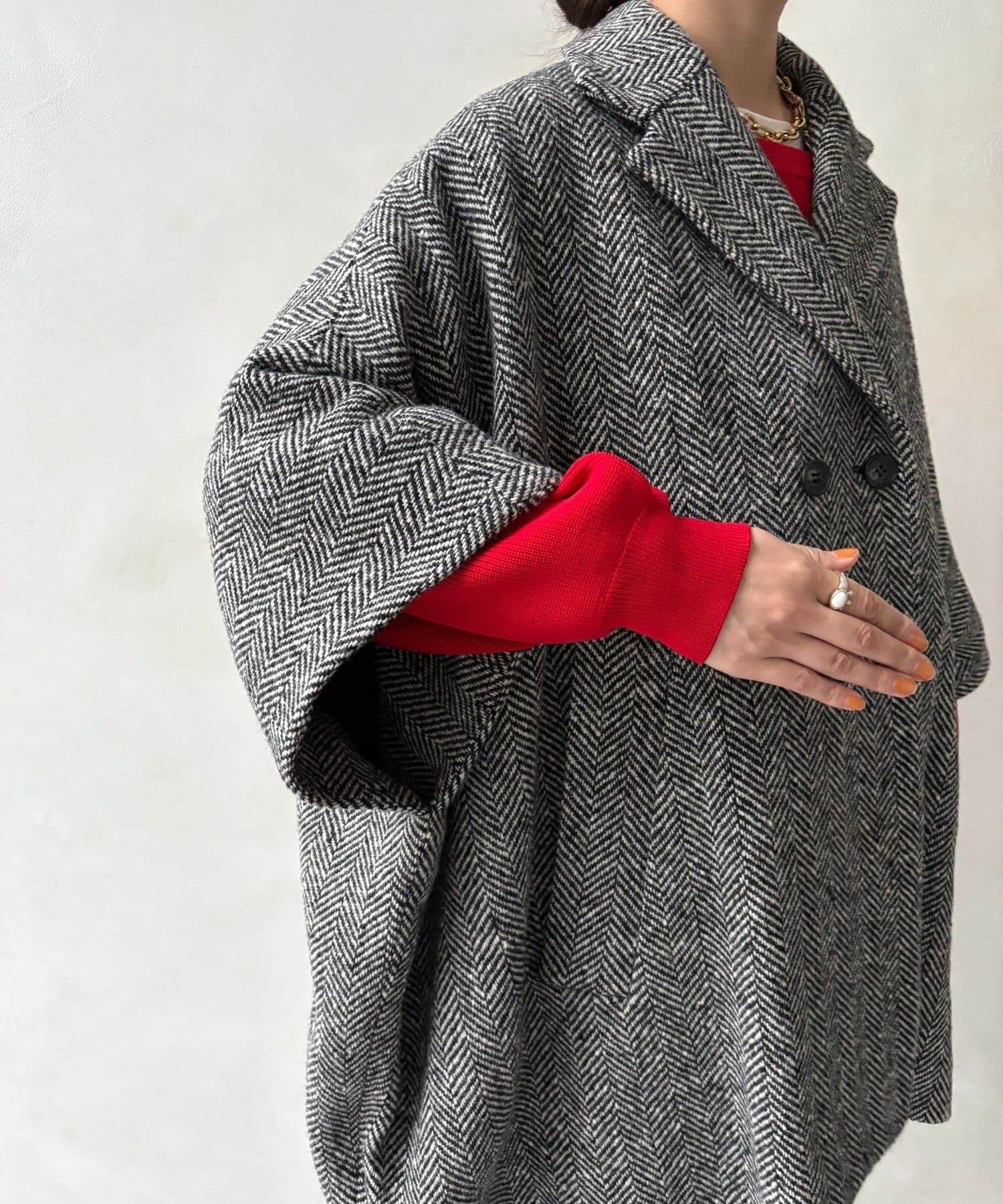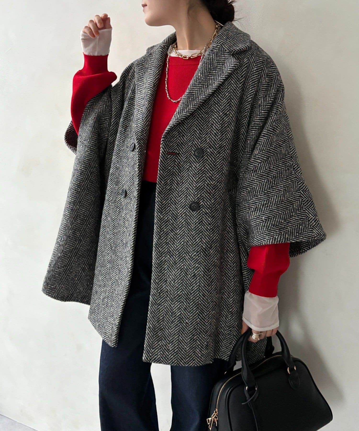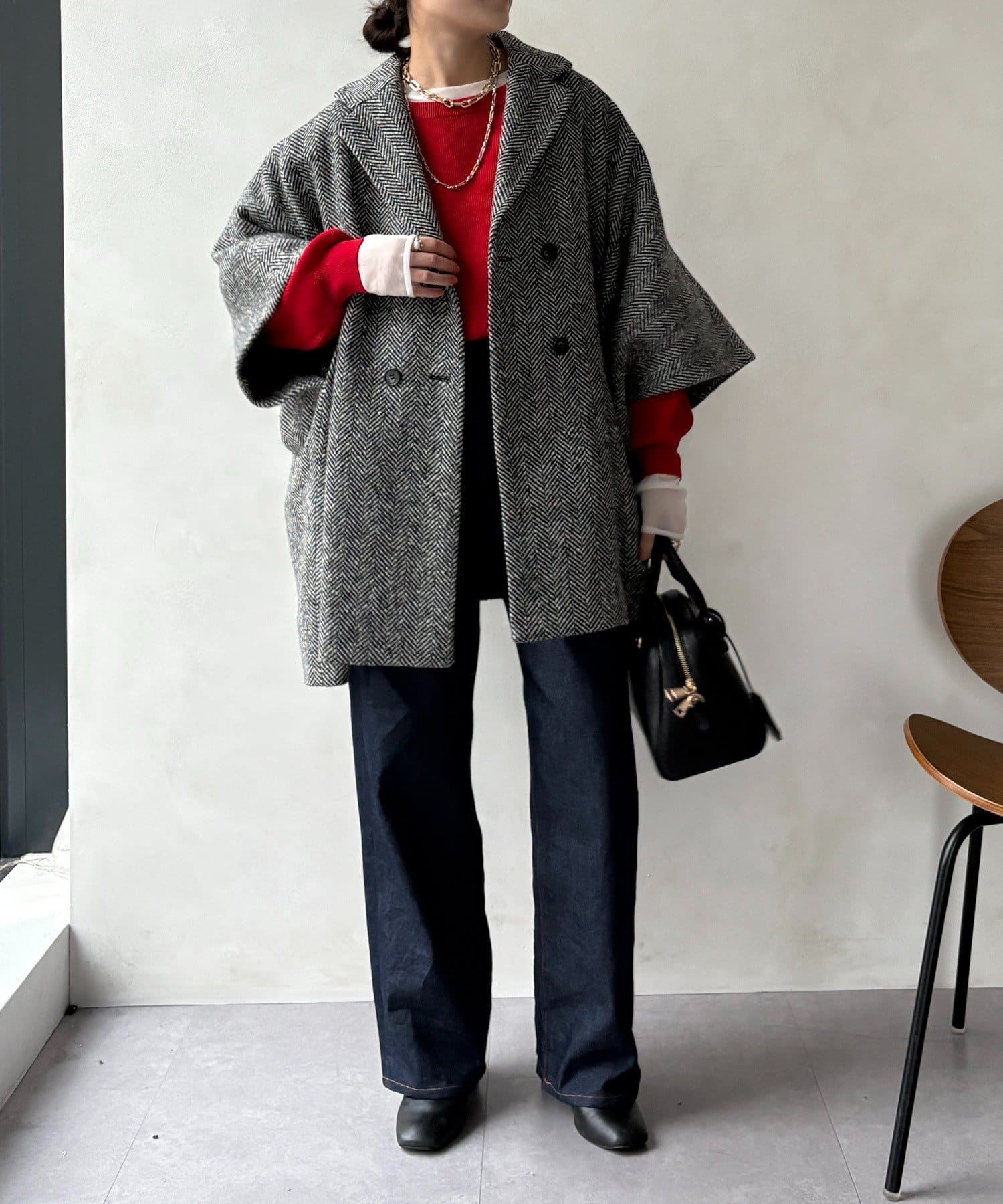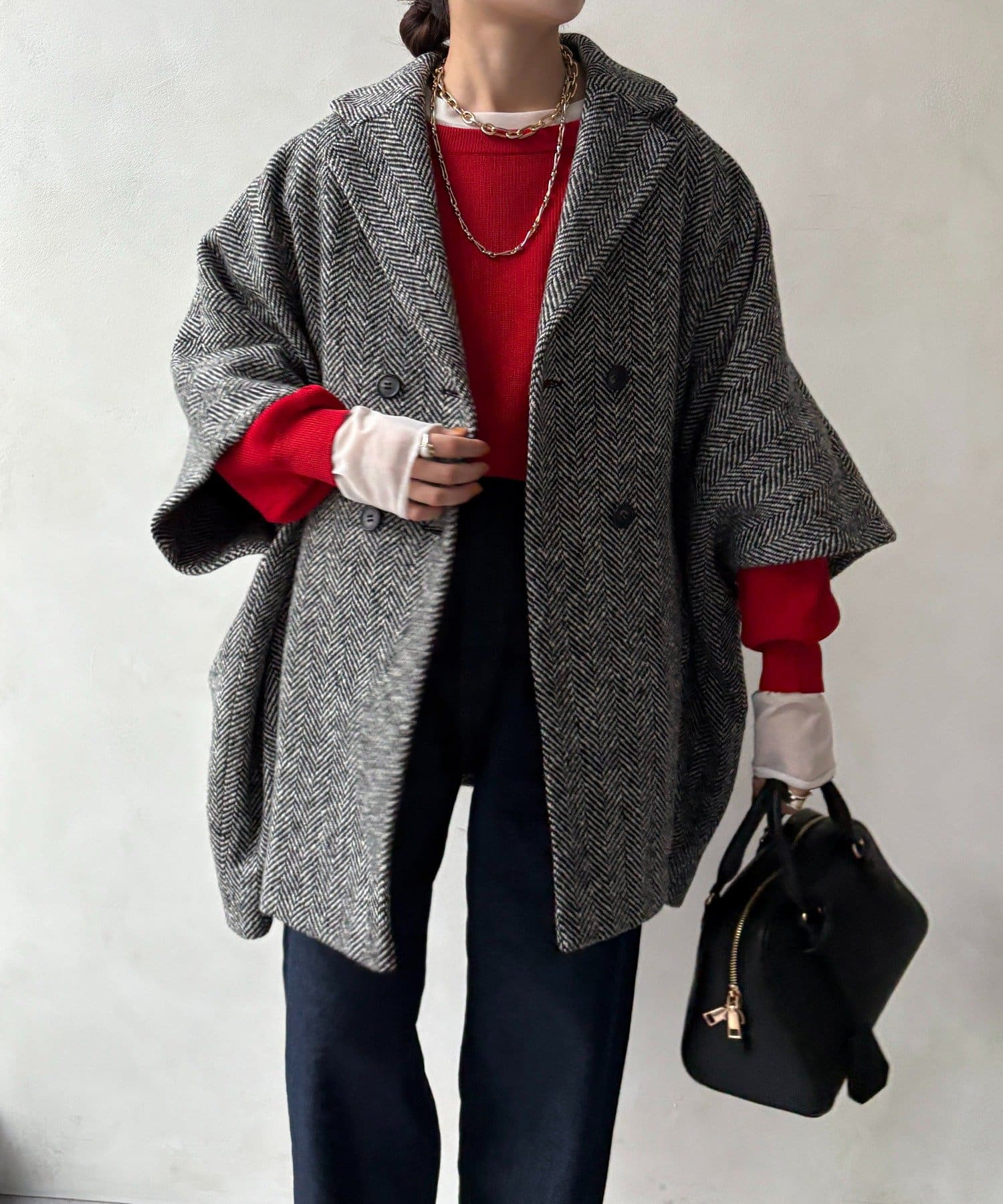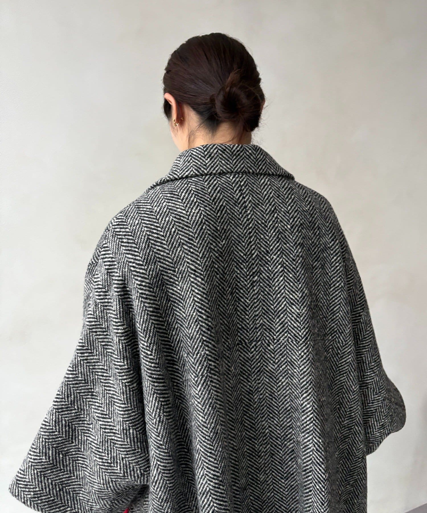 いつものコーデに、さっと羽織るだけでトレンド感あふれるスタイルが完成する、ヘリンボーンポンチョコート。