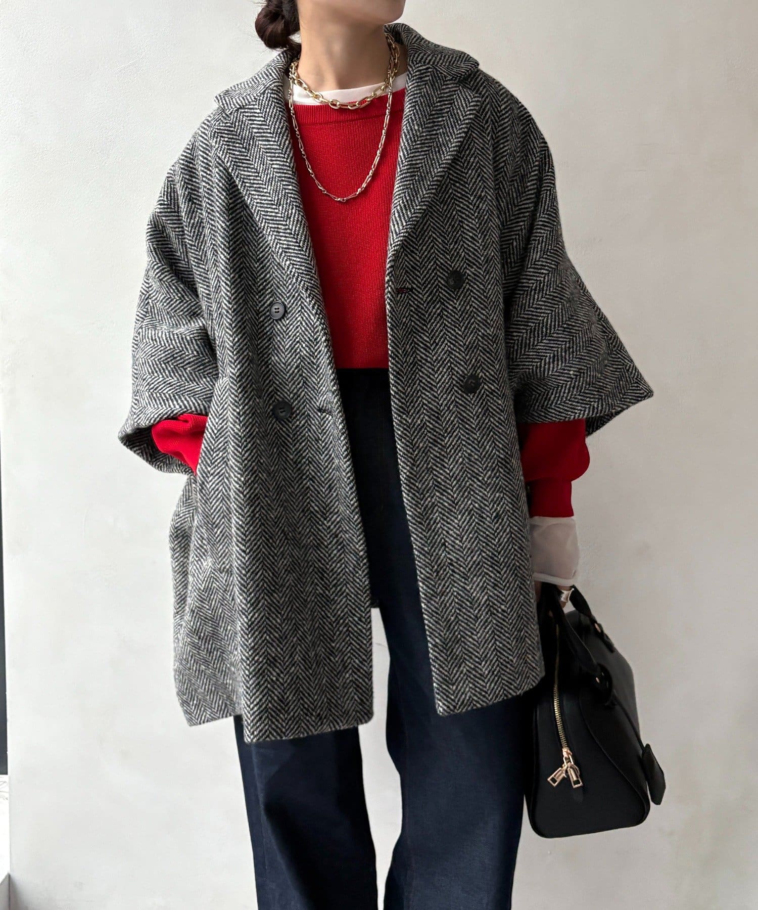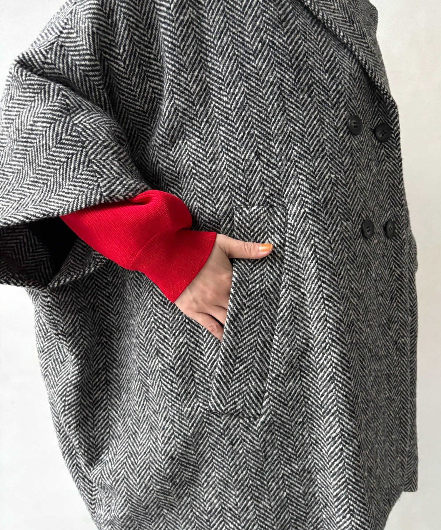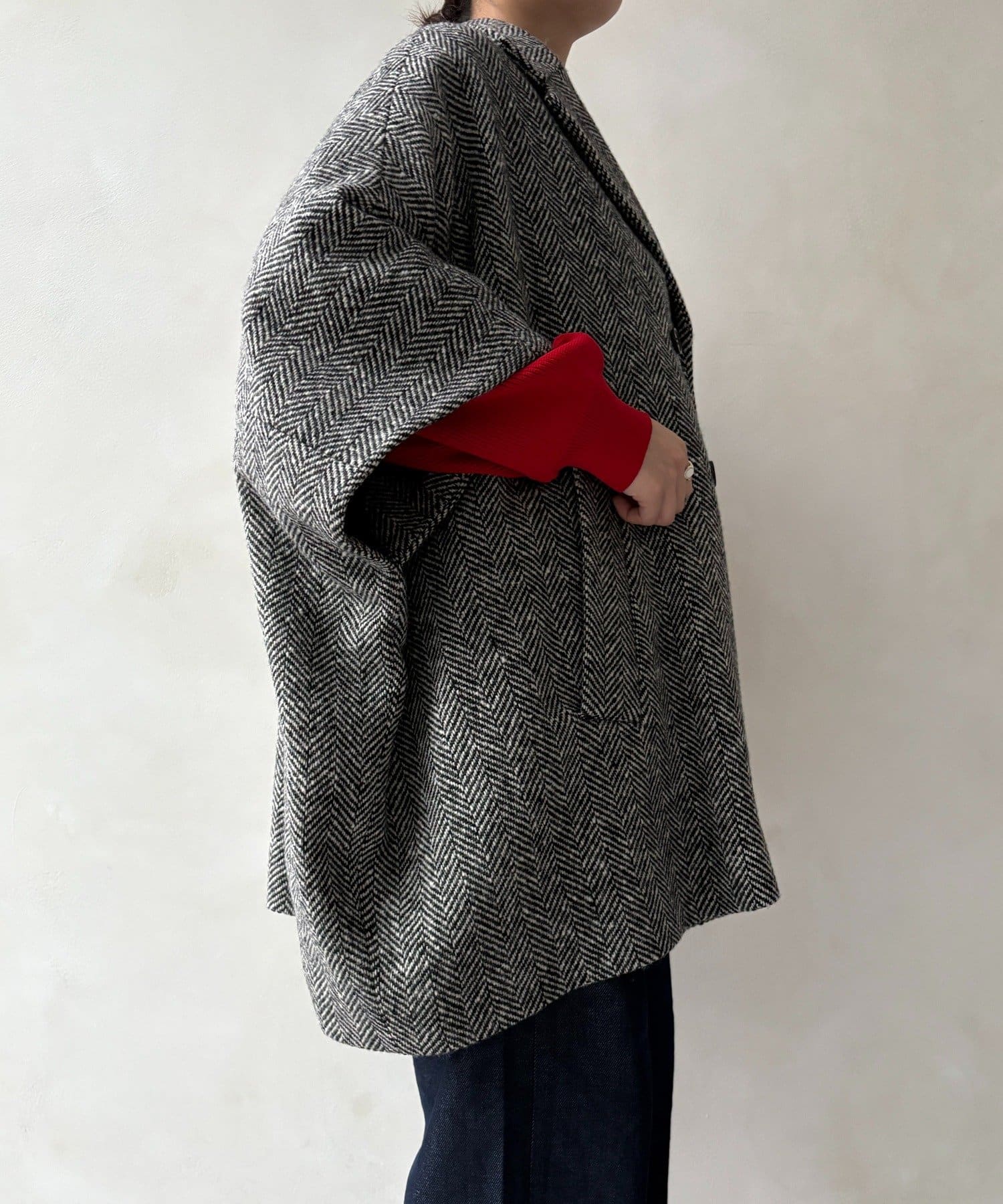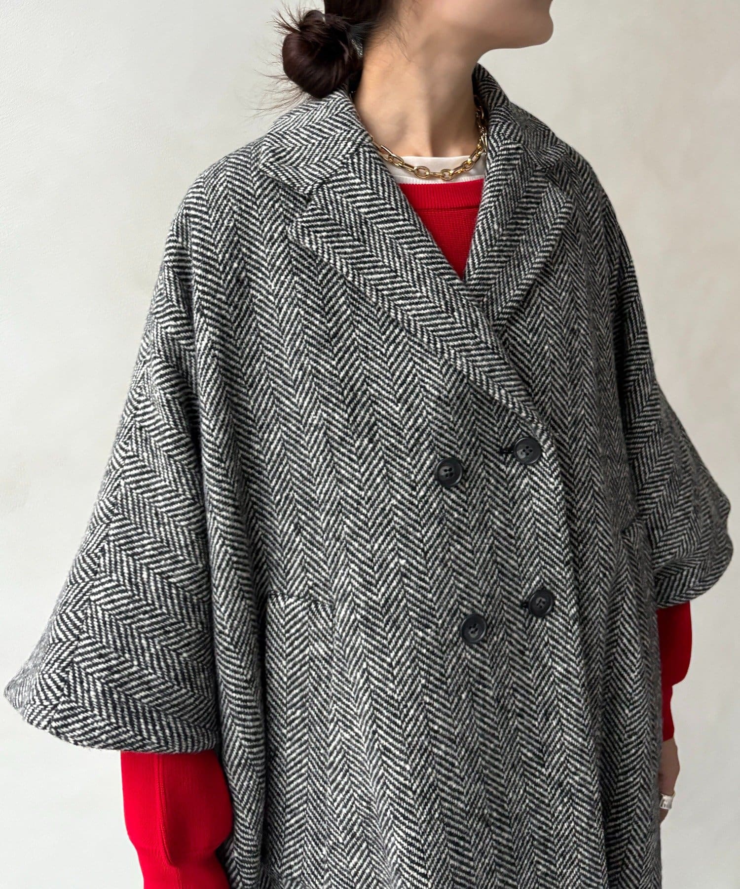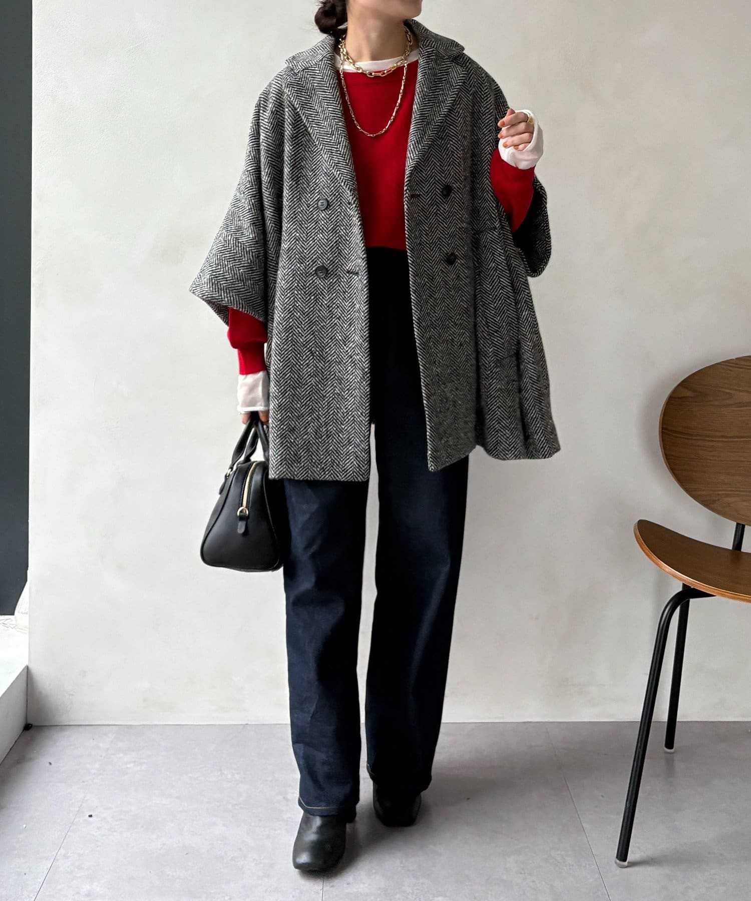 いつものコーデに、さっと羽織るだけでトレンド感あふれるスタイルが完成する、ヘリンボーンポンチョコート。