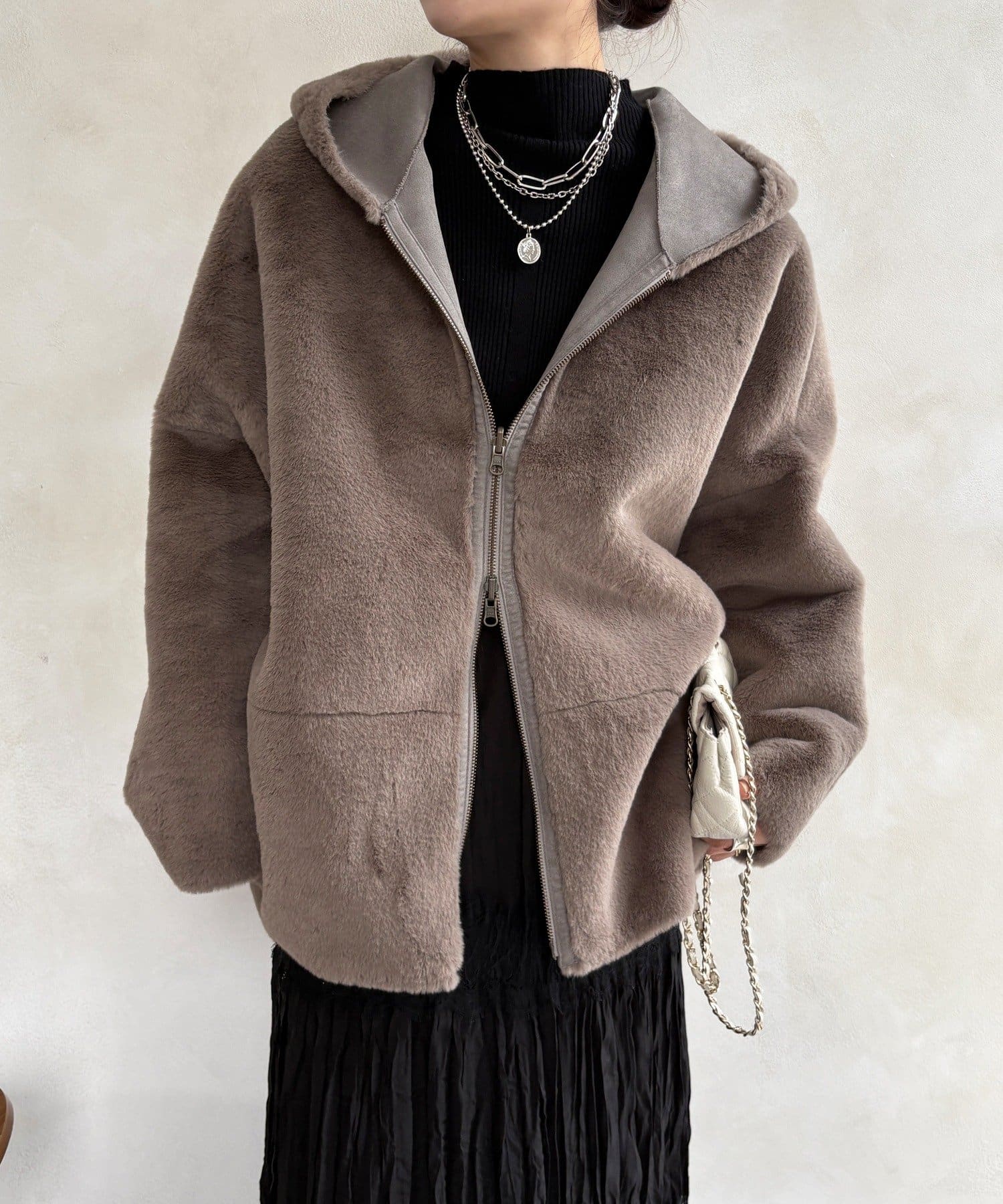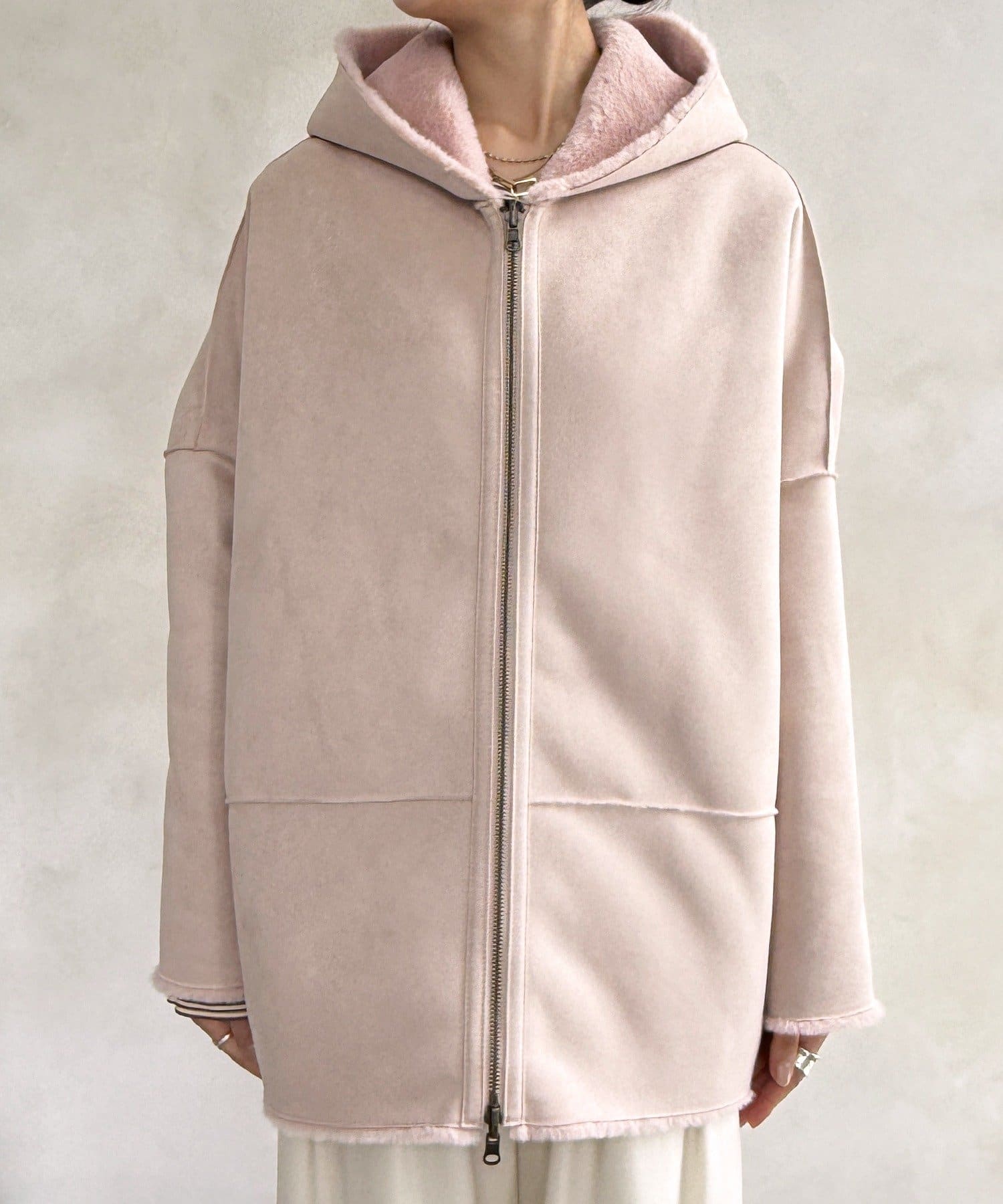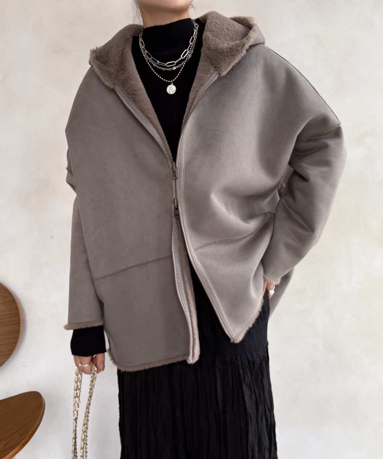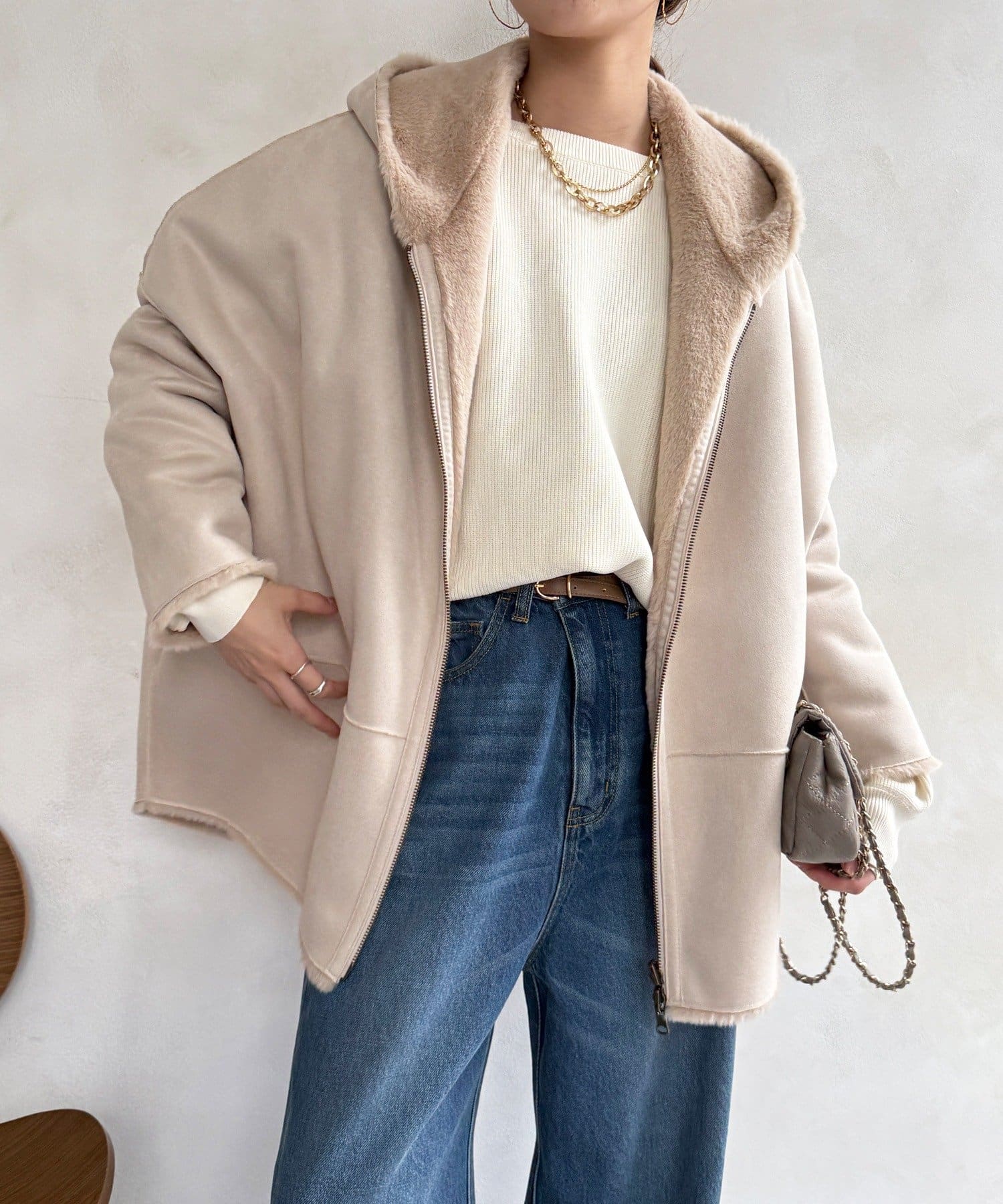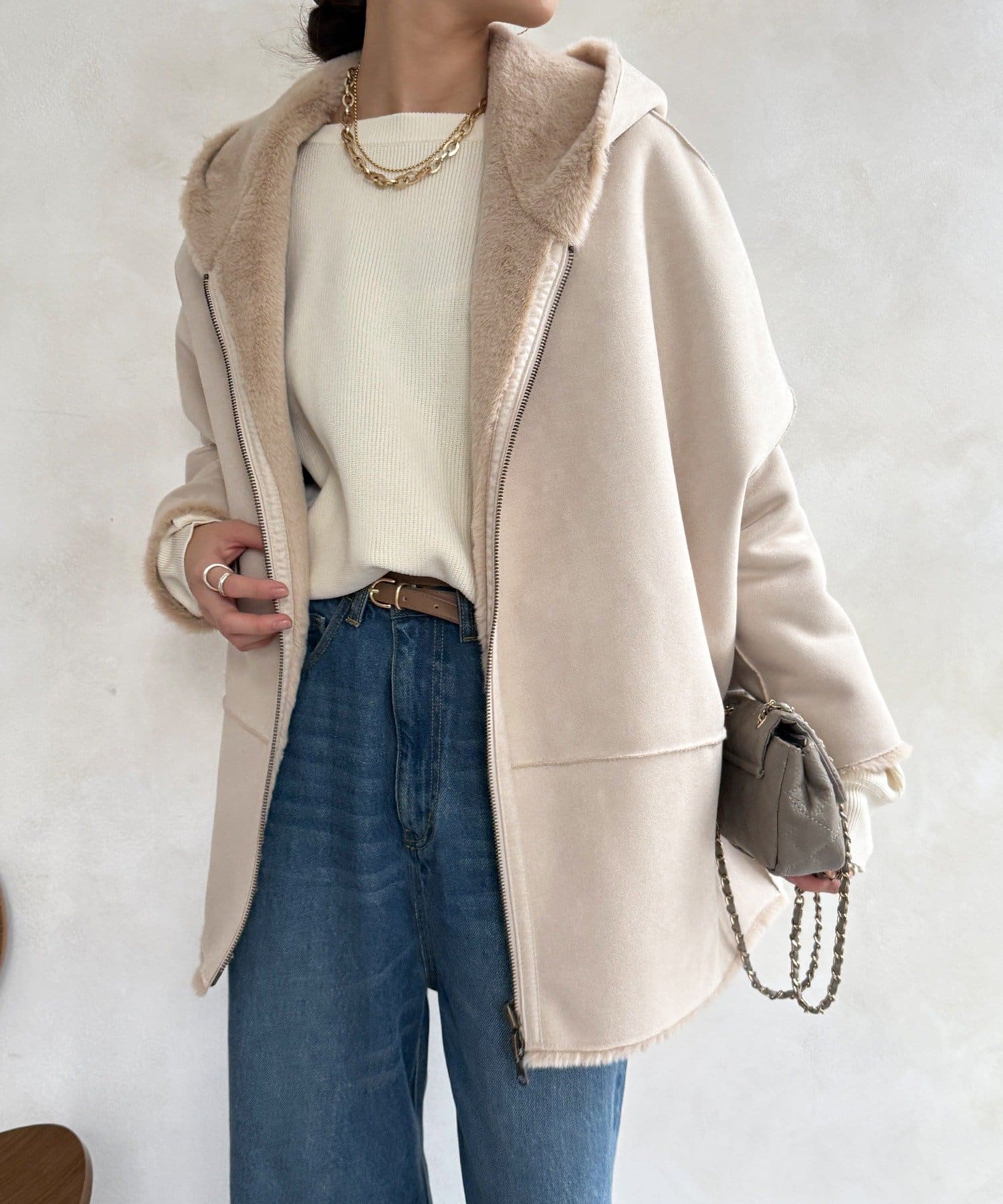 手触りのいいファー素材と、スウェードをリバーシブルに仕上げたアウター。