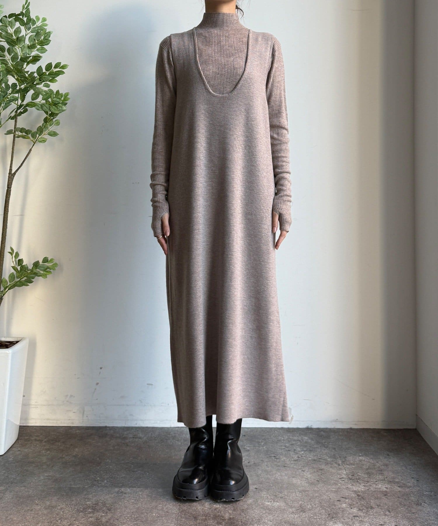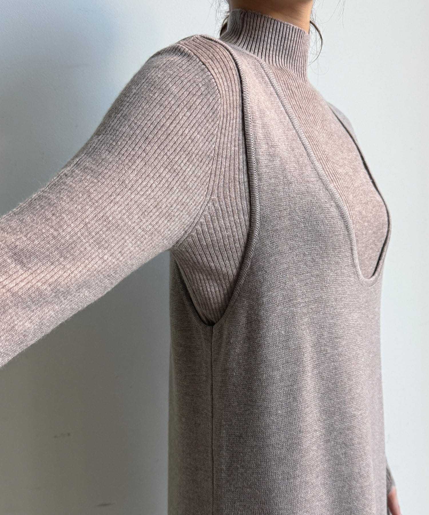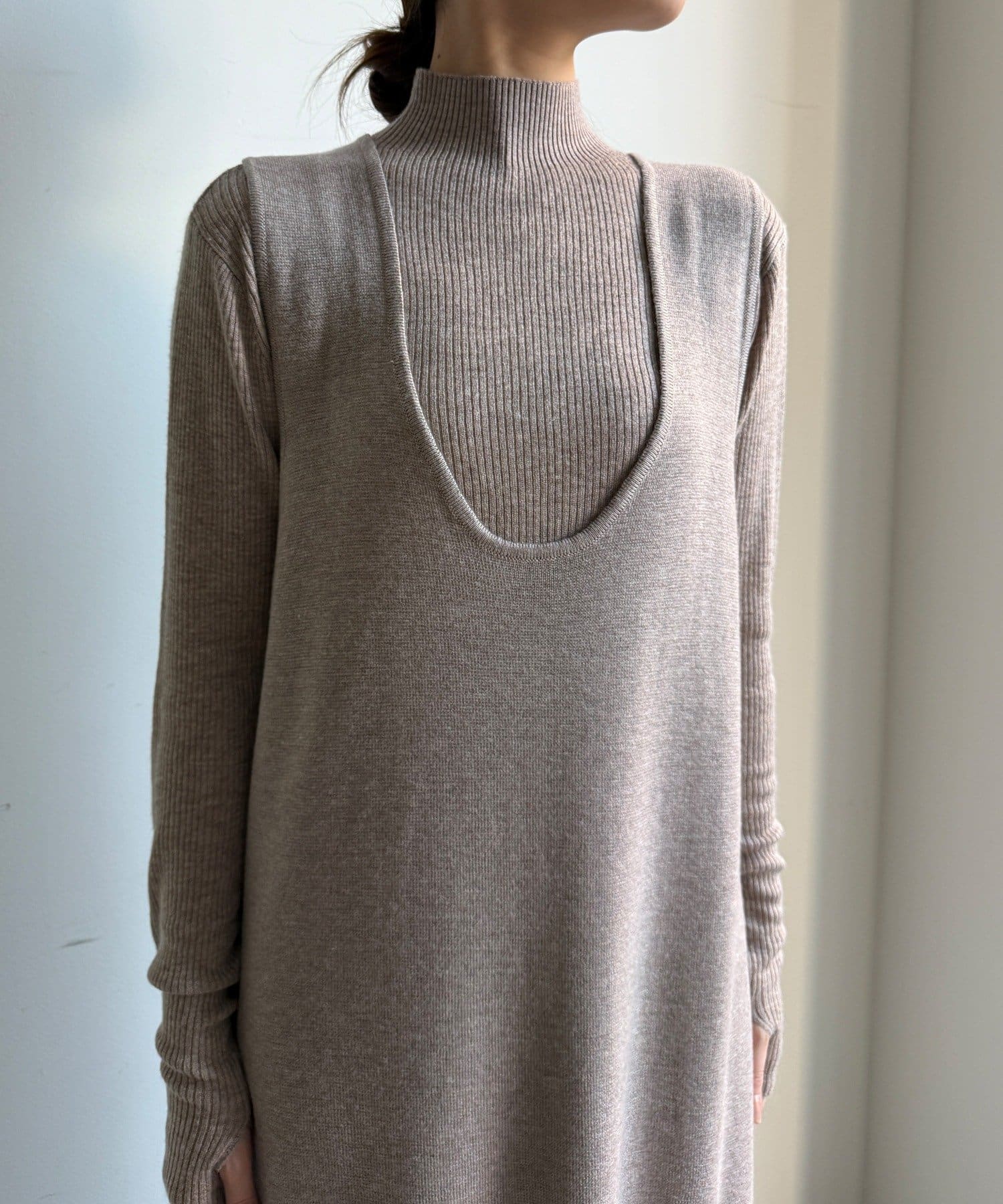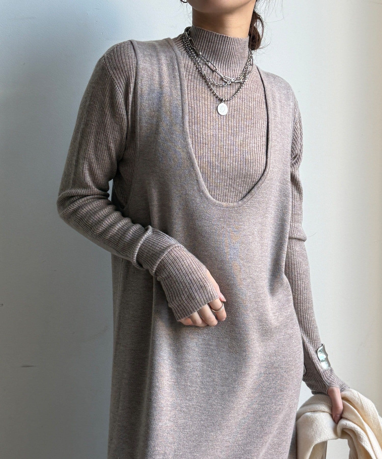重ねるだけでスタイル完成。リブニット×Uネックワンピースセット