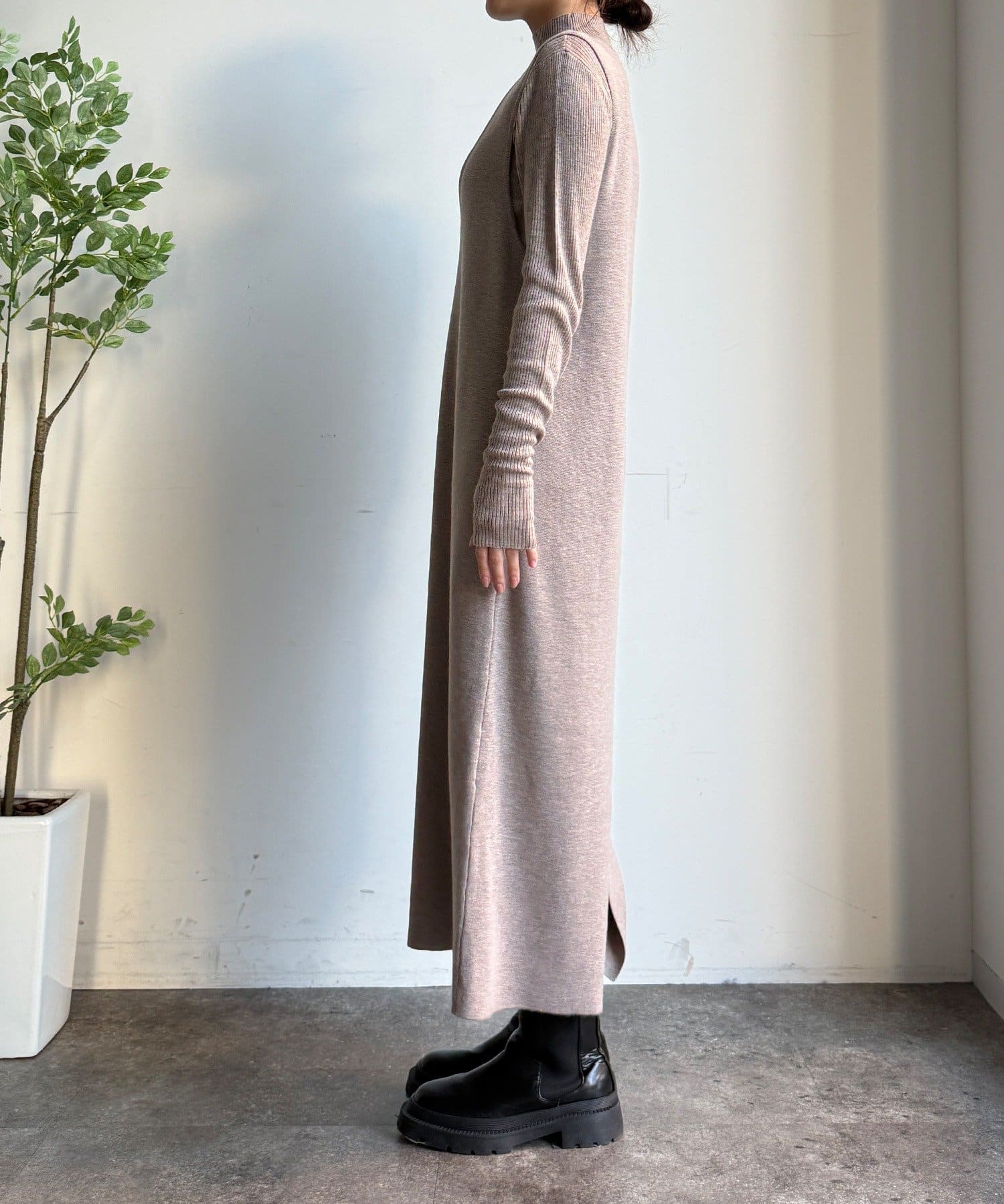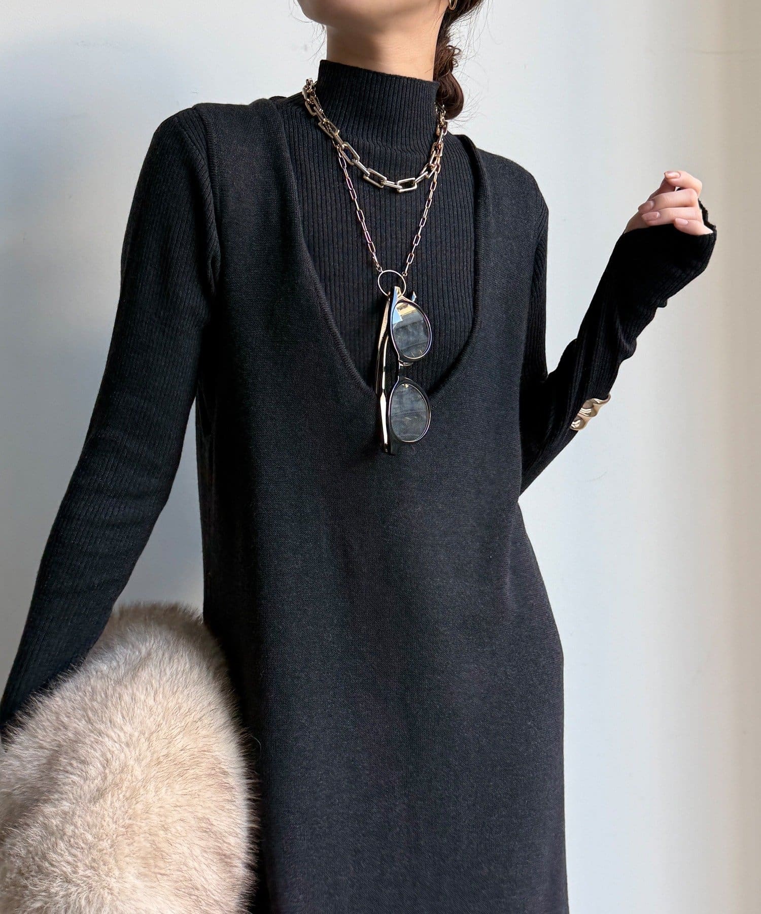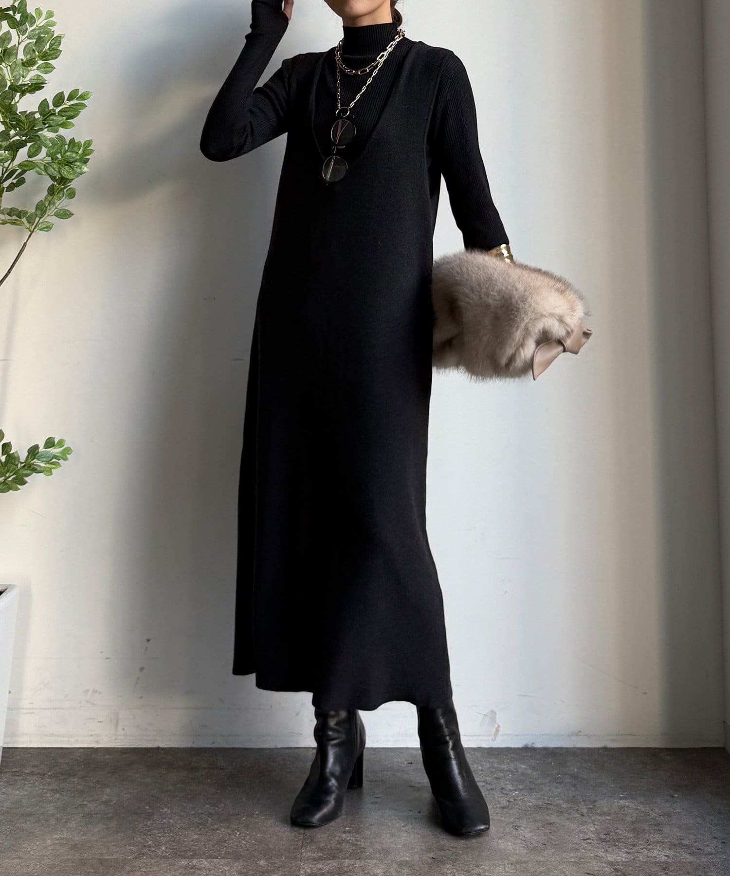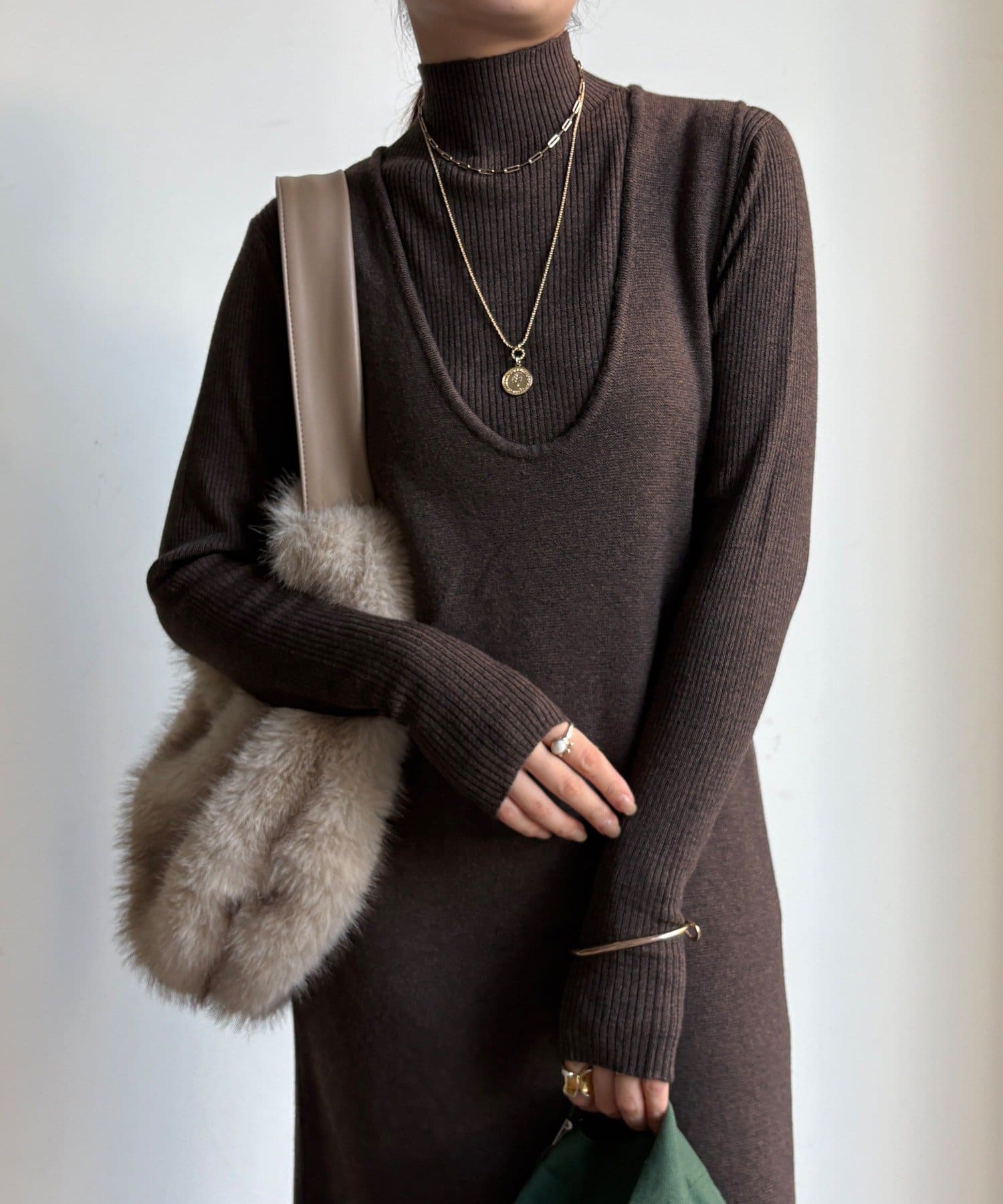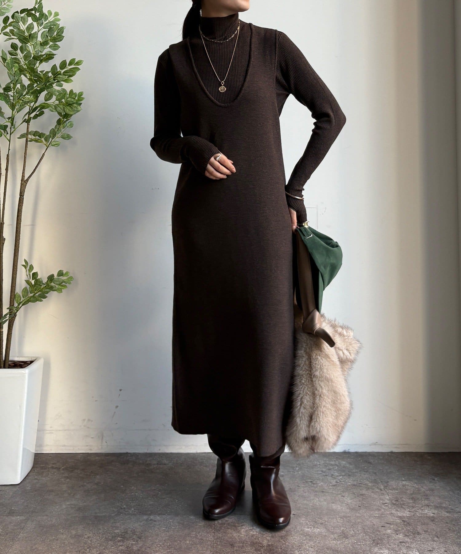 重ねるだけでスタイル完成。リブニット×Uネックワンピースセット