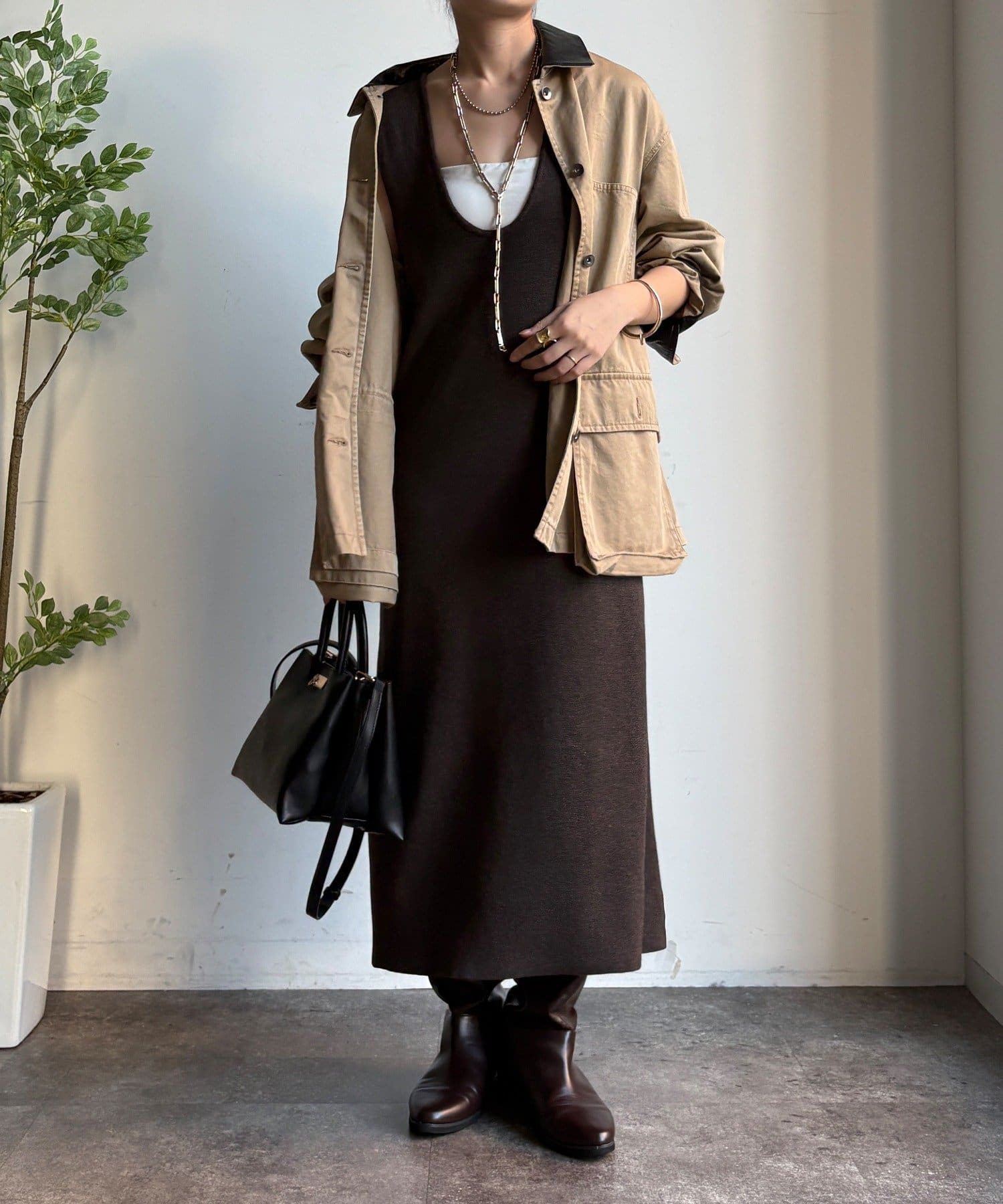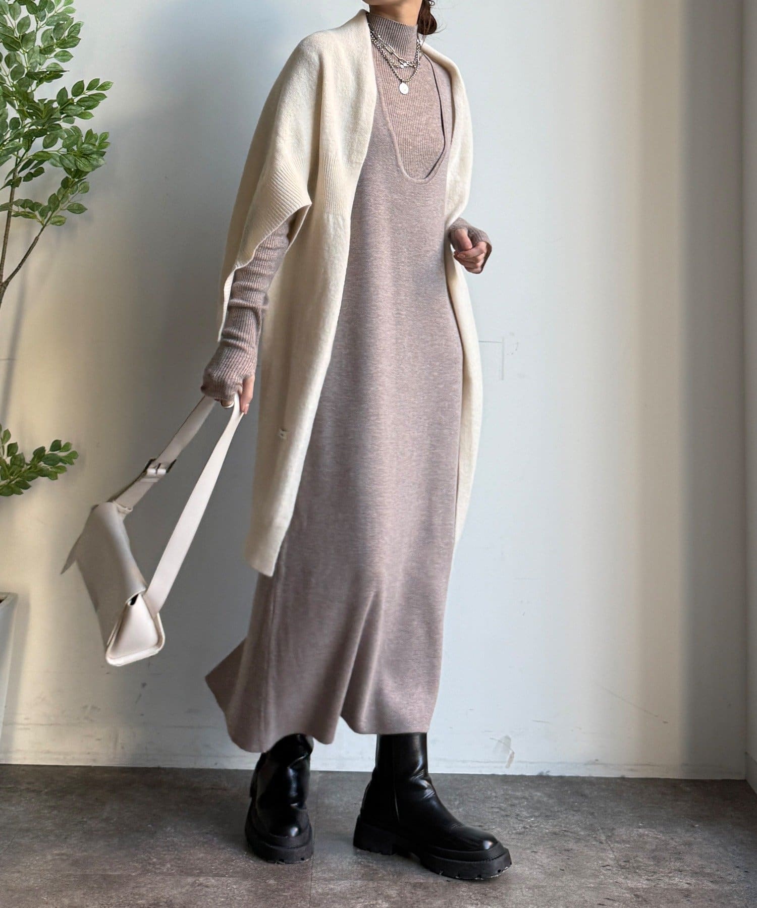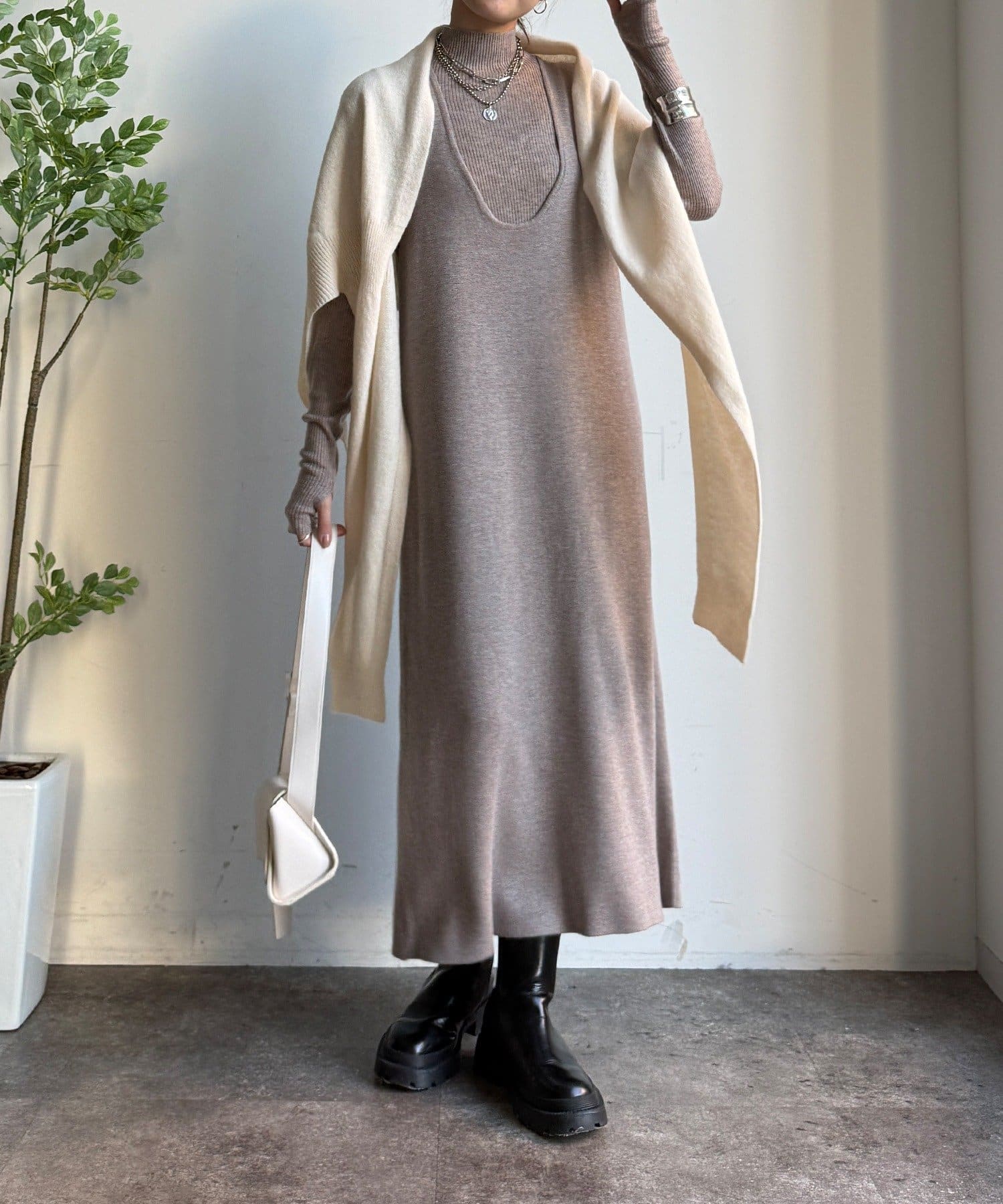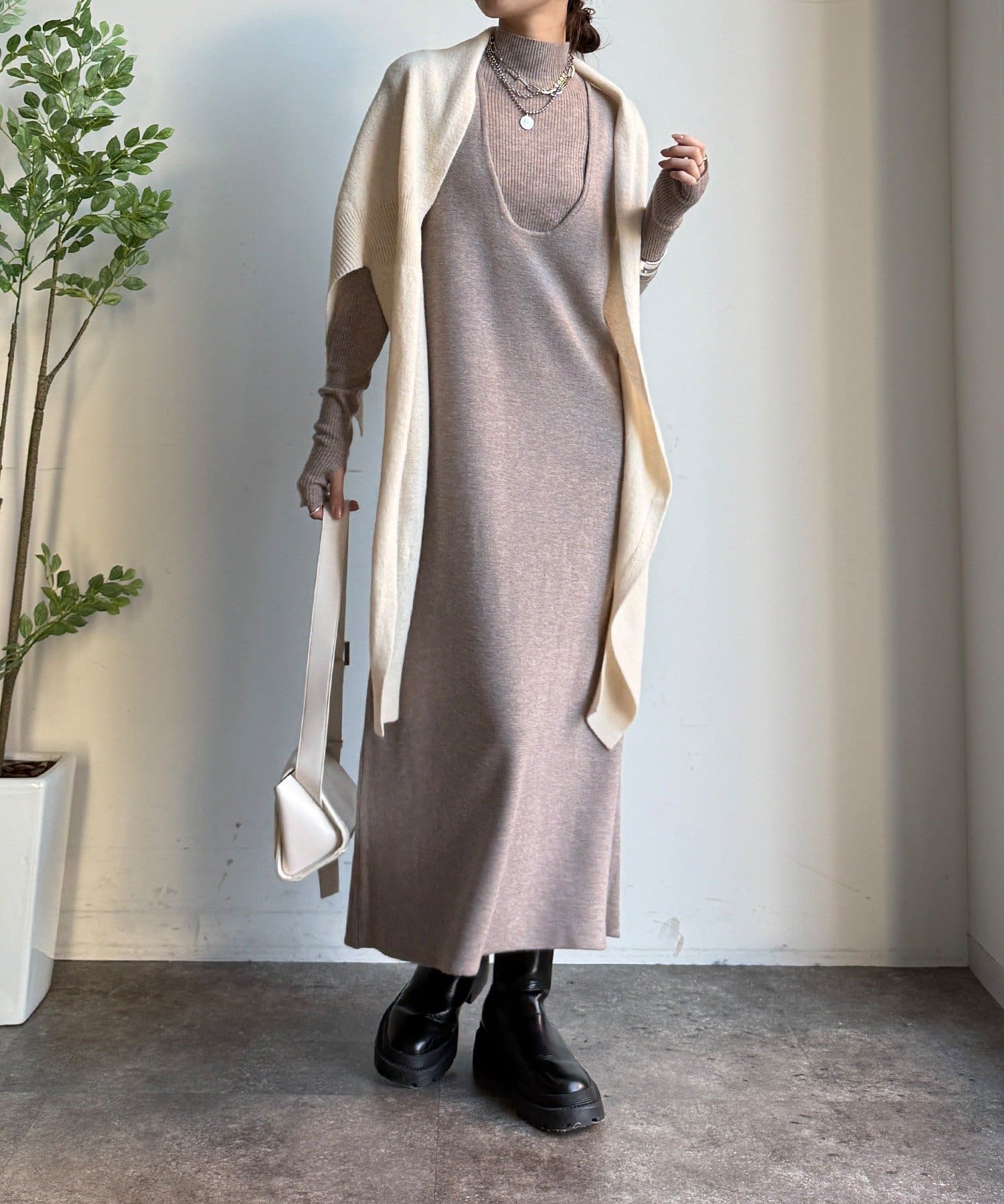 程よいフィット感のリブトップスと、ゆるやかに落ちるシルエットのワンピースを重ねた、大人のための上品レイヤードスタイルです。
