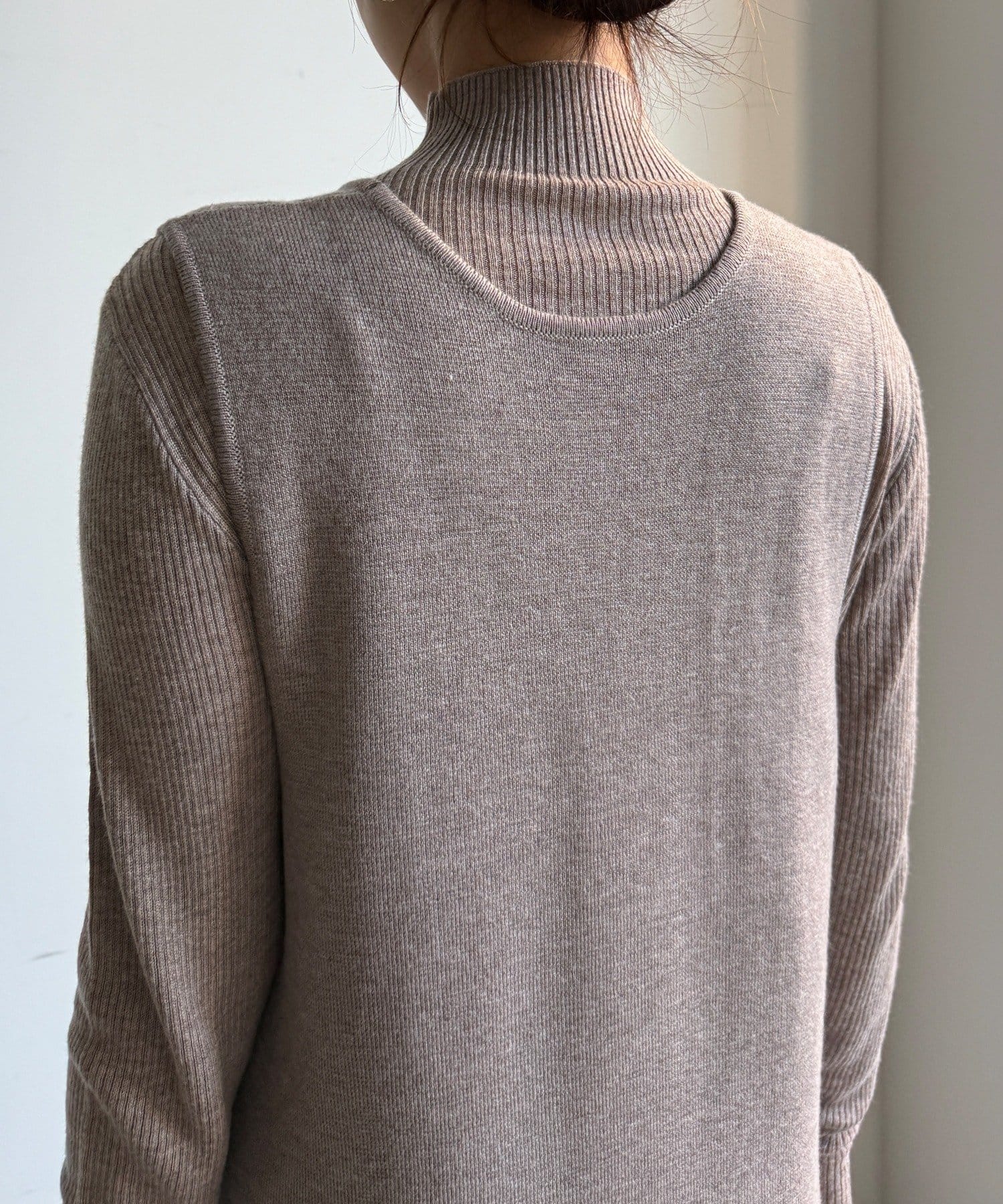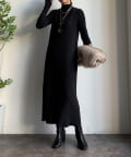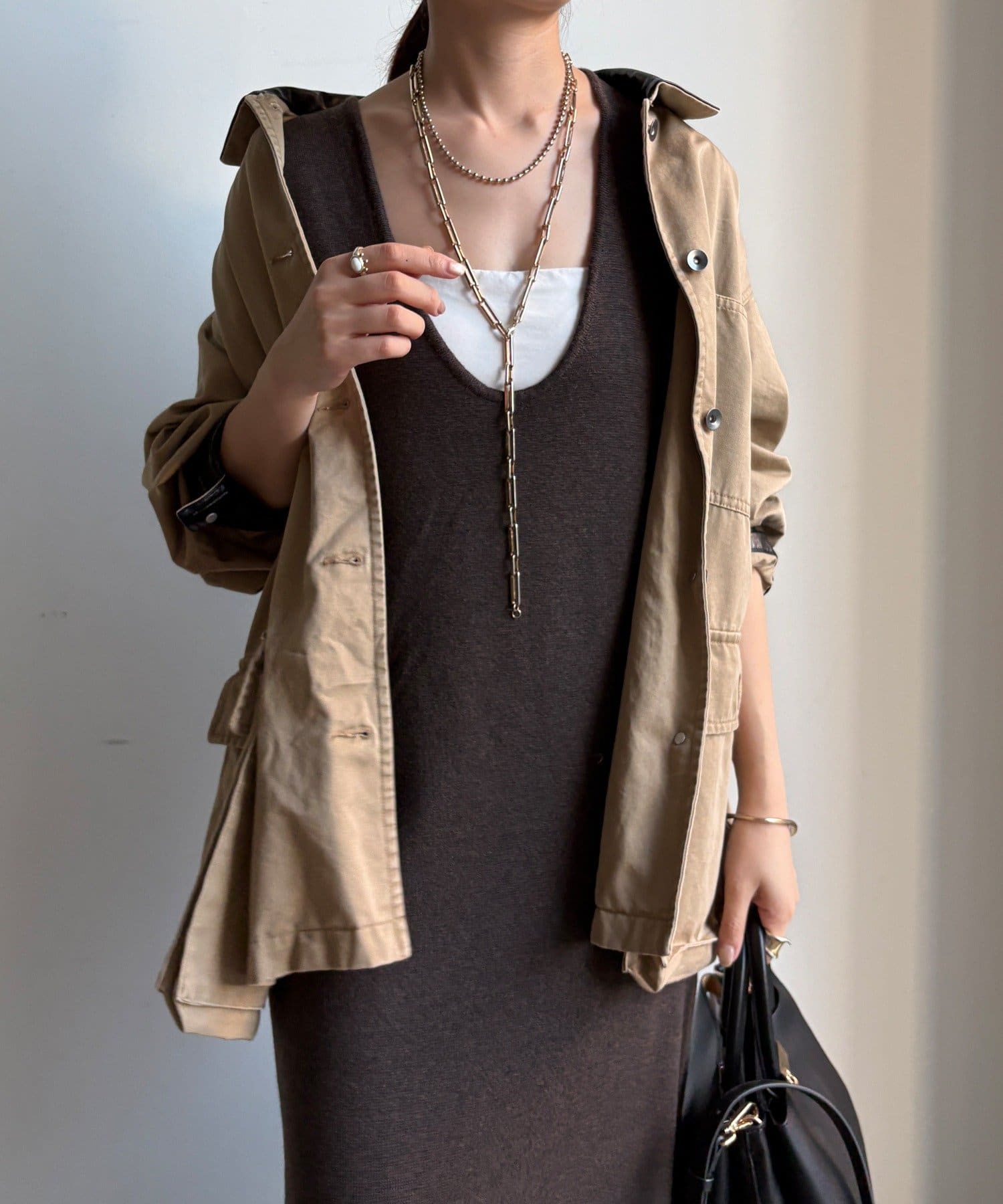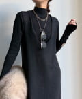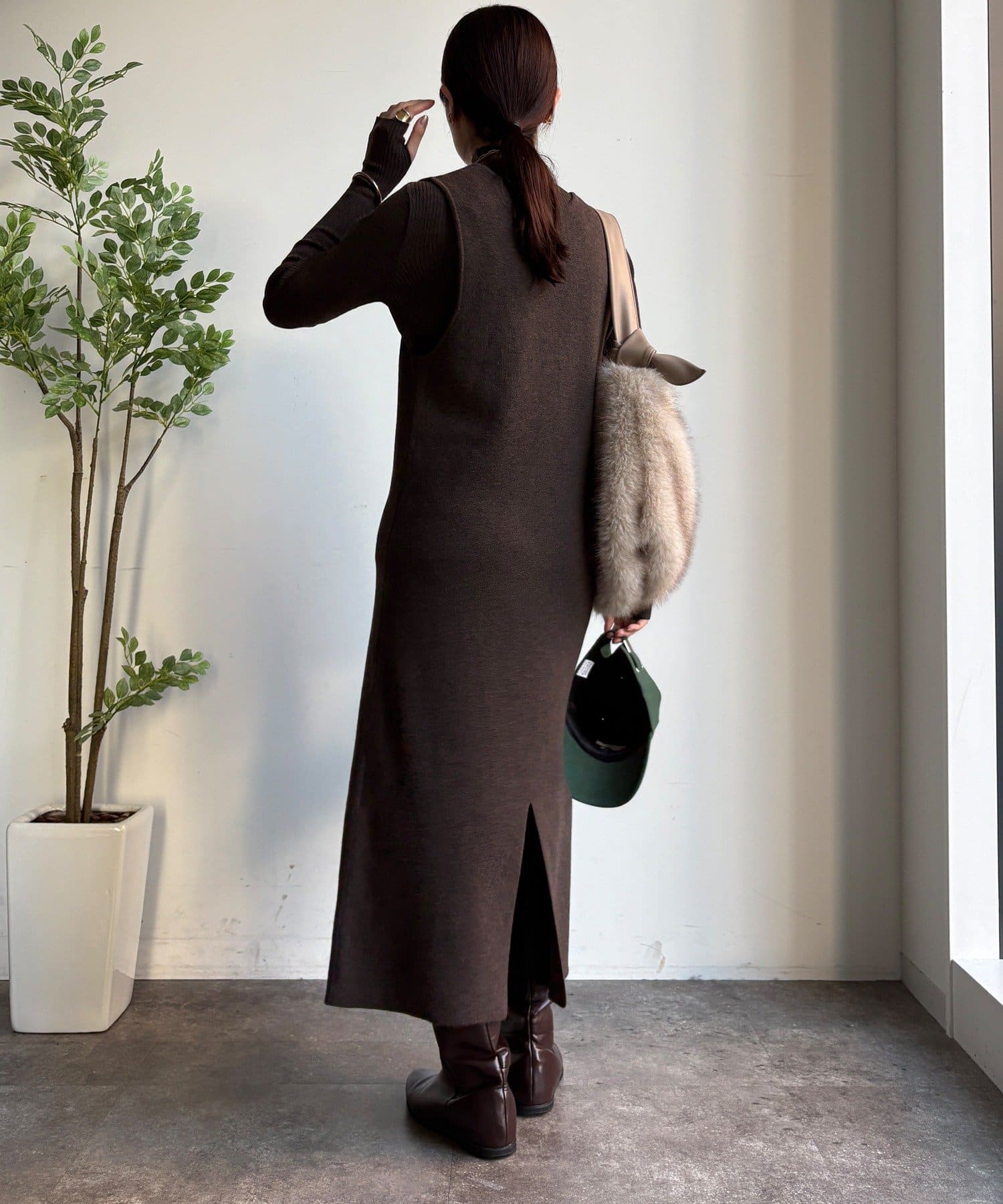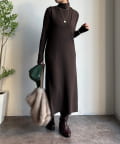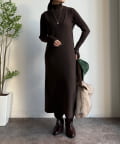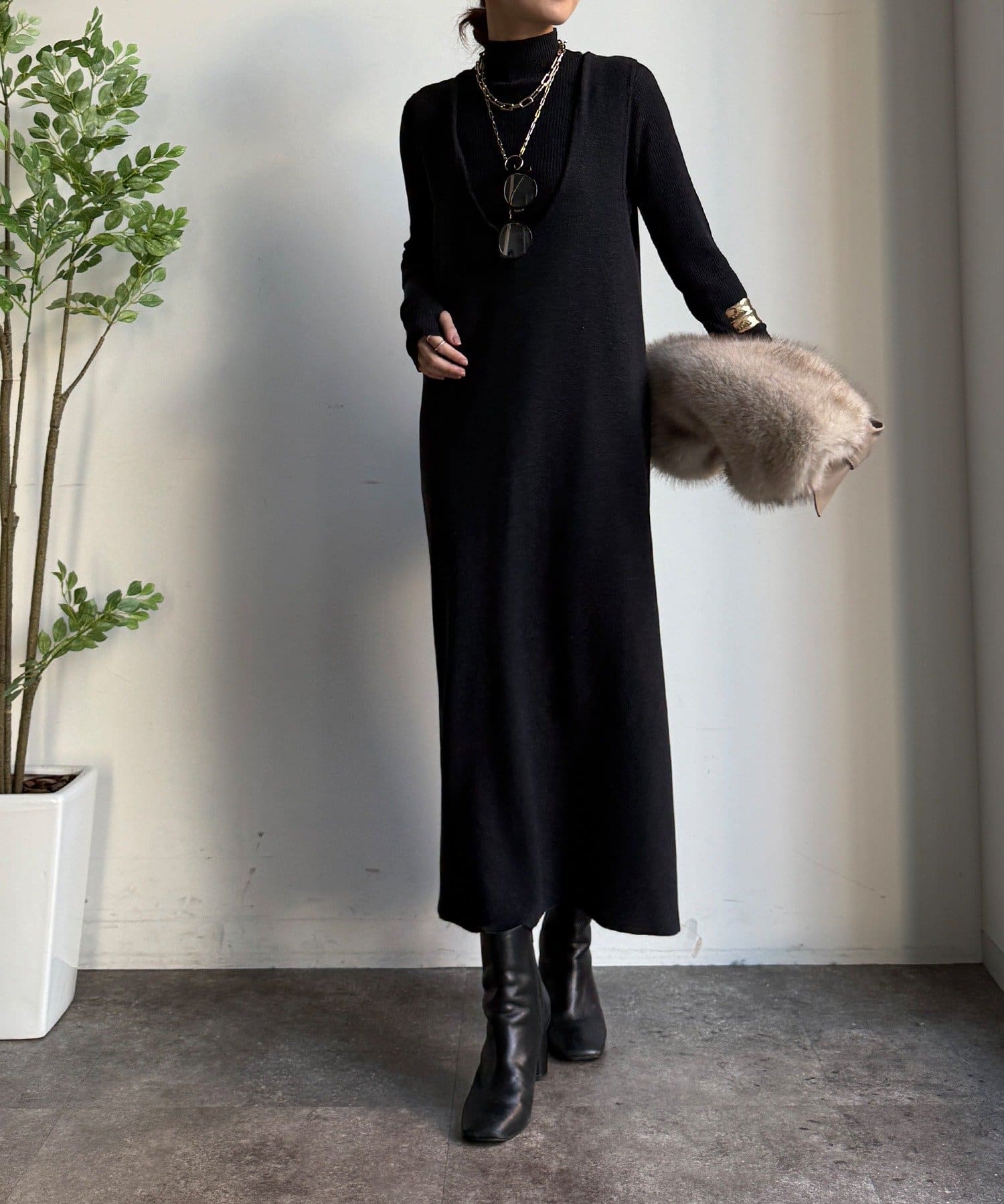 程よいフィット感のリブトップスと、ゆるやかに落ちるシルエットのワンピースを重ねた、大人のための上品レイヤードスタイルです。