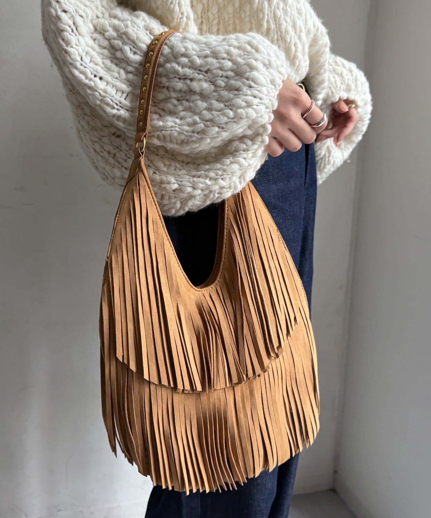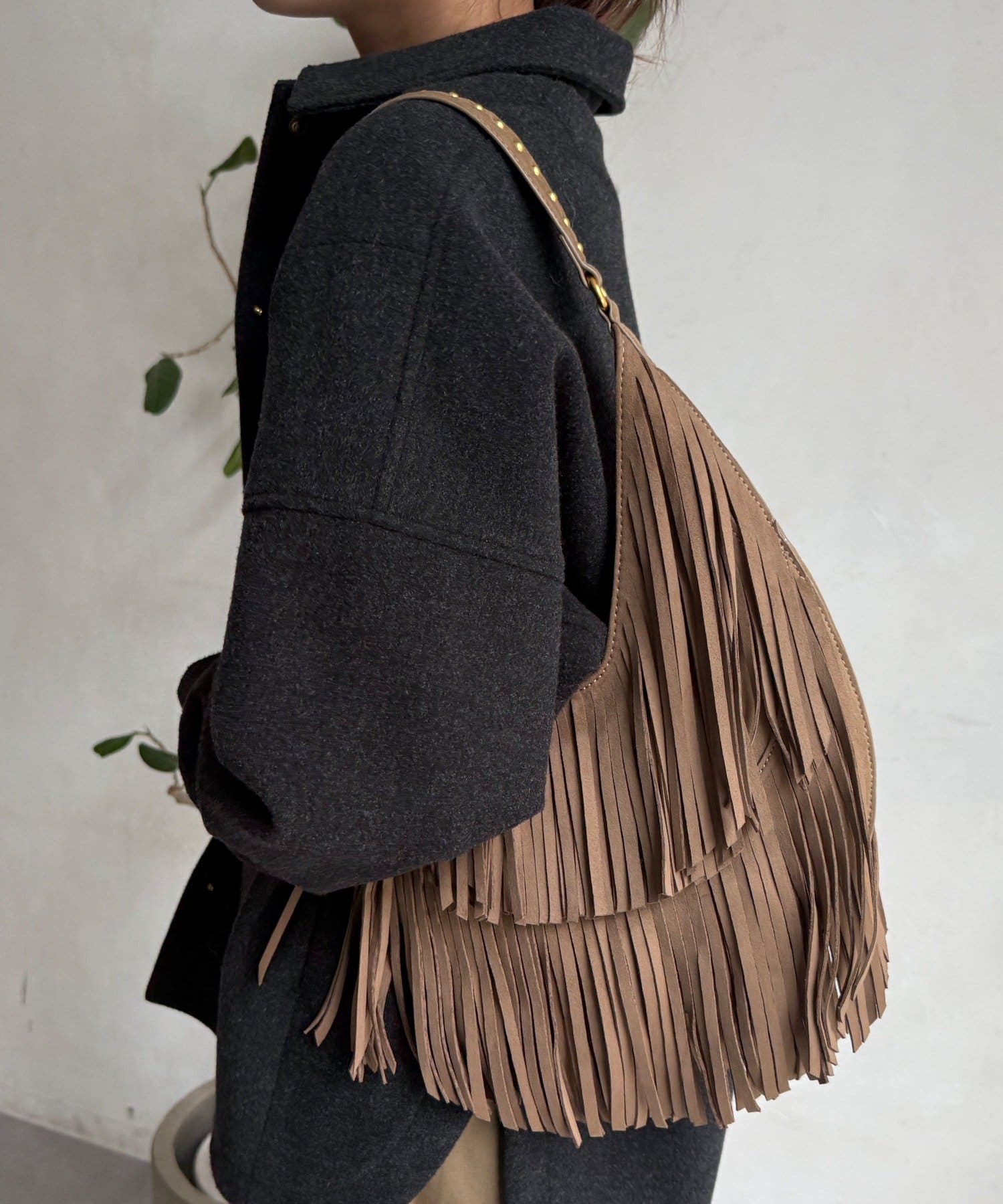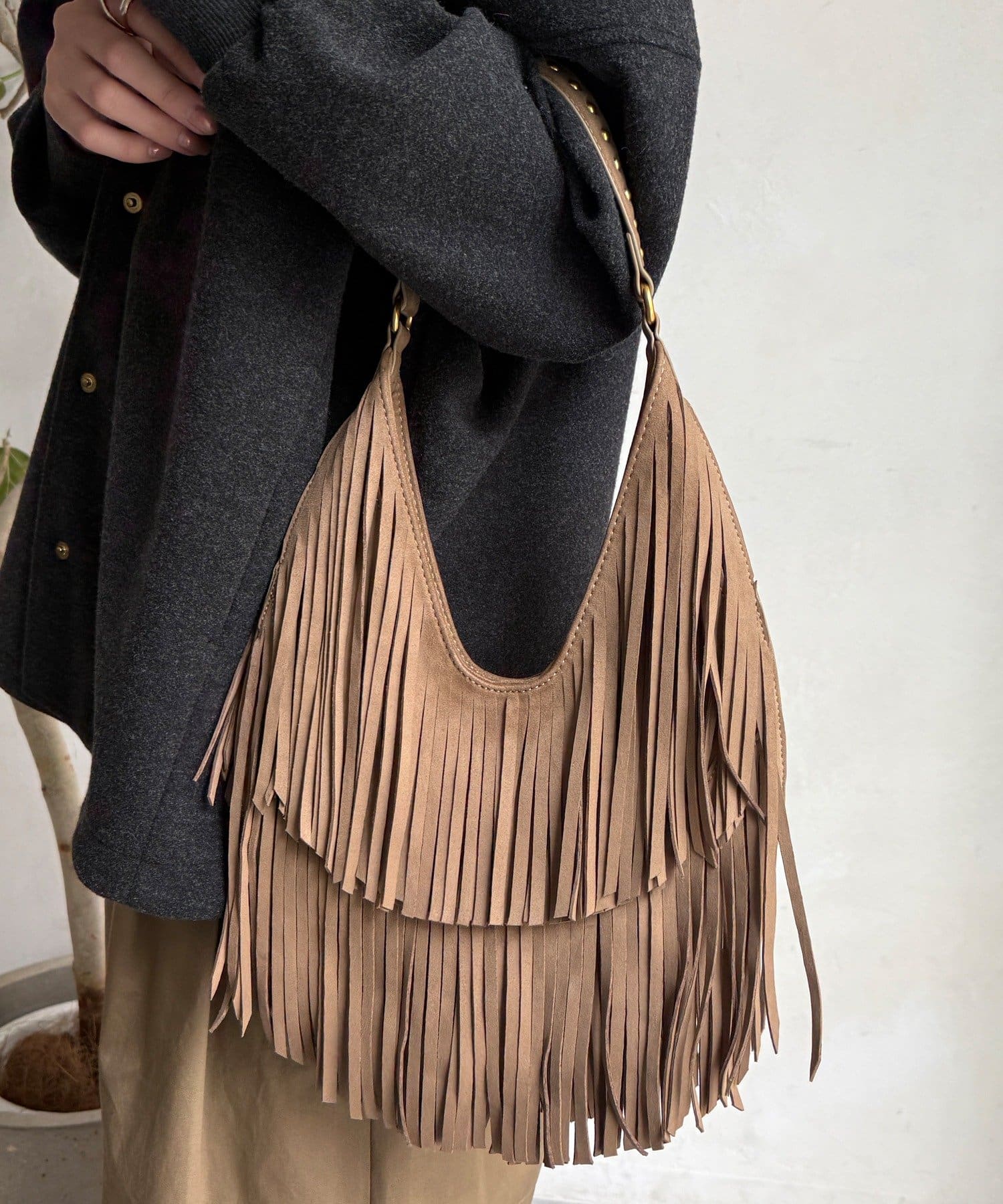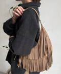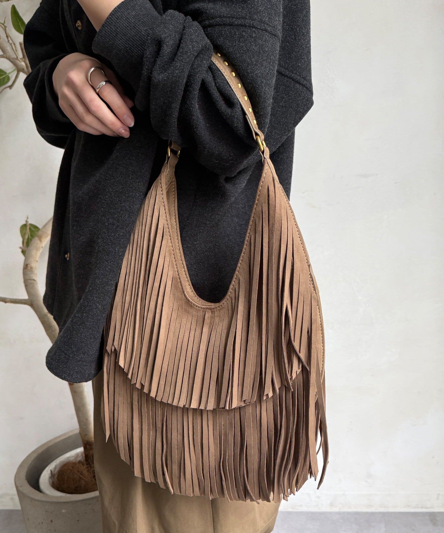 柔らかなスエード調素材にフリンジをあしらった、トレンド感たっぷりのセミショルダーバッグが登場。