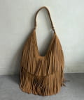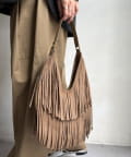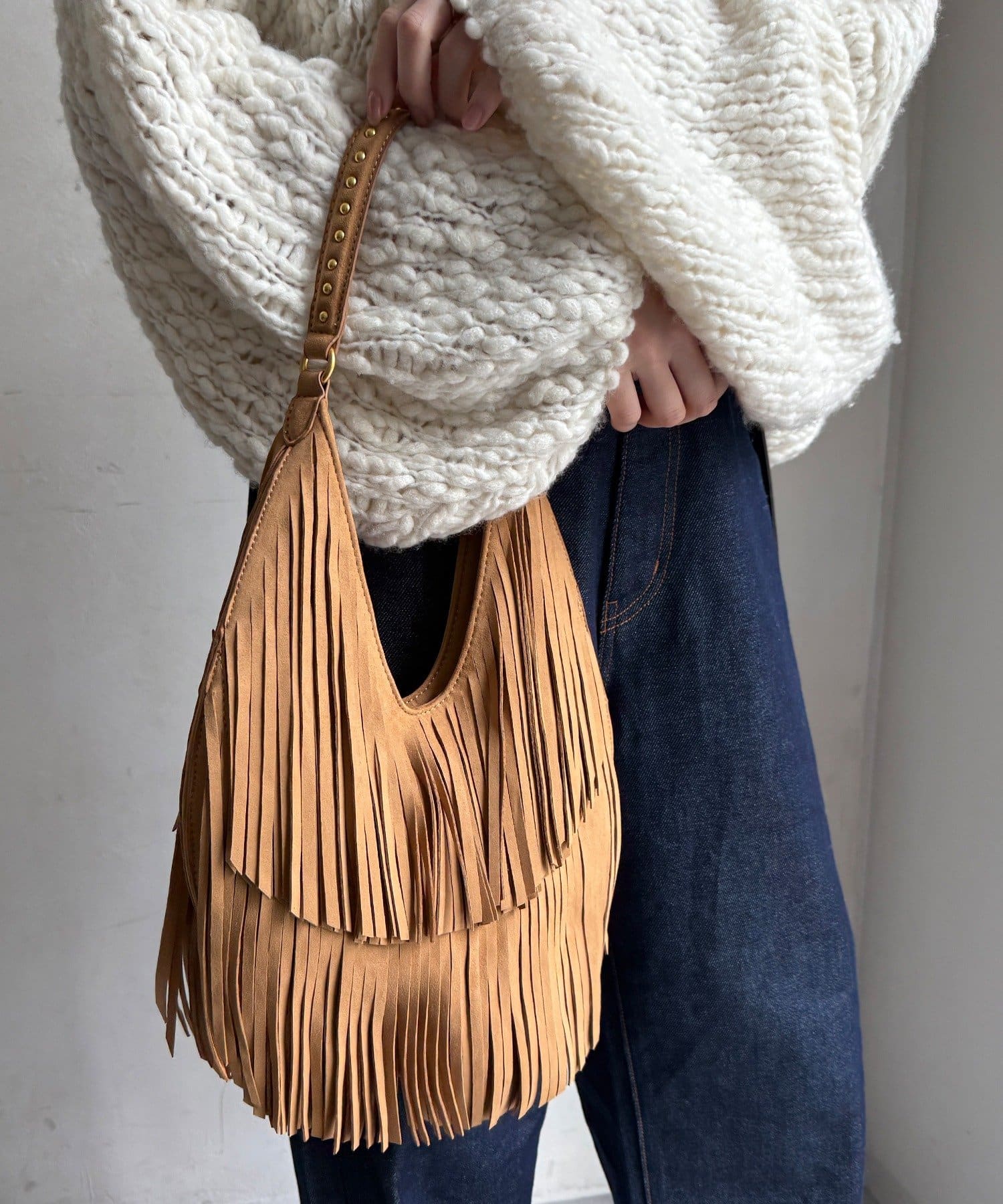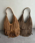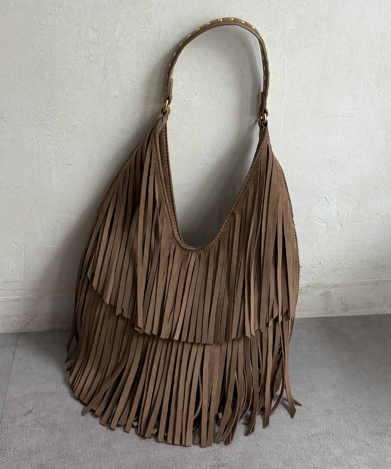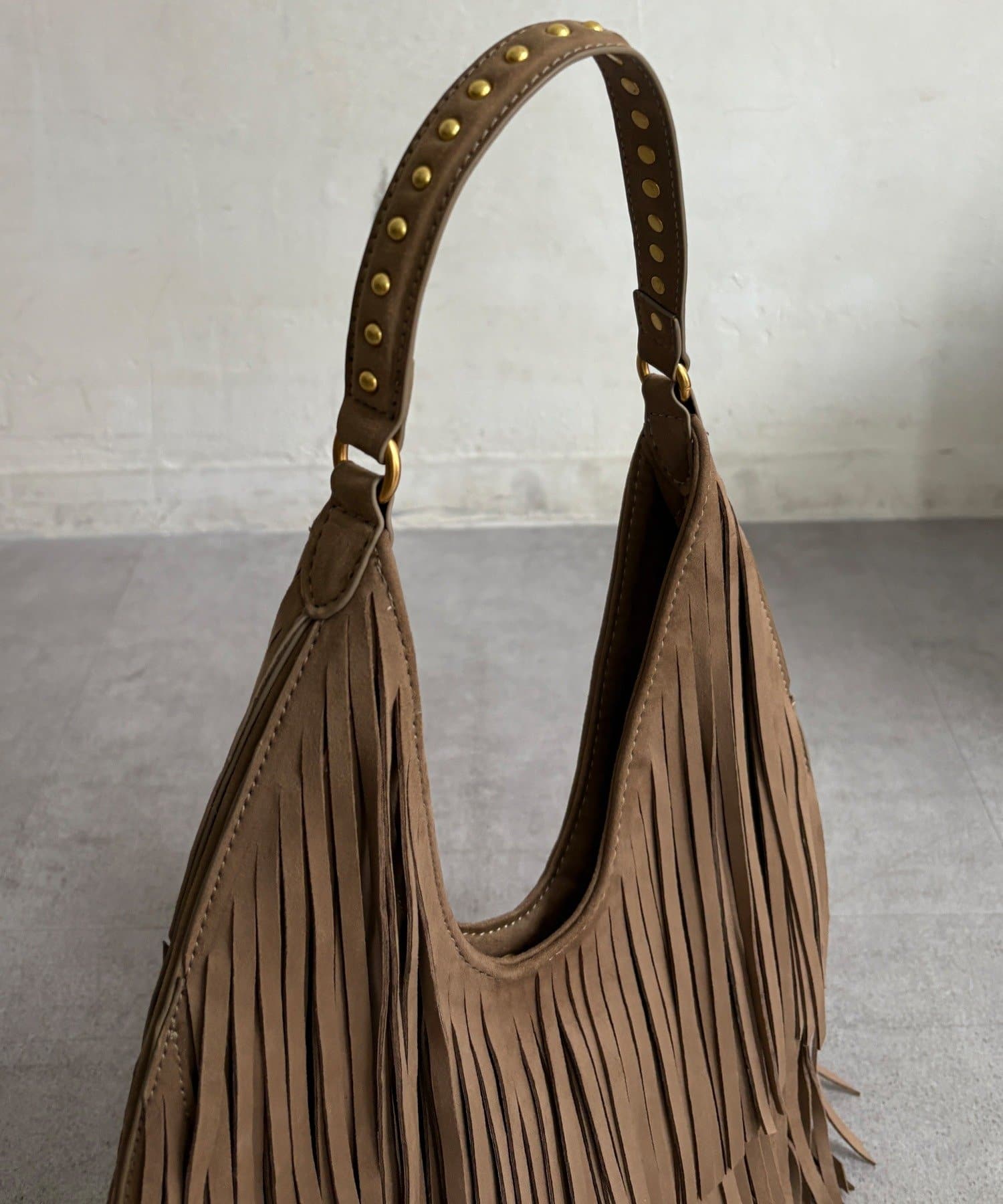 柔らかなスエード調素材にフリンジをあしらった、トレンド感たっぷりのセミショルダーバッグが登場。