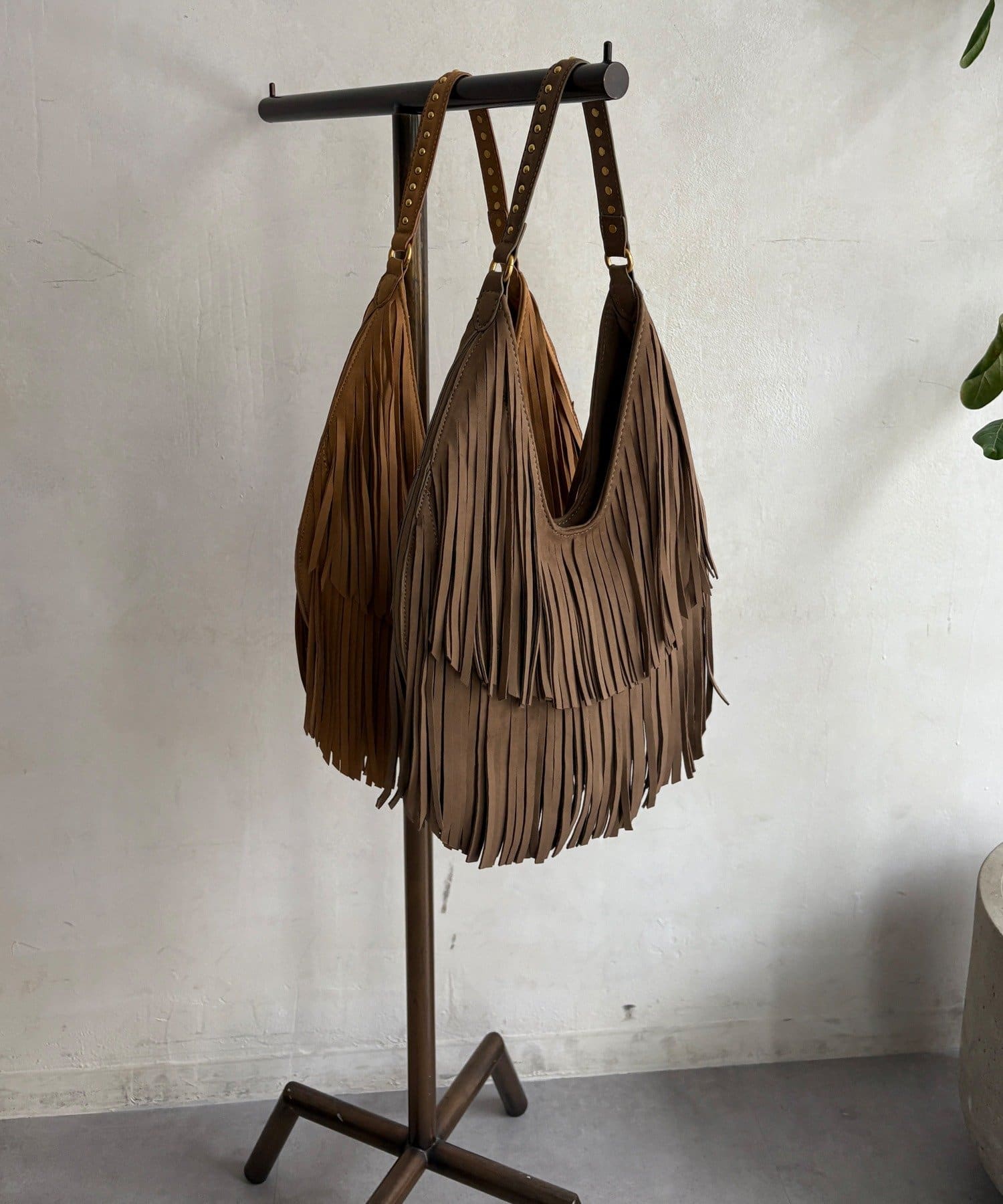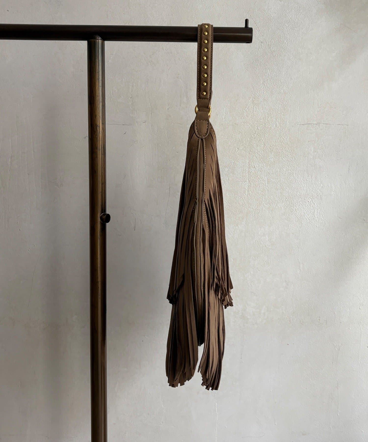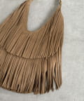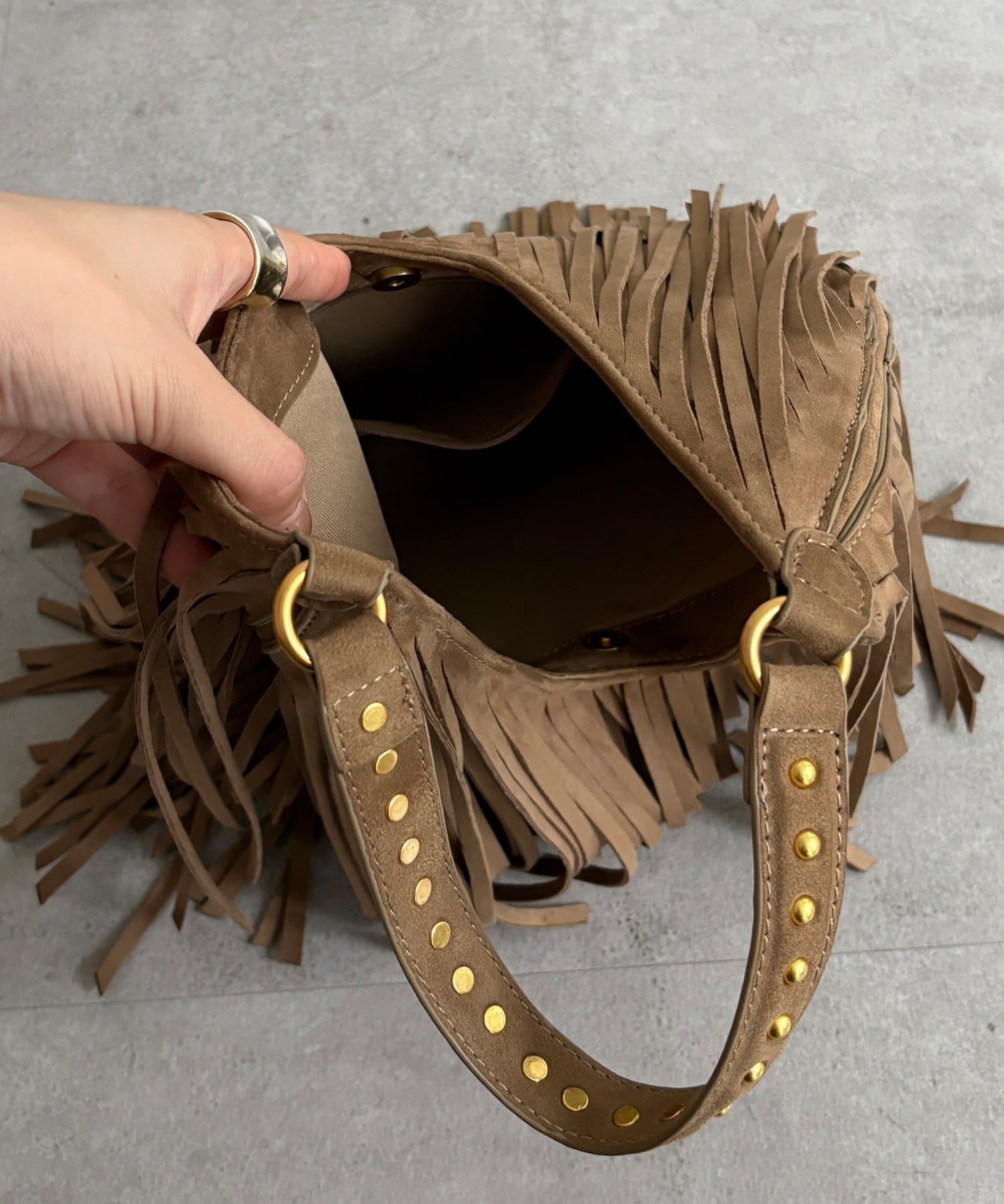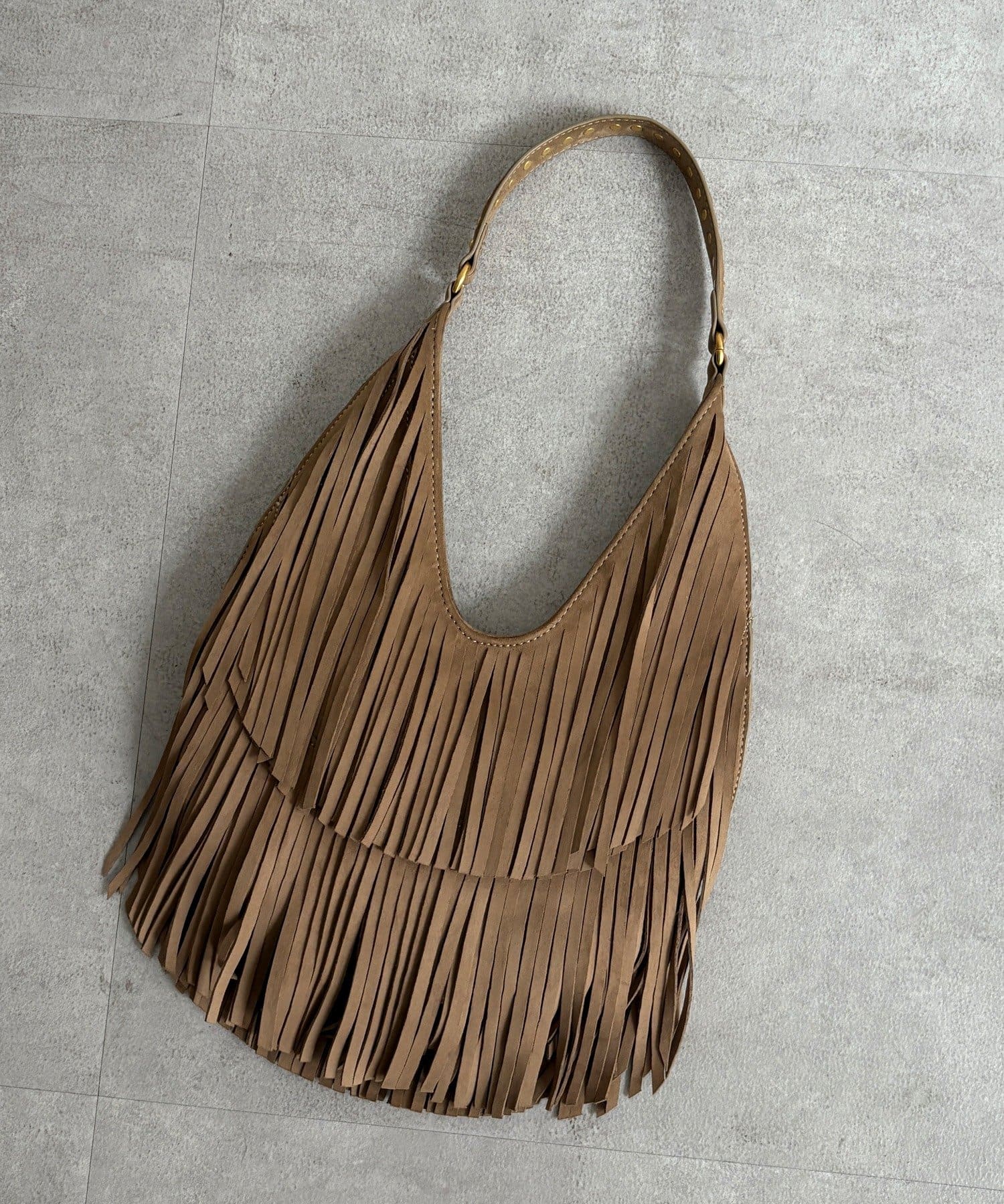 柔らかなスエード調素材にフリンジをあしらった、トレンド感たっぷりのセミショルダーバッグが登場。