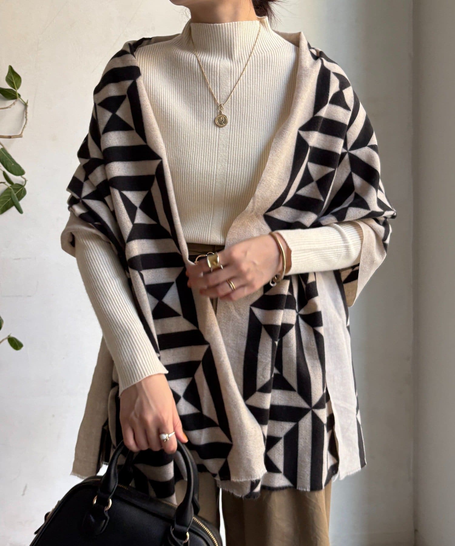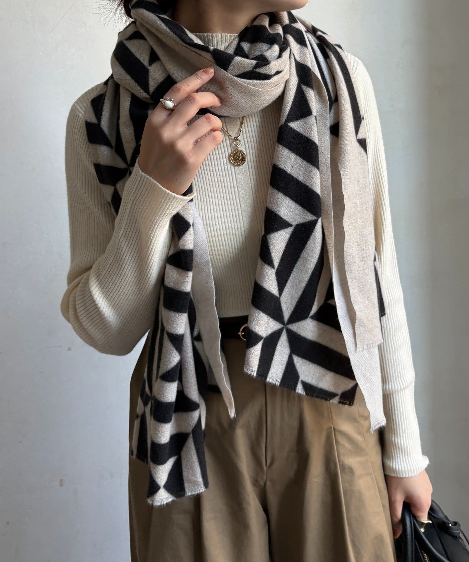 モダンで洗練された幾何学模様が、巻くだけでコーディネート全体をぐっと引き締め、上品かつ印象的な雰囲気を演出します。