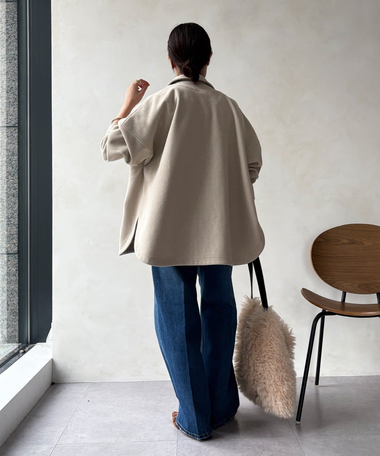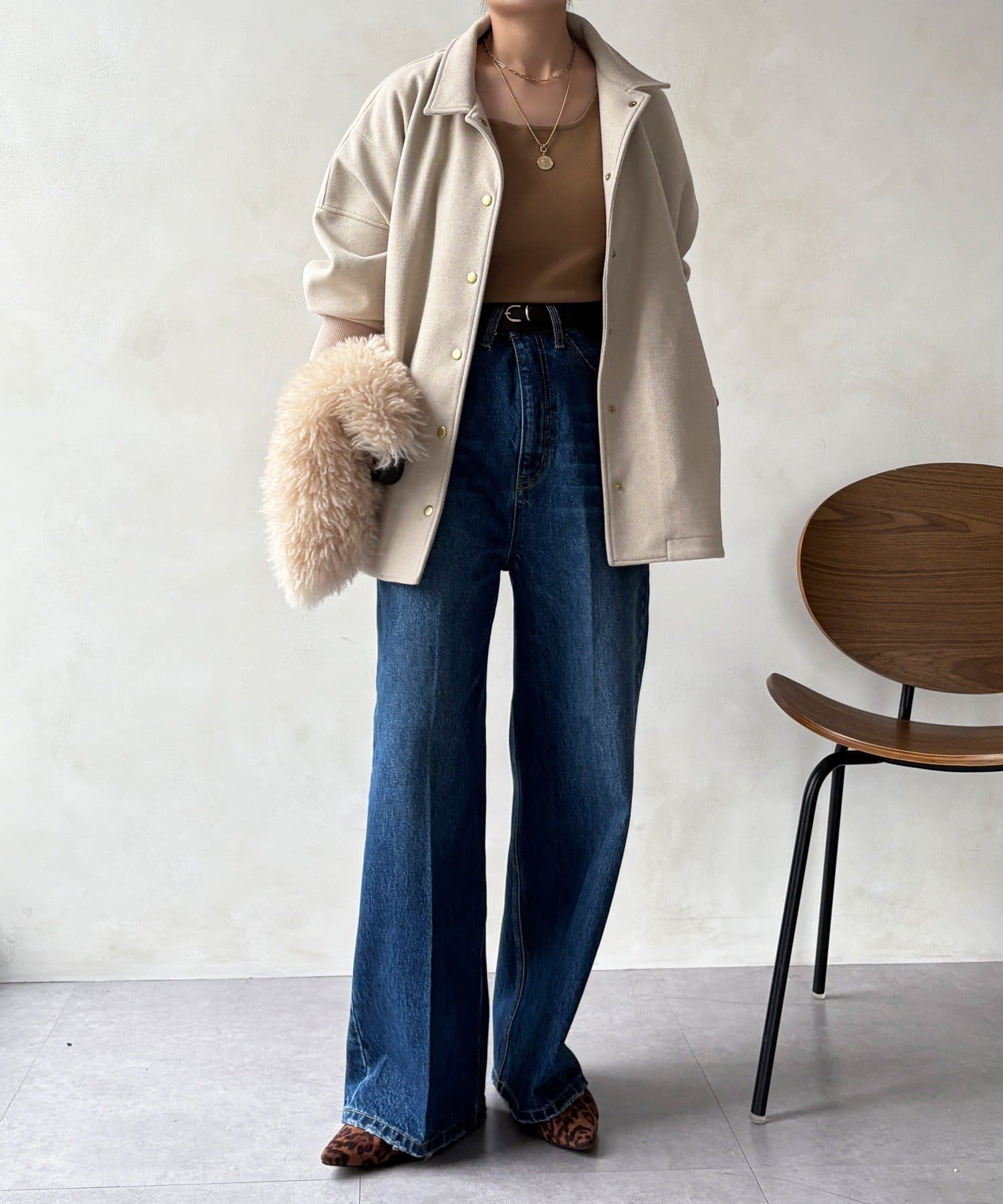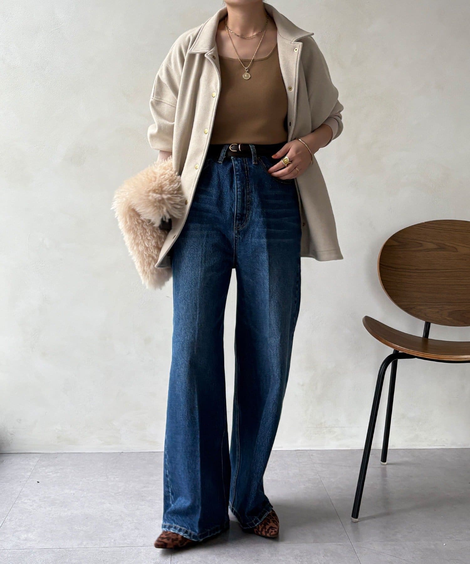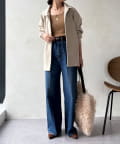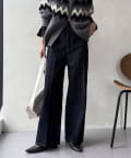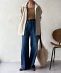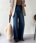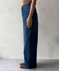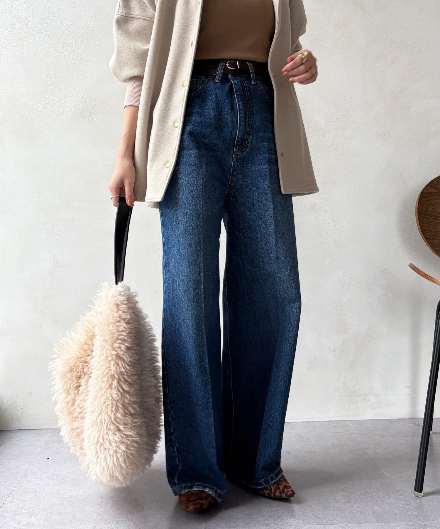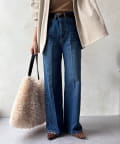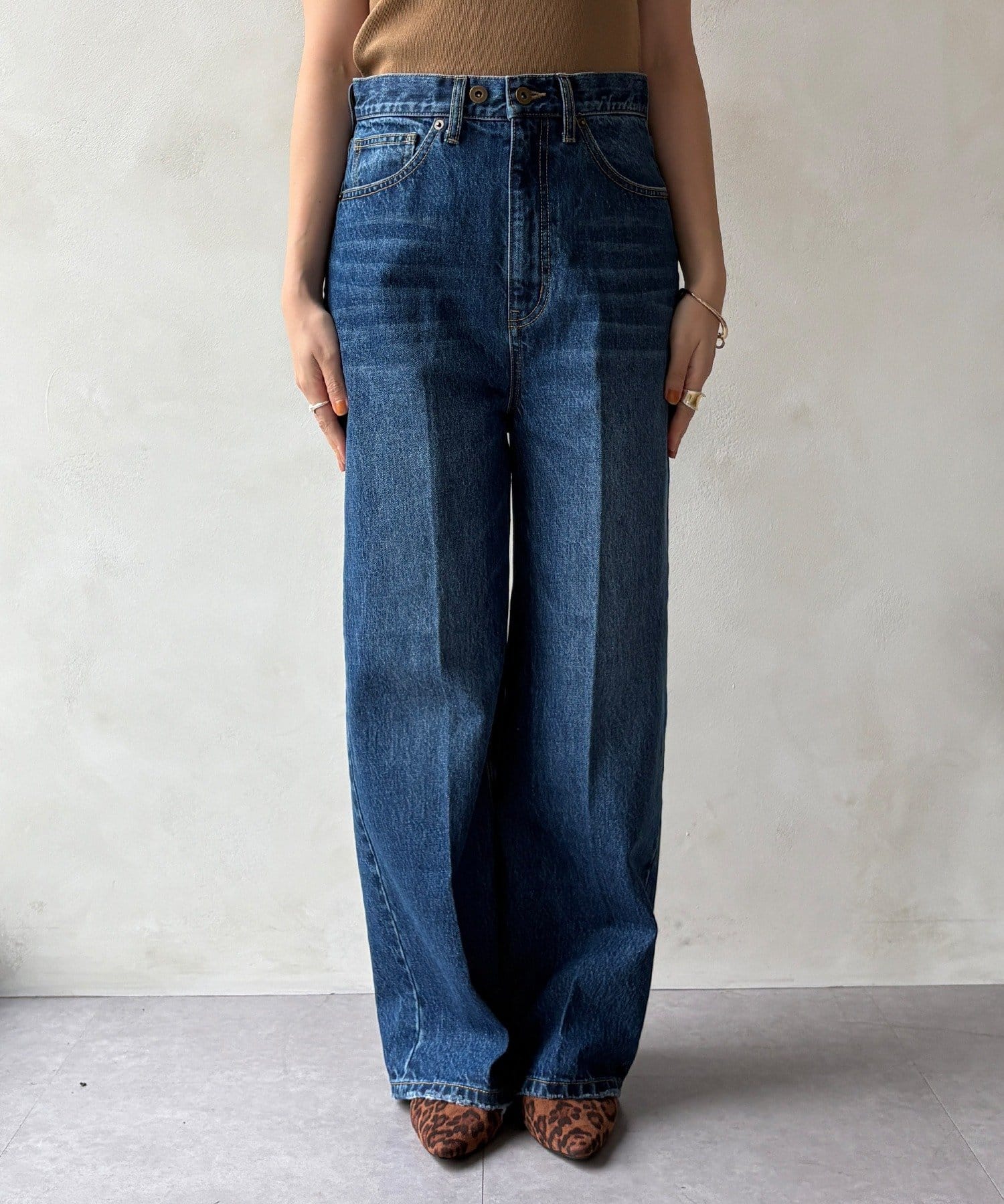 股上を深めにデザインし、腰位置を高く見せてくれるハイウエストデザインと、ストンとストレートワイドシルエットが特徴です。