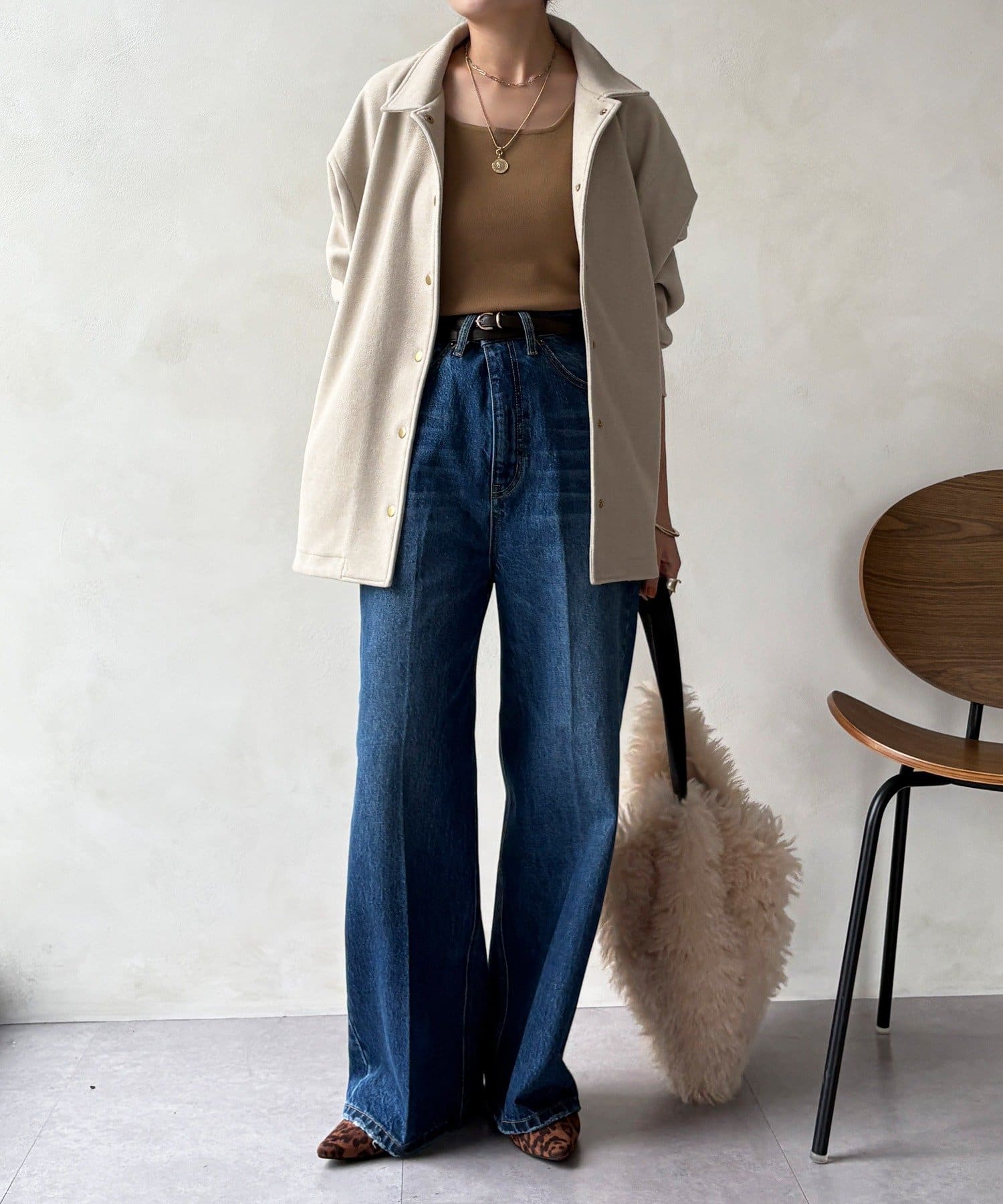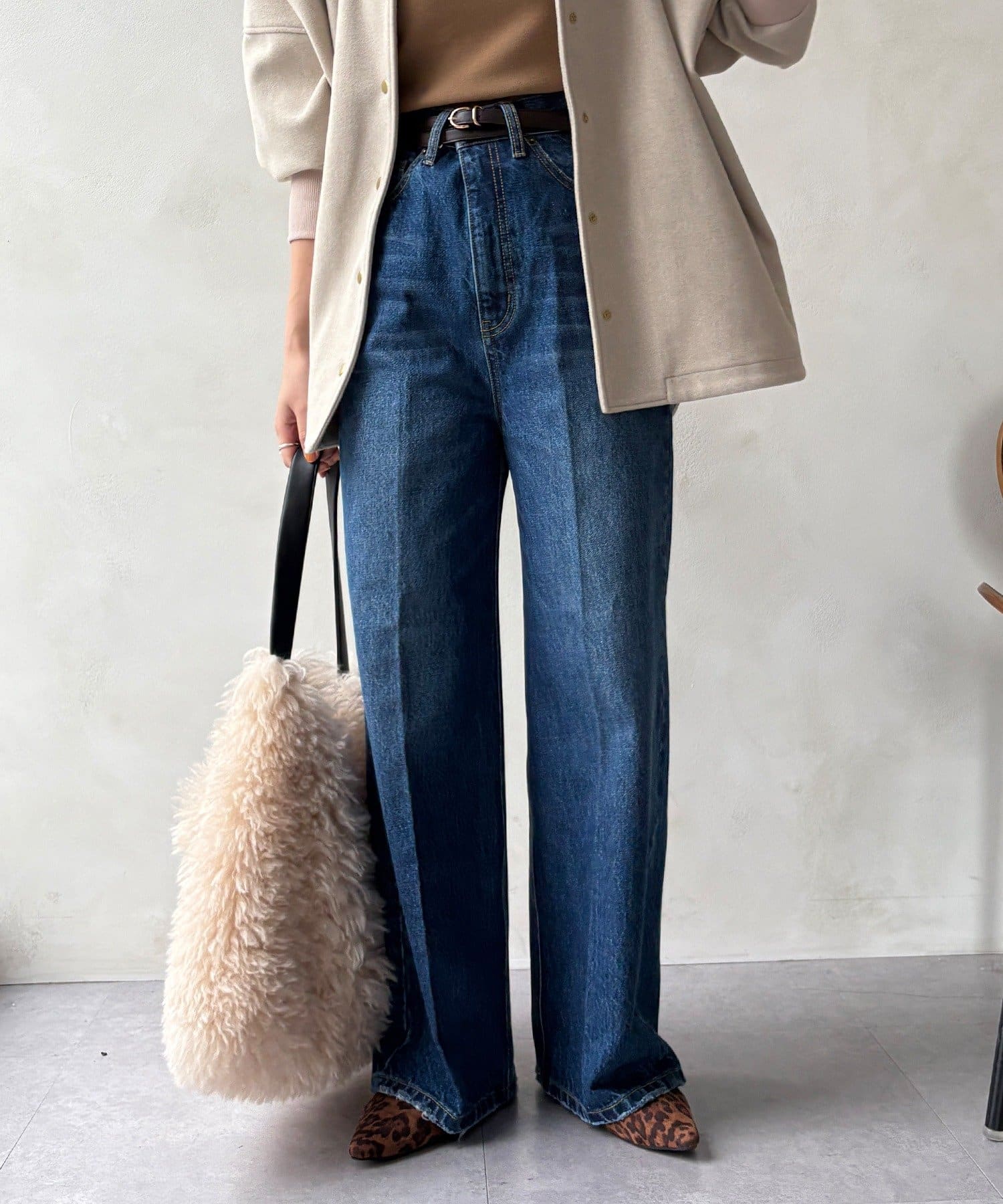 フロントにはセンタープレスを施し、縦のラインを強調。カジュアルなデニムながらも、美脚効果を洗練された印象を与えます。
