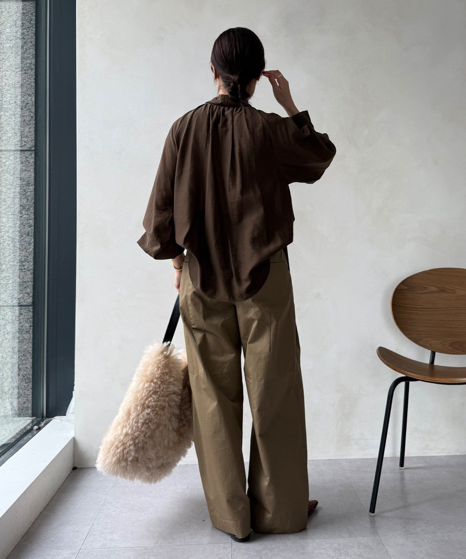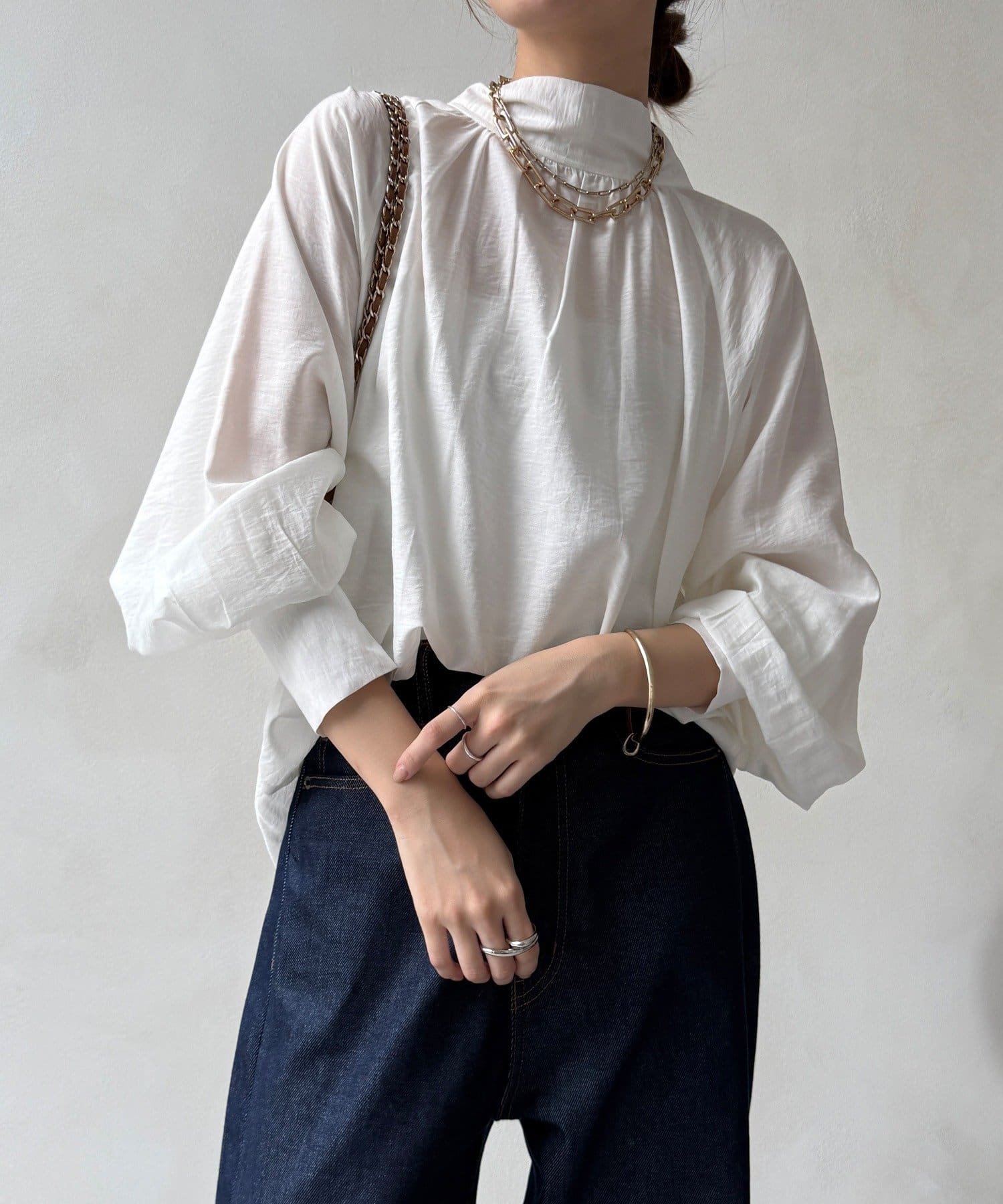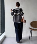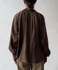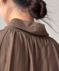 フロントのネックラインと背中にはたっぷりとギャザーを施し、ふんわりとした立体的なシルエットを生み出しています。