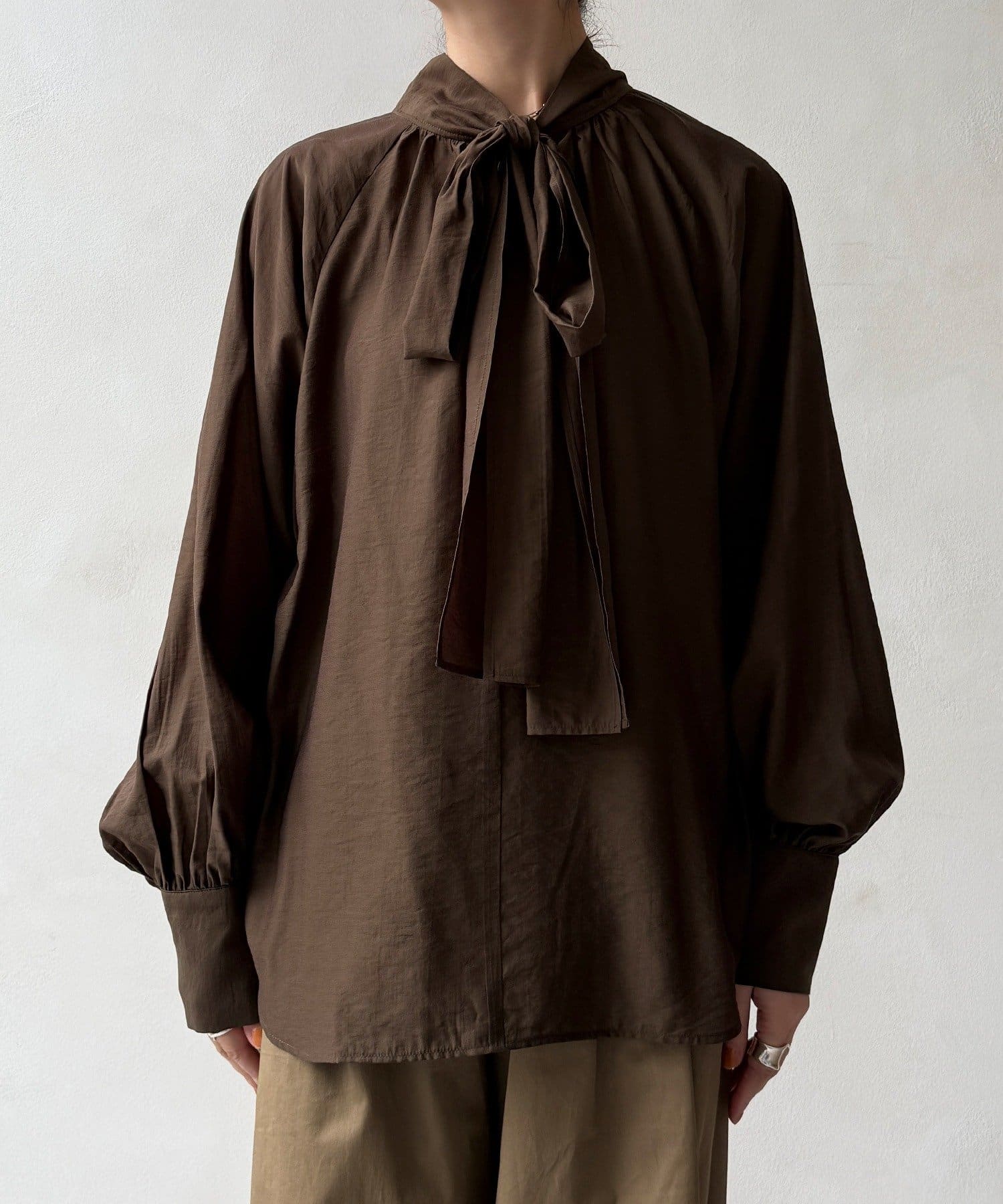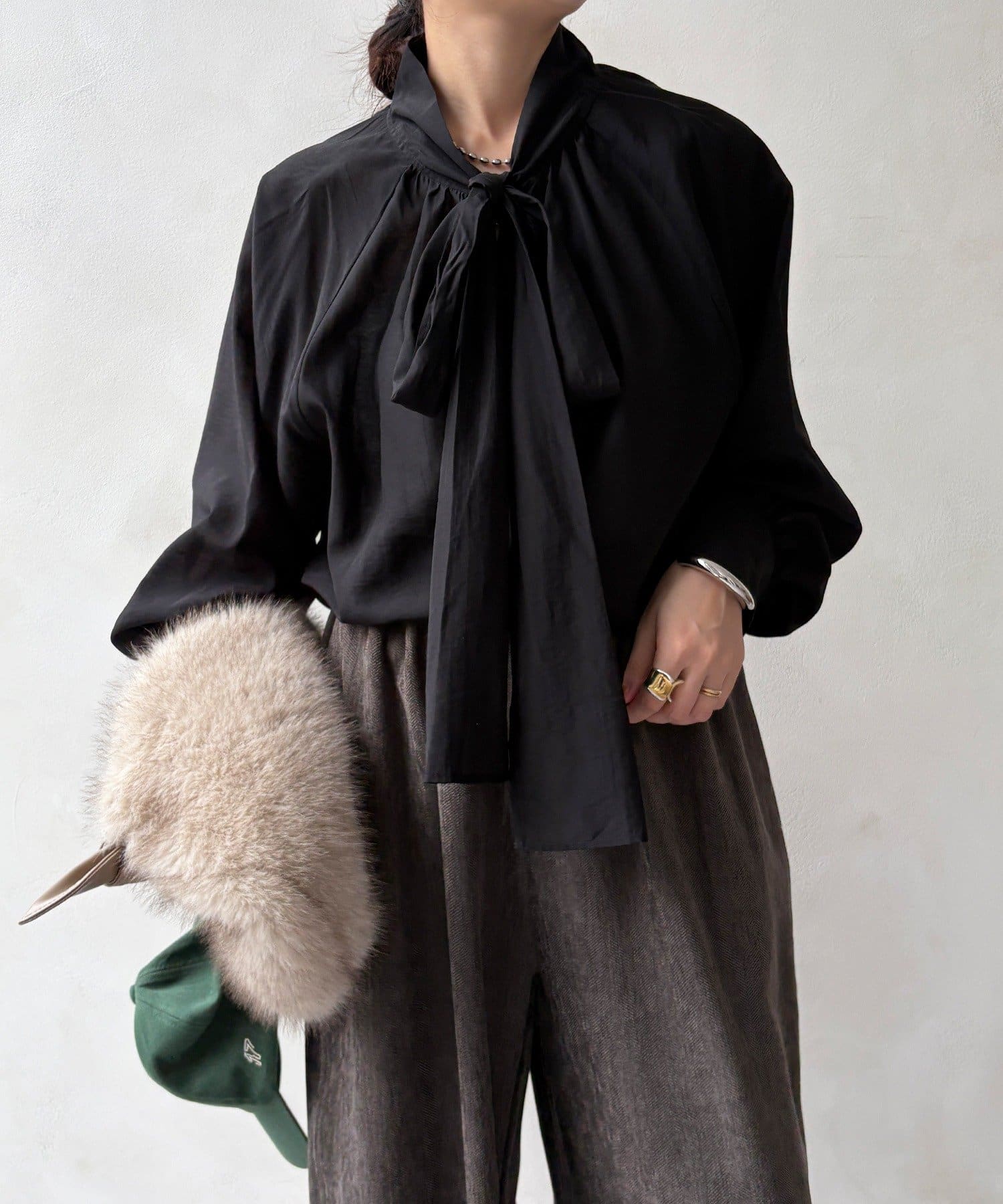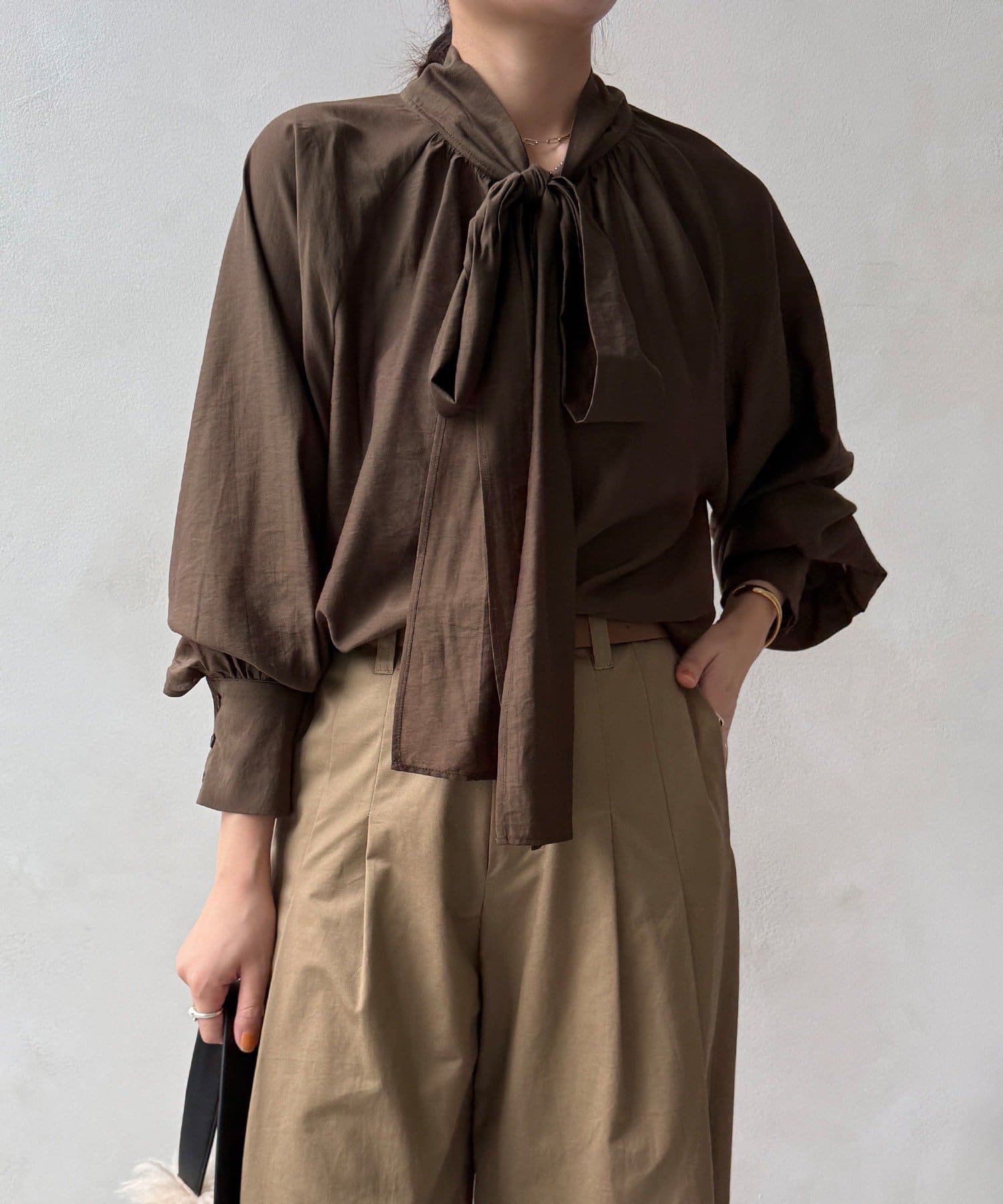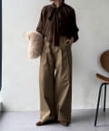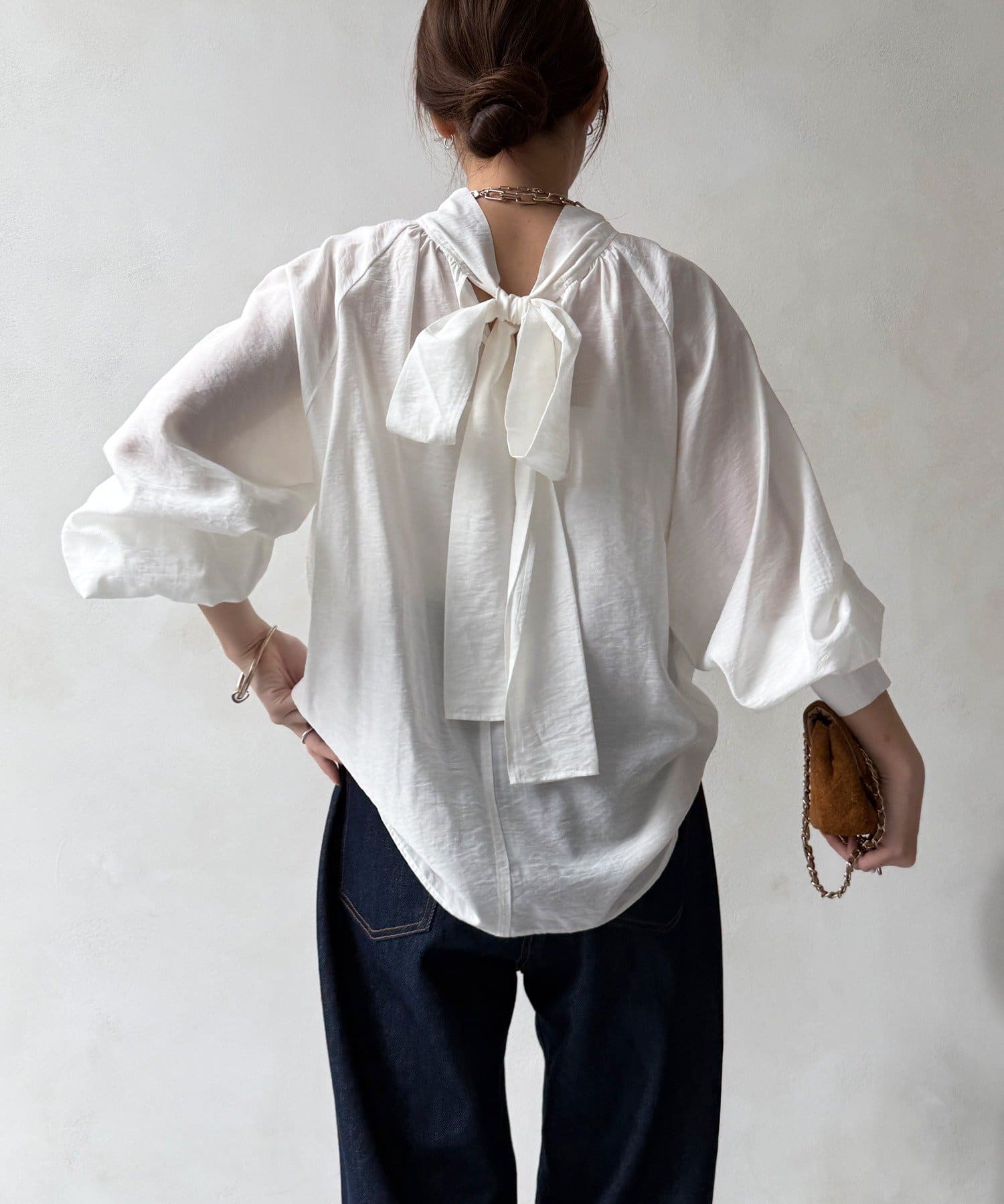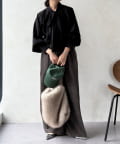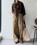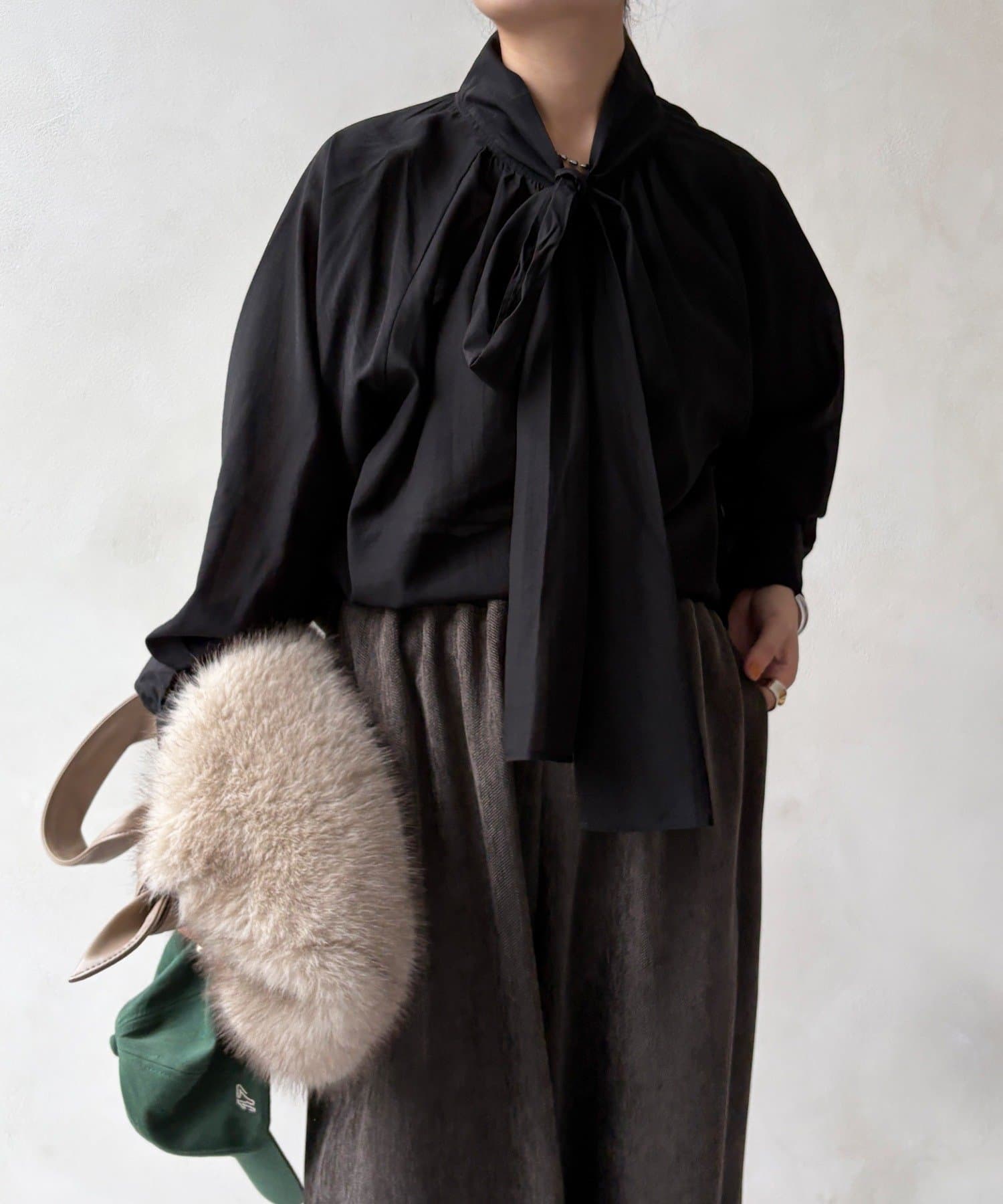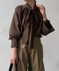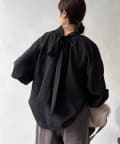 最大のポイントは首元に付属した長めのボウタイ。軽く一結びしてラフに垂らせば洗練された大人のムードに。アレンジ次第で様々な表情を楽しめます。