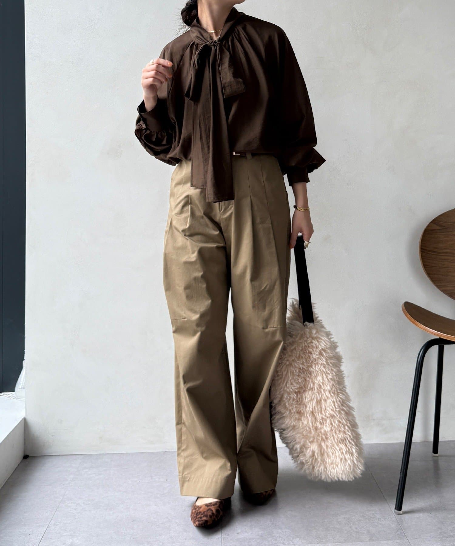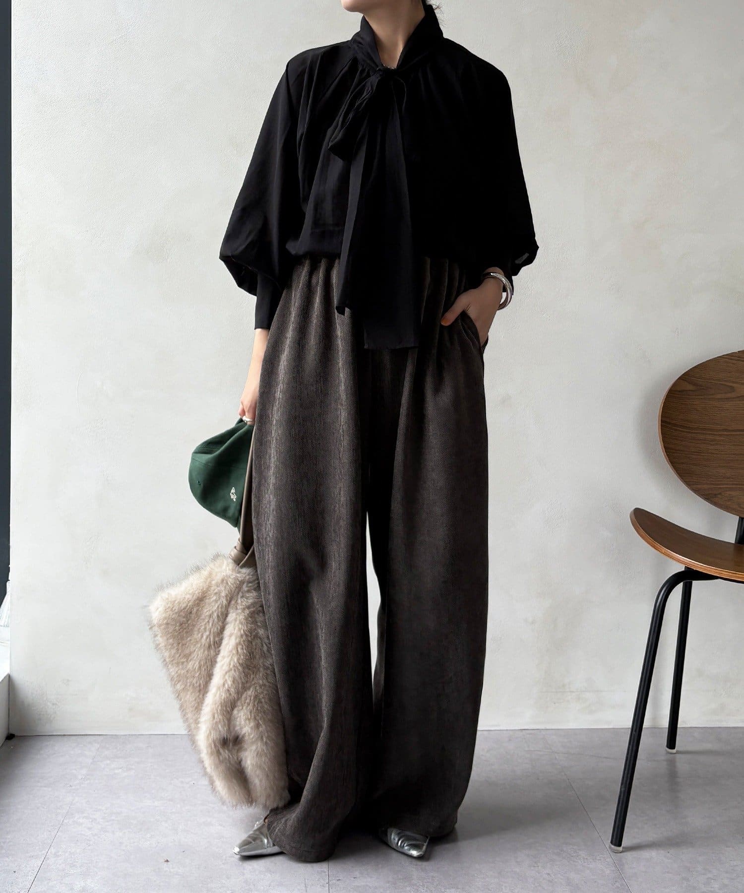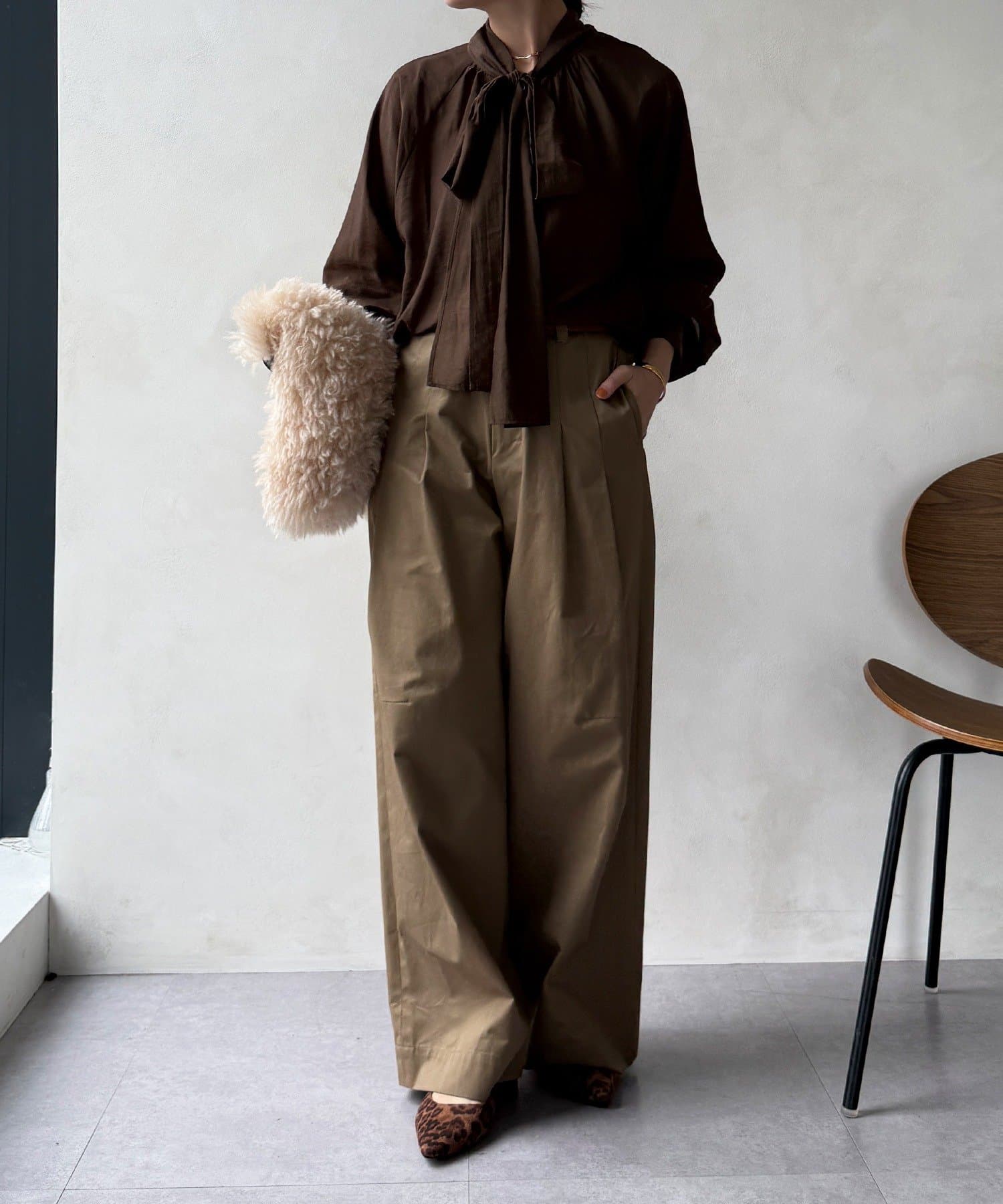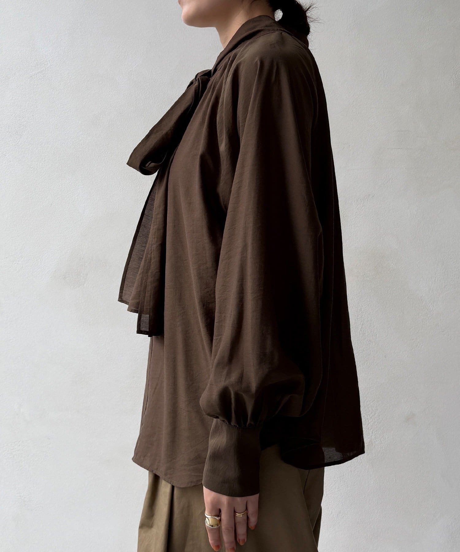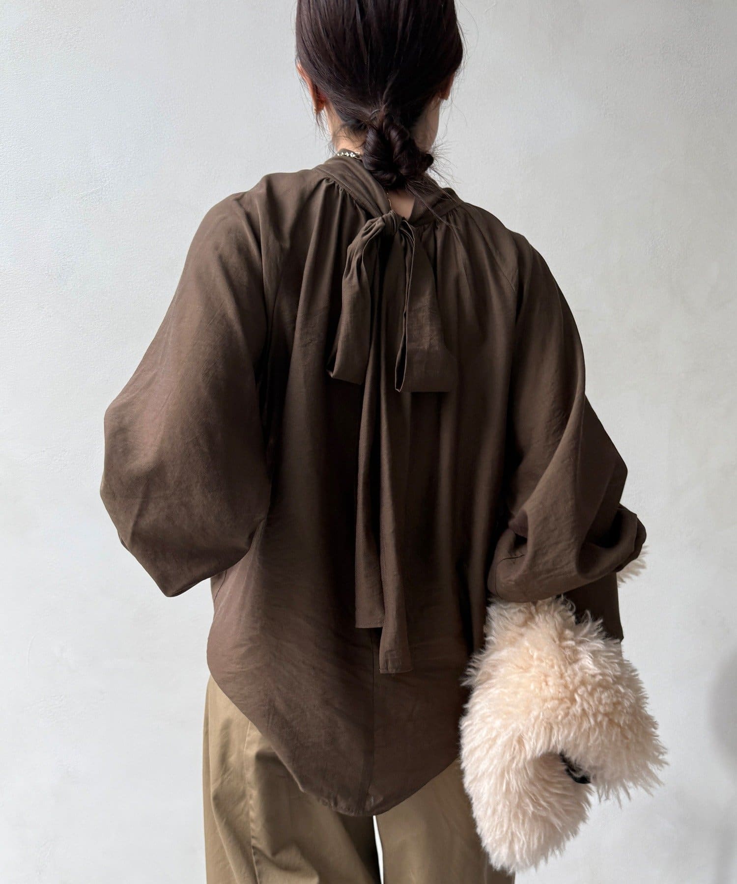 最大のポイントは首元に付属した長めのボウタイ。軽く一結びしてラフに垂らせば洗練された大人のムードに。アレンジ次第で様々な表情を楽しめます。