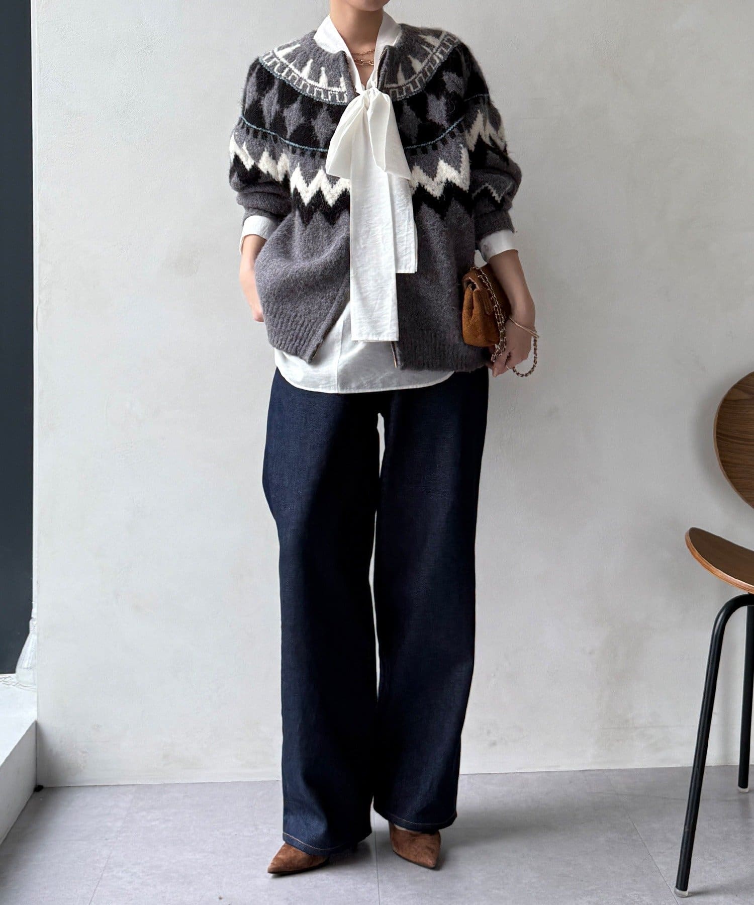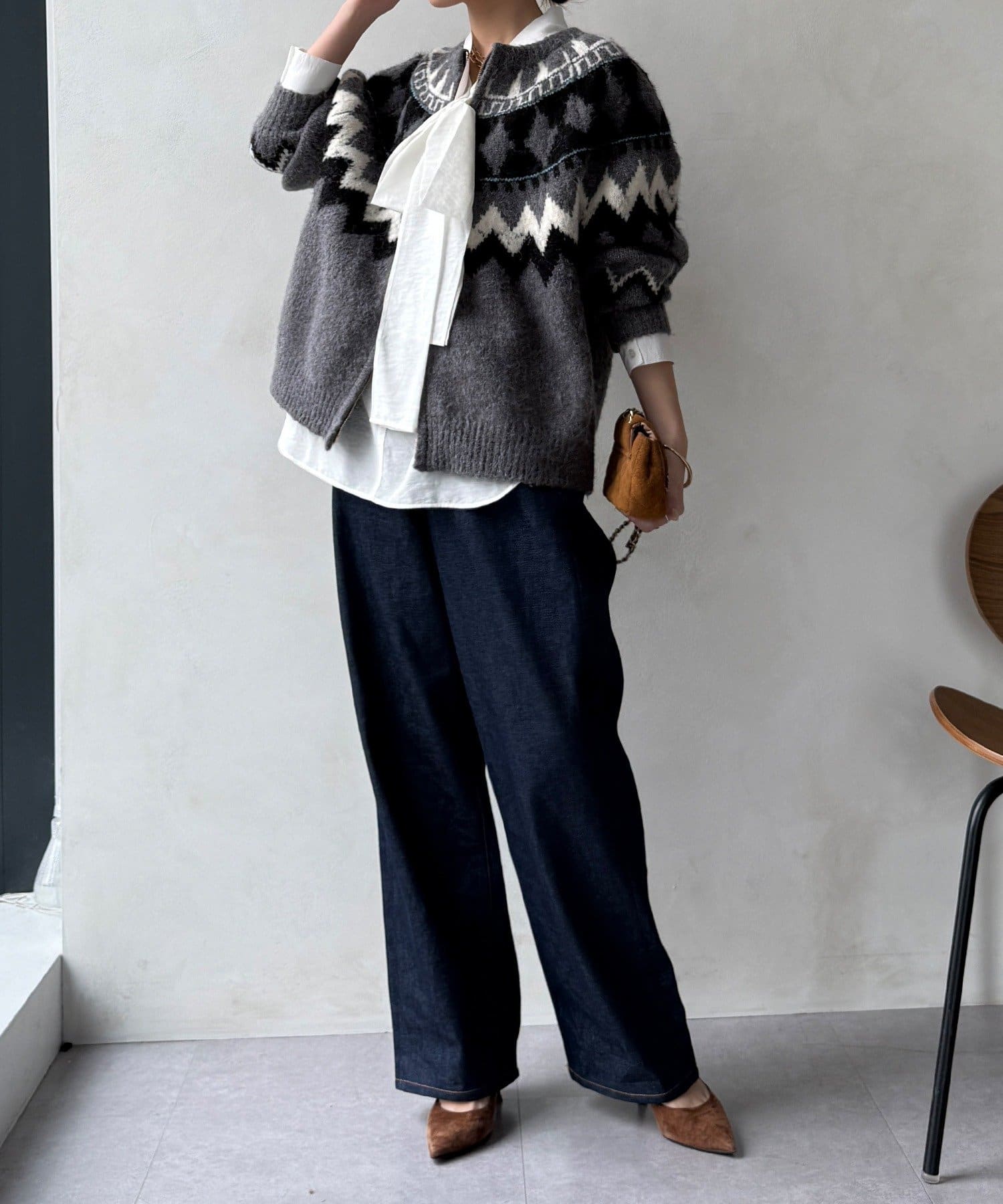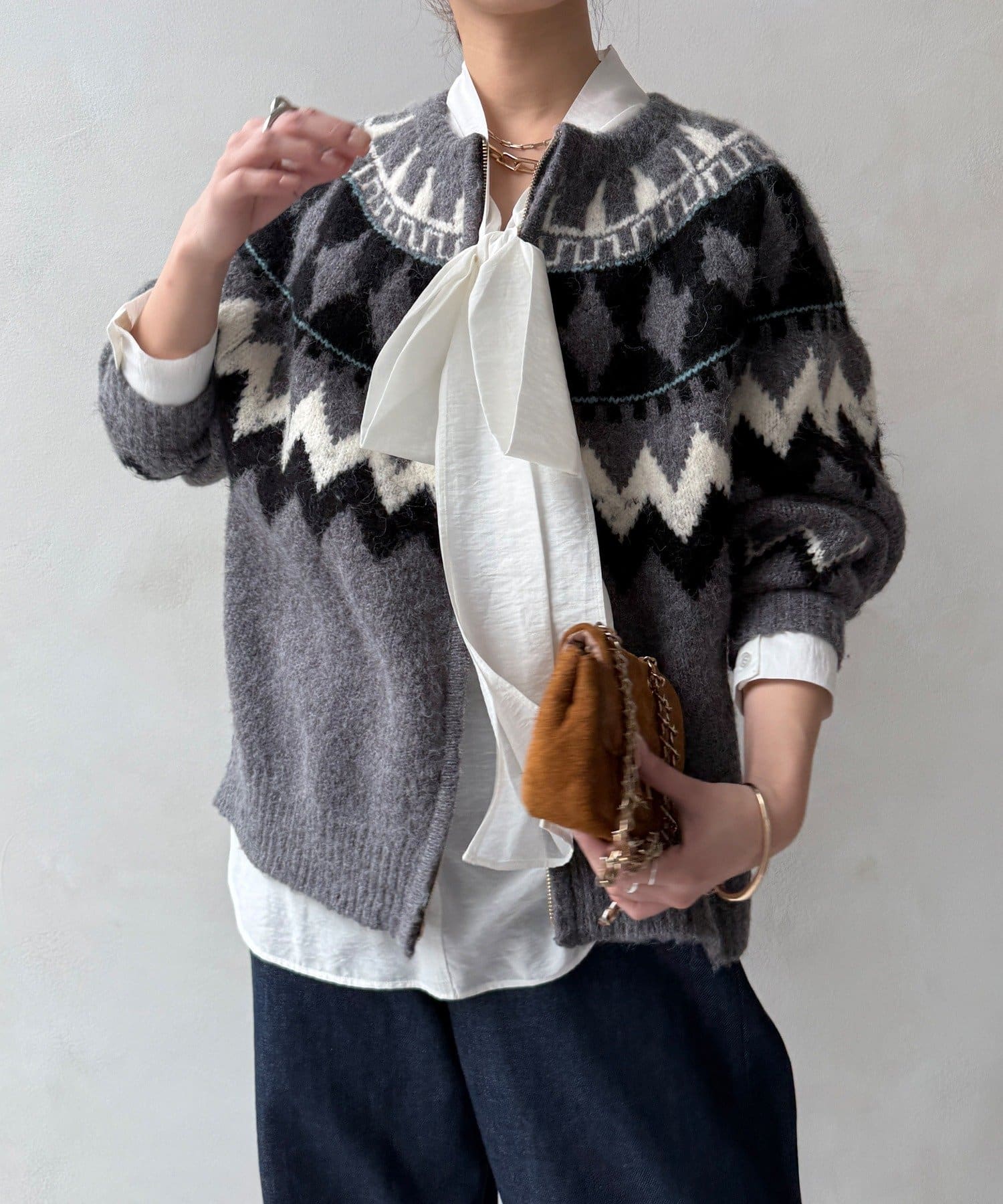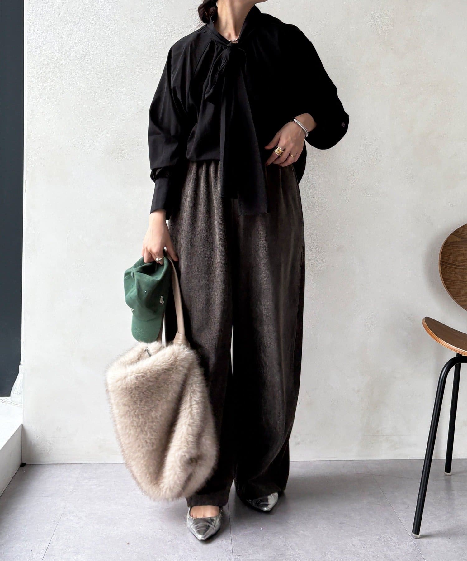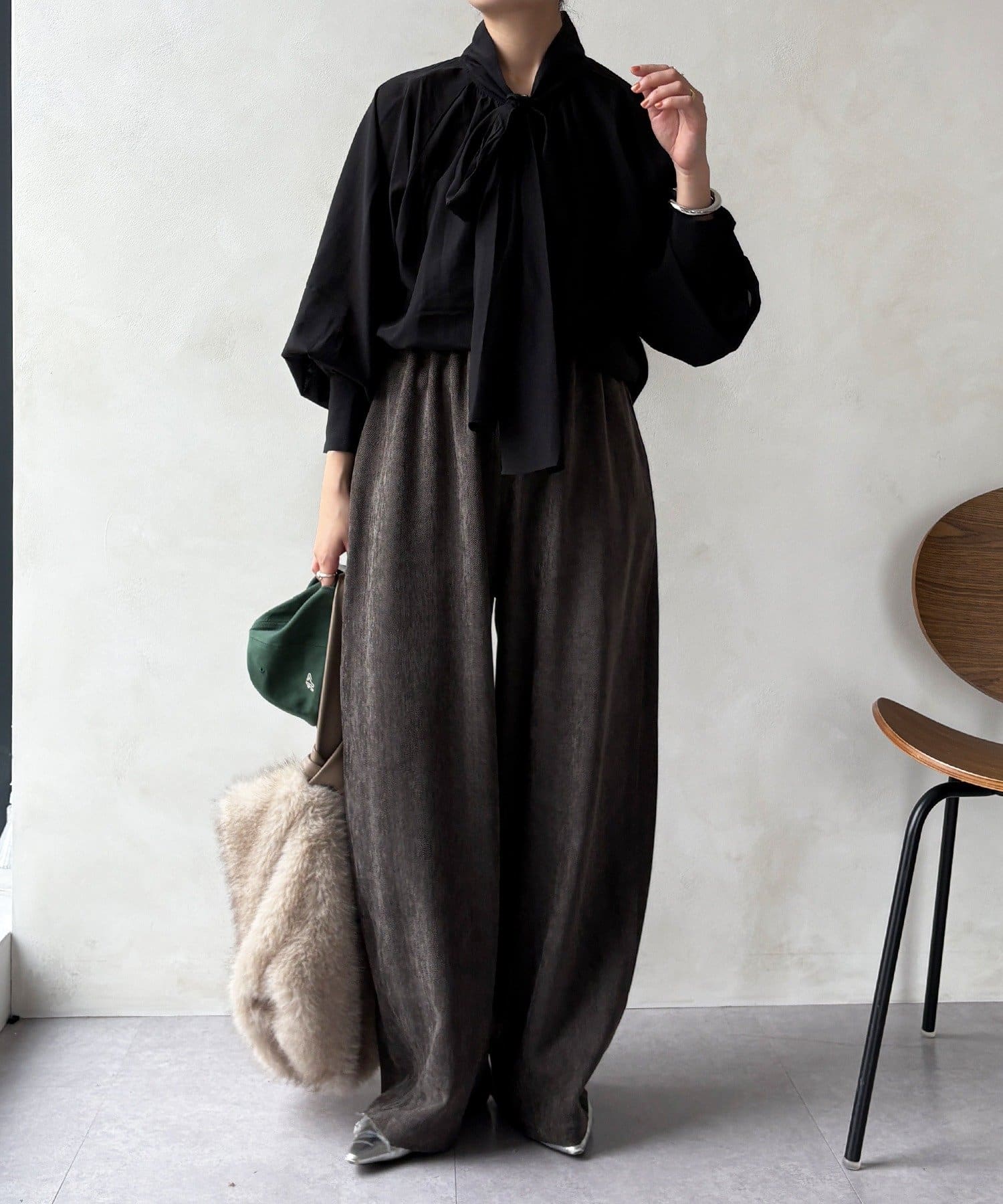 最大のポイントは首元に付属した長めのボウタイ。軽く一結びしてラフに垂らせば洗練された大人のムードに。アレンジ次第で様々な表情を楽しめます。