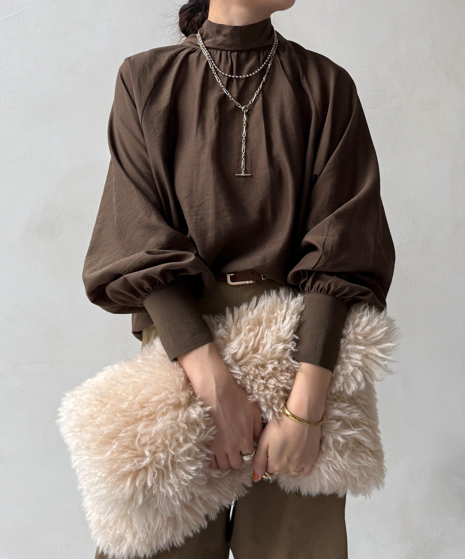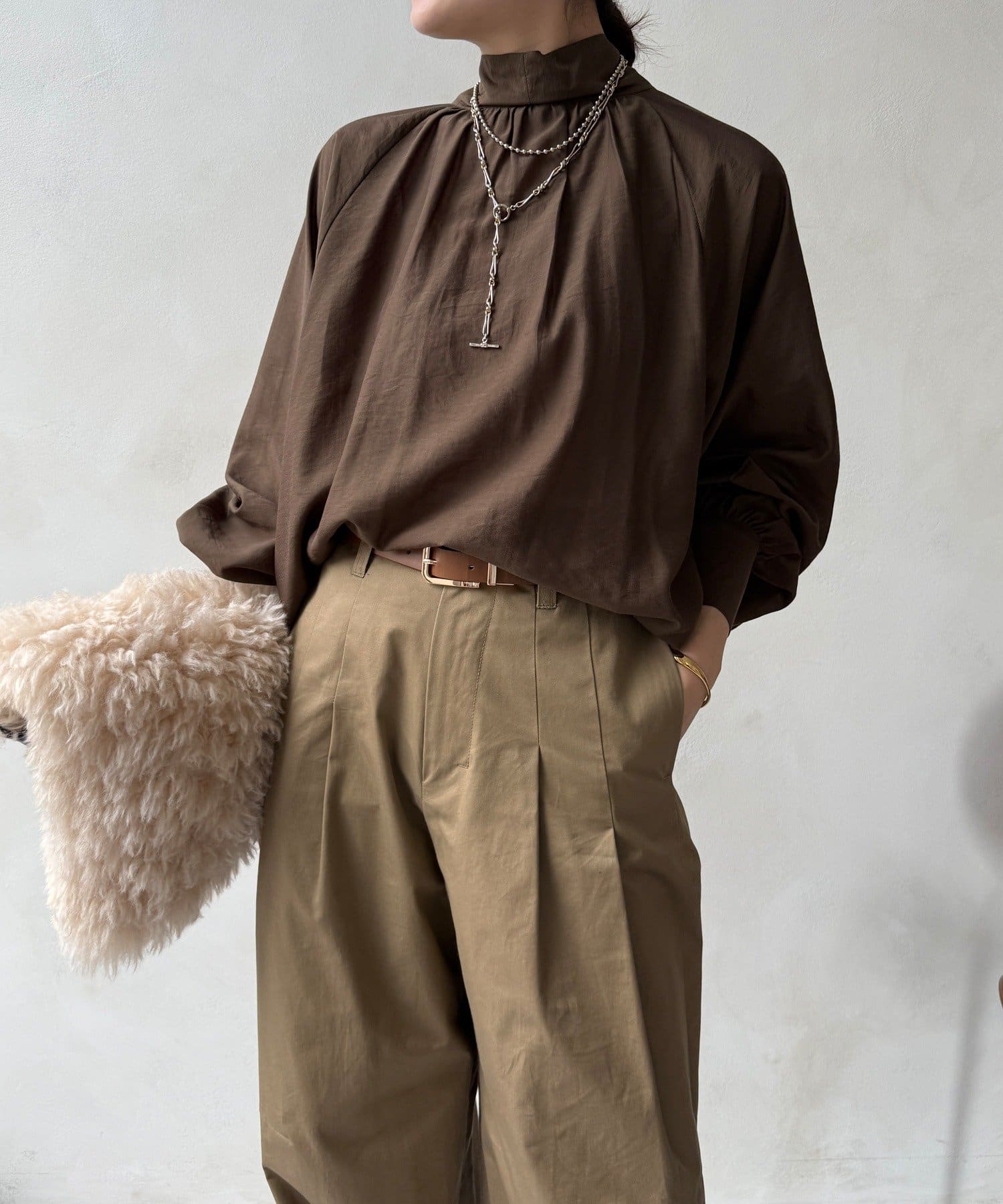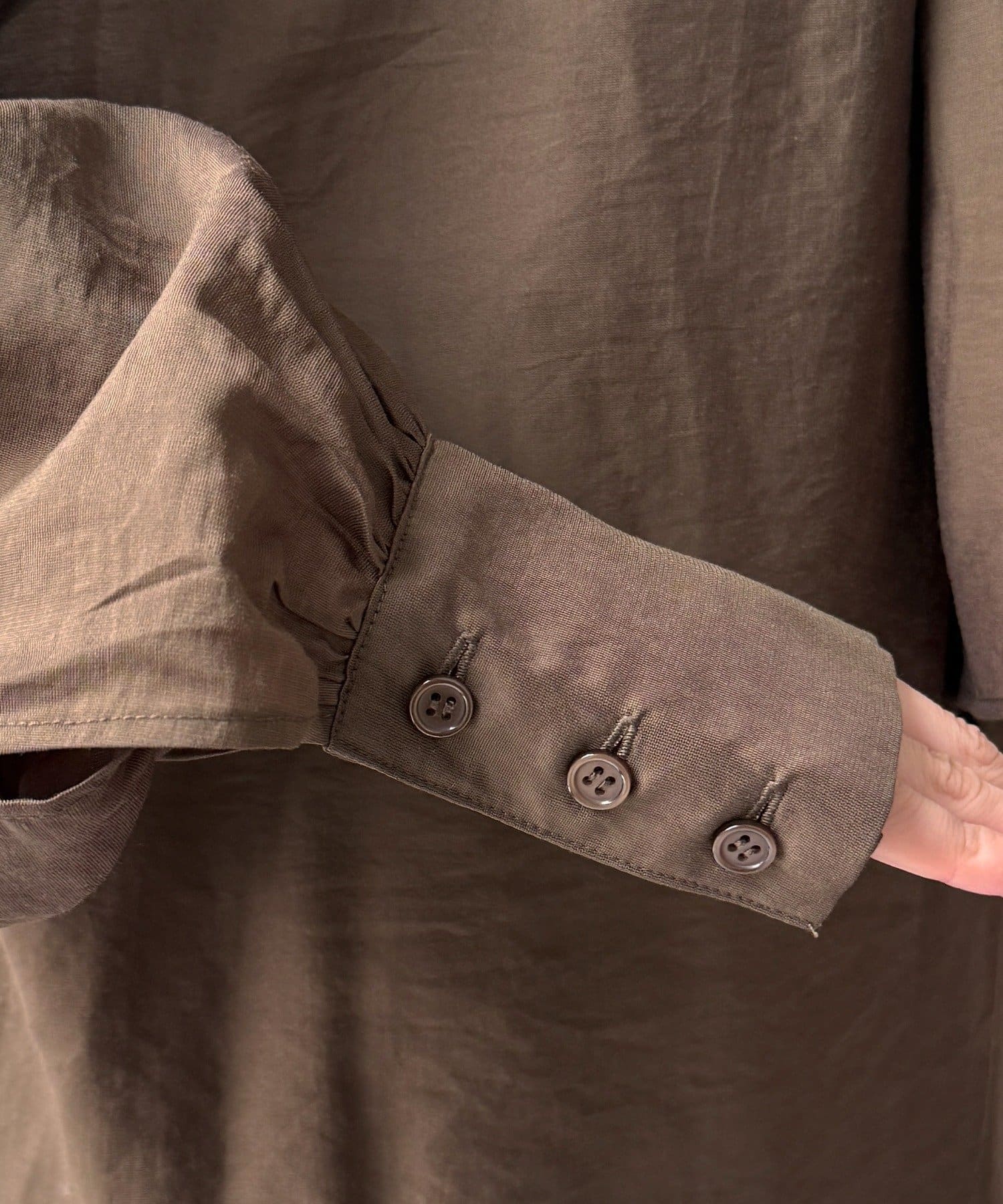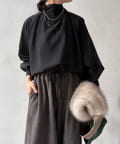 上品なドレープ感と、控えめな光沢がきれいなブラウス。