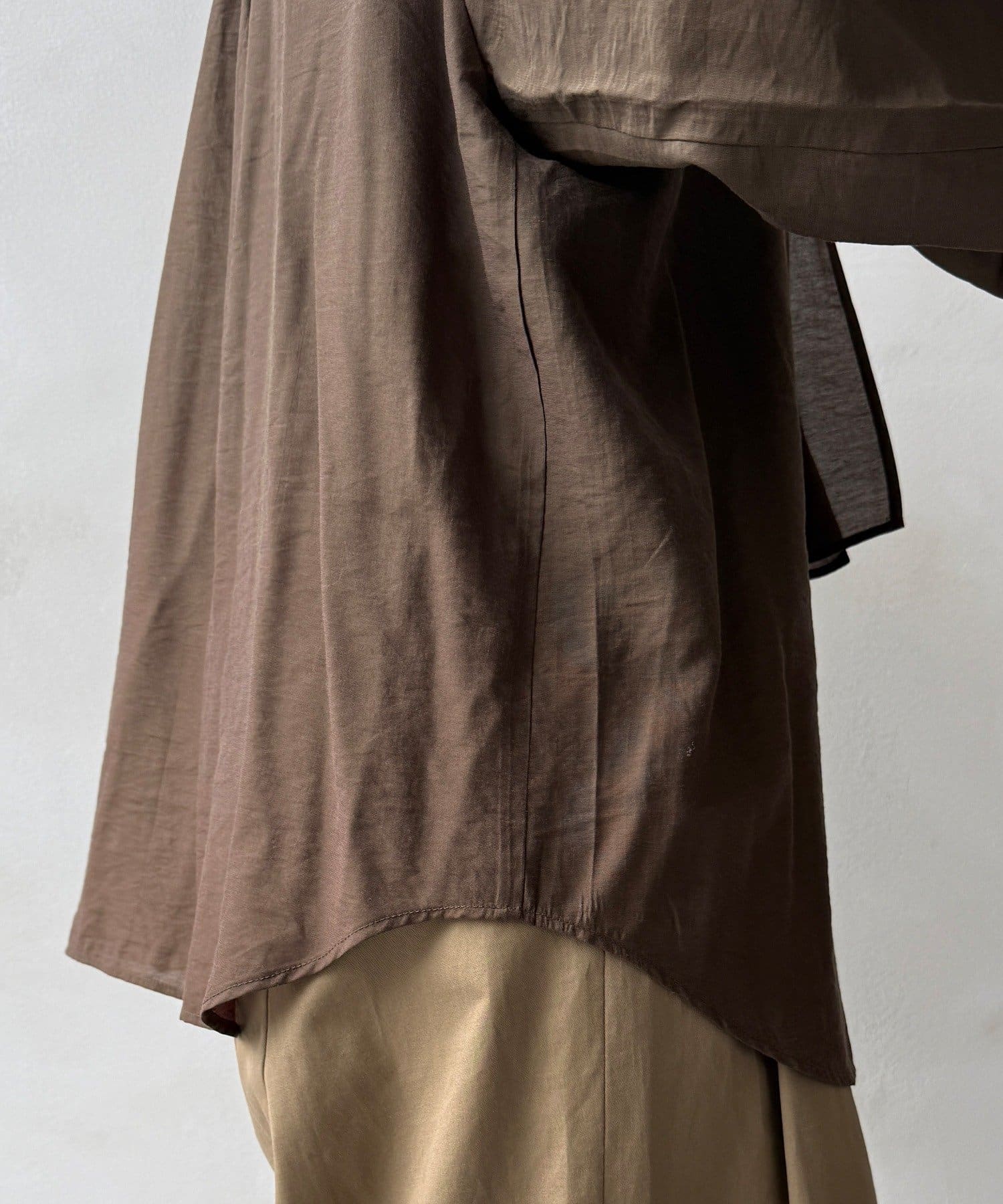 レーヨンを多く含む素材特性により、肌に馴染むような滑らかな着心地と、動くたびに優雅に揺れる落ち感を実現。