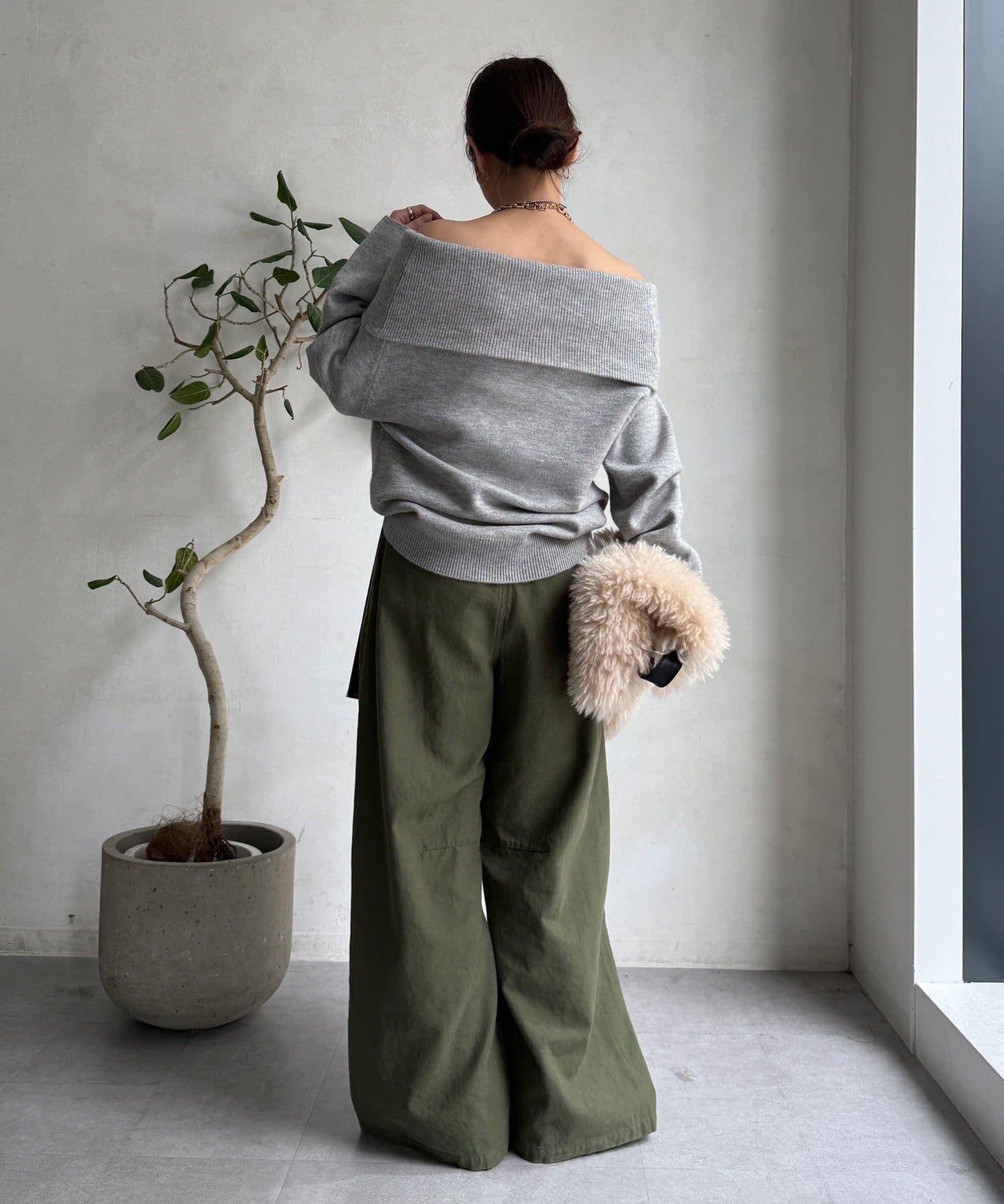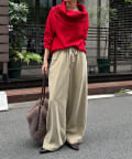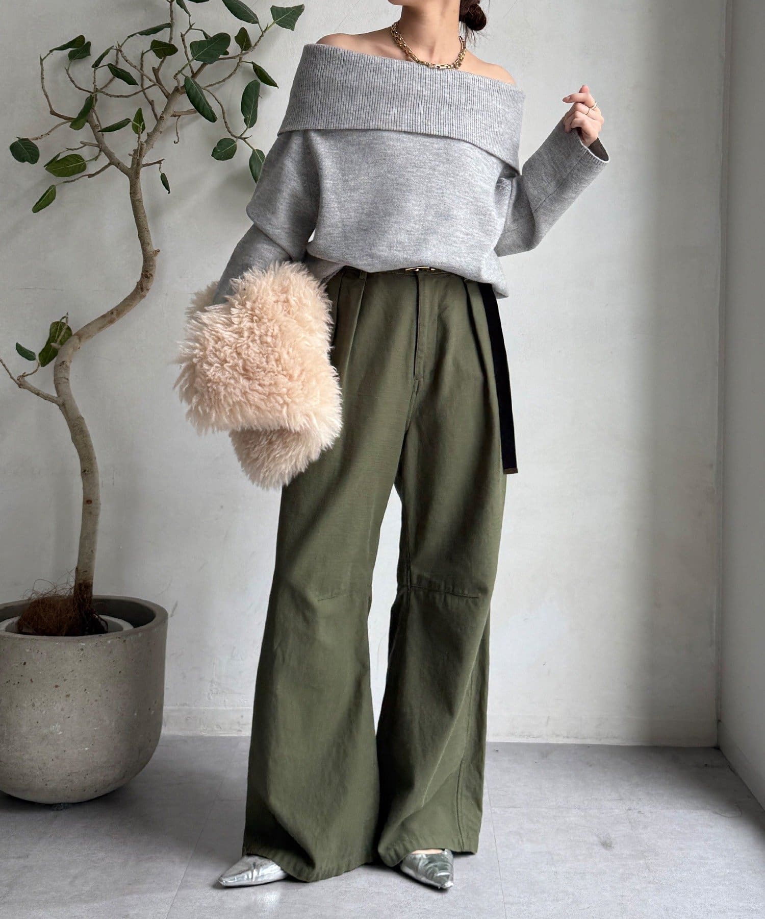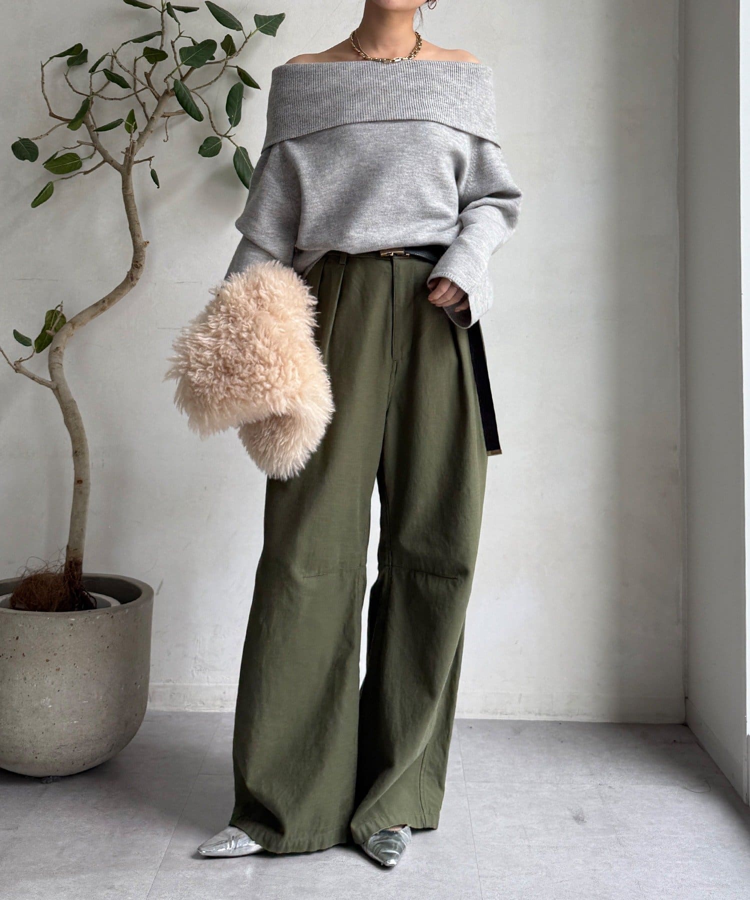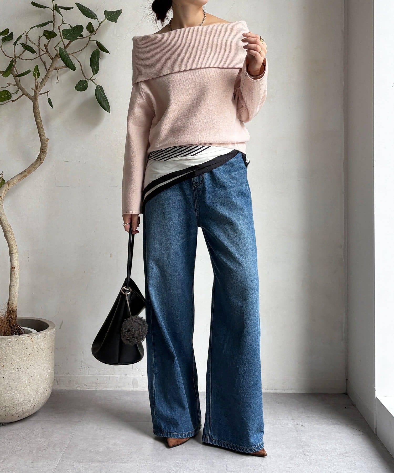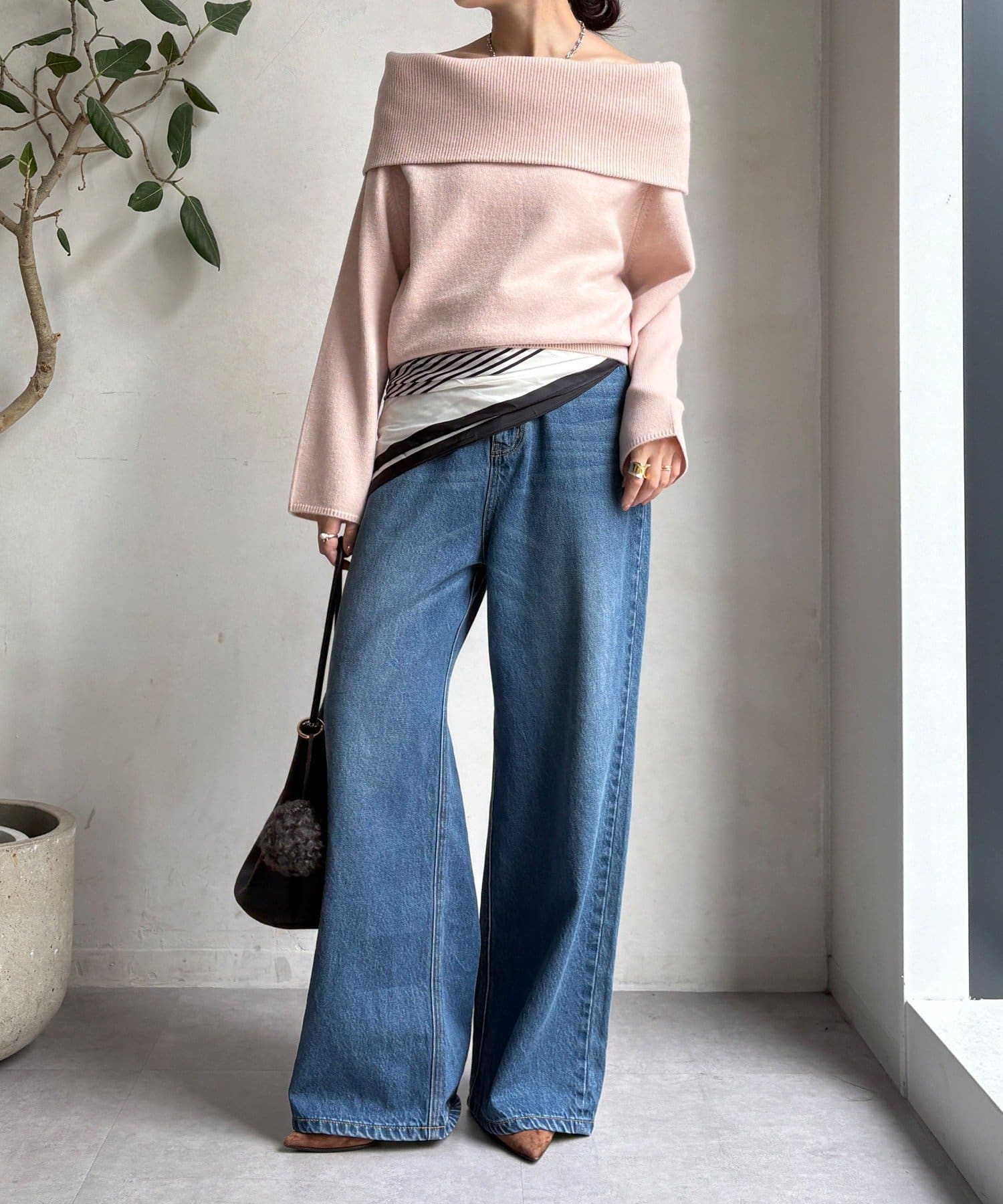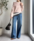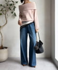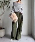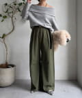 ネック部分をそのままくしゅっとラフに着ても、オフショルとしてしっかりと肩を見せて着ても、どちらでも程よくレディライクにおしゃれに着こなすことができる1着です。