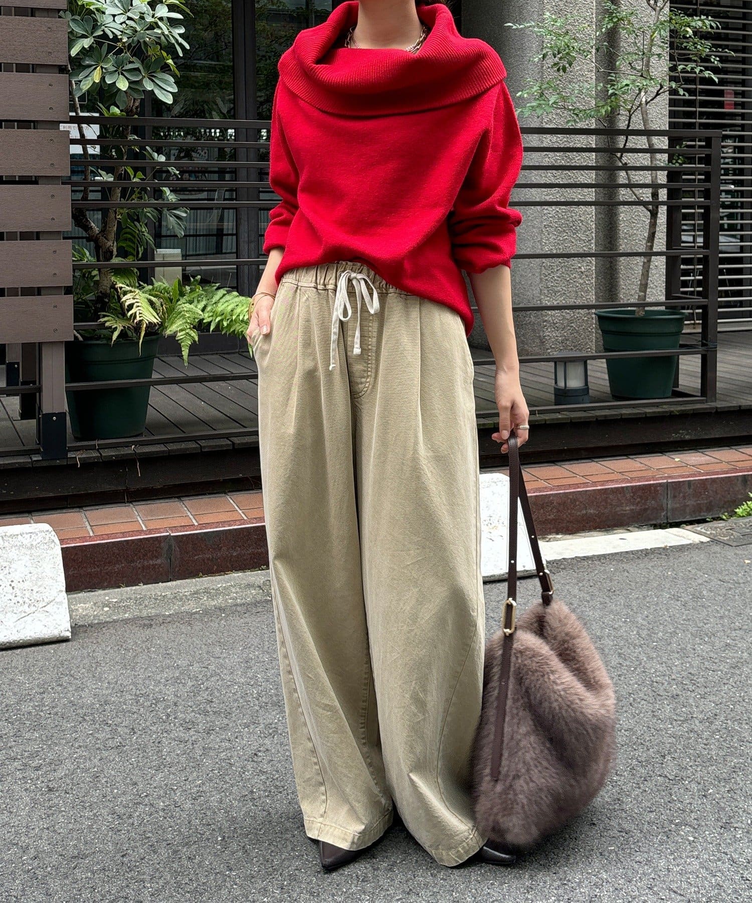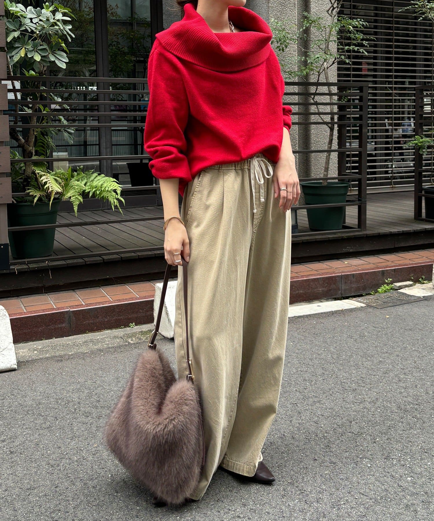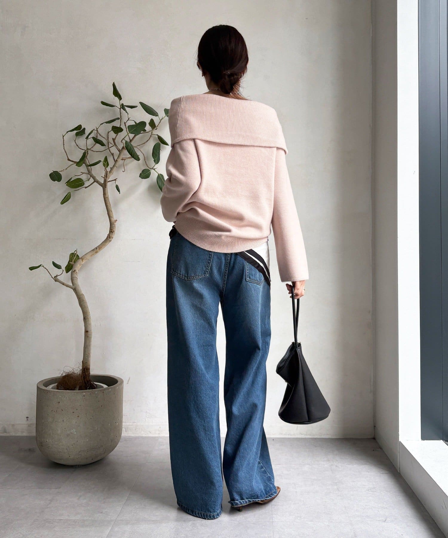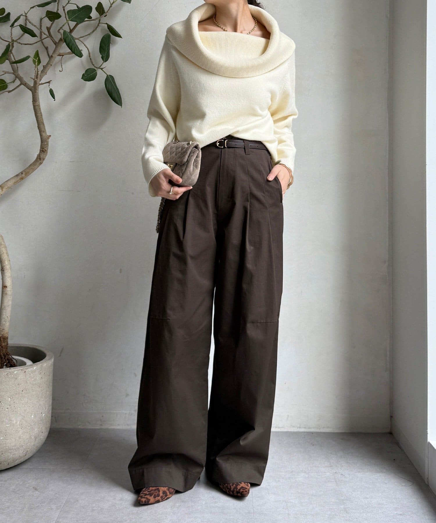 ネック部分をそのままくしゅっとラフに着ても、オフショルとしてしっかりと肩を見せて着ても、どちらでも程よくレディライクにおしゃれに着こなすことができる1着です。