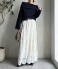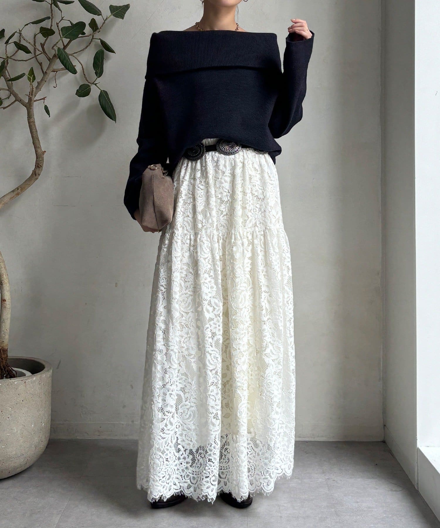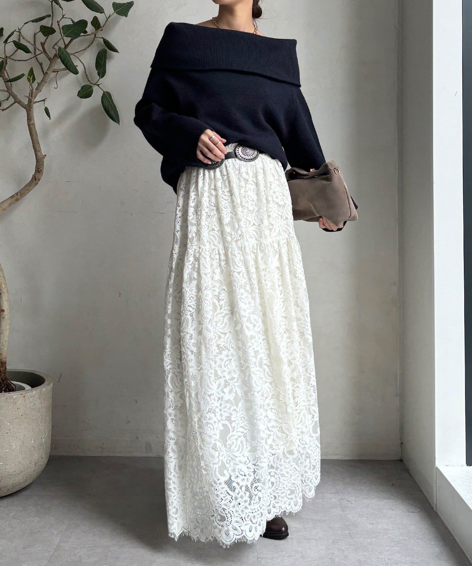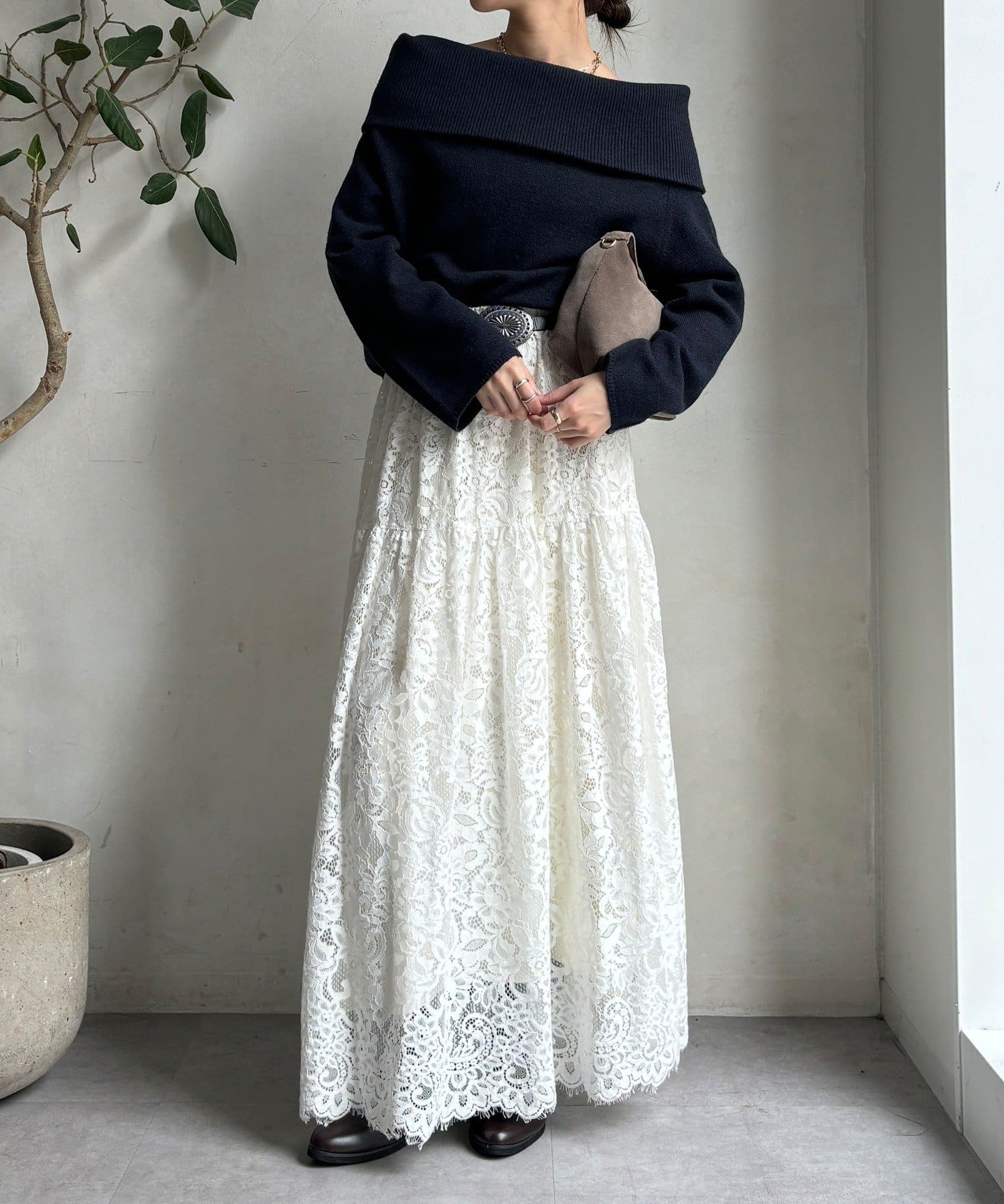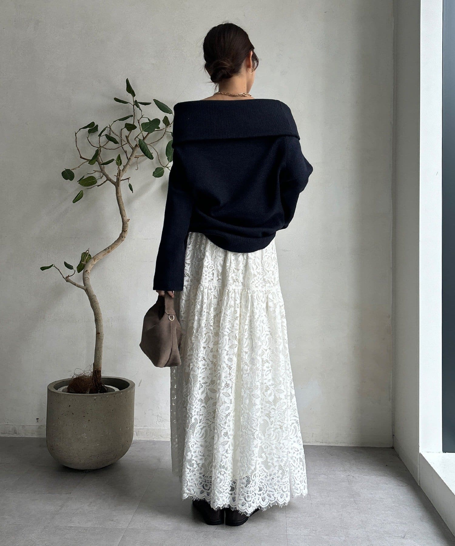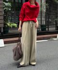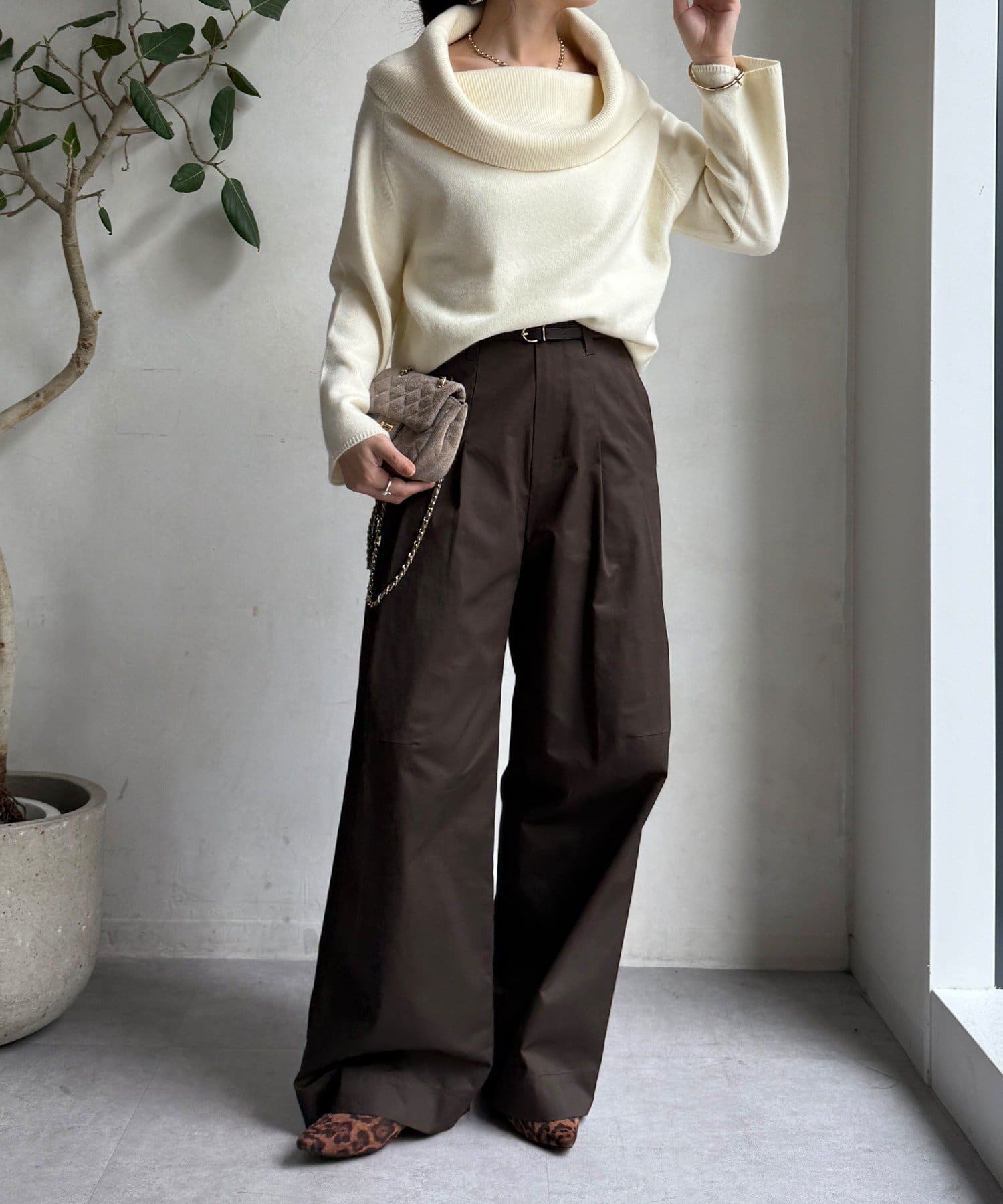 ネック部分をそのままくしゅっとラフに着ても、オフショルとしてしっかりと肩を見せて着ても、どちらでも程よくレディライクにおしゃれに着こなすことができる1着です。