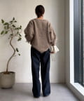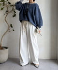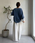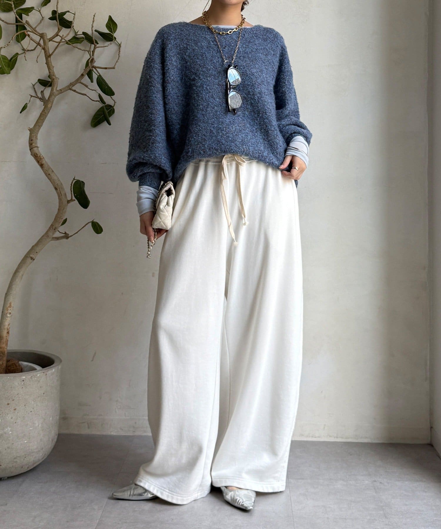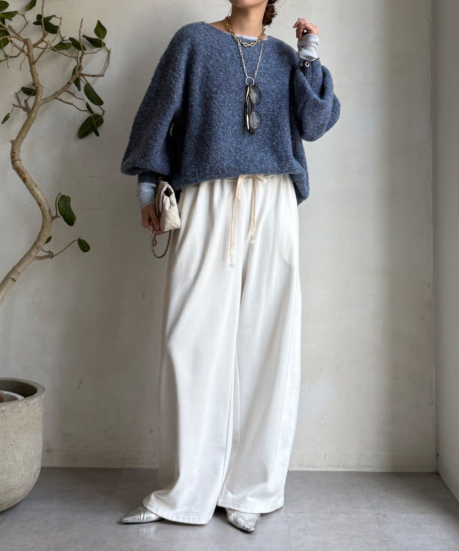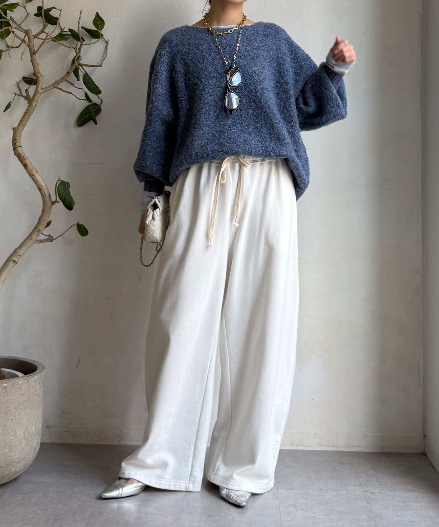 首元は、女性の鎖骨をきれいに見せてくれるボートネックライン。ゆったりとした身幅とドロップショルダーが、程よい抜け感を演出し、リラックスした着心地を実現します。