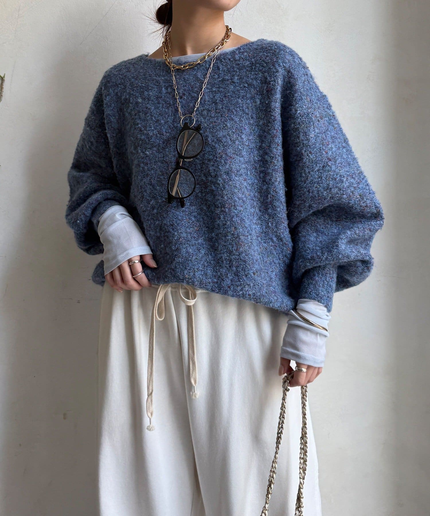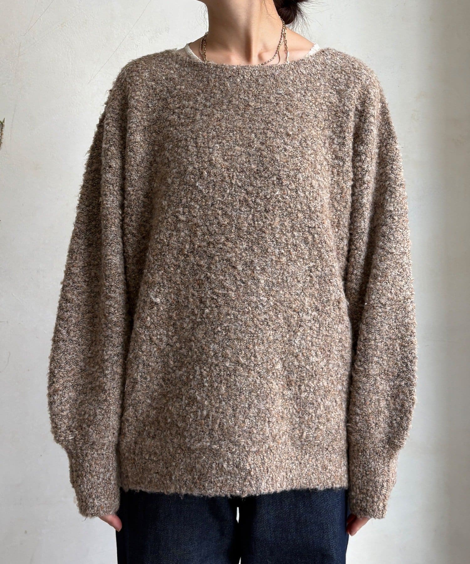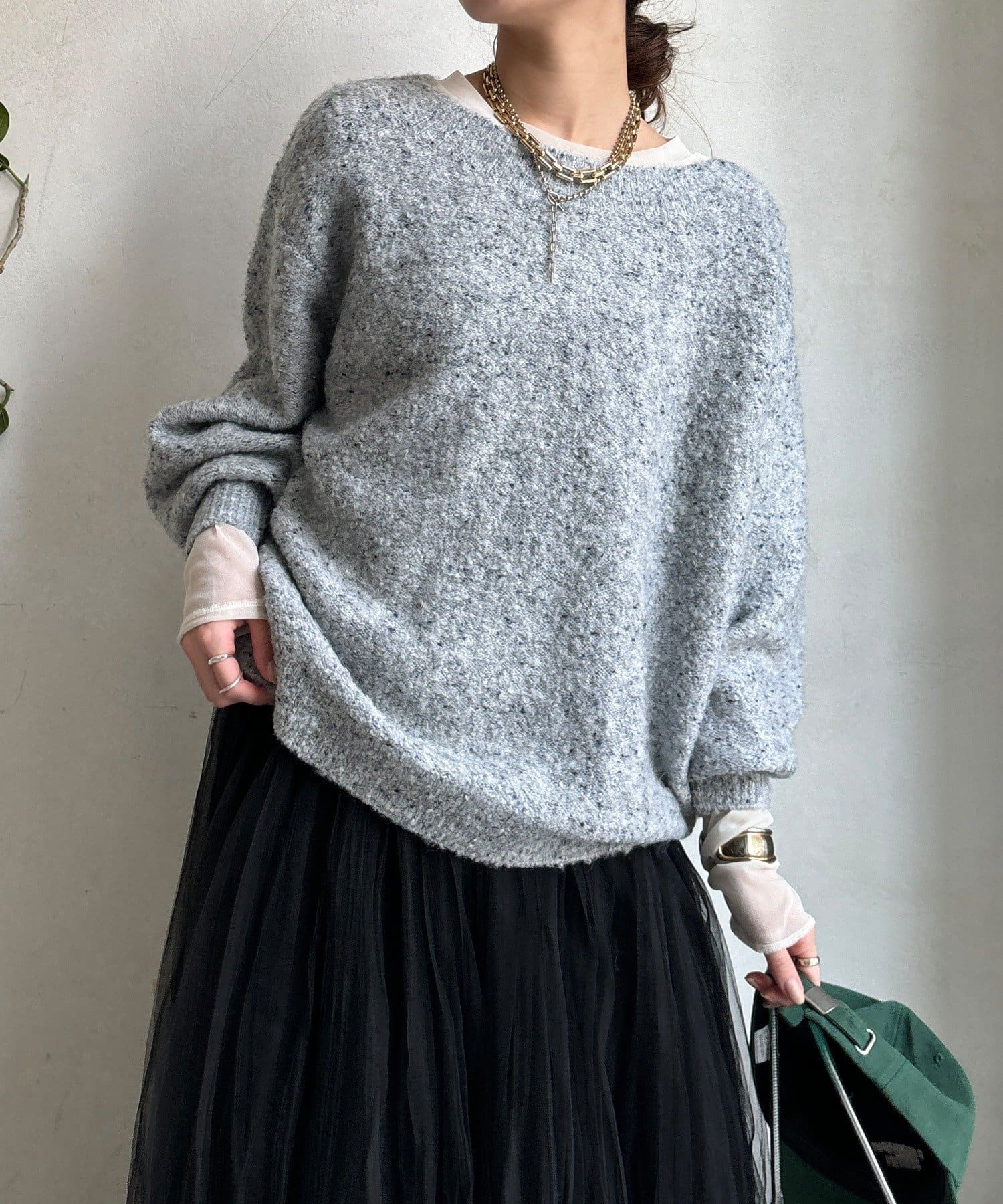 複数の色糸をミックスした表情豊かな糸で編み上げられた、ウォーミーなニットプルオーバー。