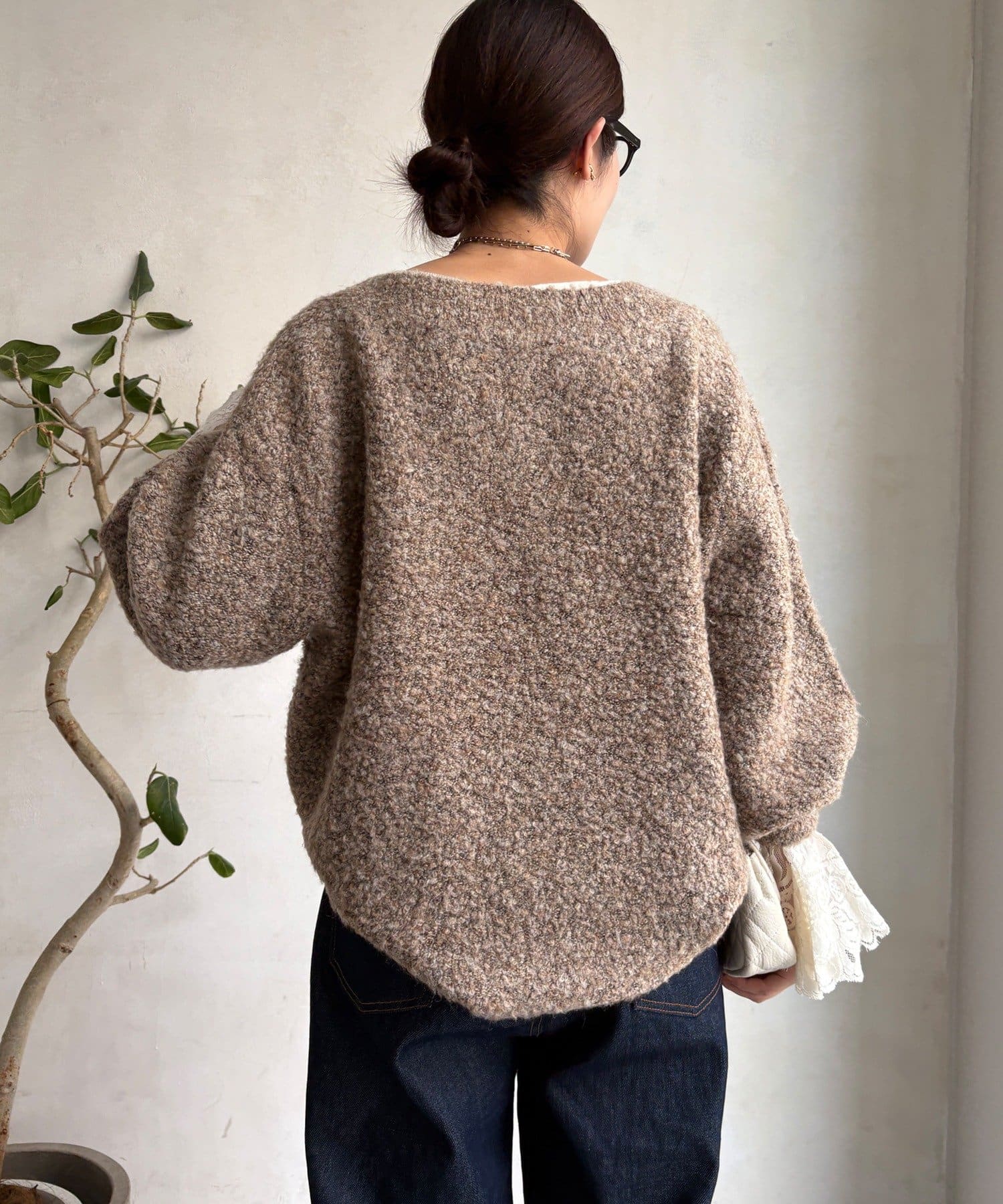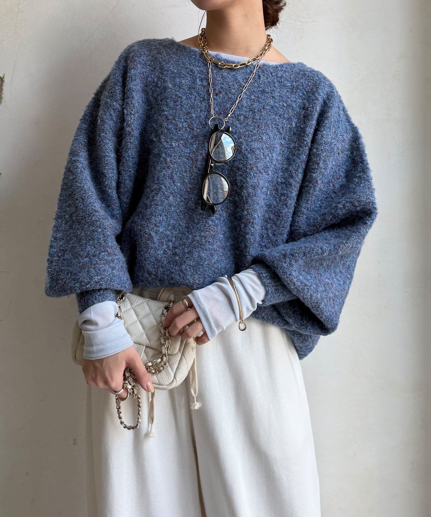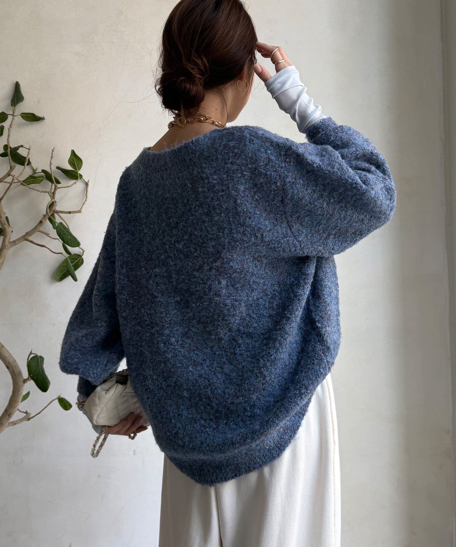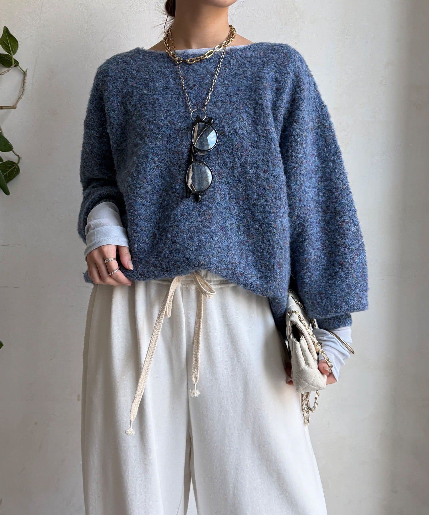 複数の色糸をミックスした表情豊かな糸で編み上げられた、ウォーミーなニットプルオーバー。