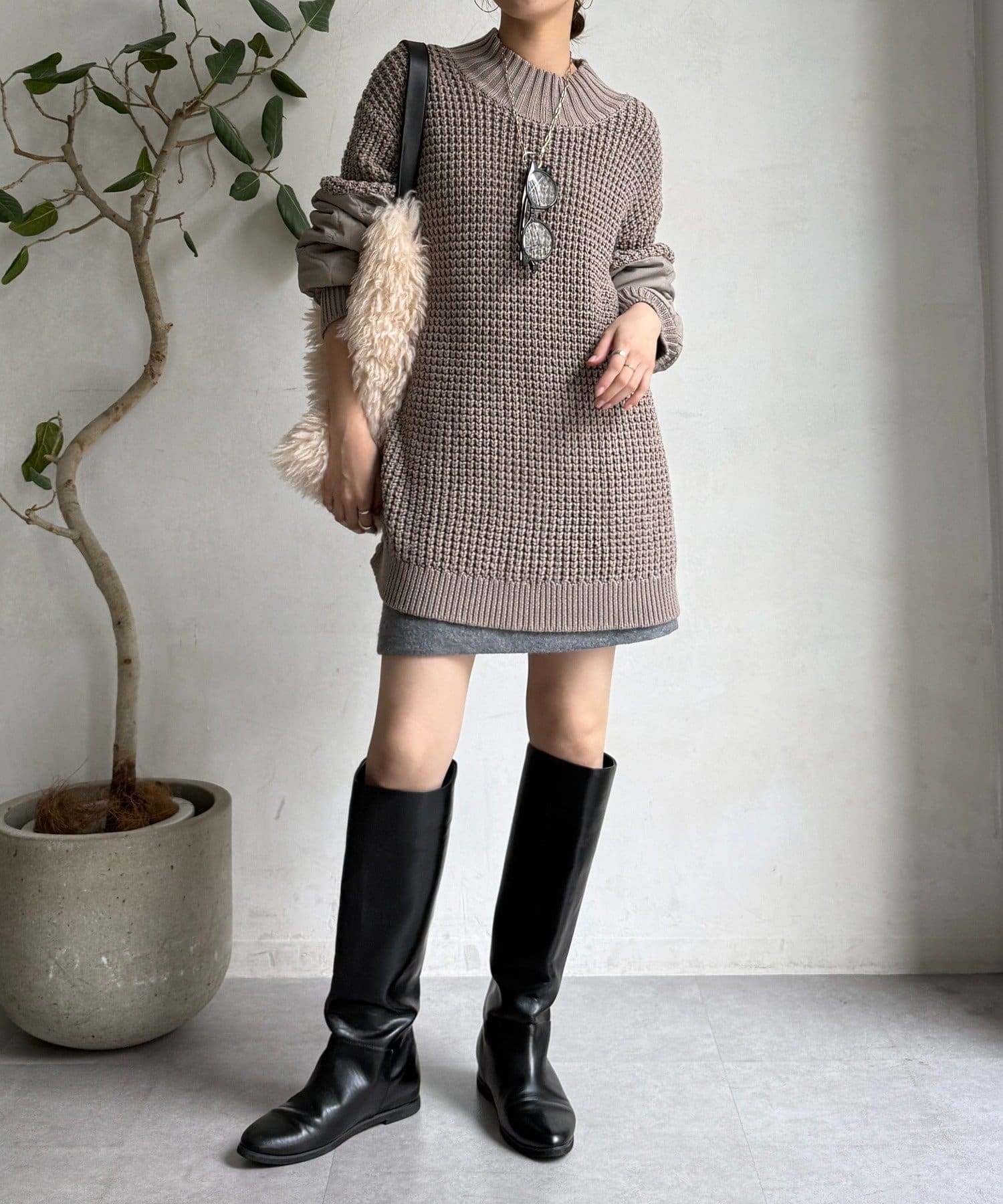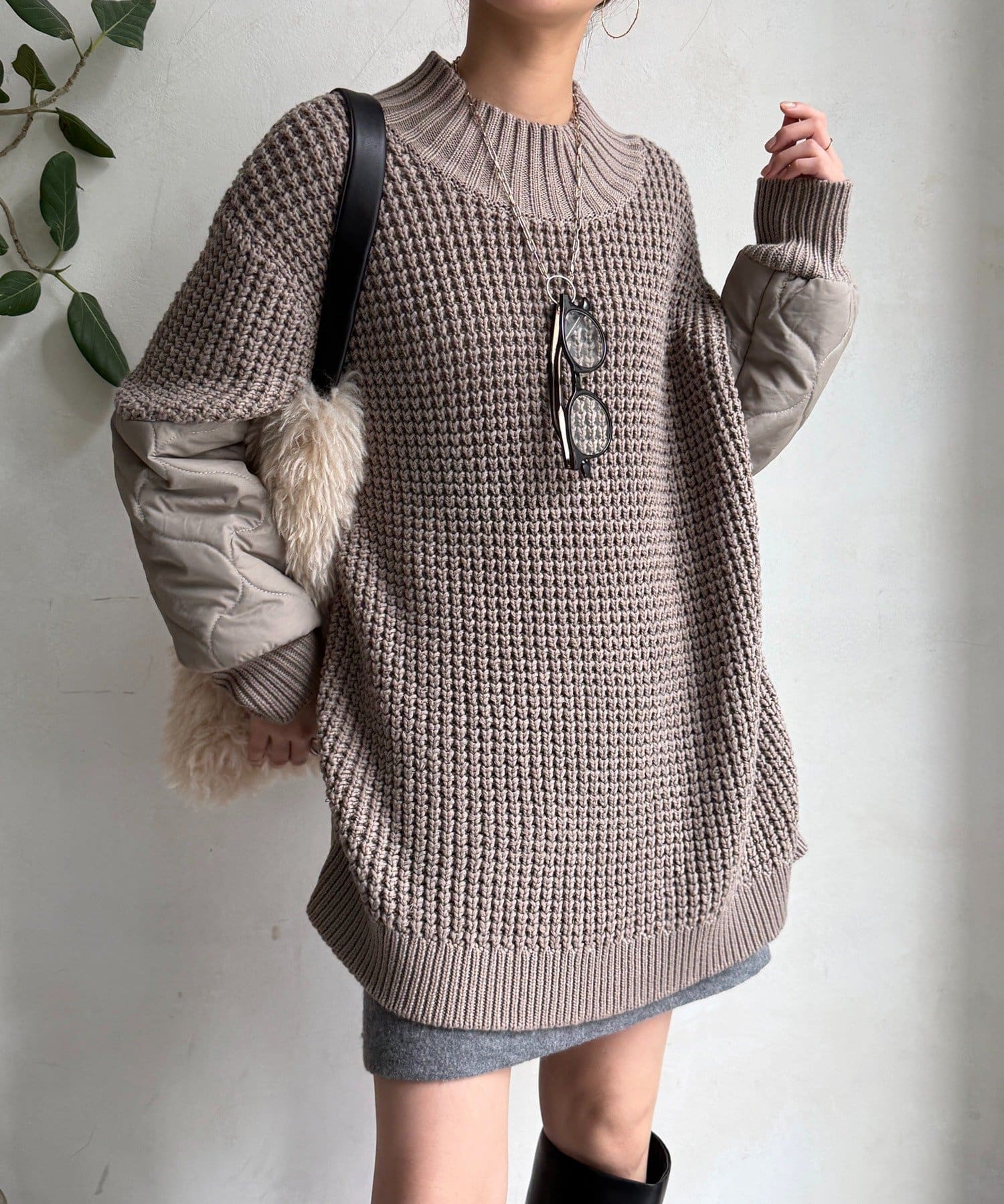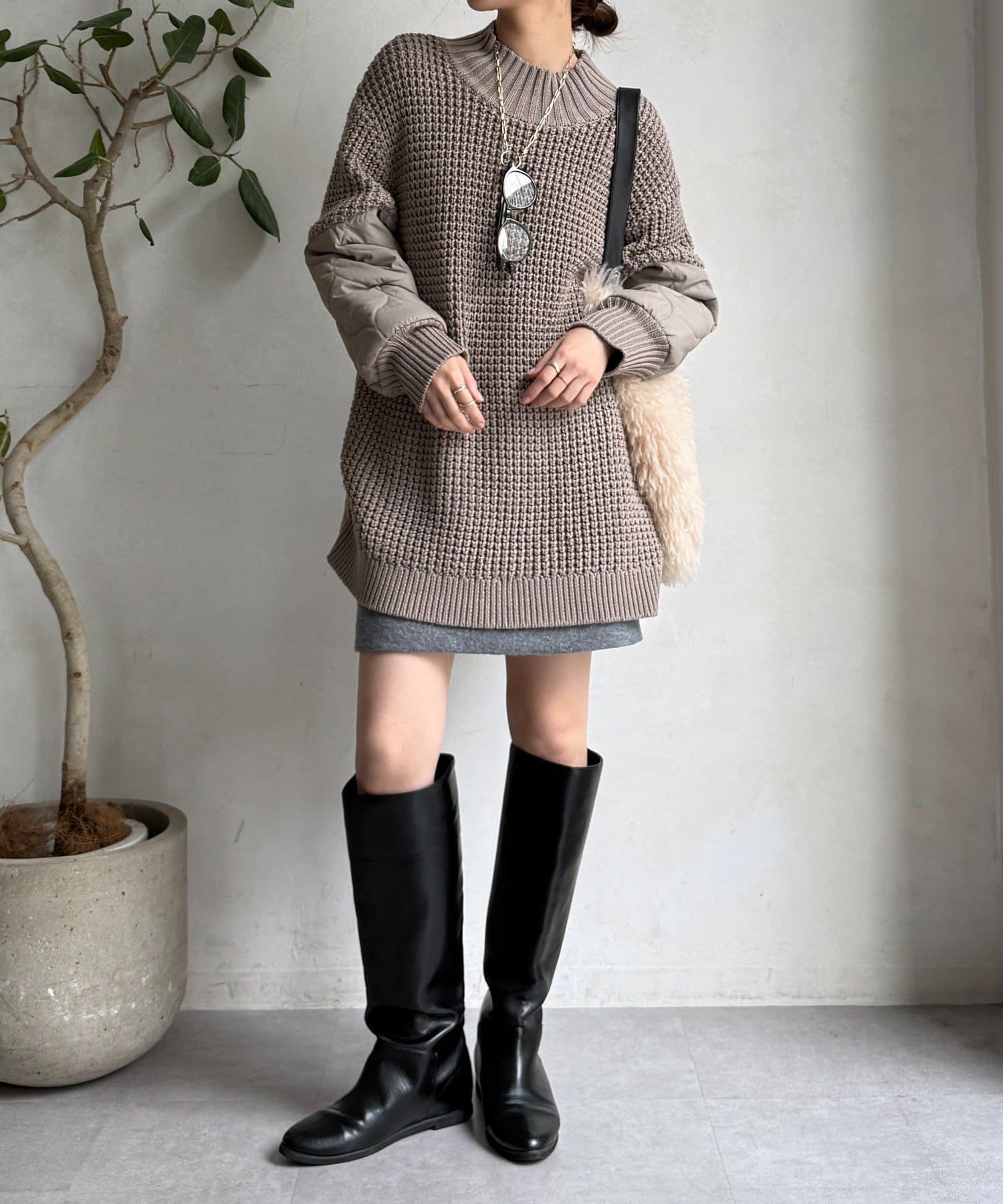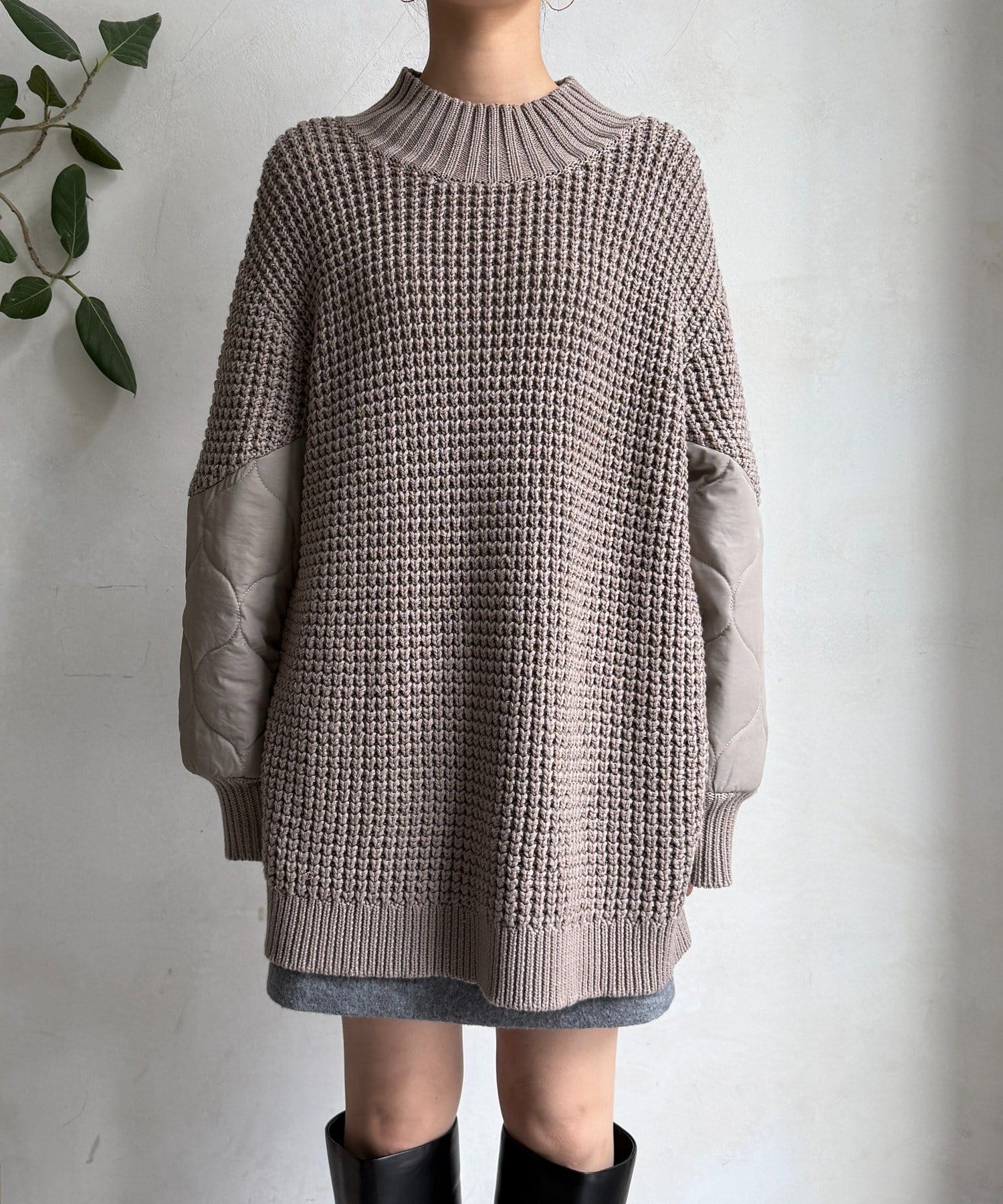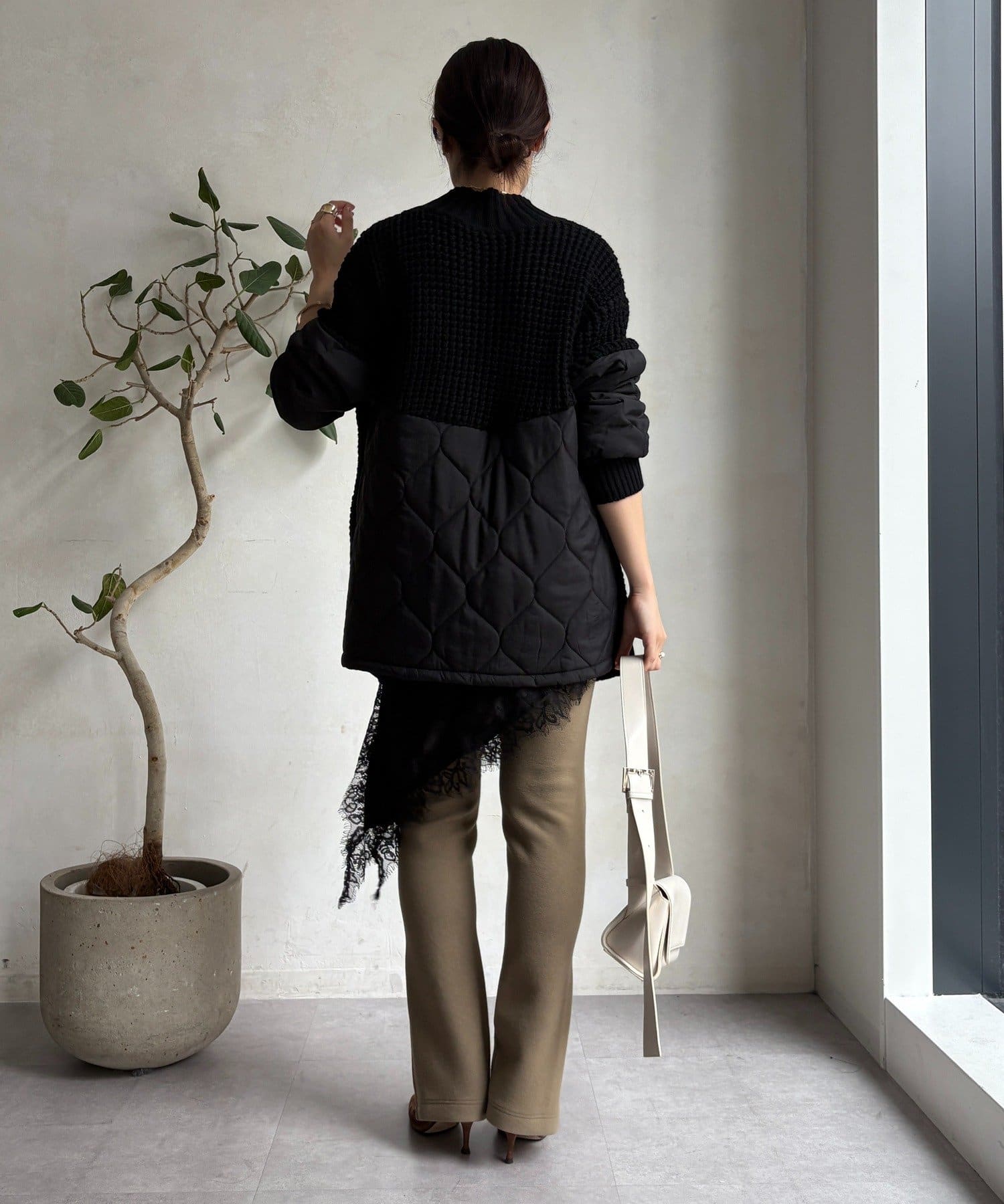 ふっくらとした暖かみのあるニットと、トレンド感溢れるキルティング素材を組み合わせた、他にないデザインが魅力的。