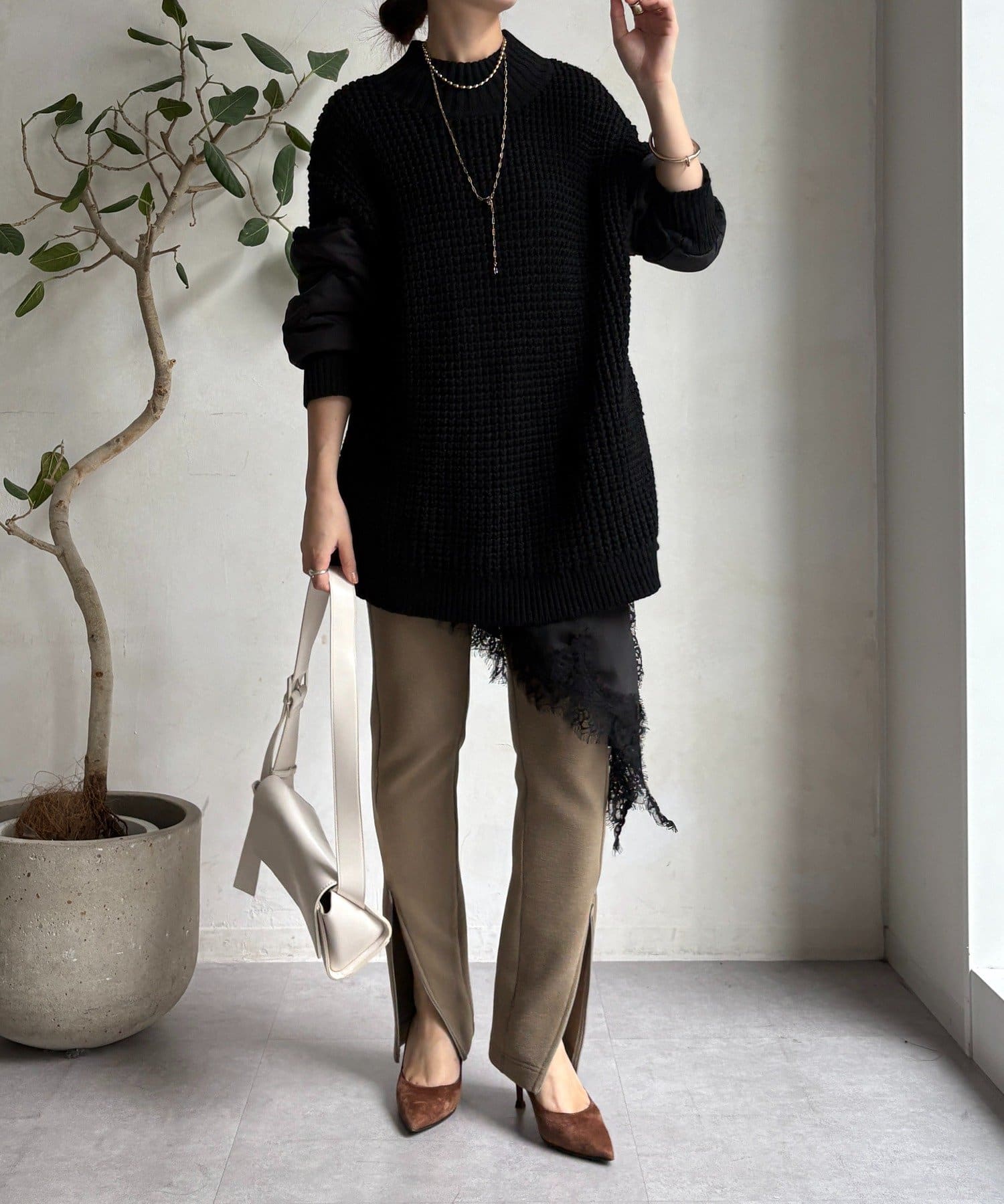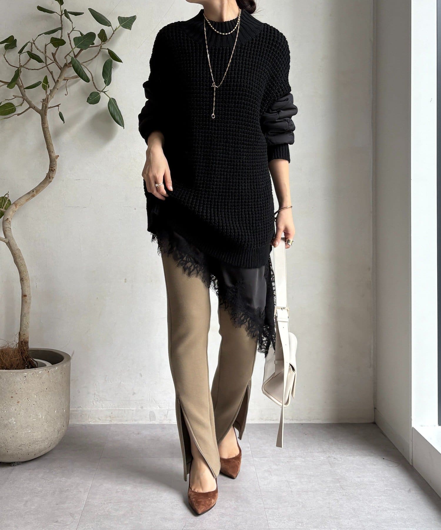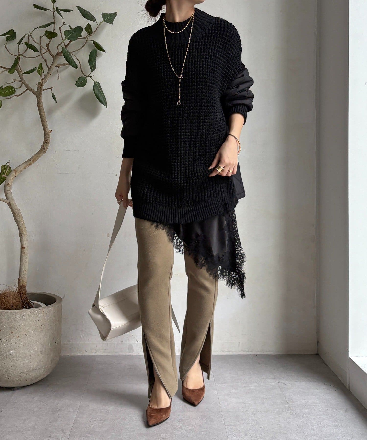 いつものカジュアルスタイルを格上げする、キルティング切替ニット。