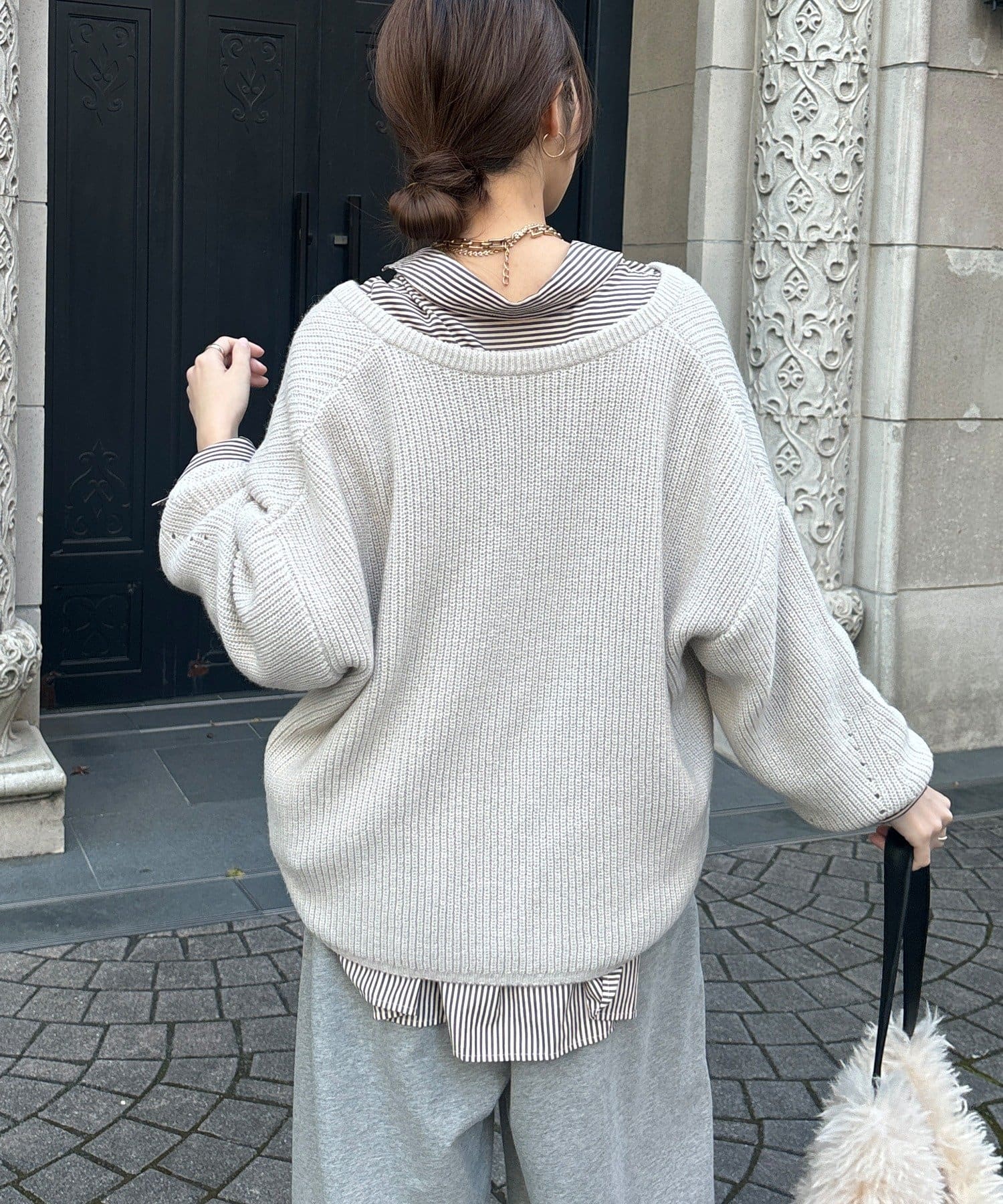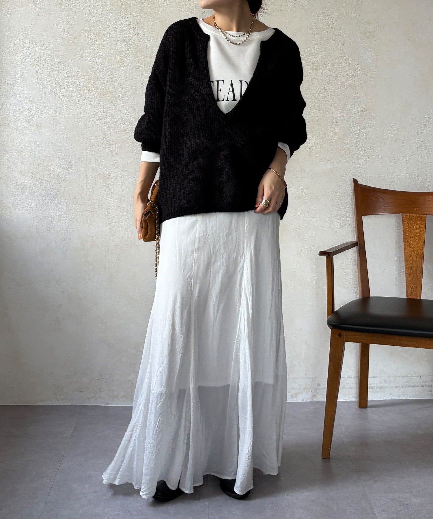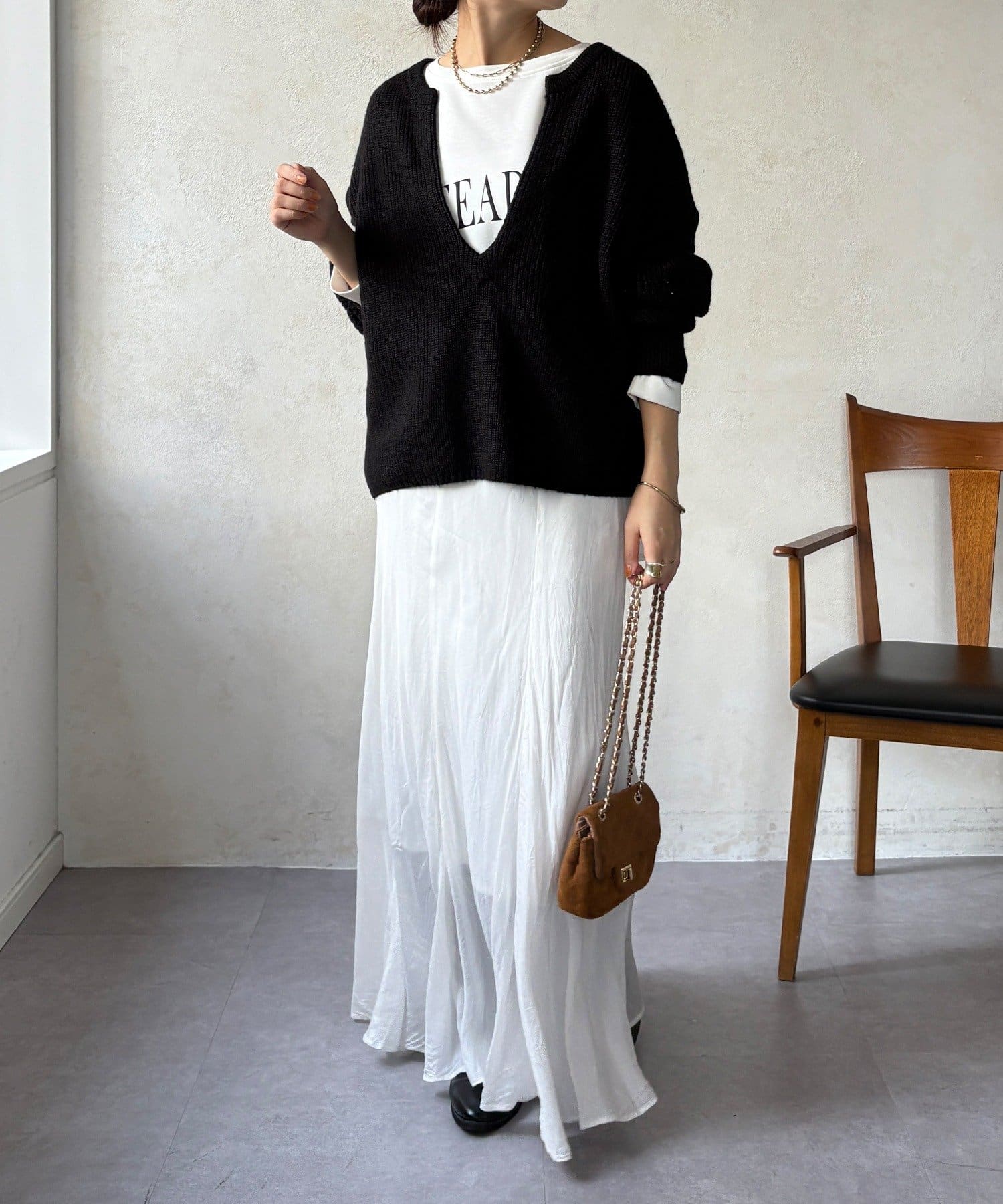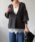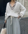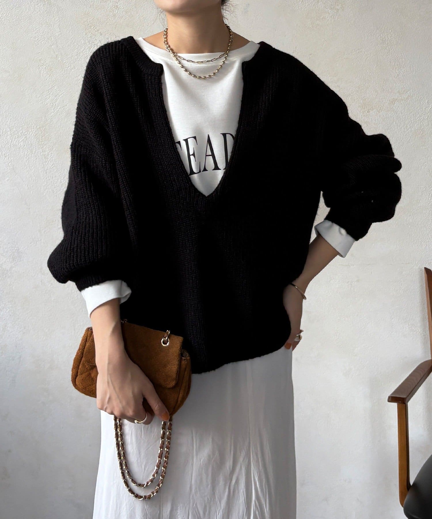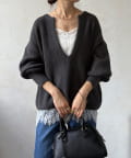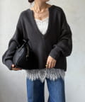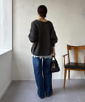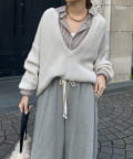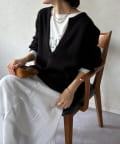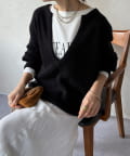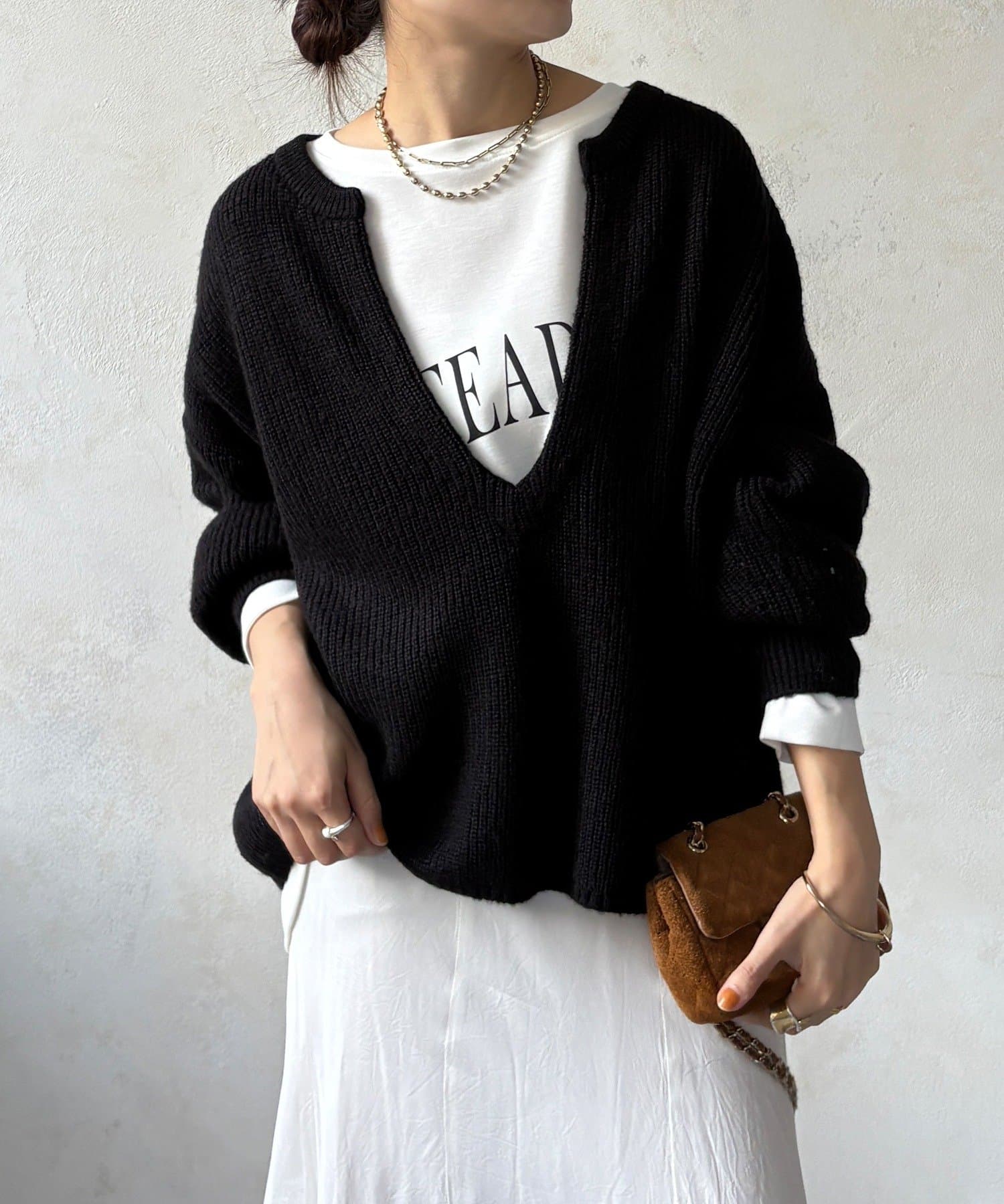 最大の特徴は、深く切り込んだスキッパーのようなVネックライン。インナーを見せるレイヤードスタイルを存分に楽しめるデザインです。ゆったりとしたオーバーサイズシルエットとドロップショルダーが、肩の力を抜いた大人の抜け感を演出します。
