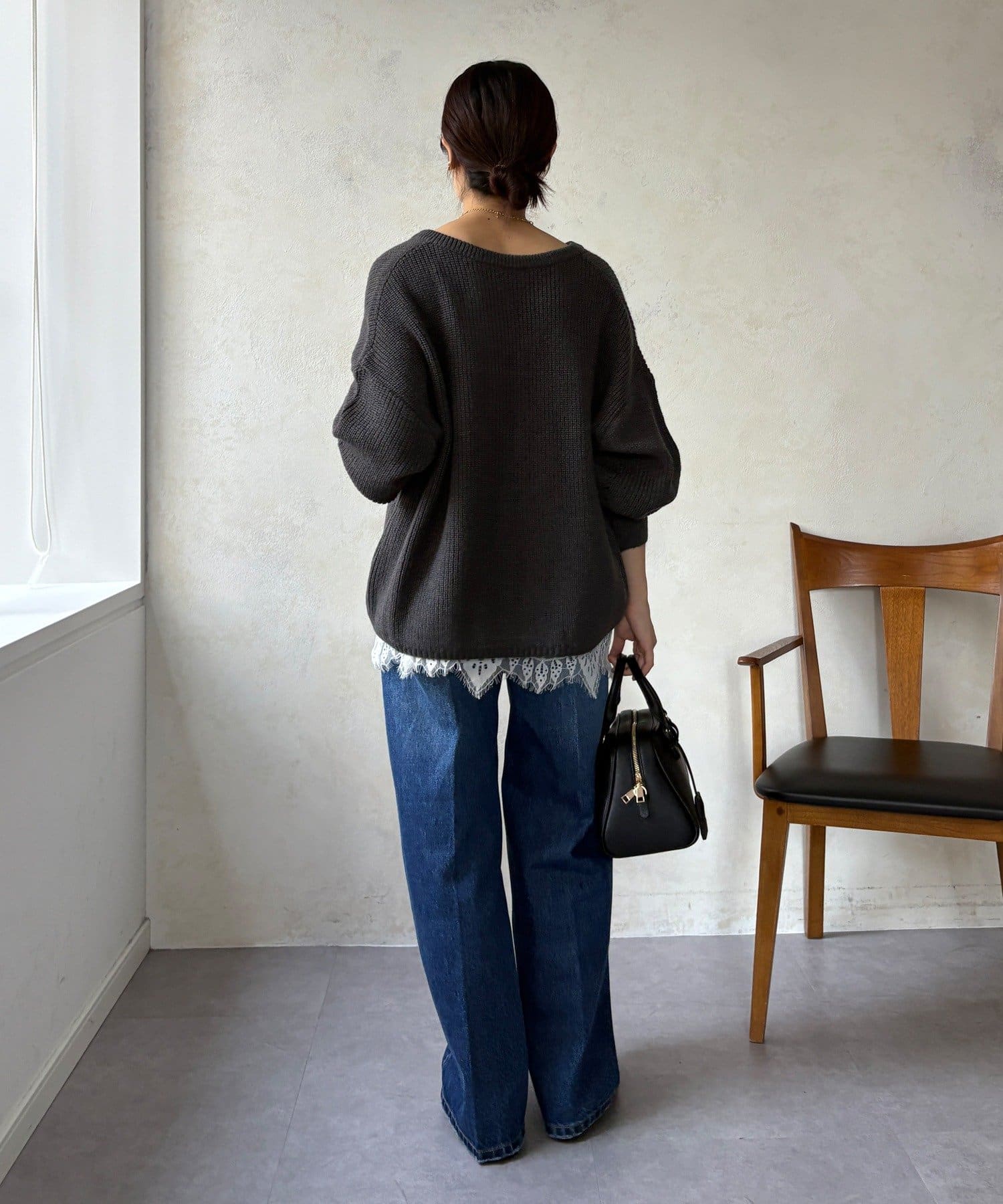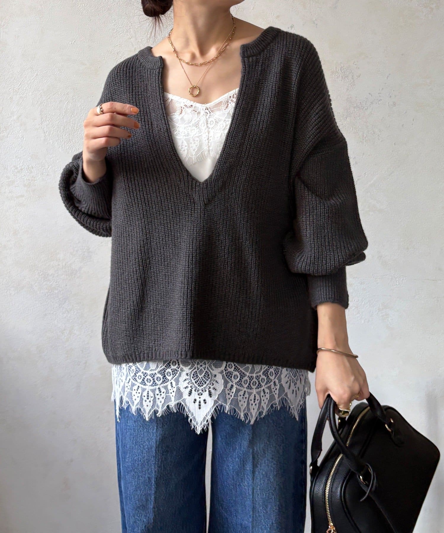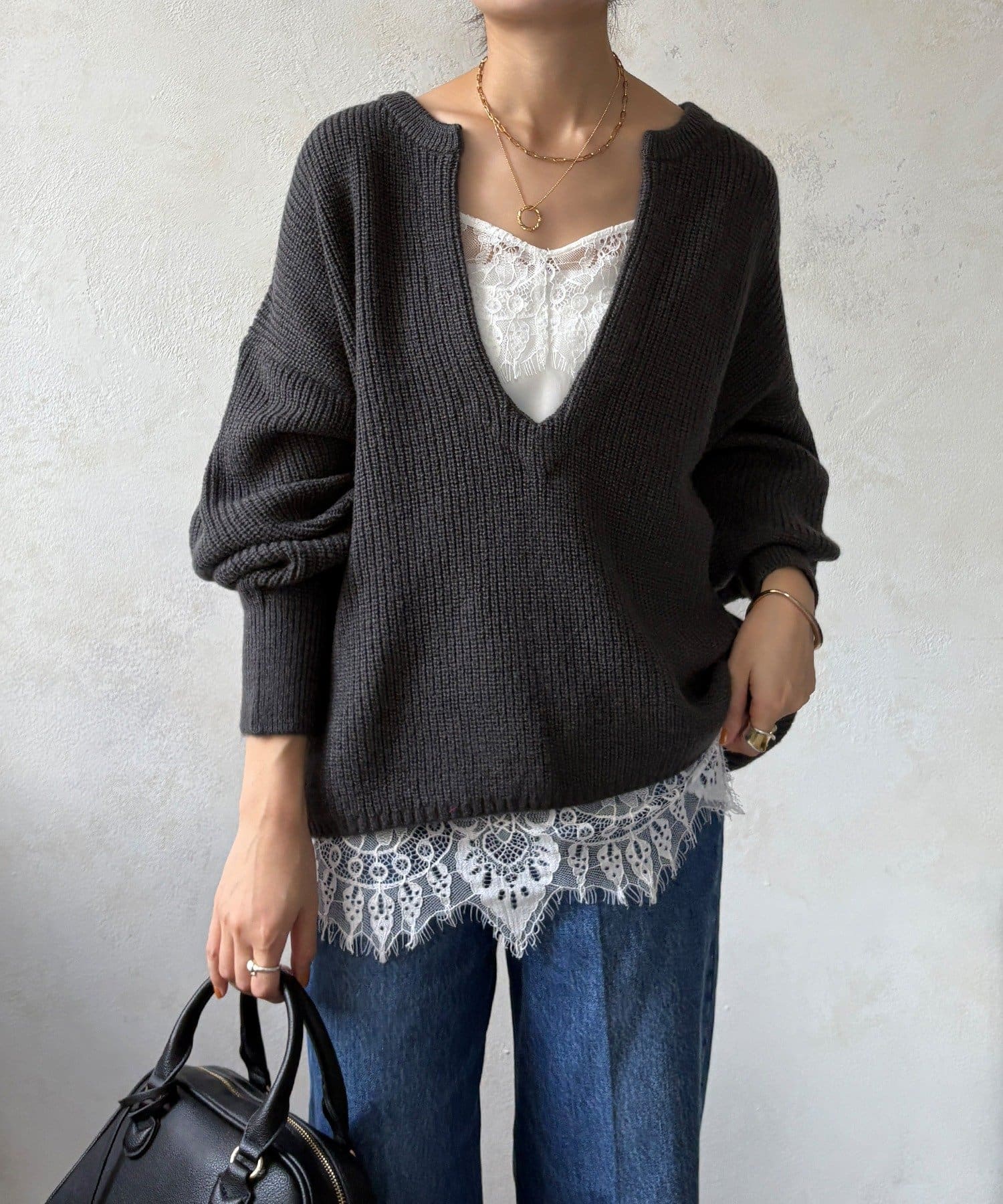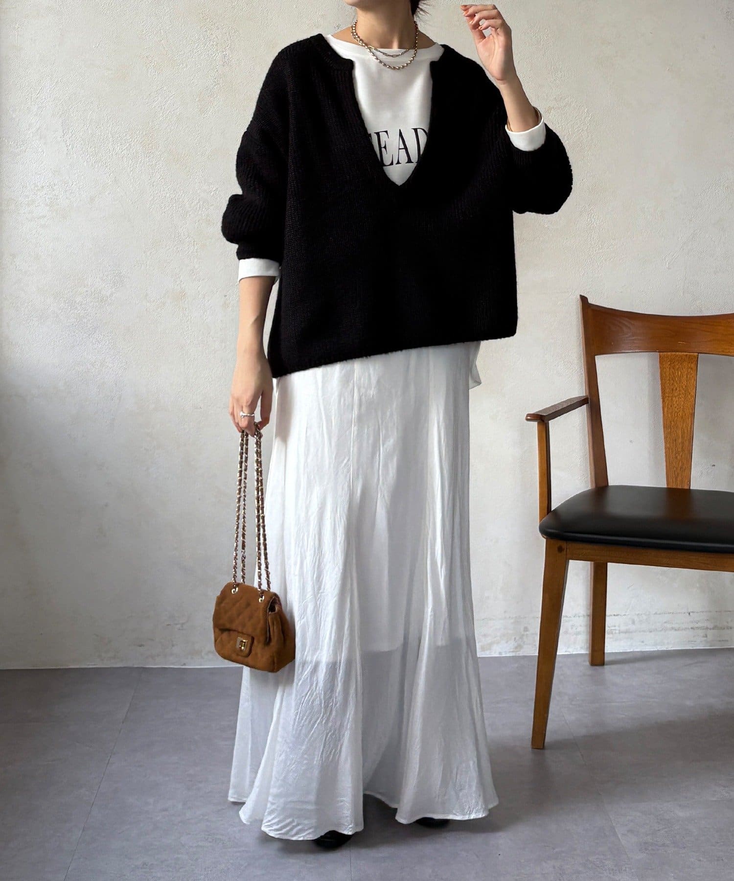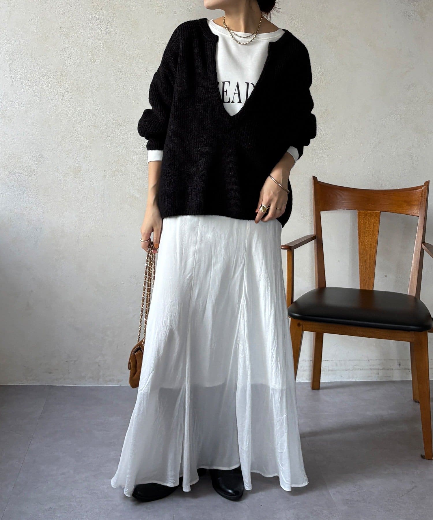 最大の特徴は、深く切り込んだスキッパーのようなVネックライン。インナーを見せるレイヤードスタイルを存分に楽しめるデザインです。ゆったりとしたオーバーサイズシルエットとドロップショルダーが、肩の力を抜いた大人の抜け感を演出します。
