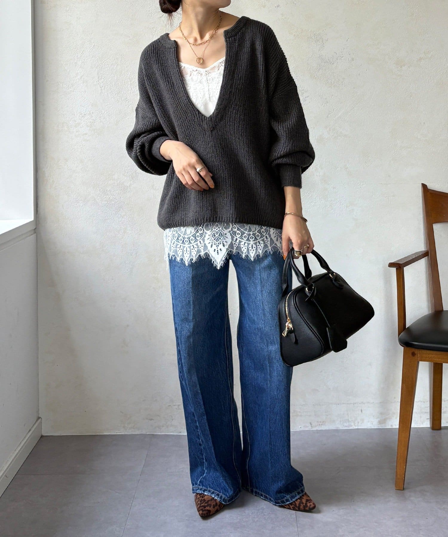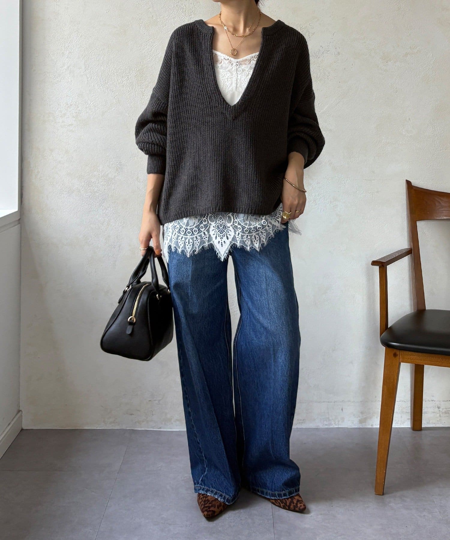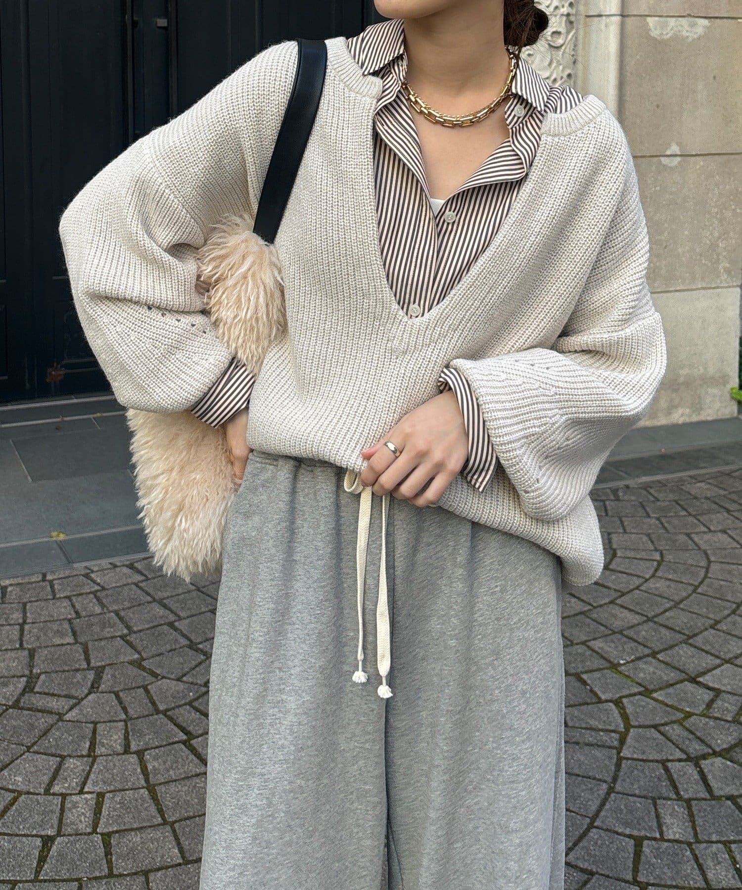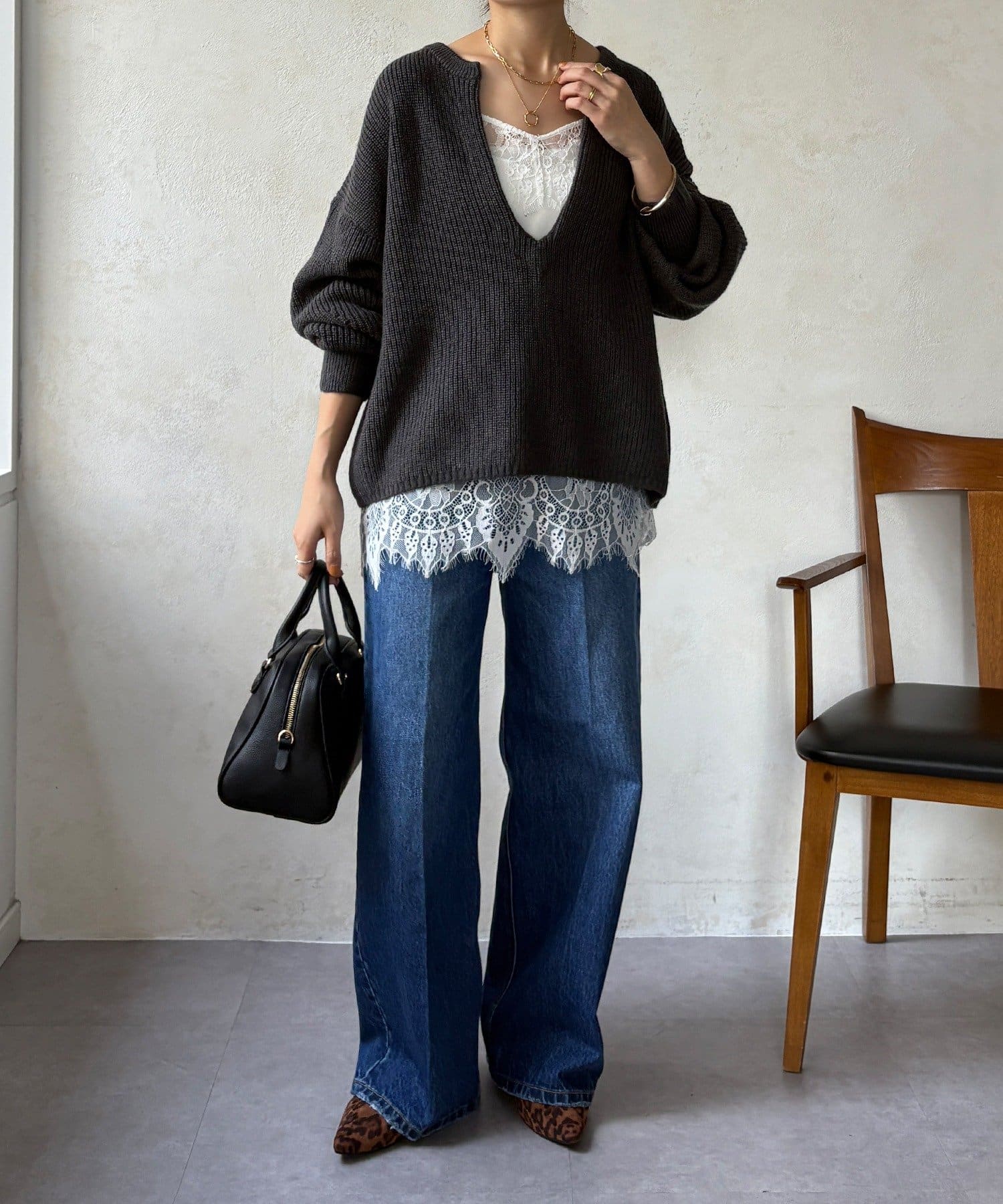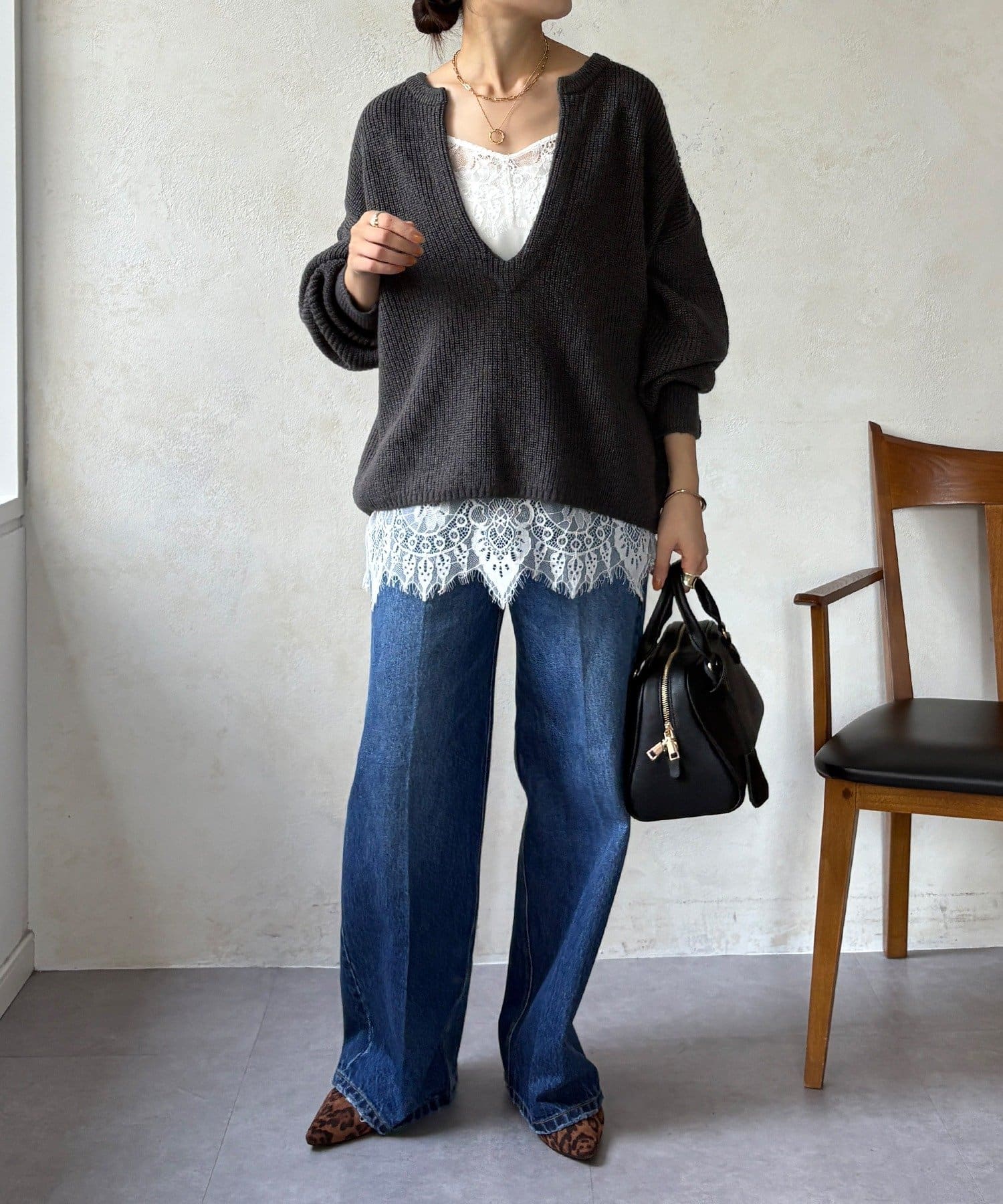 最大の特徴は、深く切り込んだスキッパーのようなVネックライン。インナーを見せるレイヤードスタイルを存分に楽しめるデザインです。ゆったりとしたオーバーサイズシルエットとドロップショルダーが、肩の力を抜いた大人の抜け感を演出します。