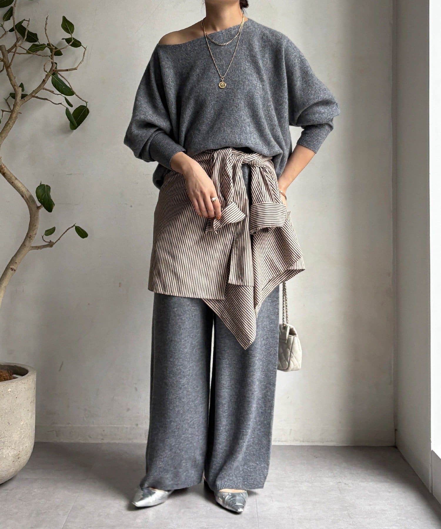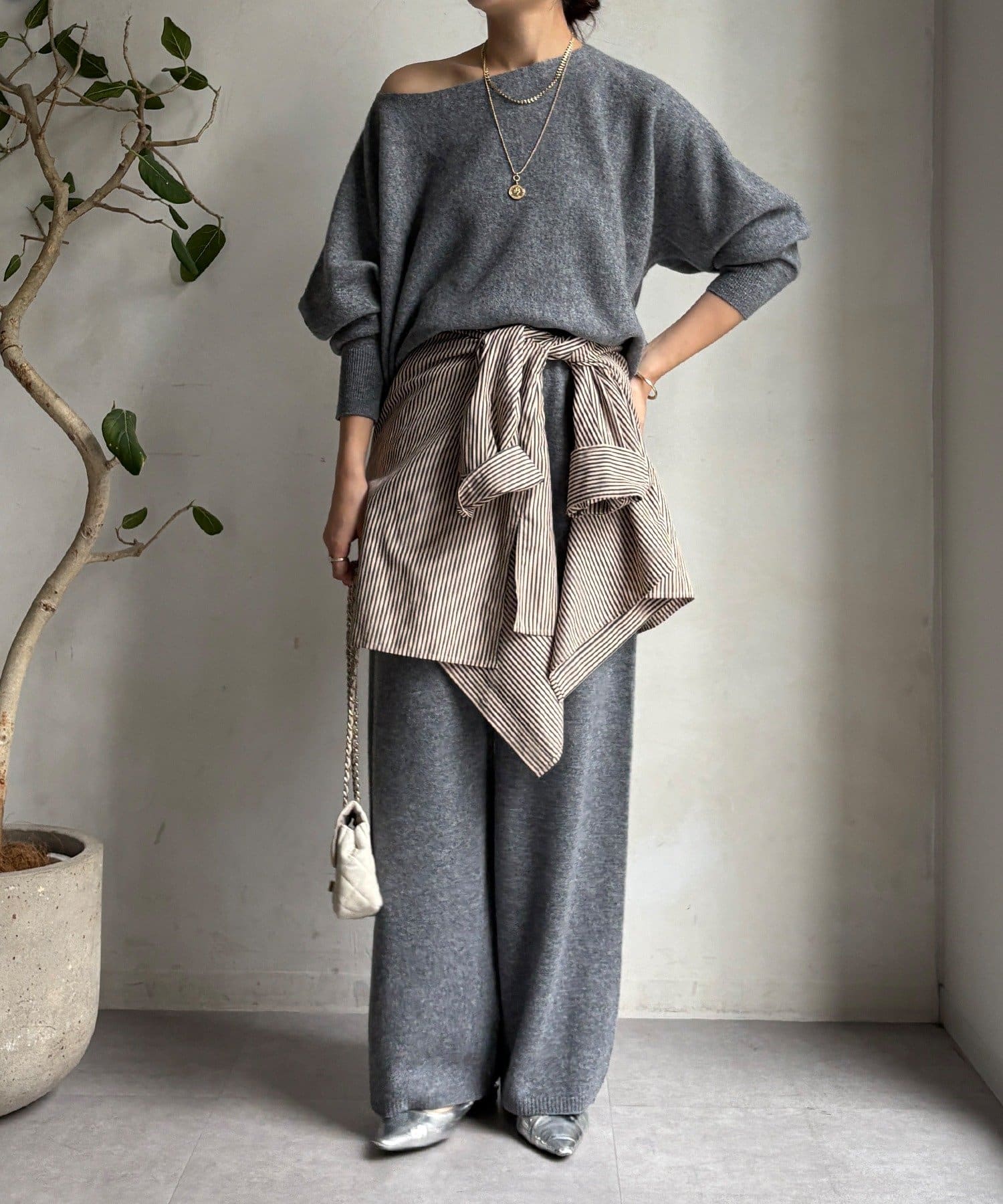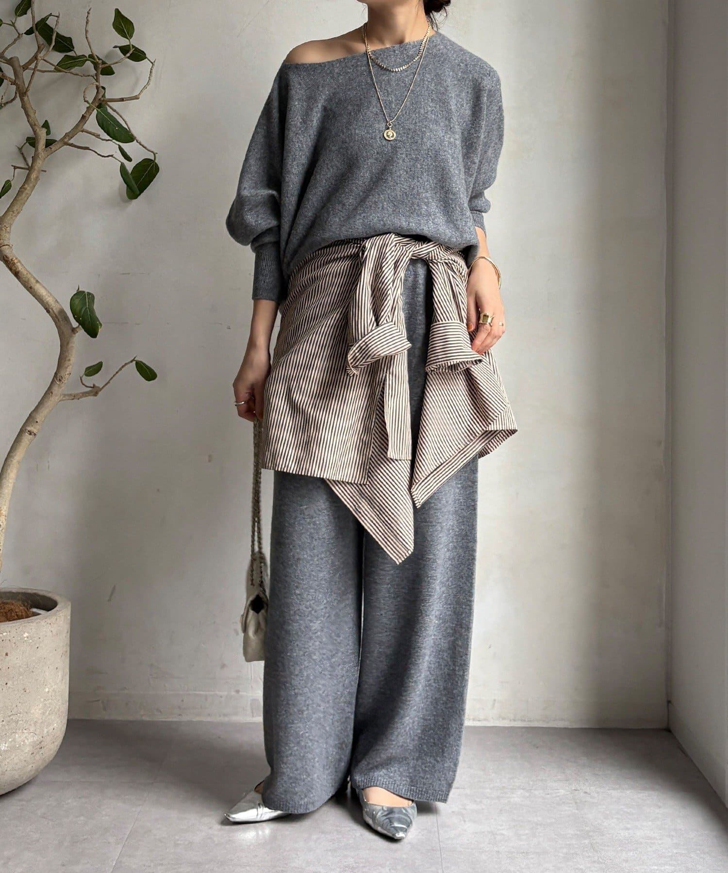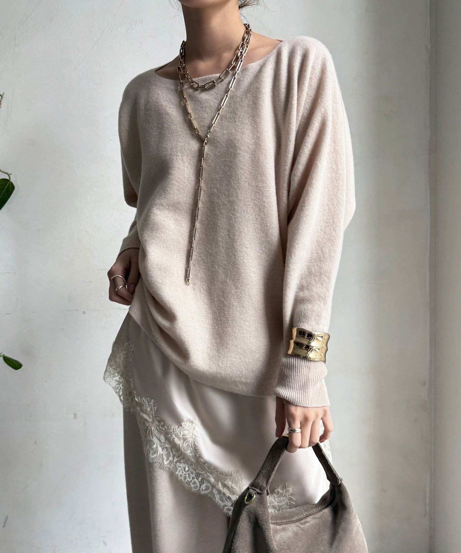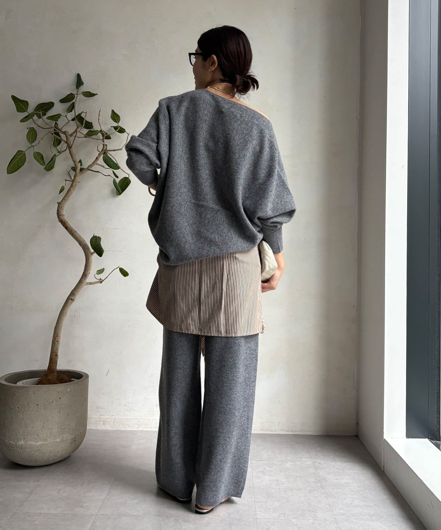 ネックラインは、デコルテと鎖骨を美しく見せるボートネック。女性らしい抜け感をプラスし、顔周りをすっきりと見せてくれます。