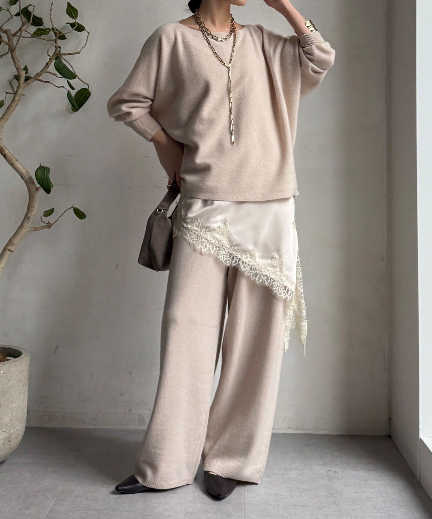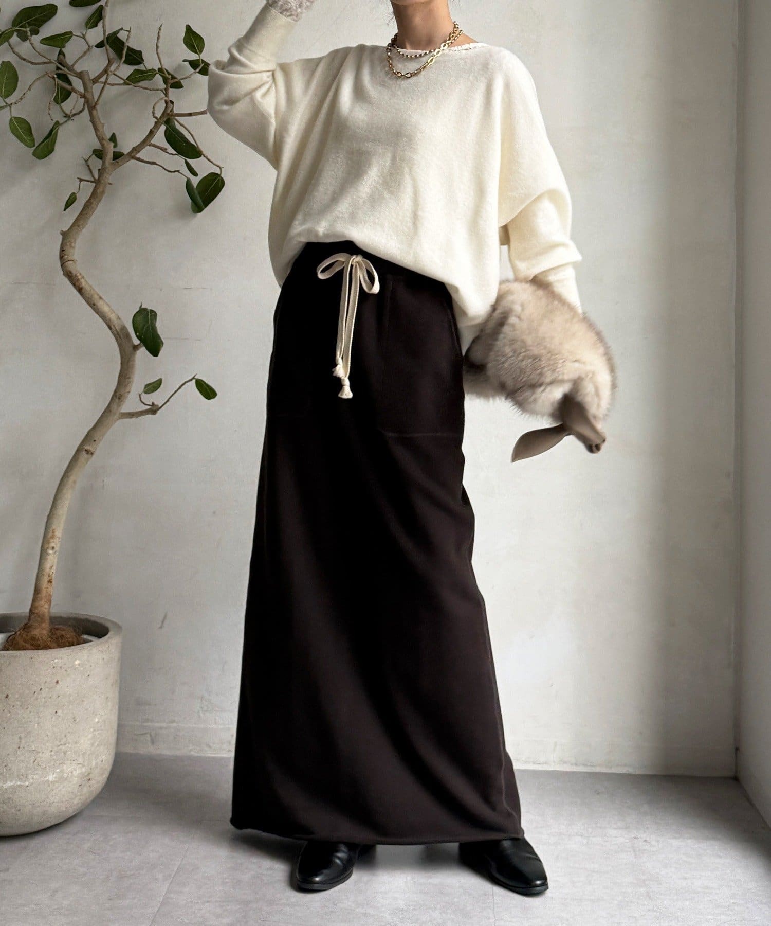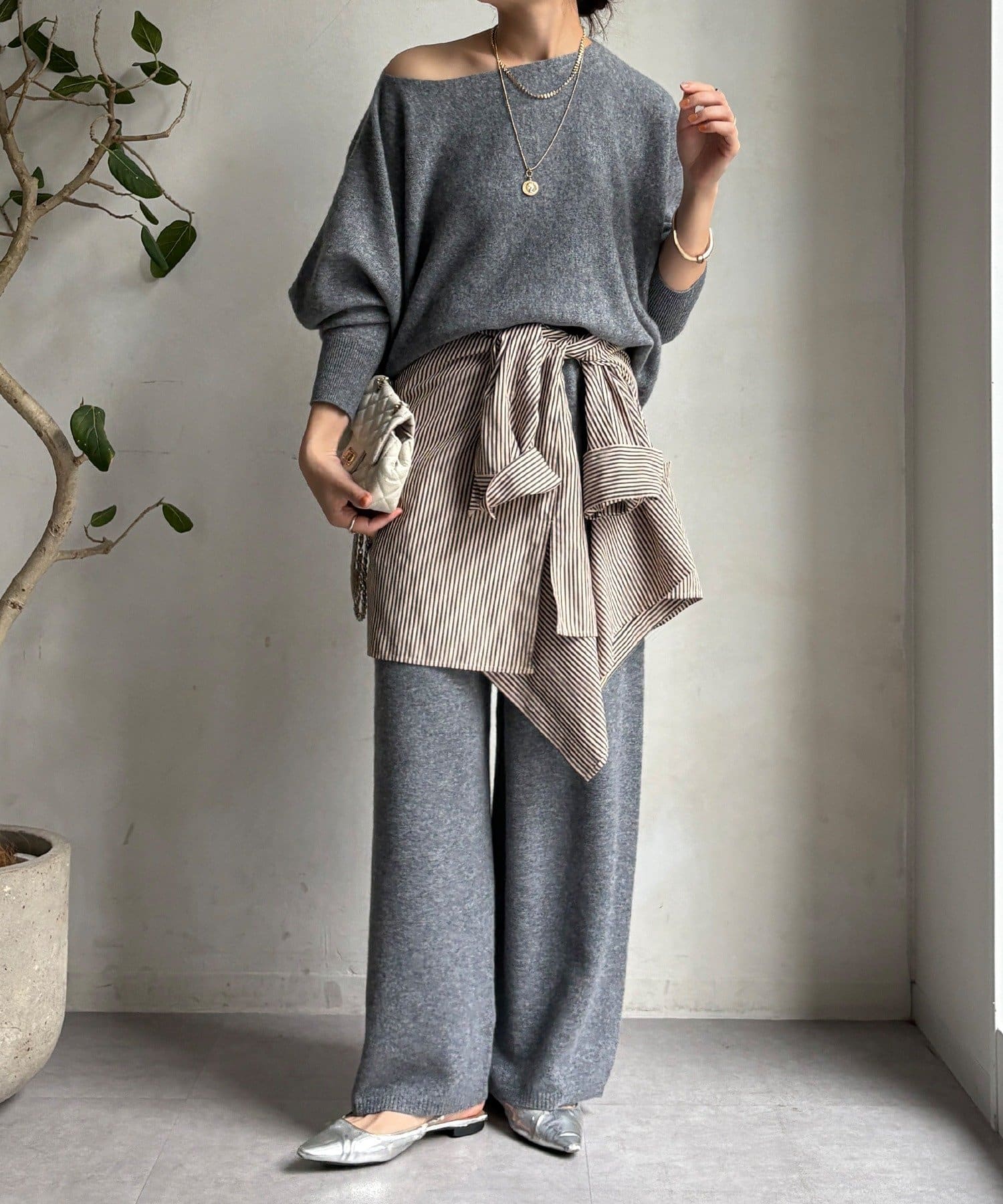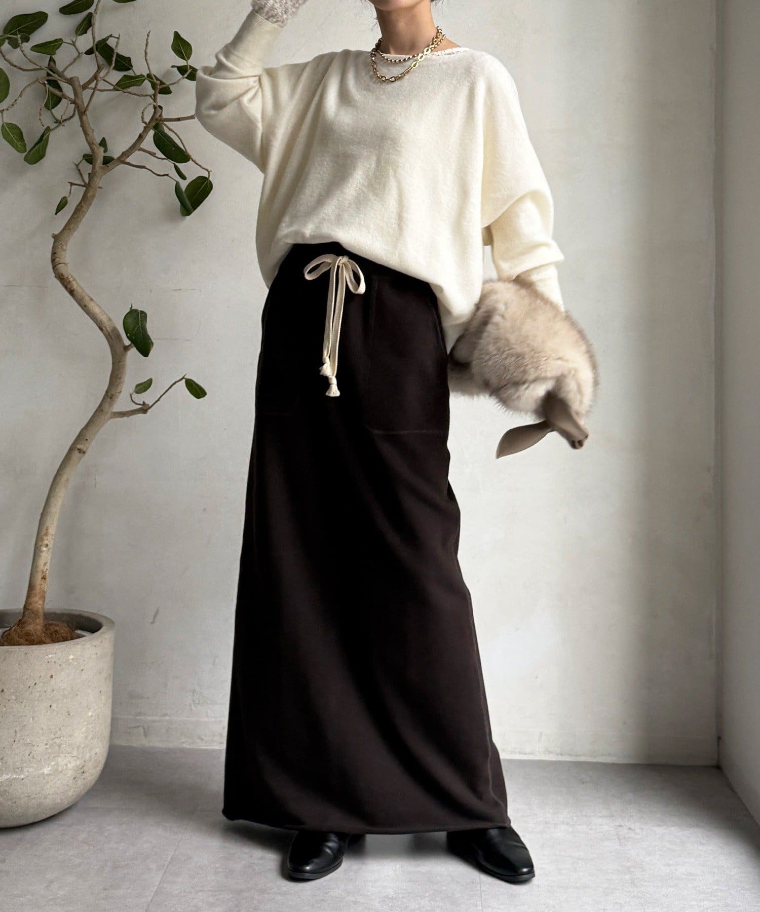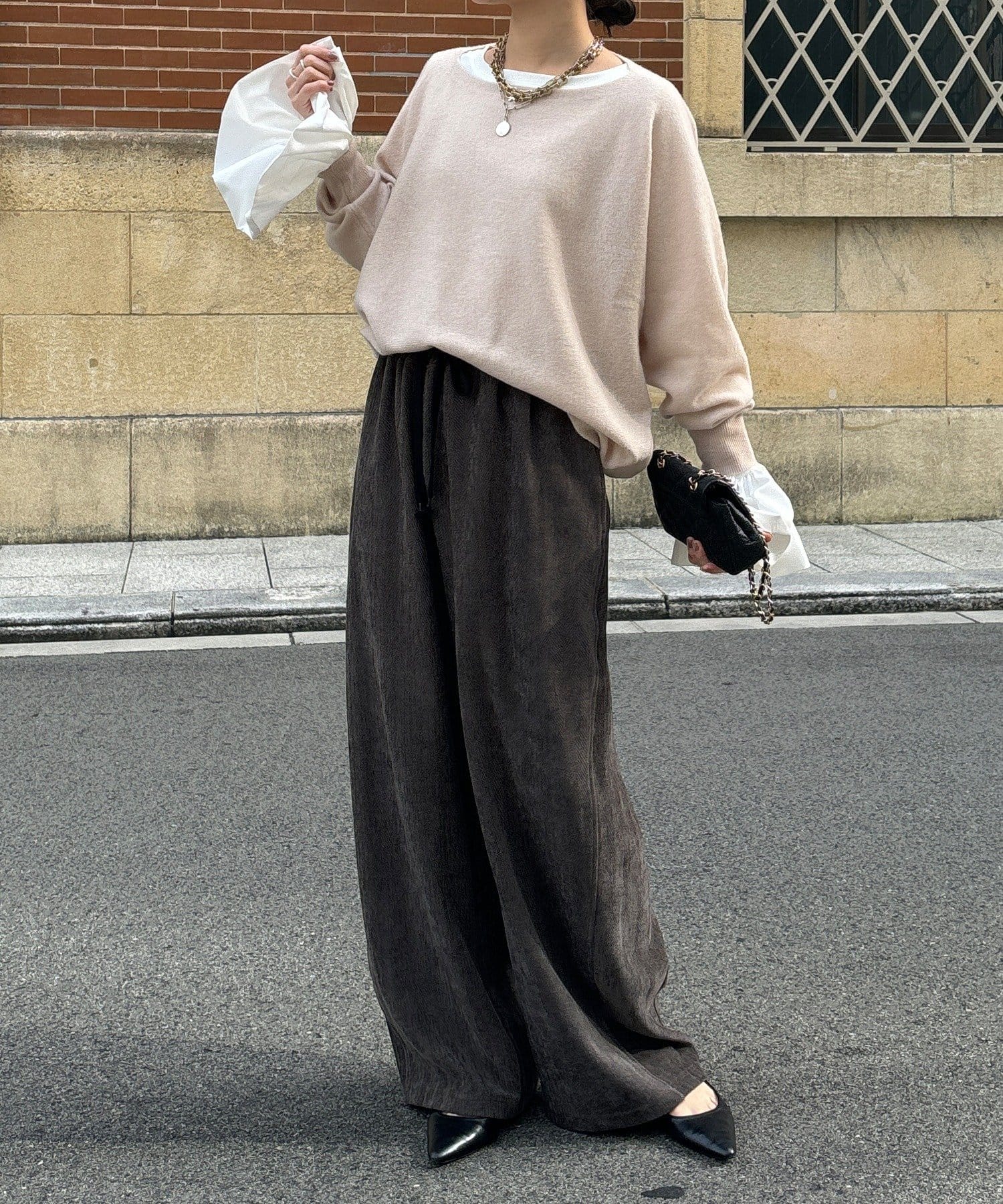 ネックラインは、デコルテと鎖骨を美しく見せるボートネック。女性らしい抜け感をプラスし、顔周りをすっきりと見せてくれます。