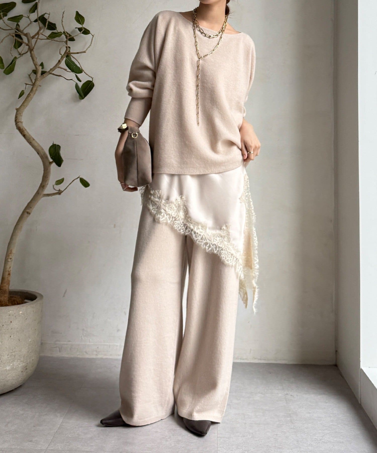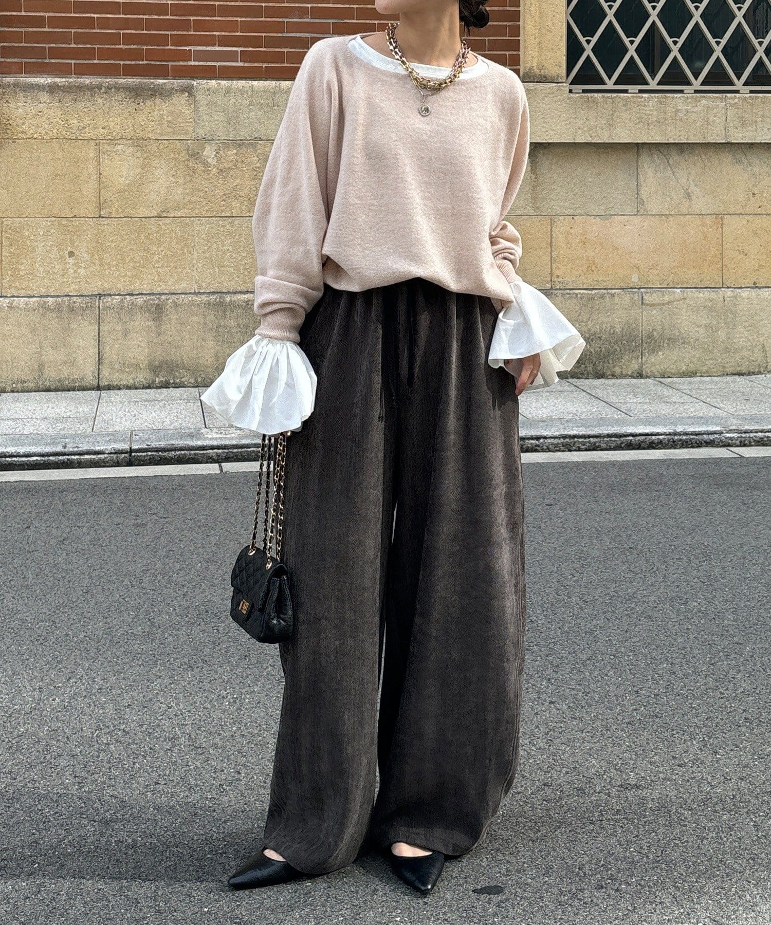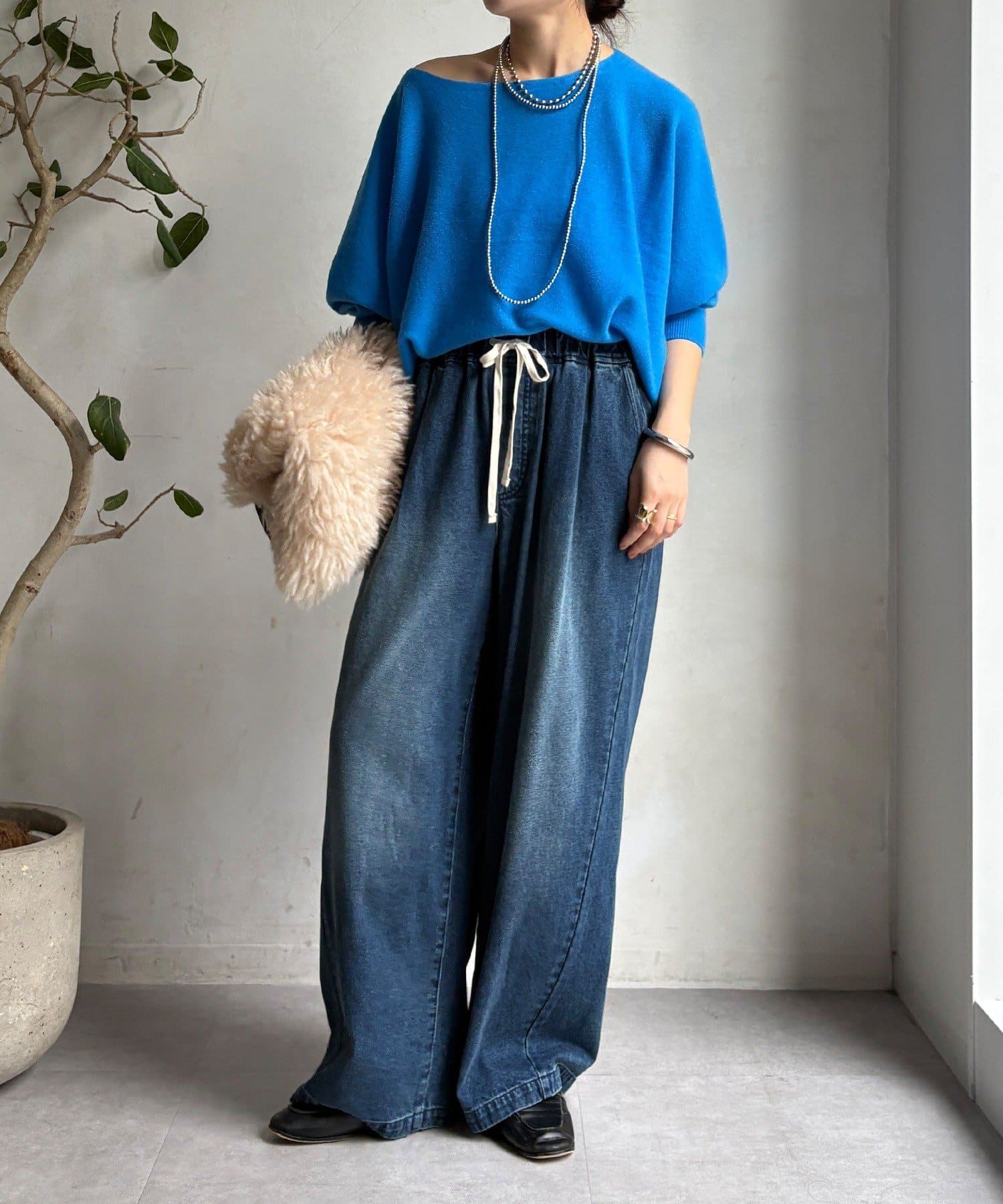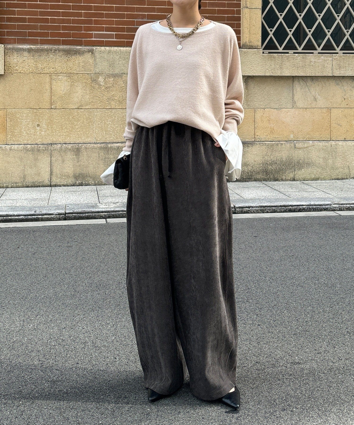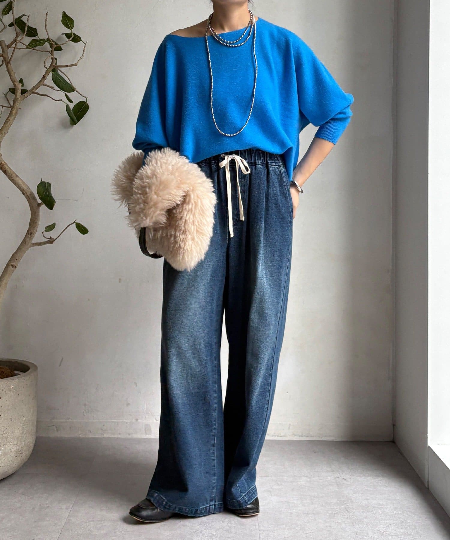 ネックラインは、デコルテと鎖骨を美しく見せるボートネック。女性らしい抜け感をプラスし、顔周りをすっきりと見せてくれます。