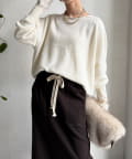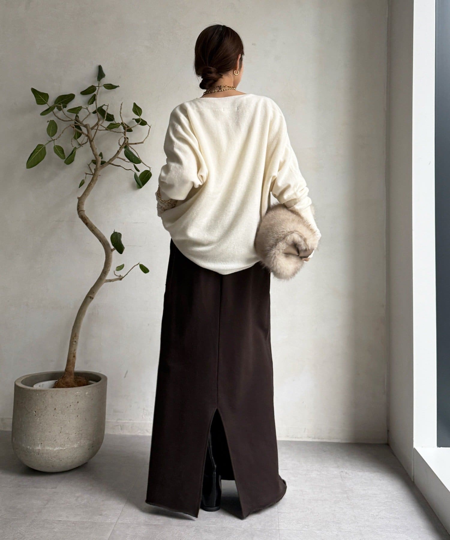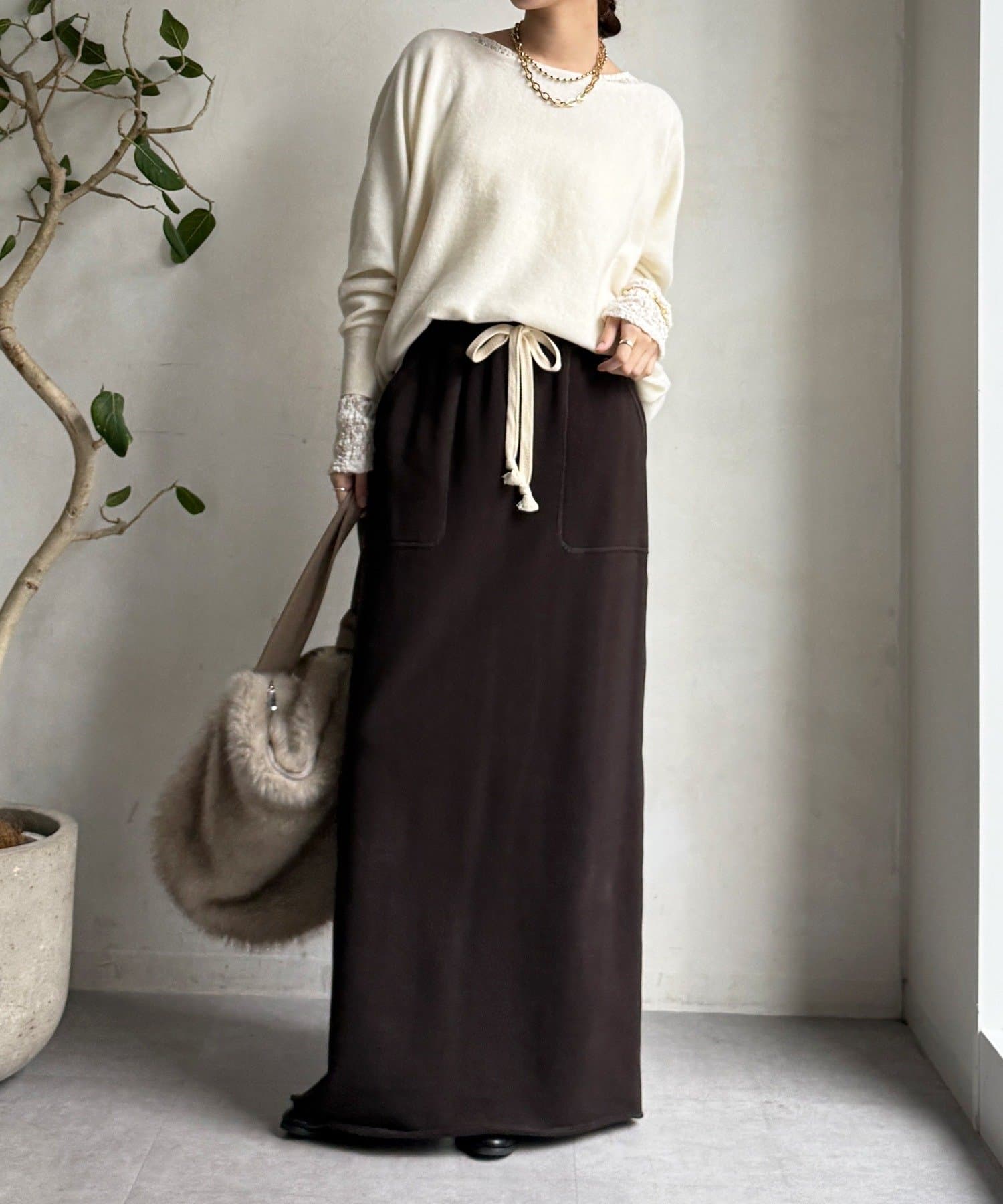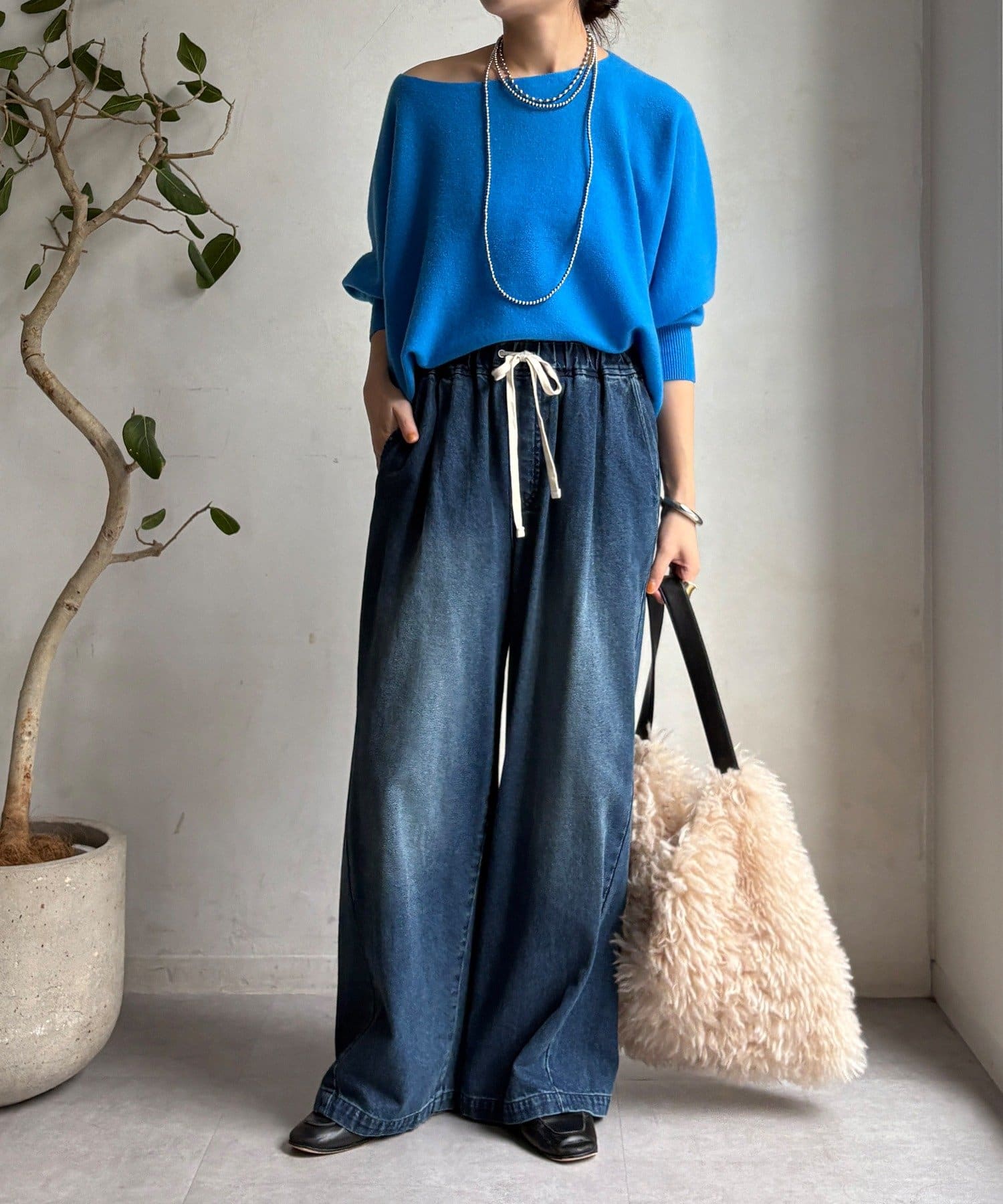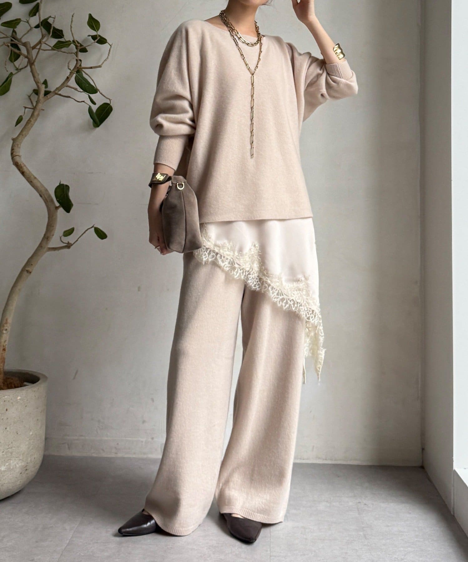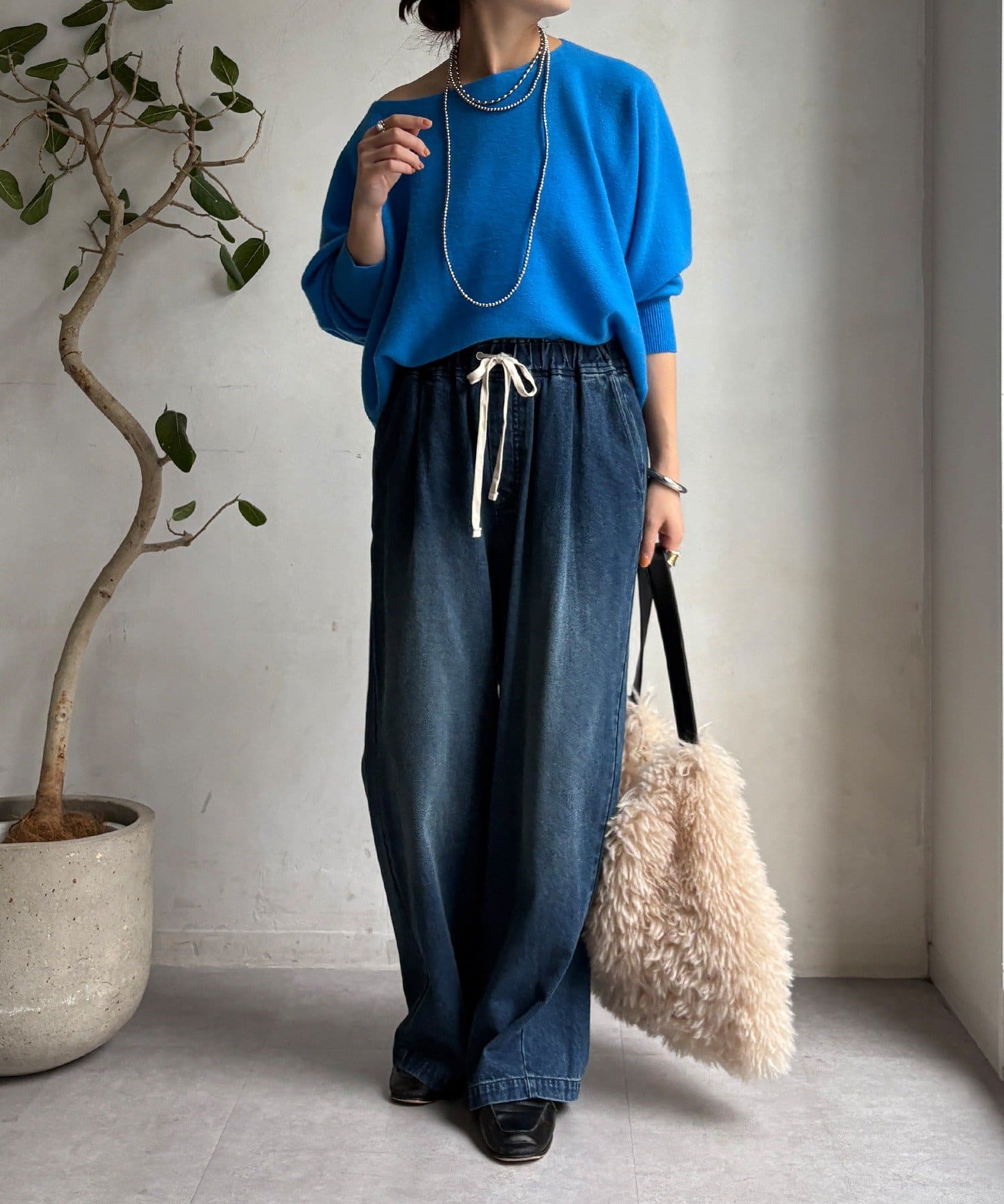 ネックラインは、デコルテと鎖骨を美しく見せるボートネック。女性らしい抜け感をプラスし、顔周りをすっきりと見せてくれます。