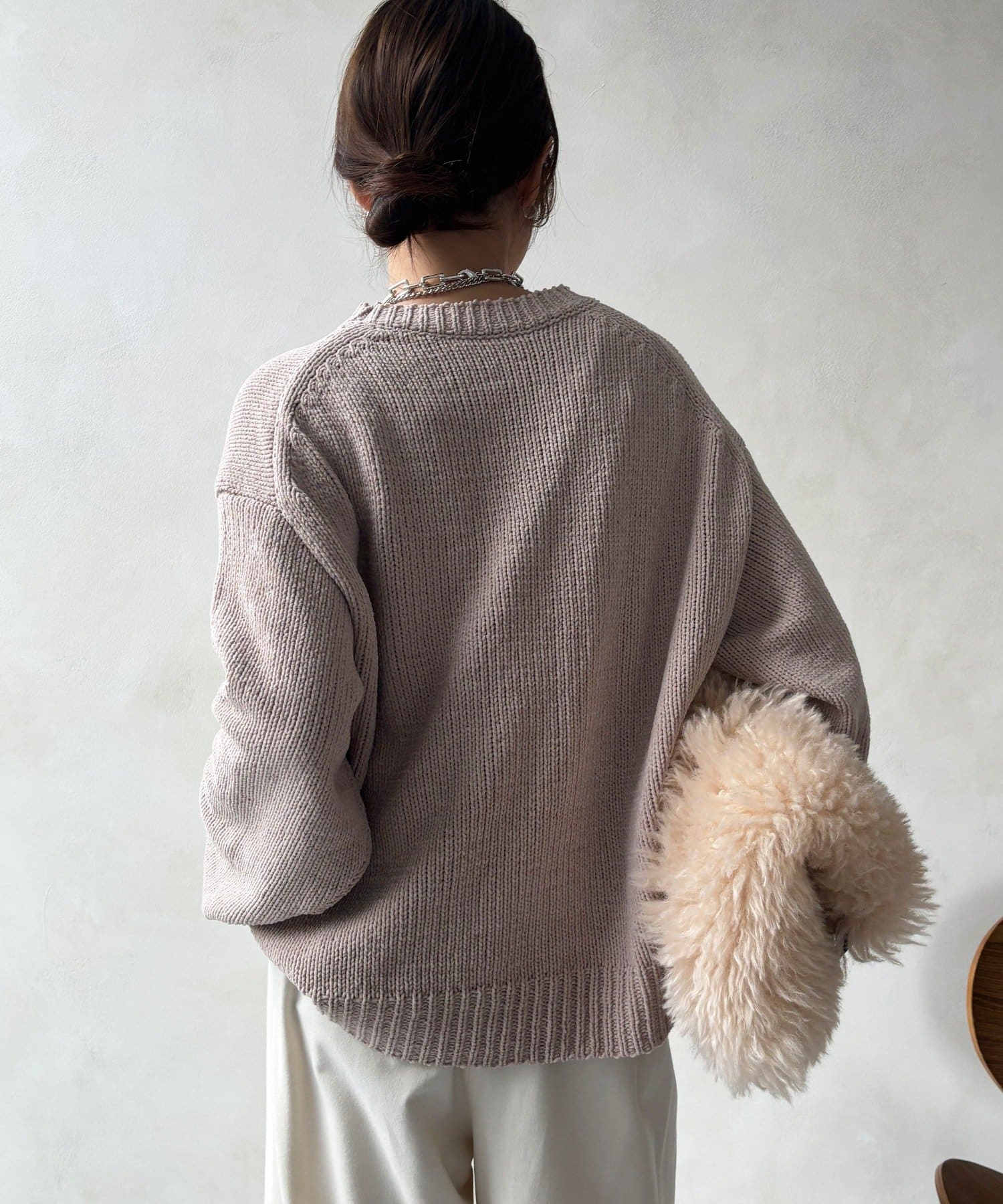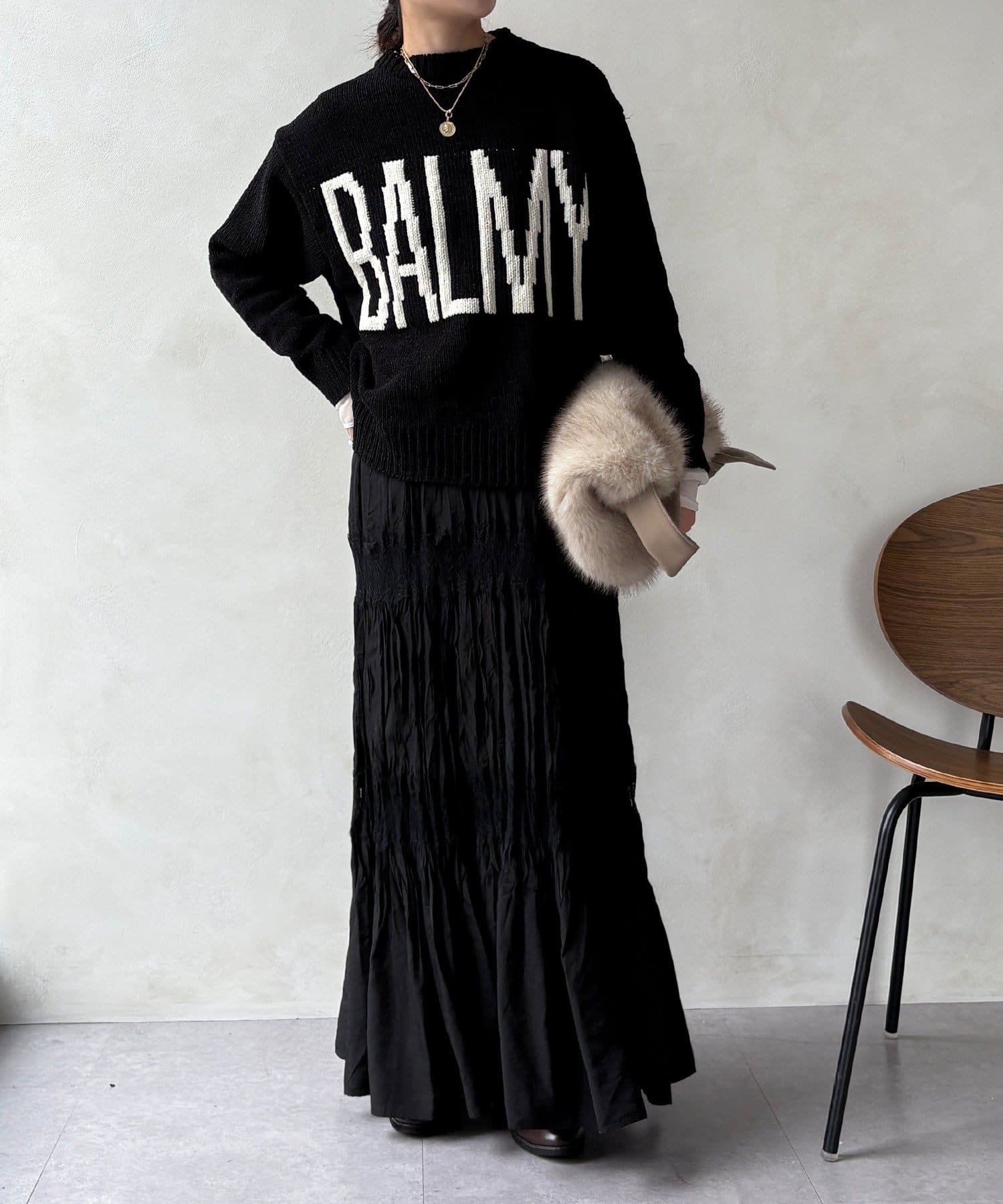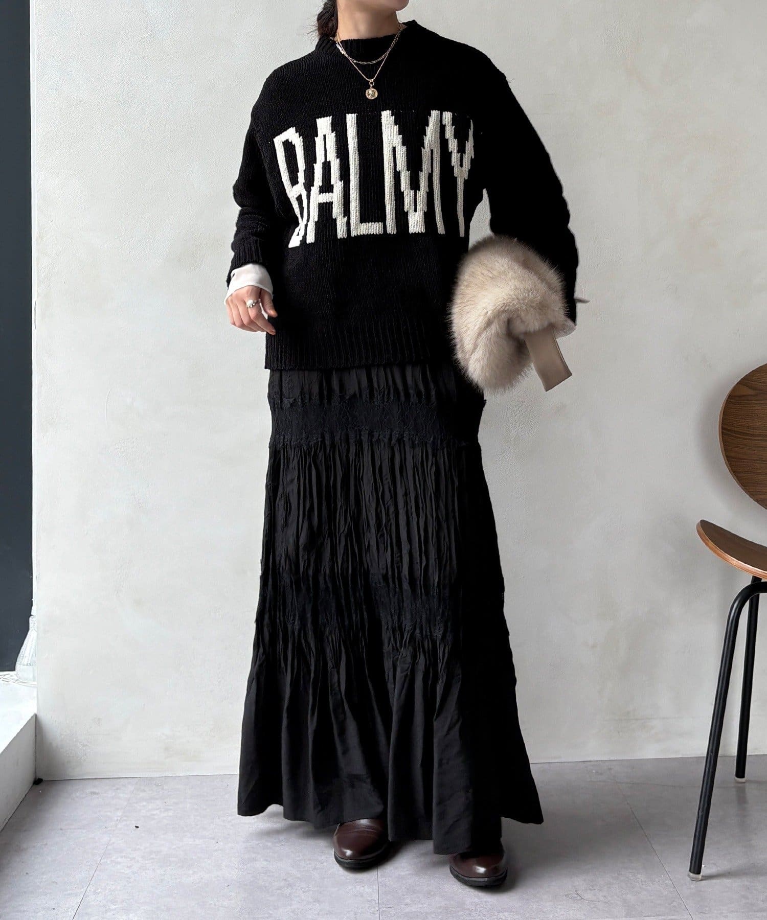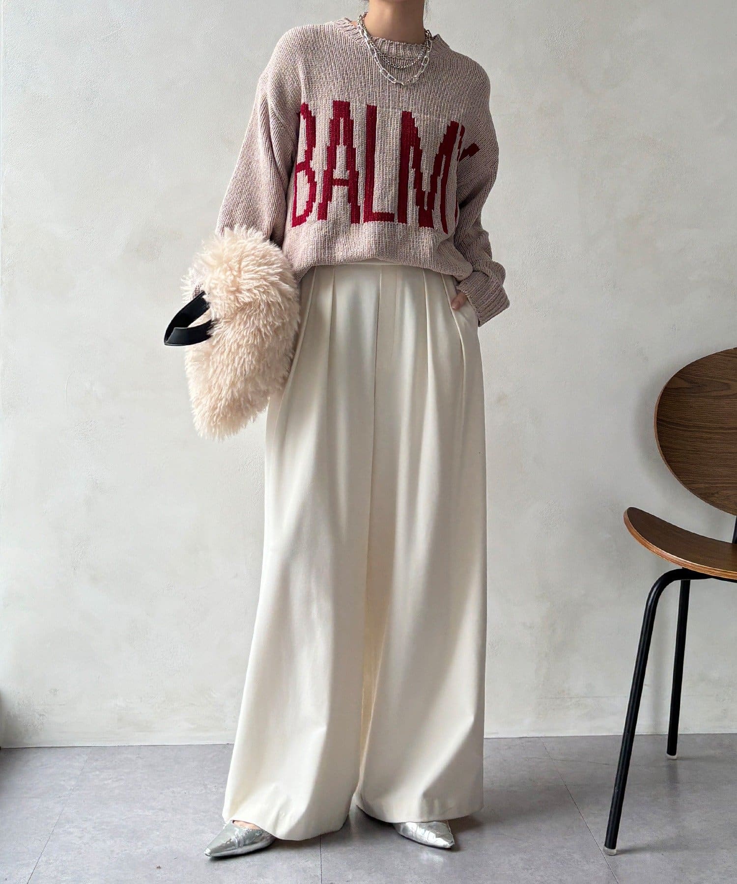 柔らかな肌触りのモールヤーンで編み上げられたロゴデザインが目を惹くニットプルオーバー。