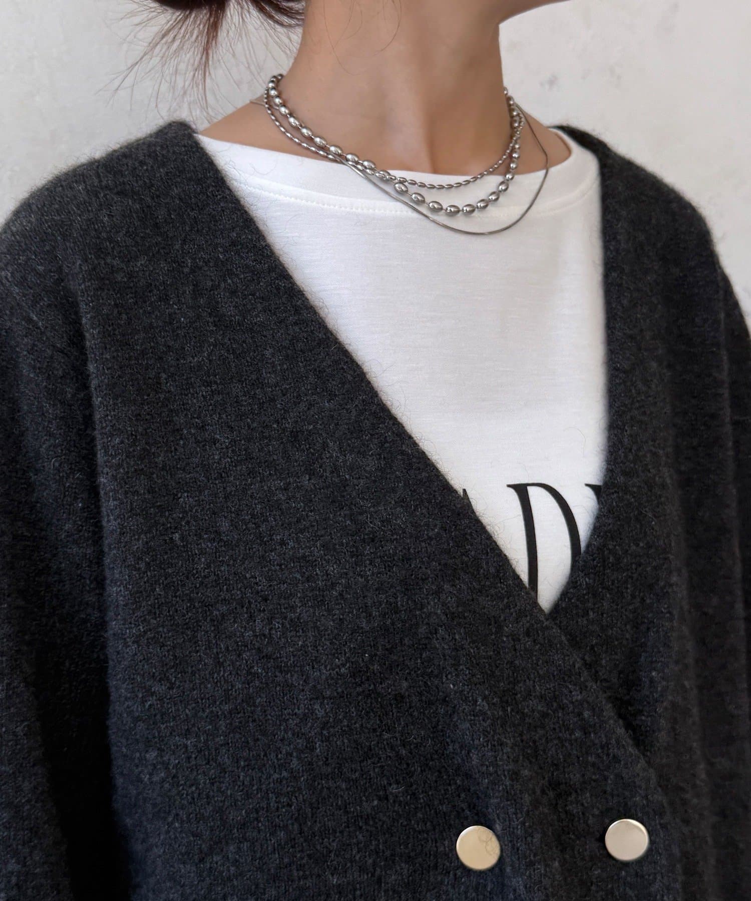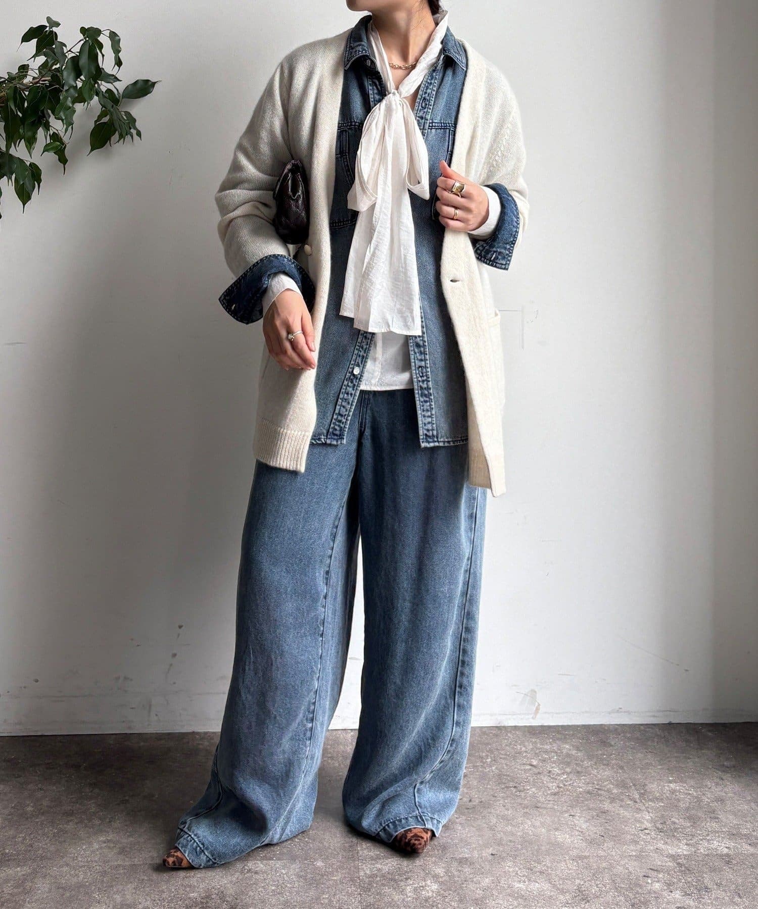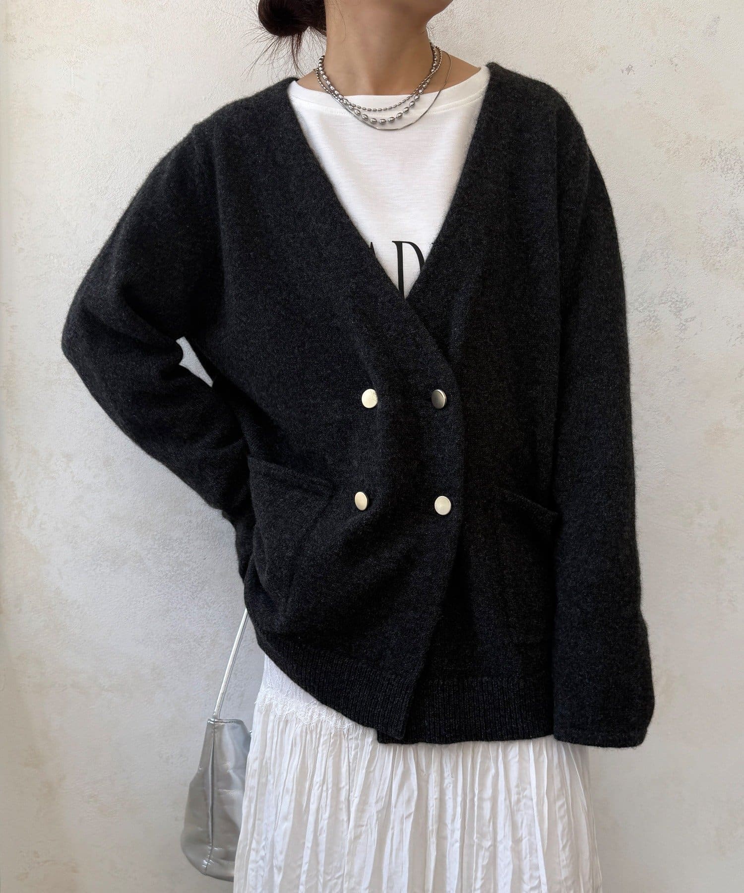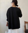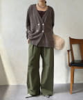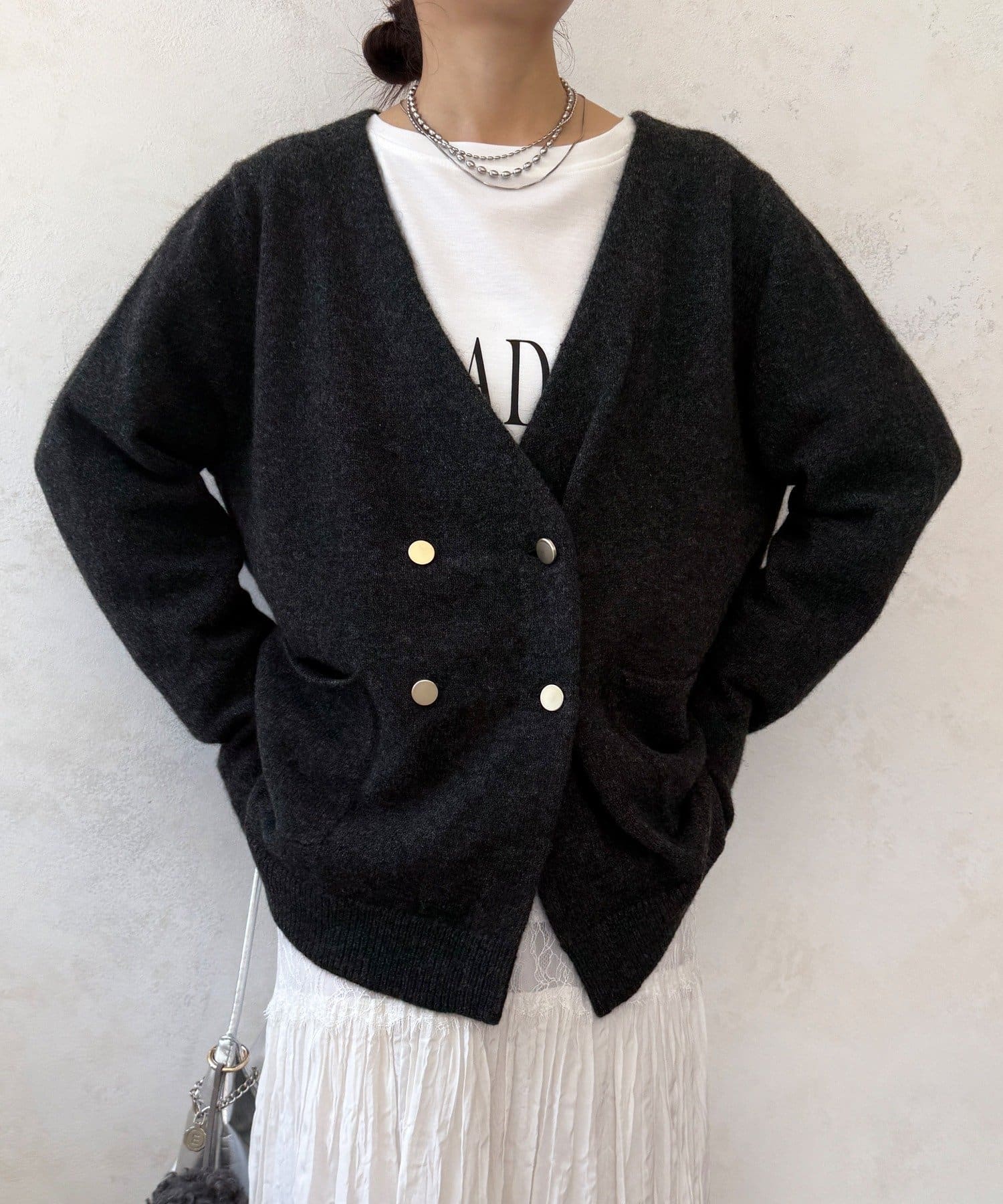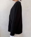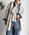 ゴールドのメタルボタンがスタイリングのポイントとなってくれるので、前を開けてさらりと羽織るのはもちろん、ボタンを留めてプルオーバーのようにも着ていただけますよ◎