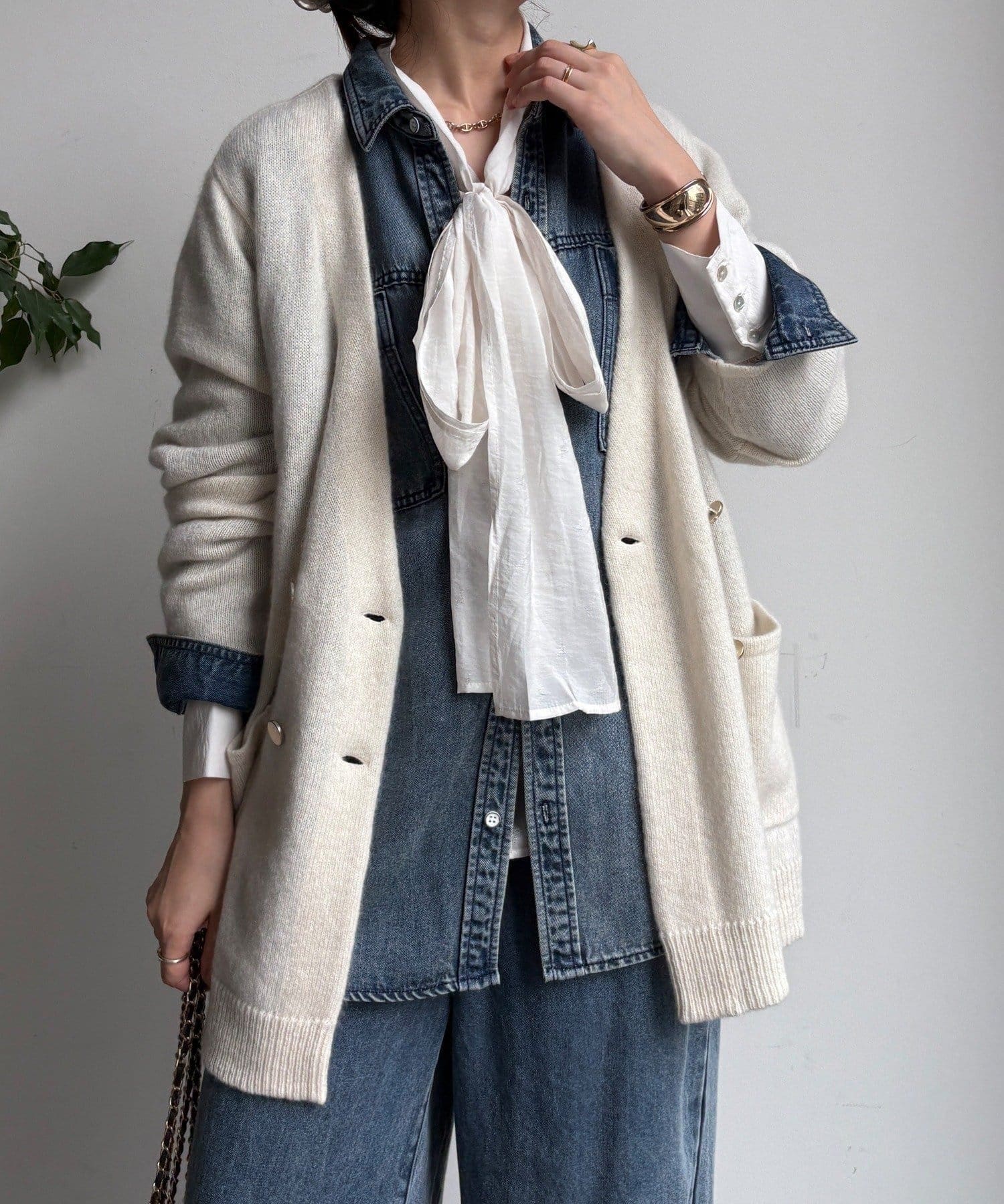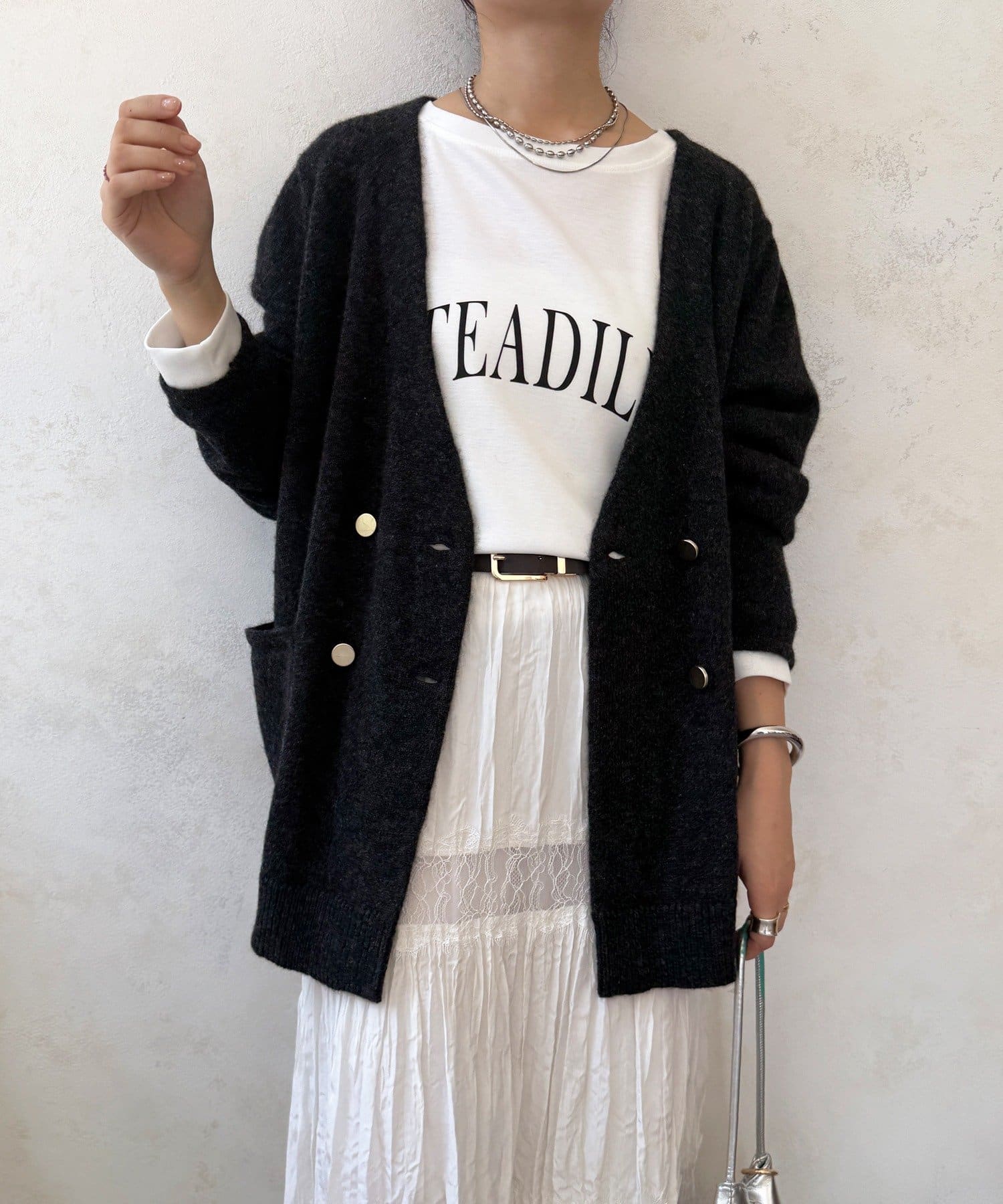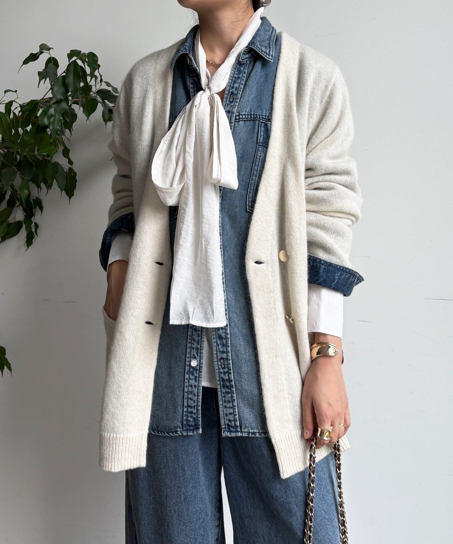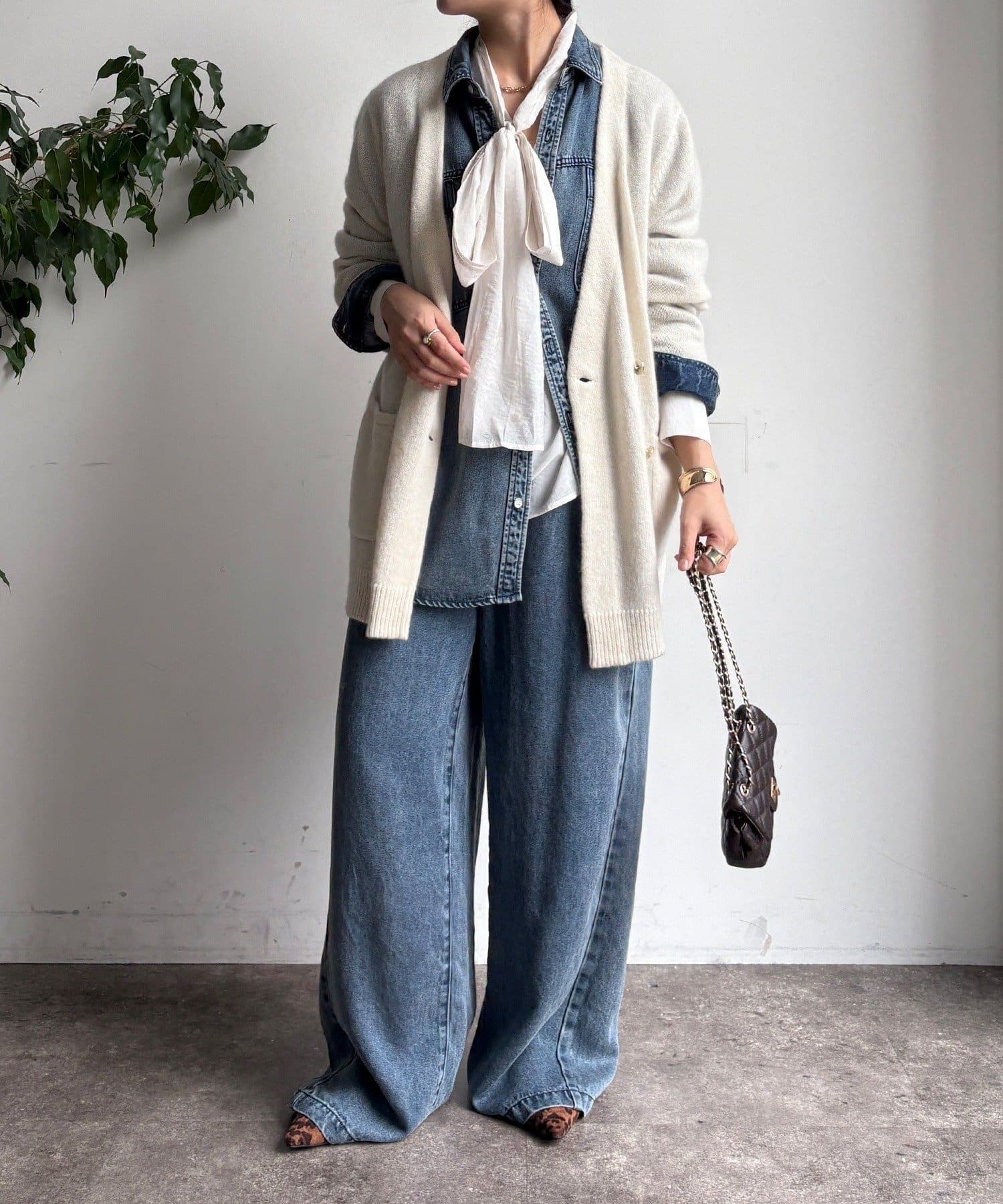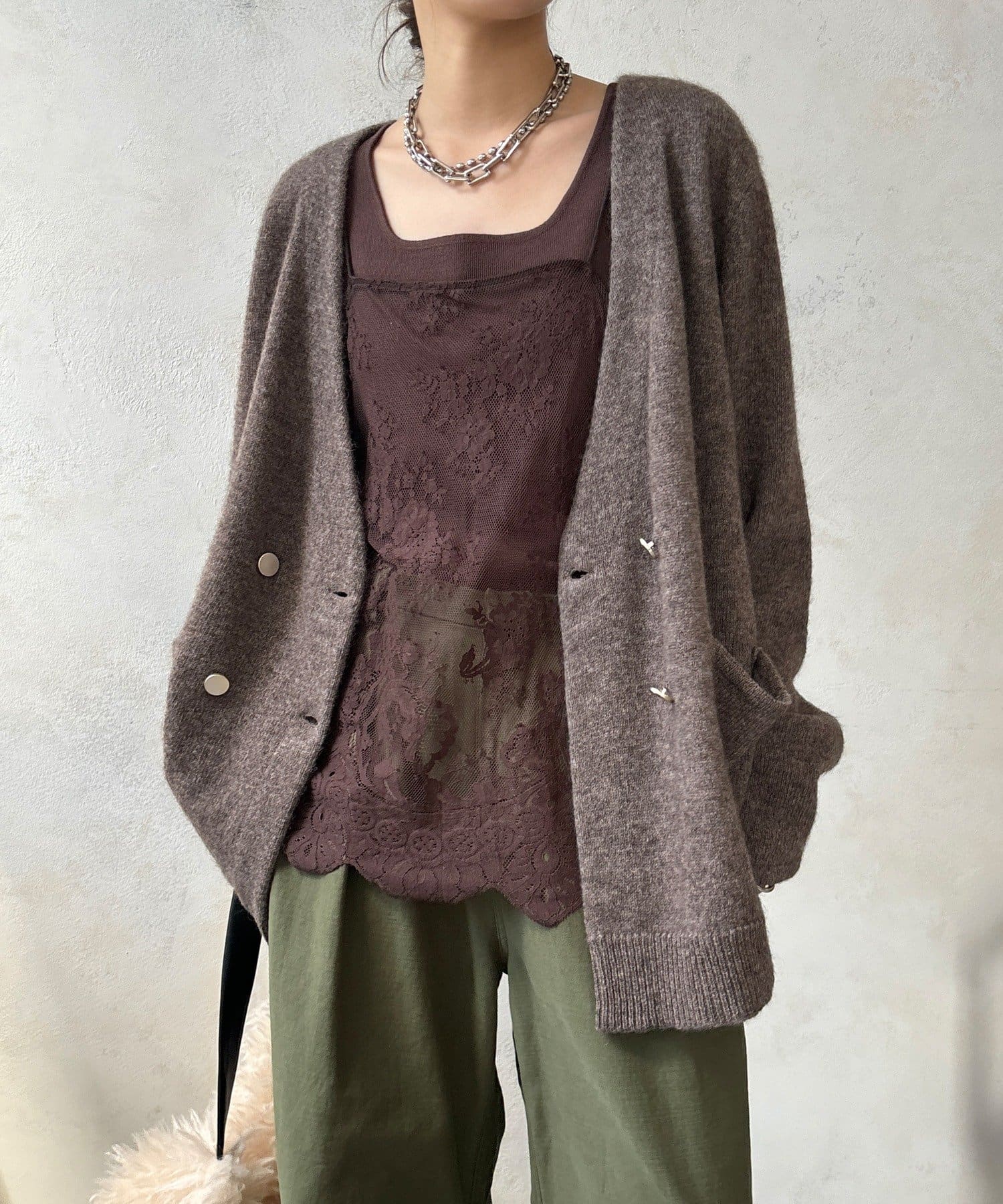 ゴールドのメタルボタンがスタイリングのポイントとなってくれるので、前を開けてさらりと羽織るのはもちろん、ボタンを留めてプルオーバーのようにも着ていただけますよ◎