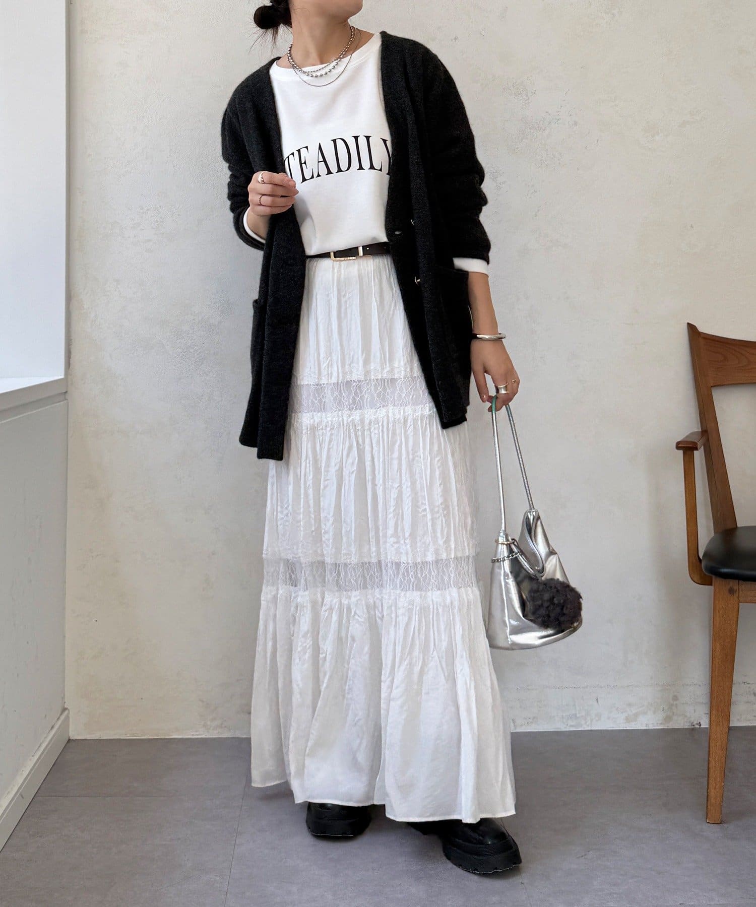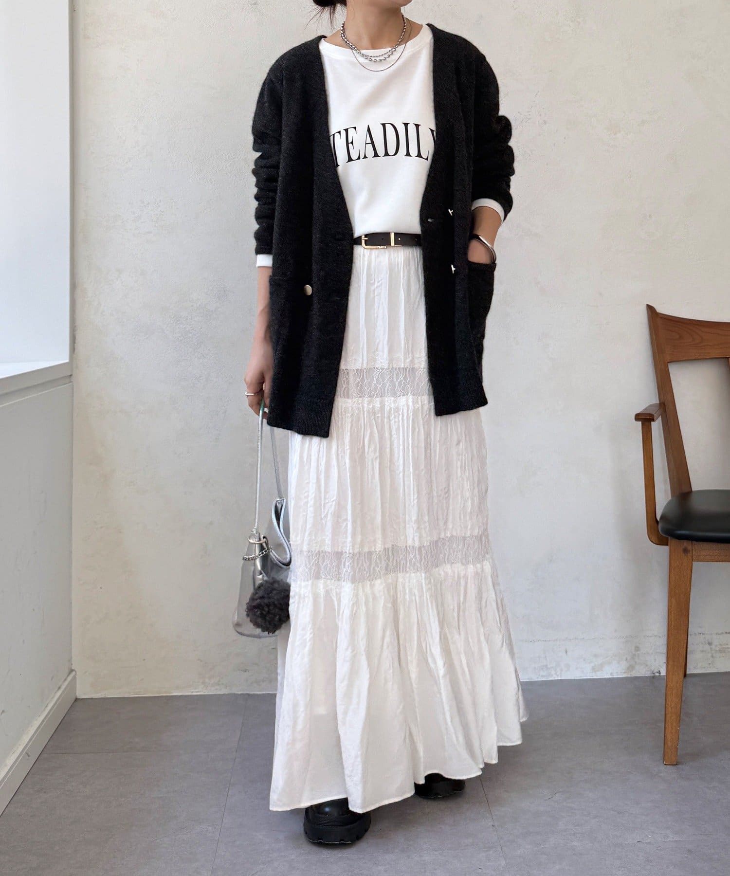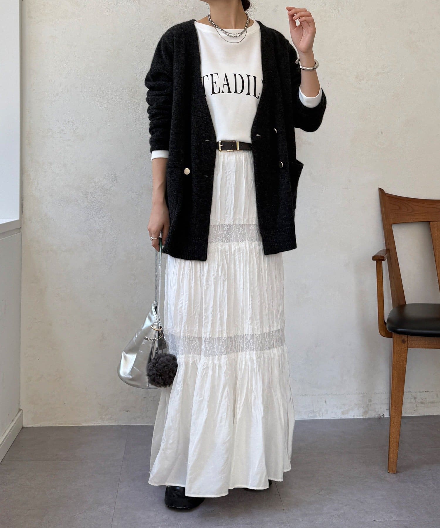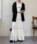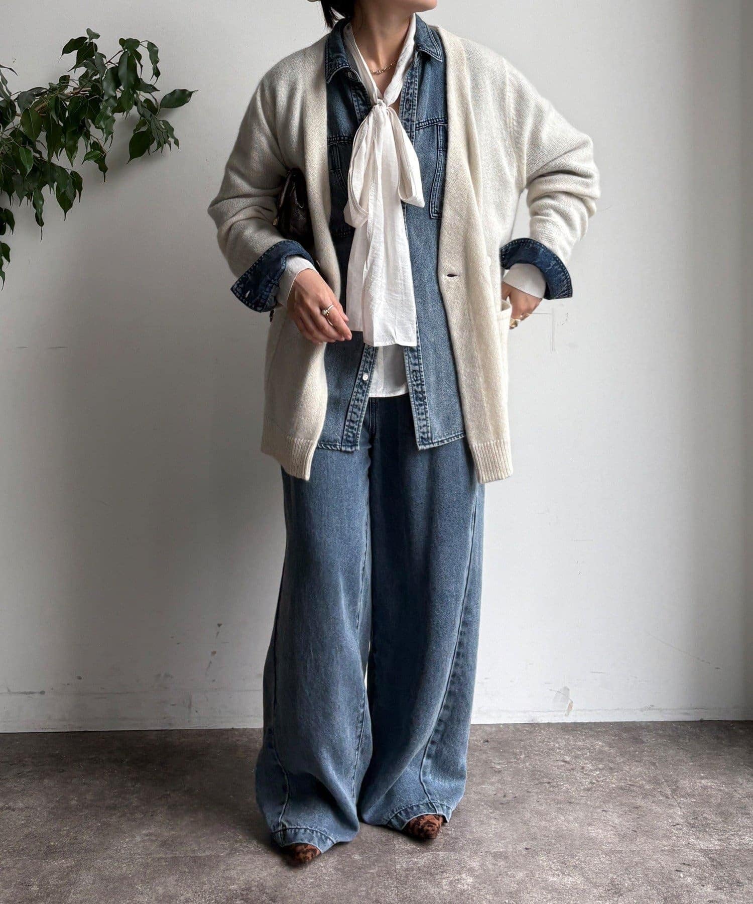 ゴールドのメタルボタンがスタイリングのポイントとなってくれるので、前を開けてさらりと羽織るのはもちろん、ボタンを留めてプルオーバーのようにも着ていただけますよ◎
