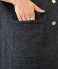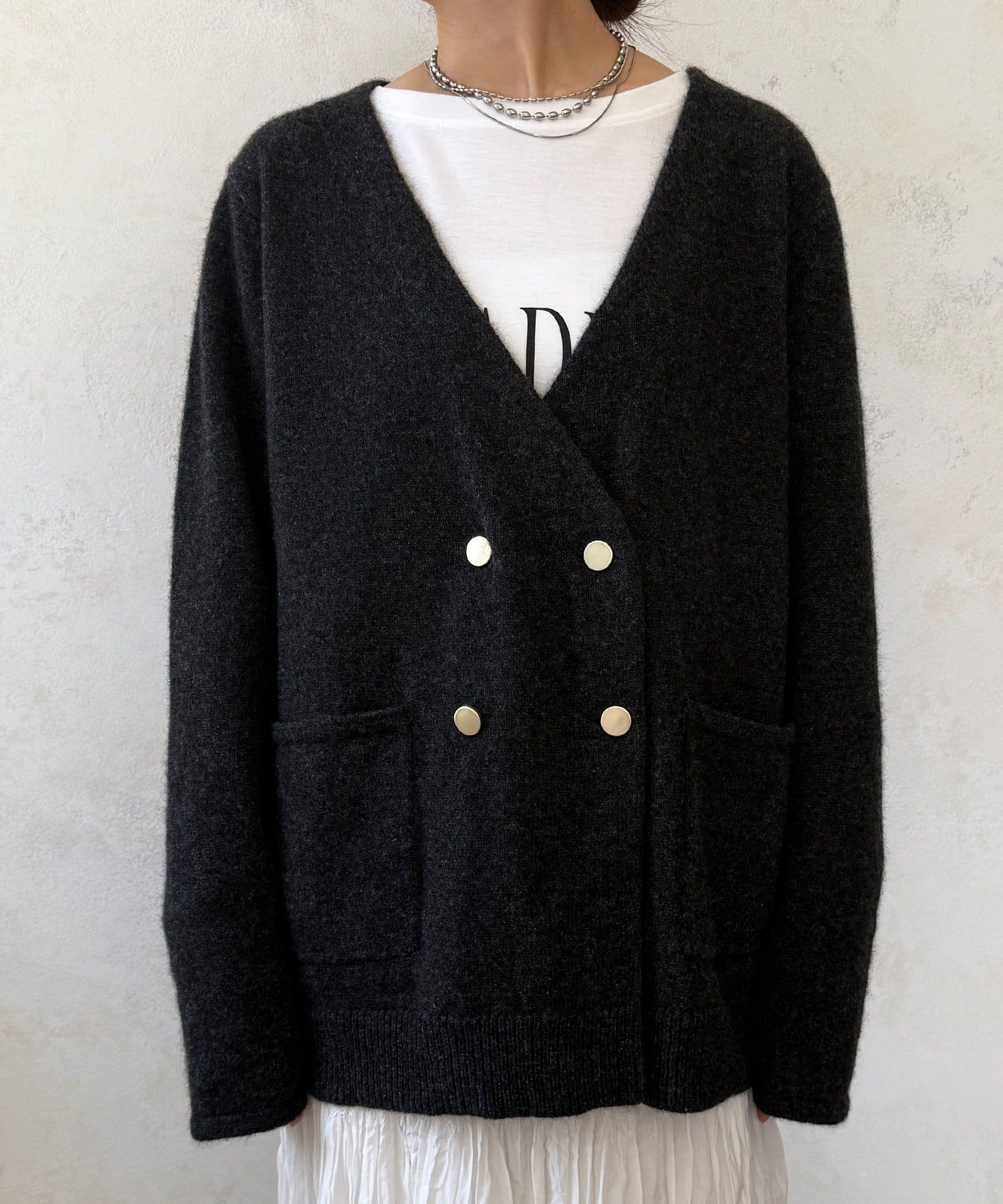 デザインは、Vネックのカーディガンにトラッドなダブルボタンとポケットを配置。カーディガンでありながらジャケットのようなきちんと感を演出します。