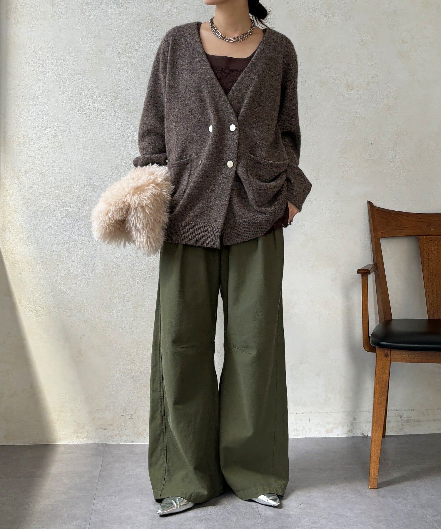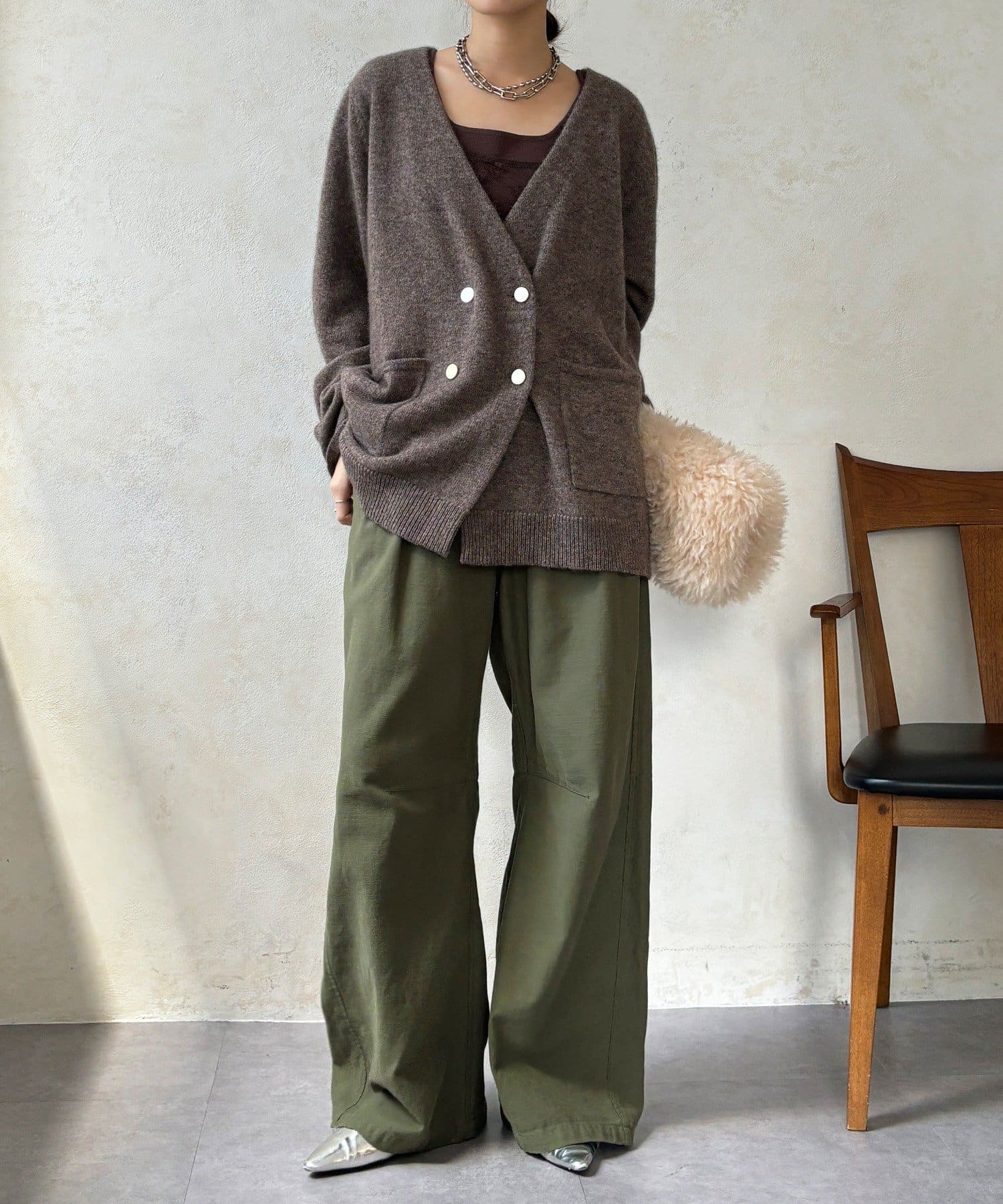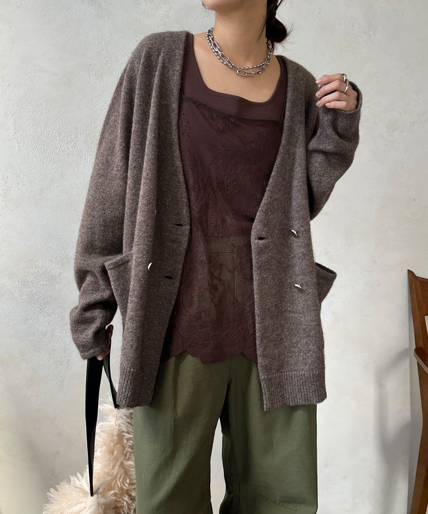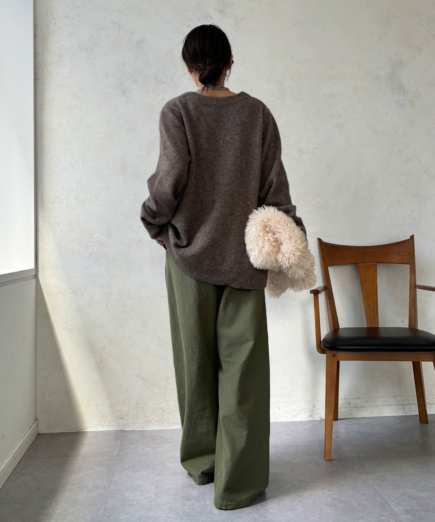 ヤクの持つ柔らかな風合いとウールの暖かさにより、軽やかな着心地でありながら高い防寒性を実現。ふわっとした素材感が奥行きを与えます。