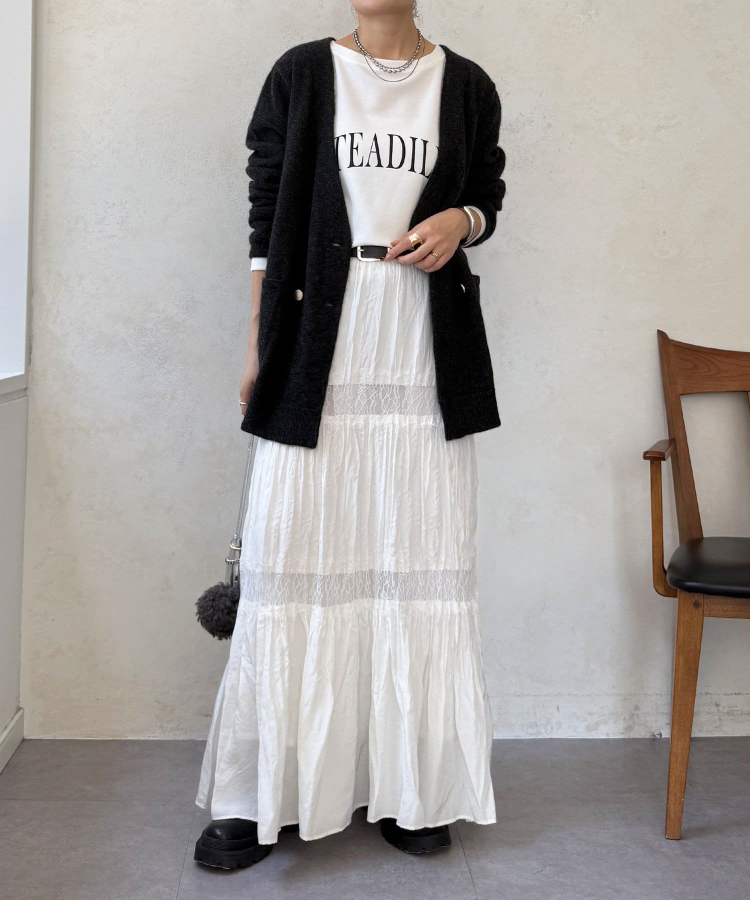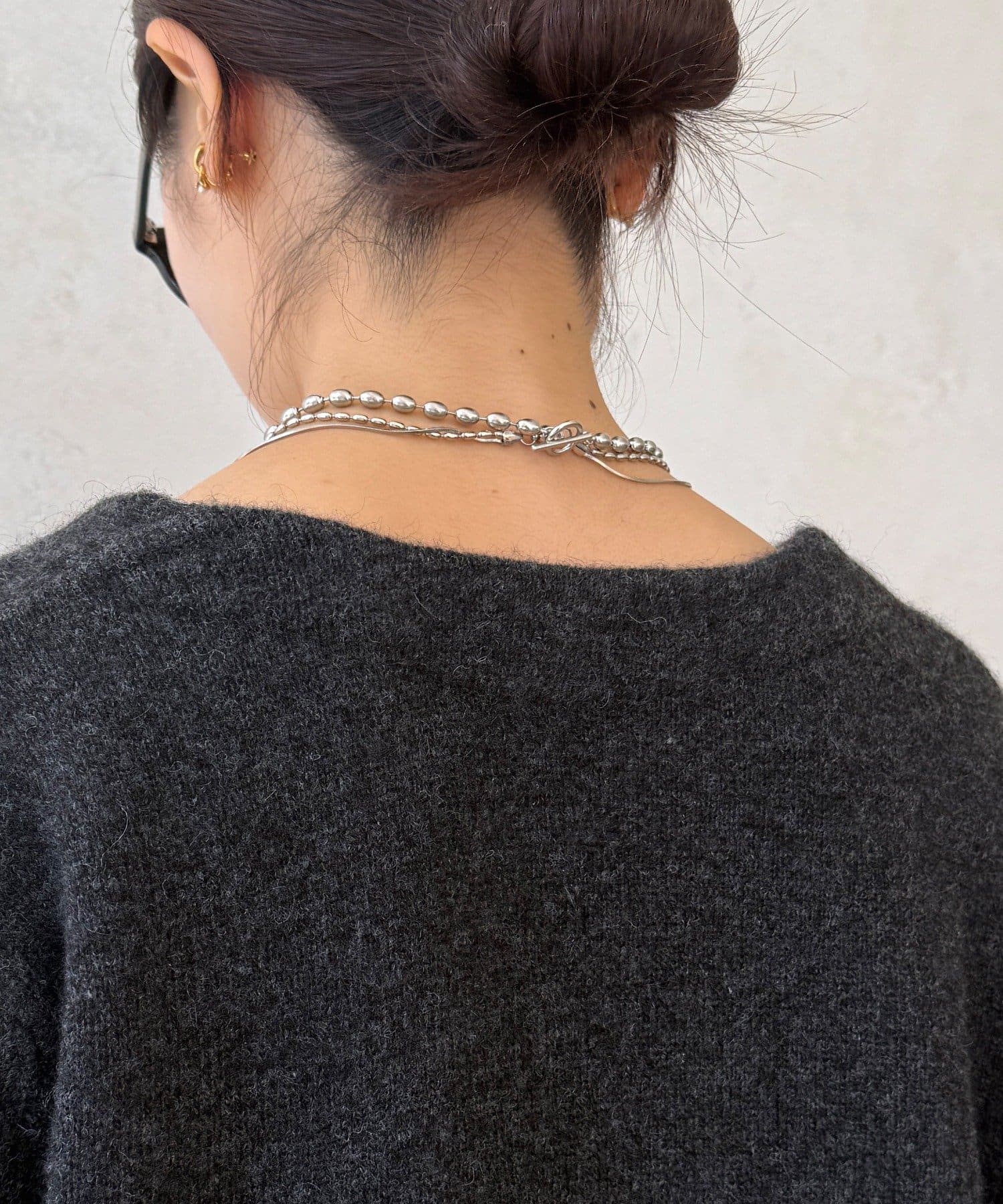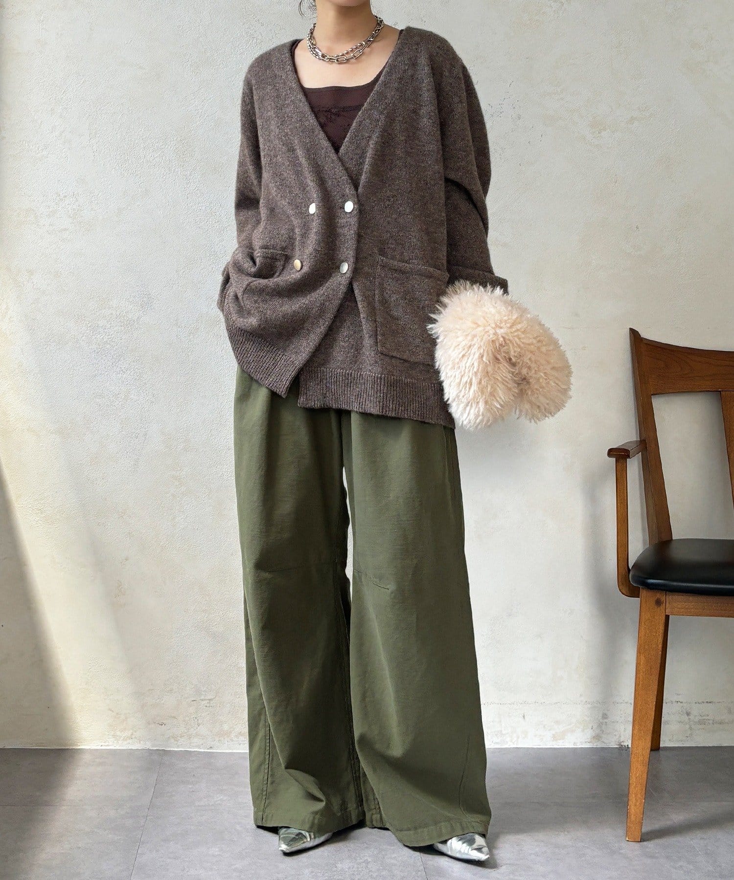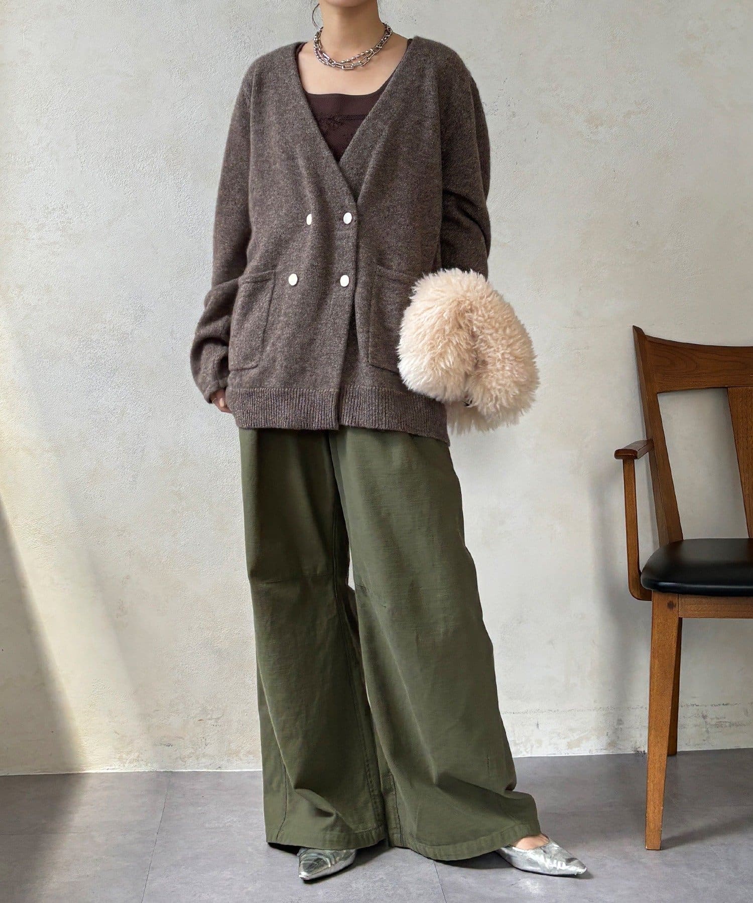 ヤクの持つ柔らかな風合いとウールの暖かさにより、軽やかな着心地でありながら高い防寒性を実現。ふわっとした素材感が奥行きを与えます。
