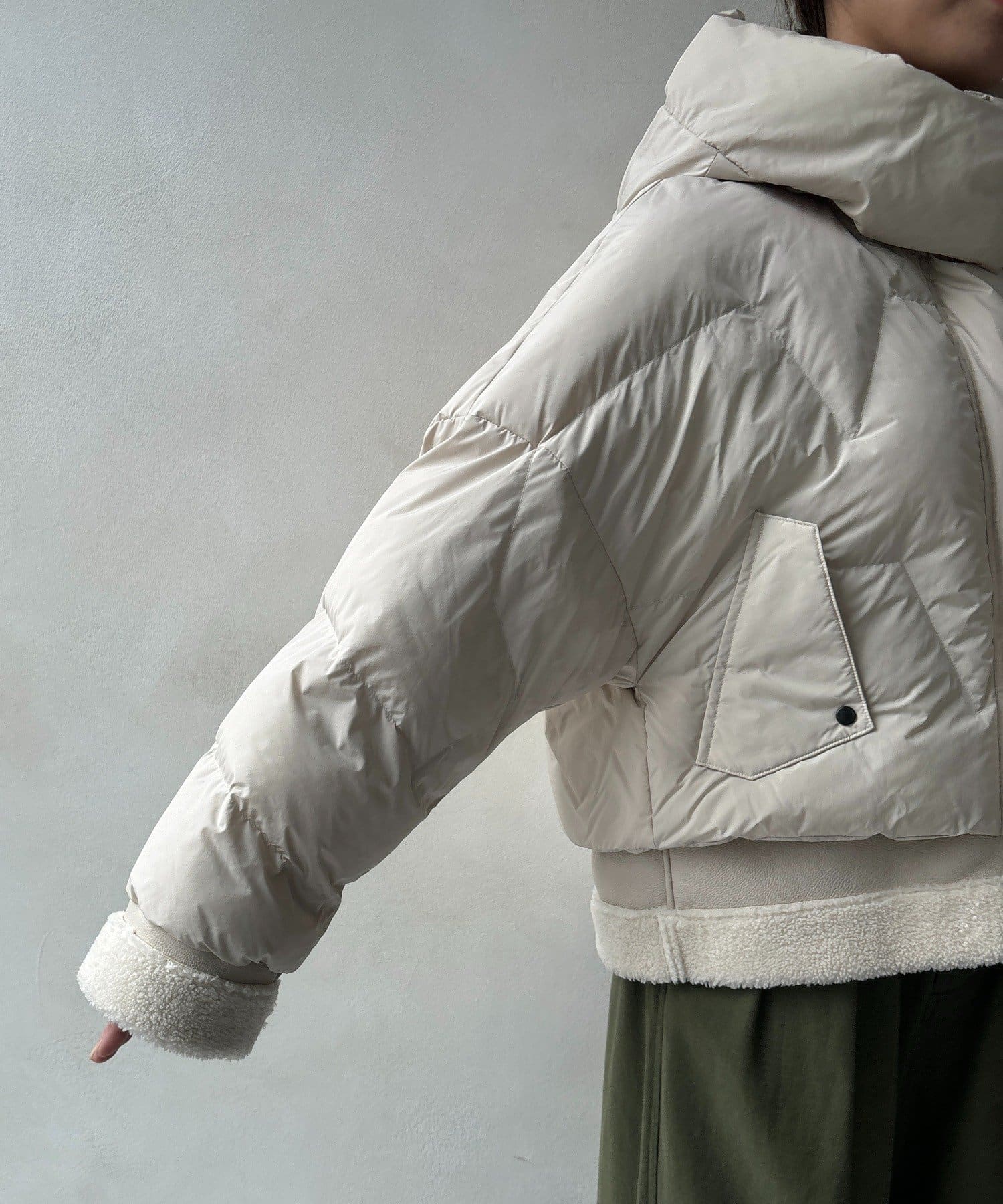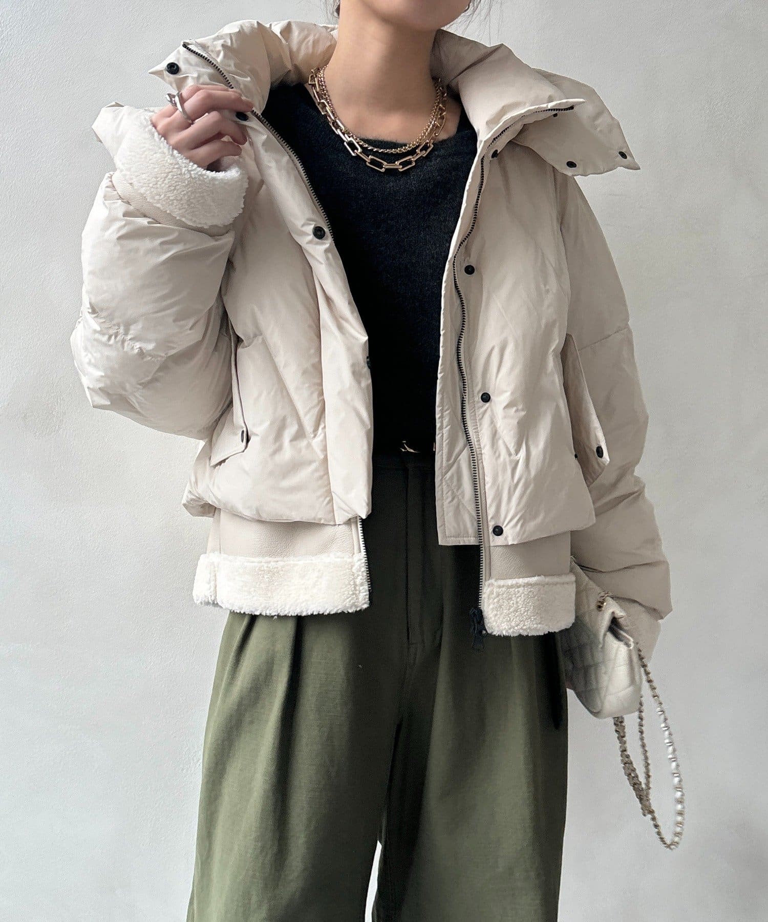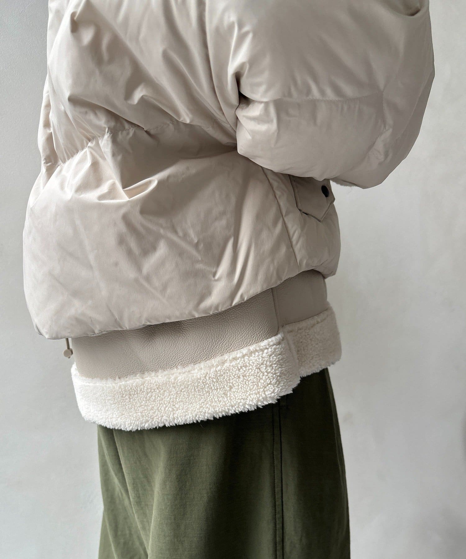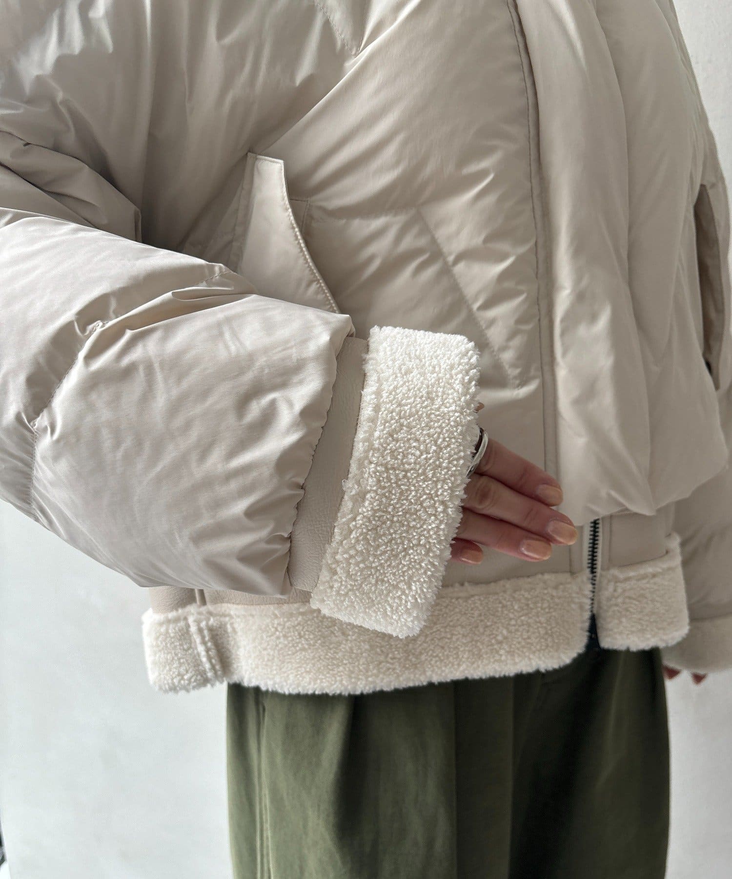 ふんわりとしたフェイクムートンと、軽くて暖かなダウンを組み合わせた切替デザインが魅力の1枚。