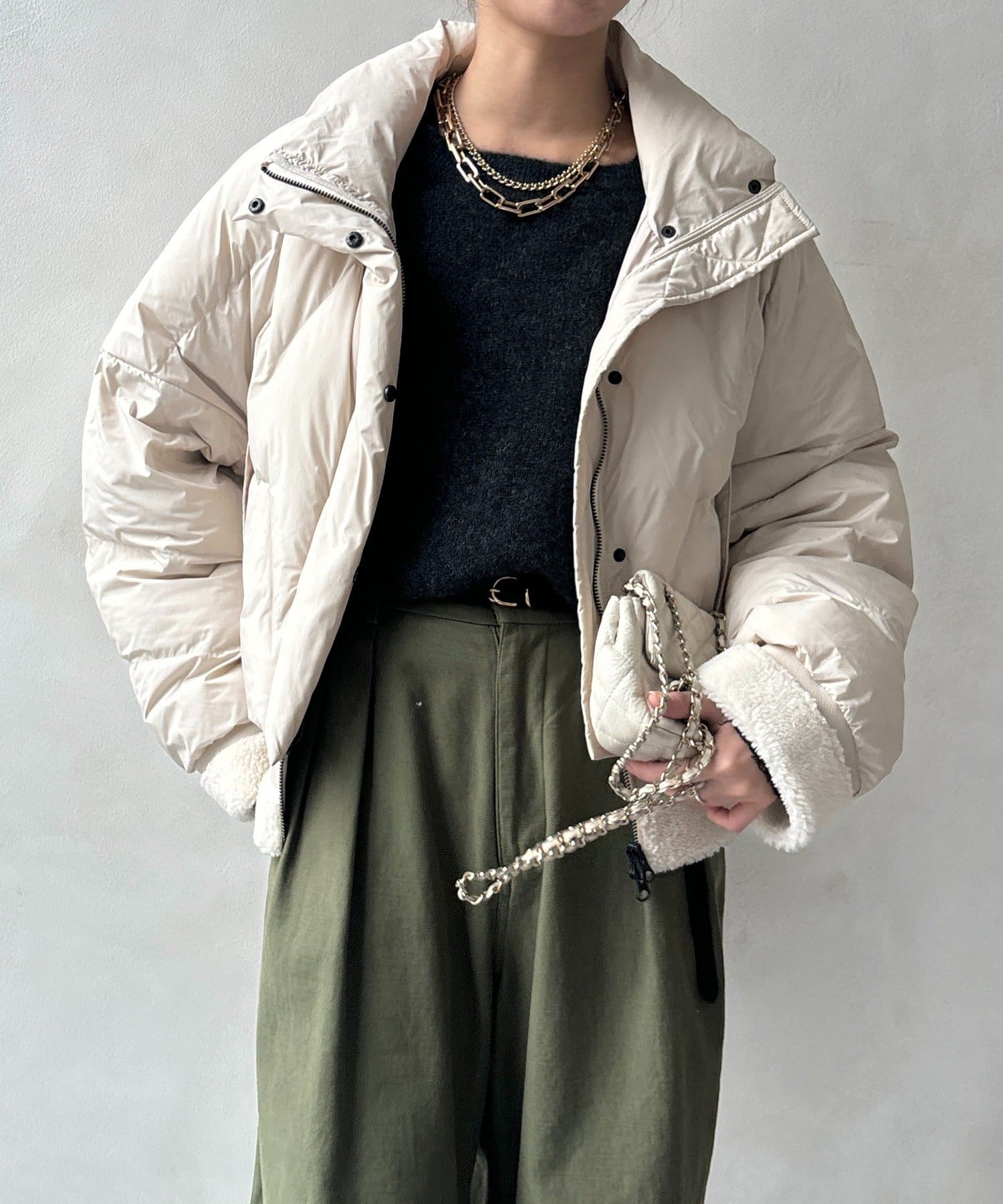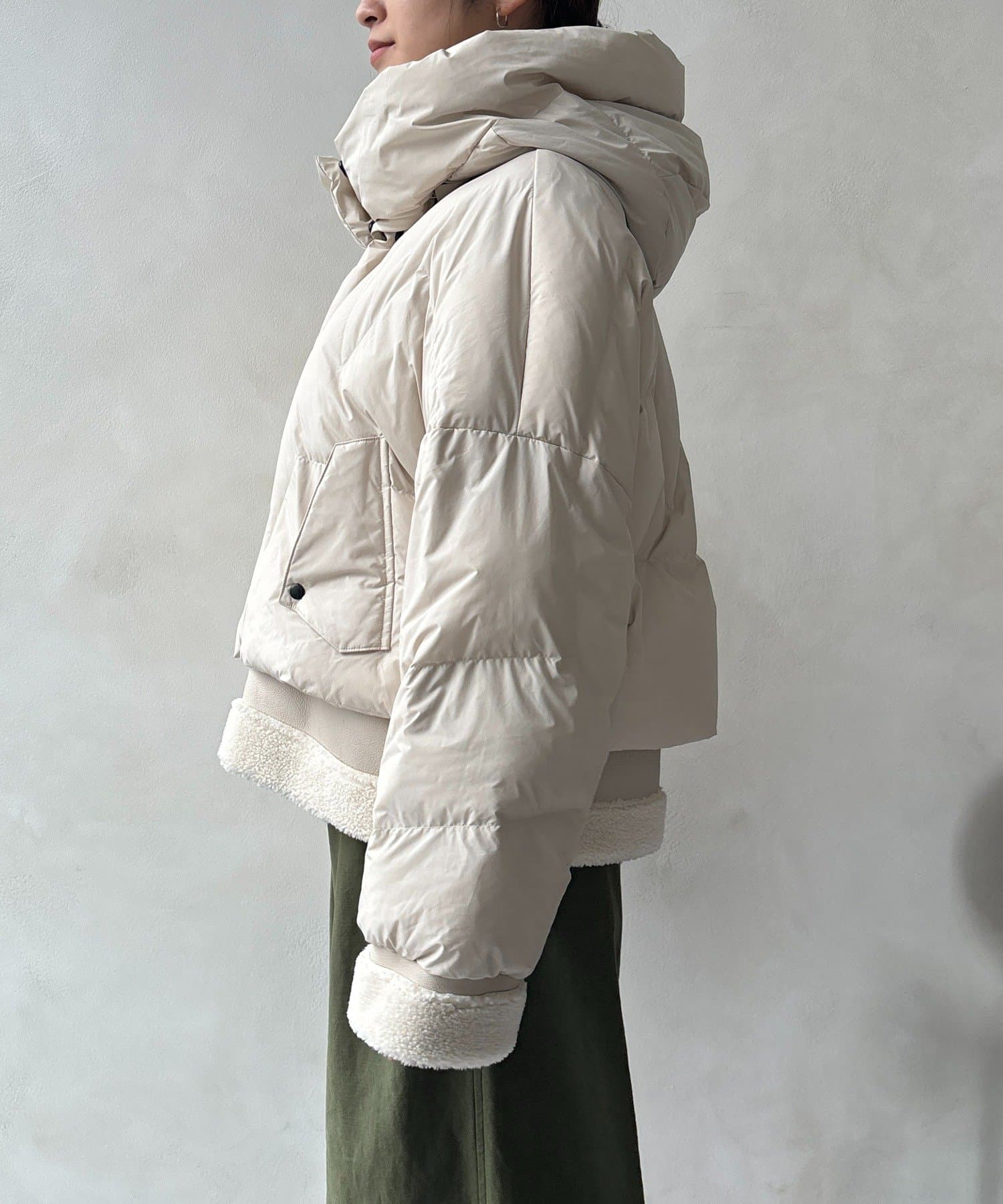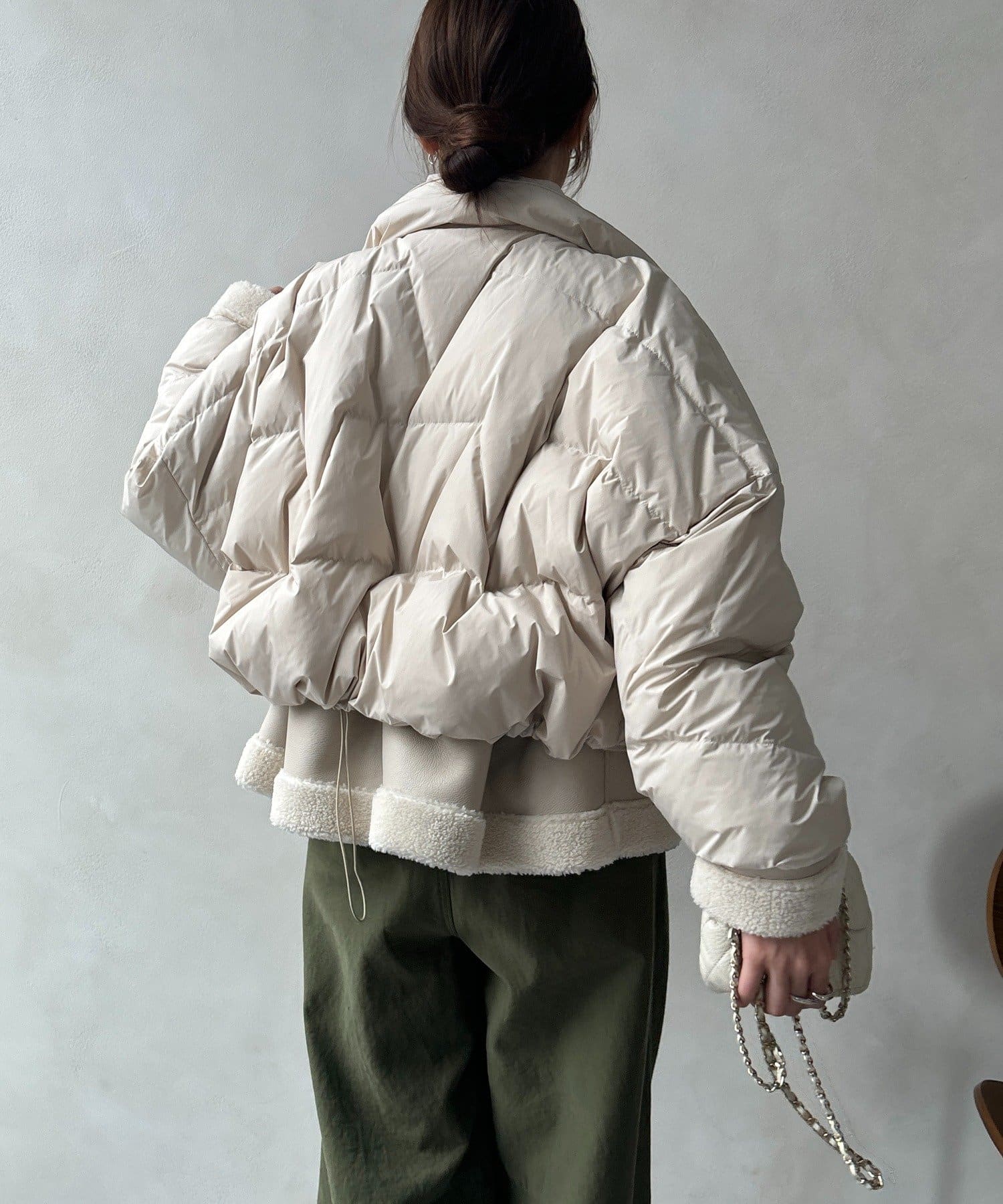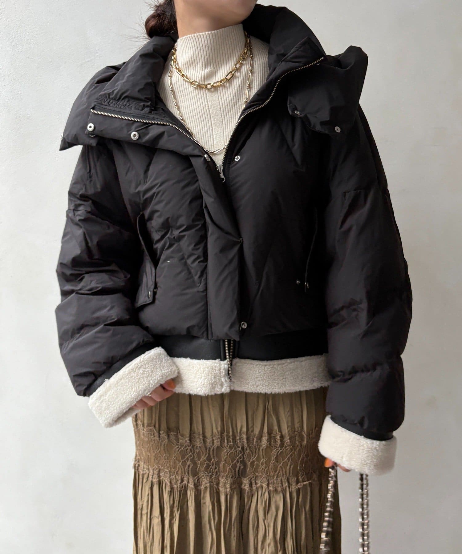 ふんわりとしたフェイクムートンと、軽くて暖かなダウンを組み合わせた切替デザインが魅力の1枚。