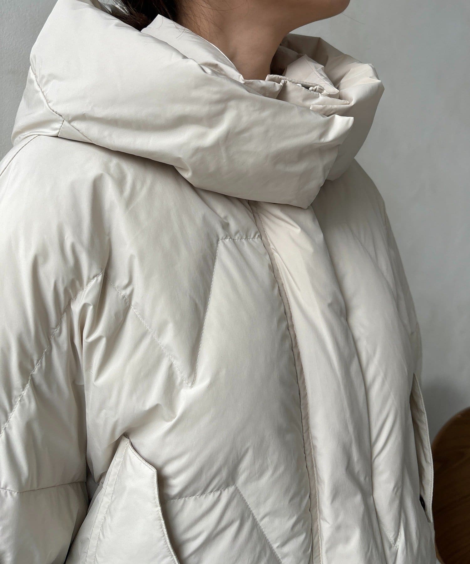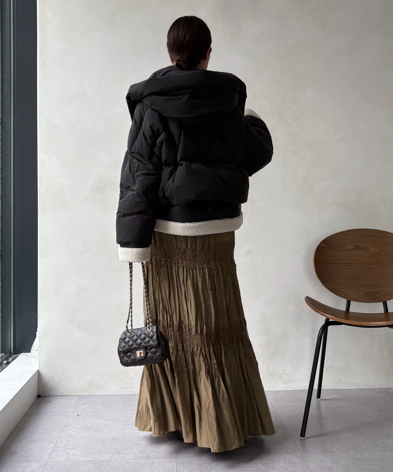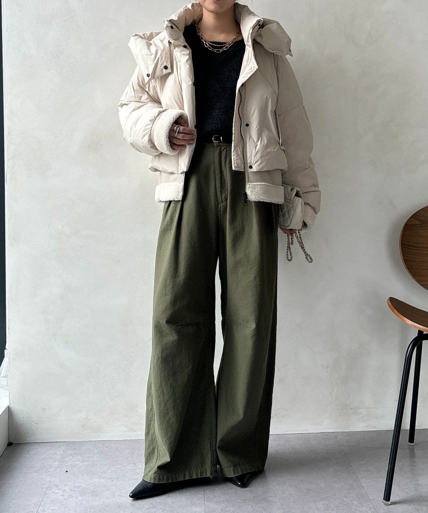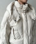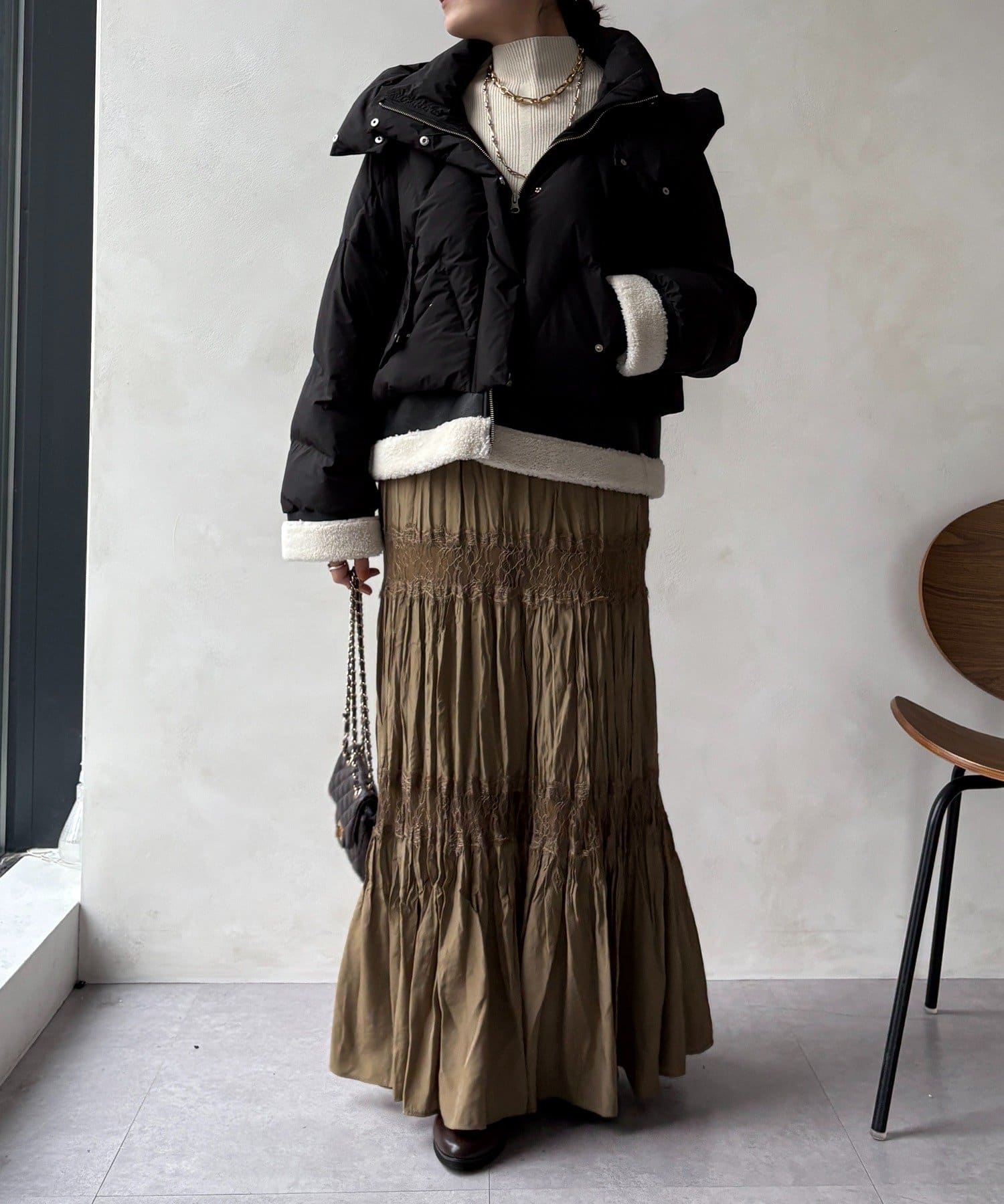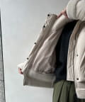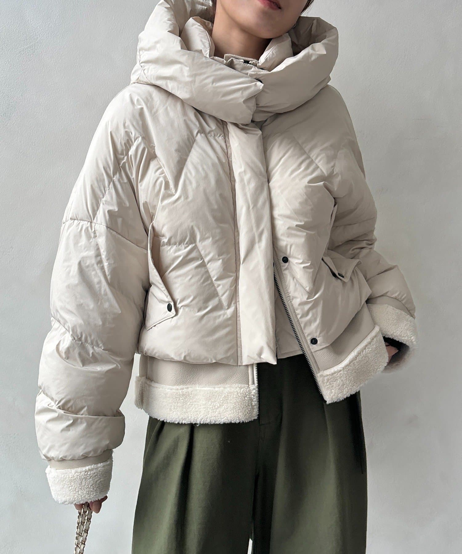 フェイクムートン×ダウンの異素材切替が映える、デザイン性の高い1枚