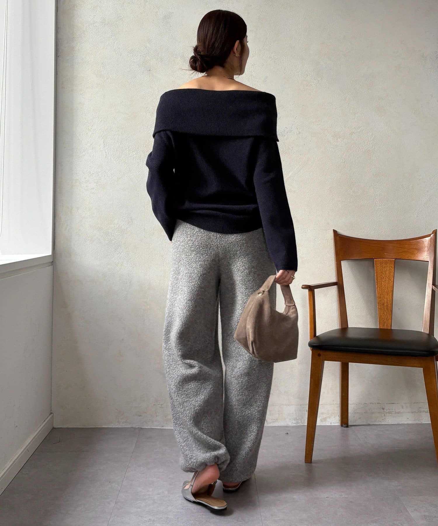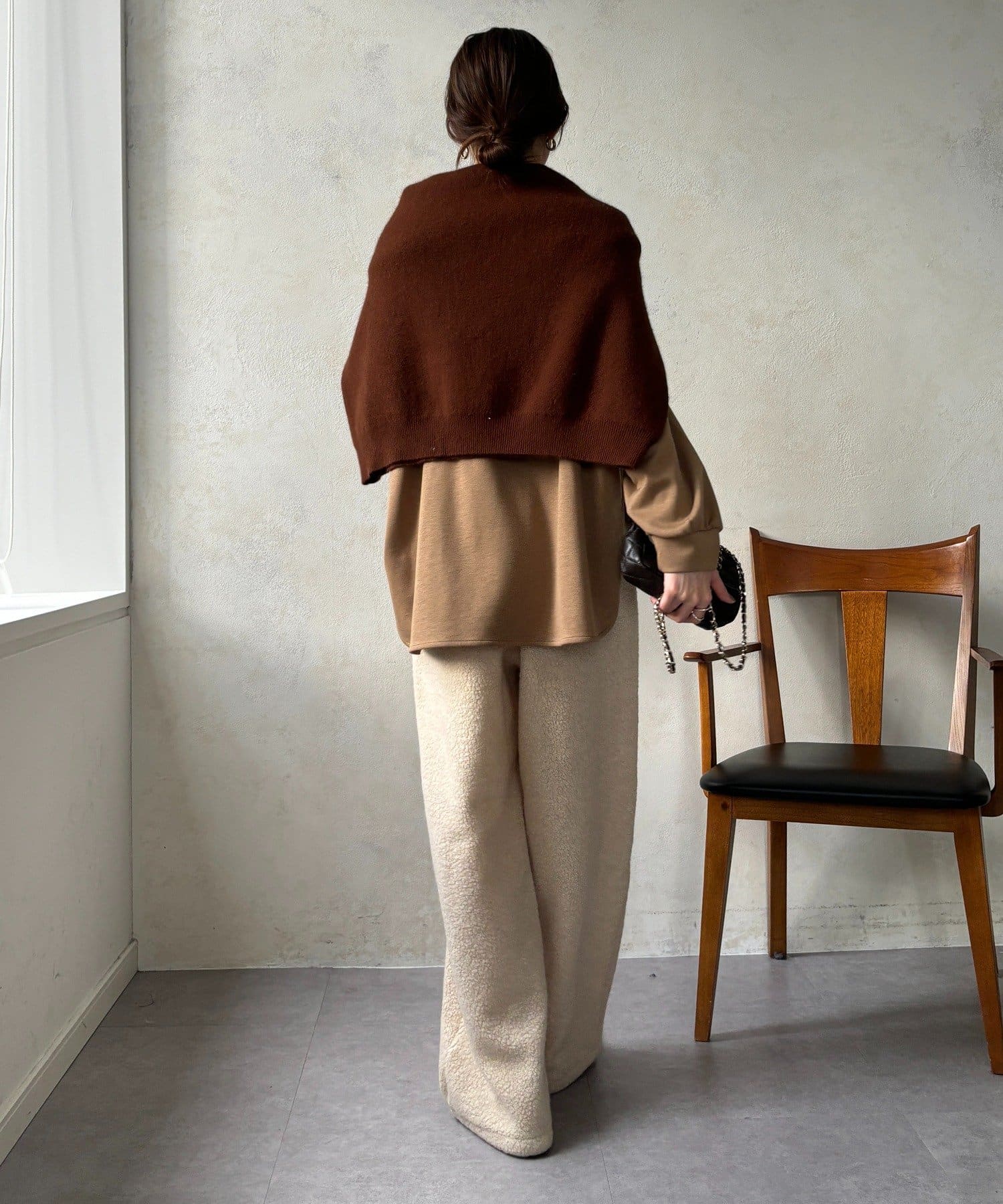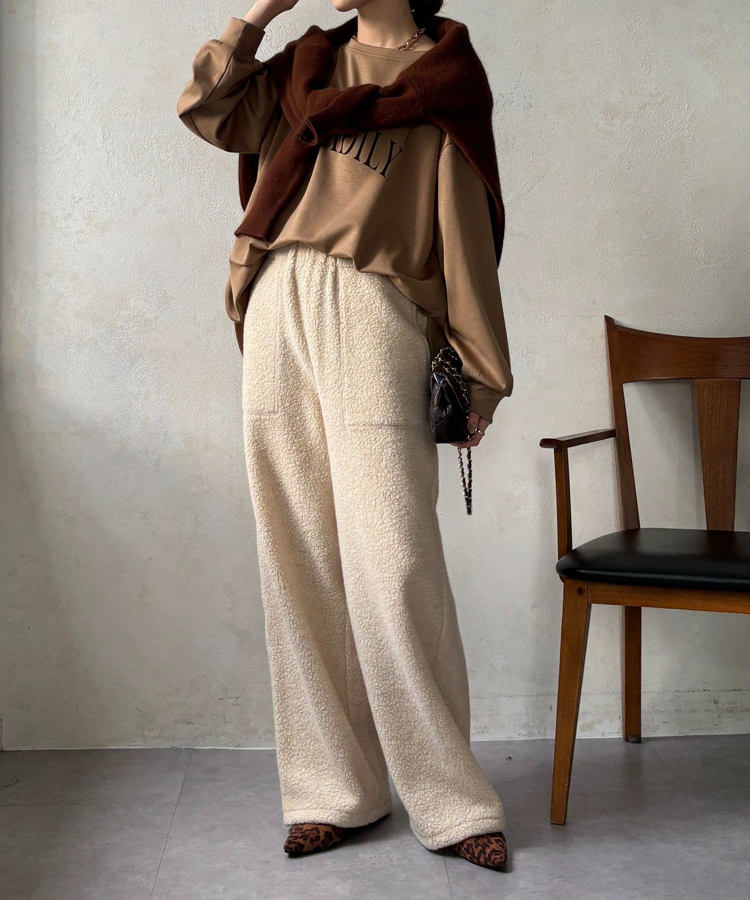 ボア素材特有のふわもこ感を生かしつつ、見た目に重くなりすぎない絶妙なバランスに。