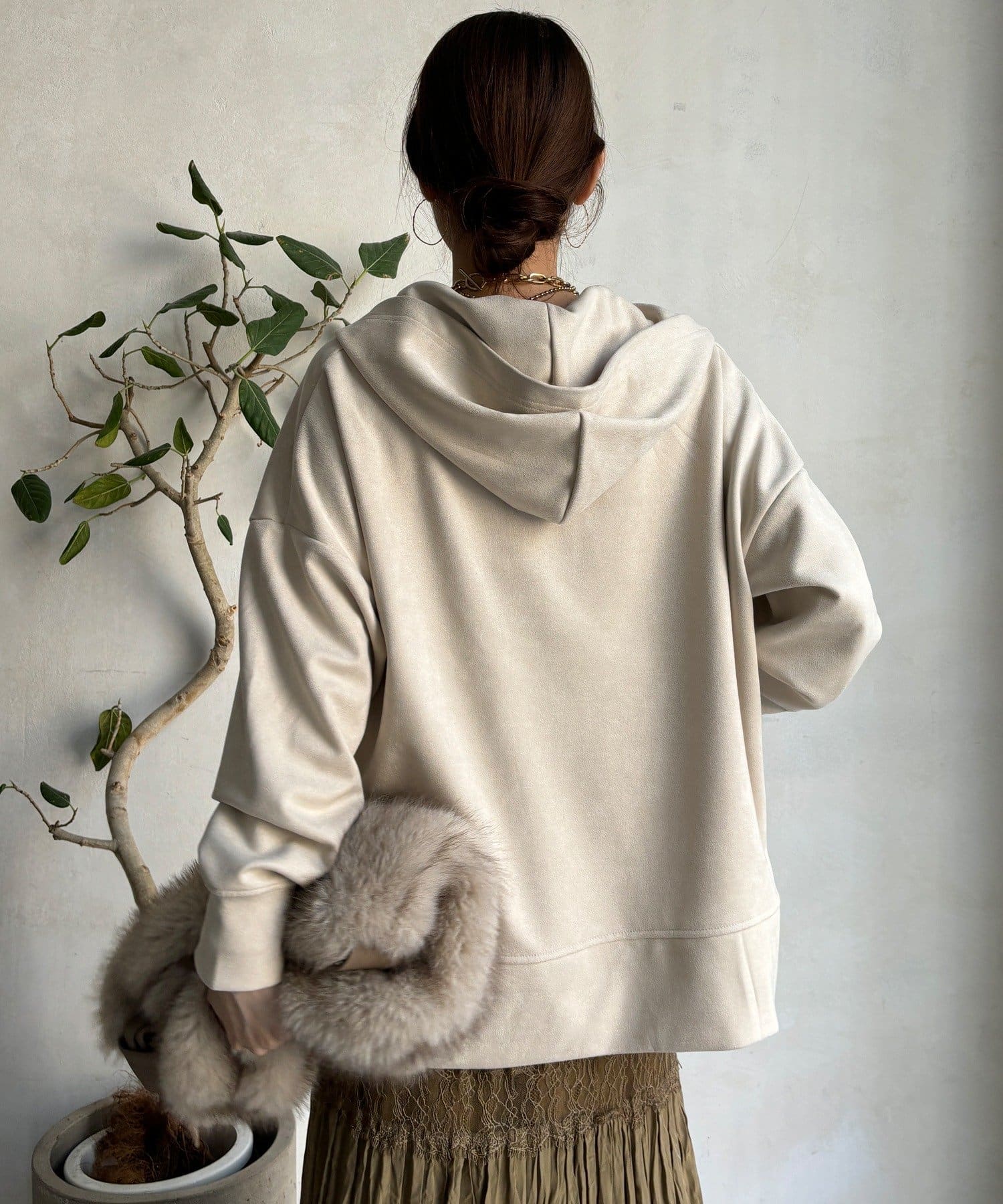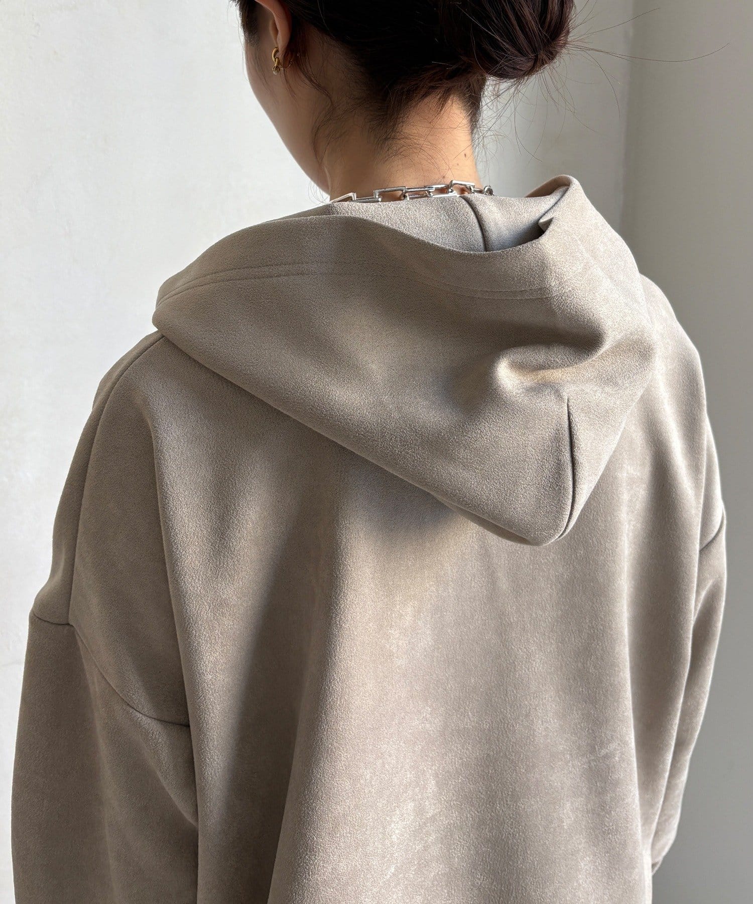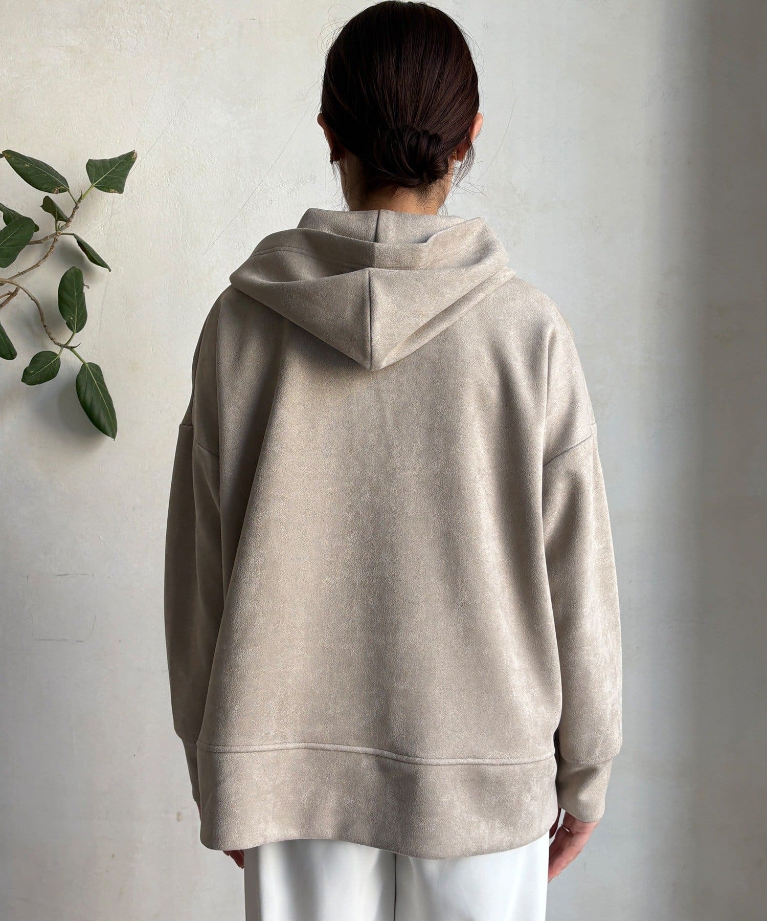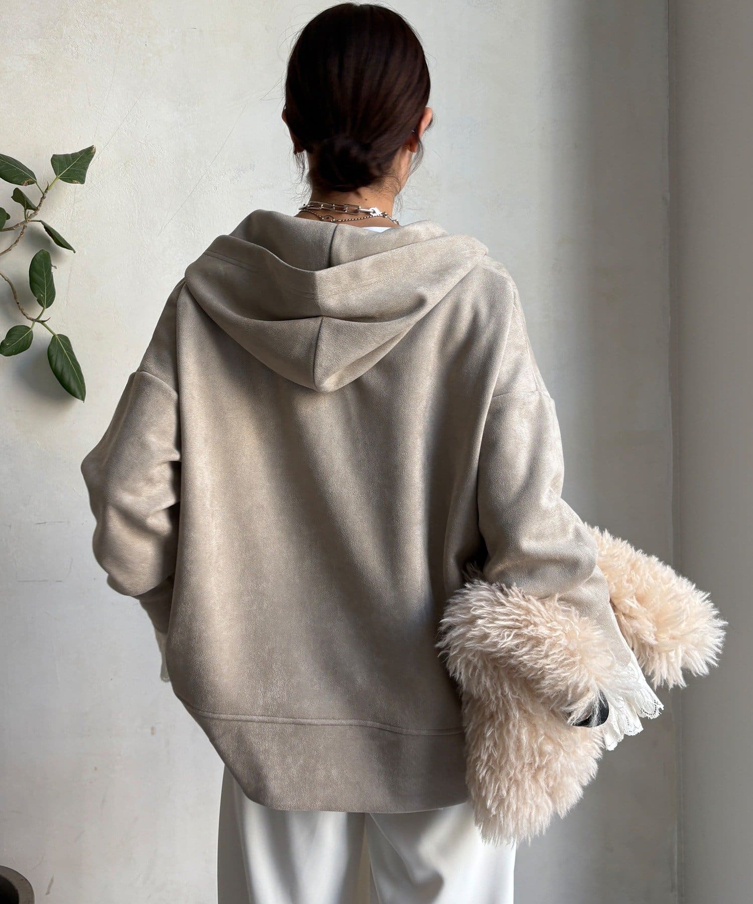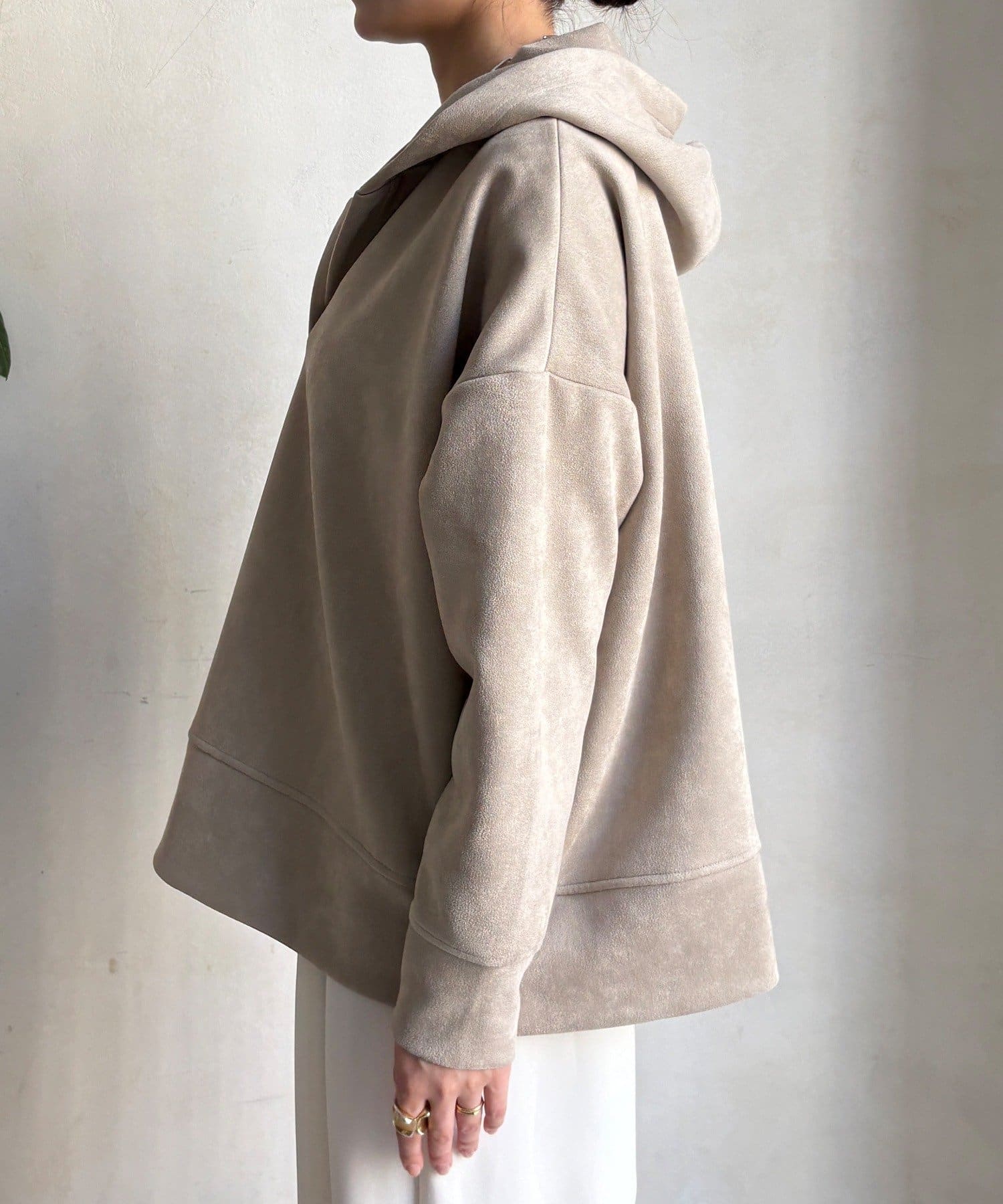 柔らかくスエードタッチな素材が大人っぽさを引き立てるオーバーサイズフーディー。