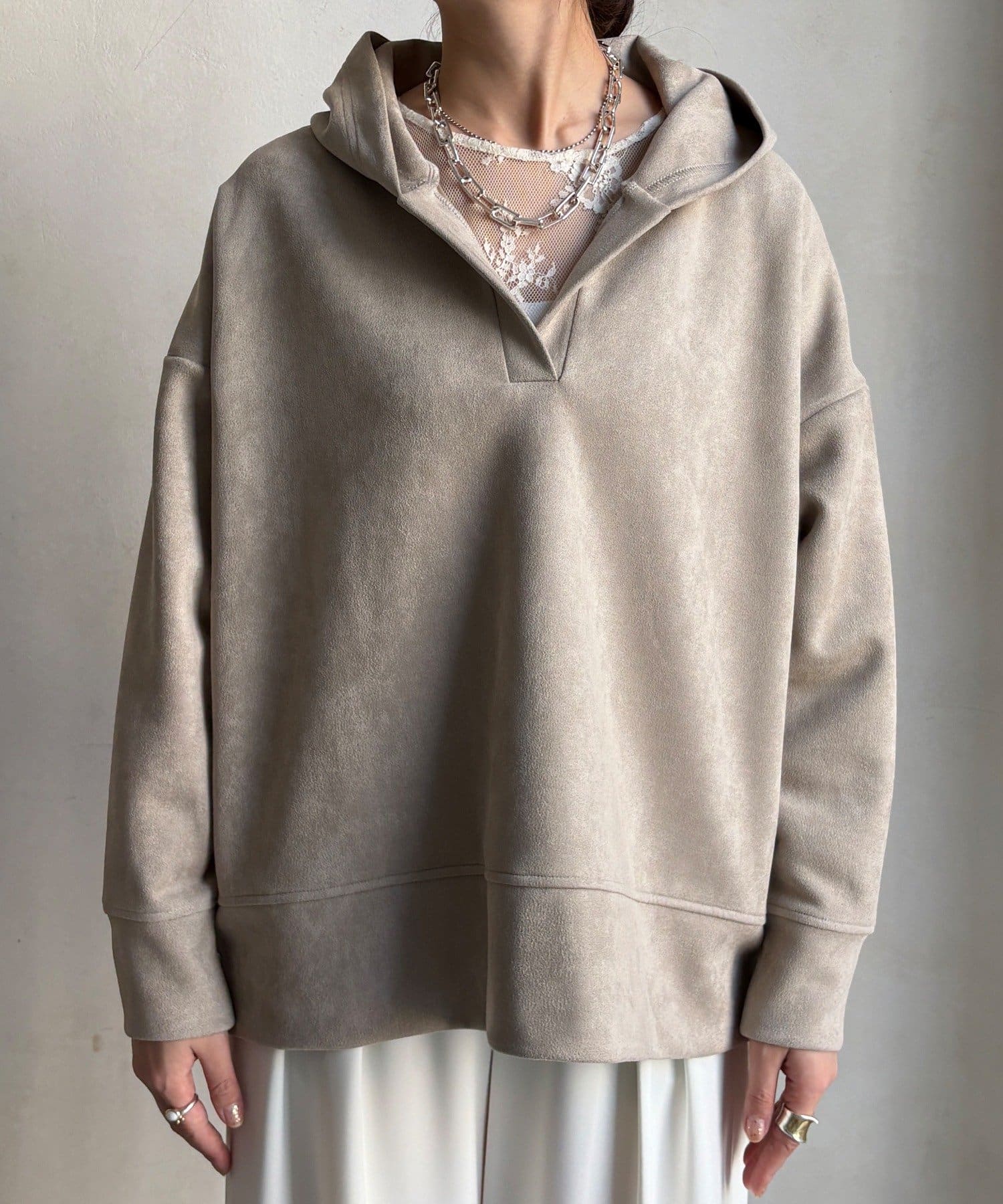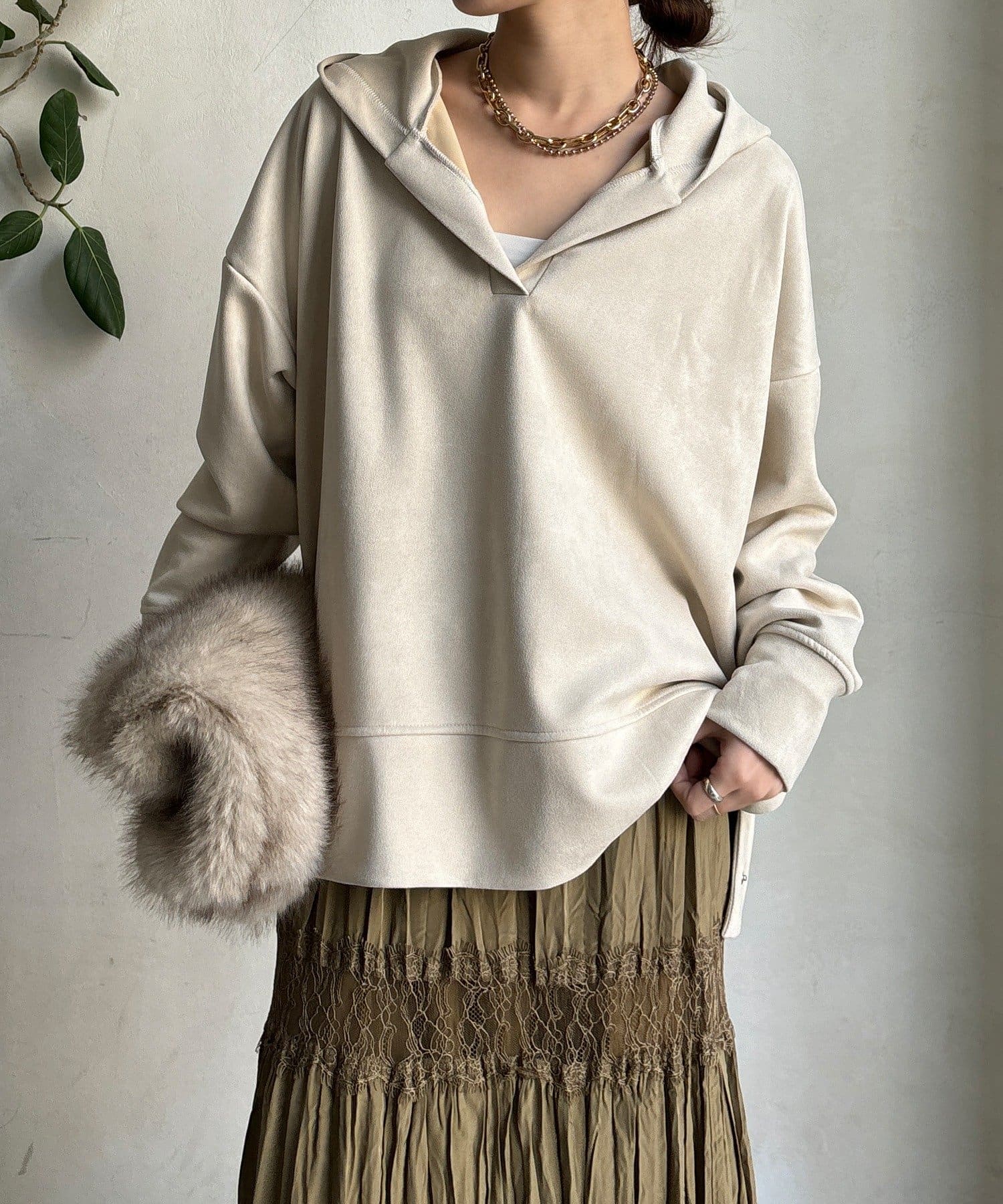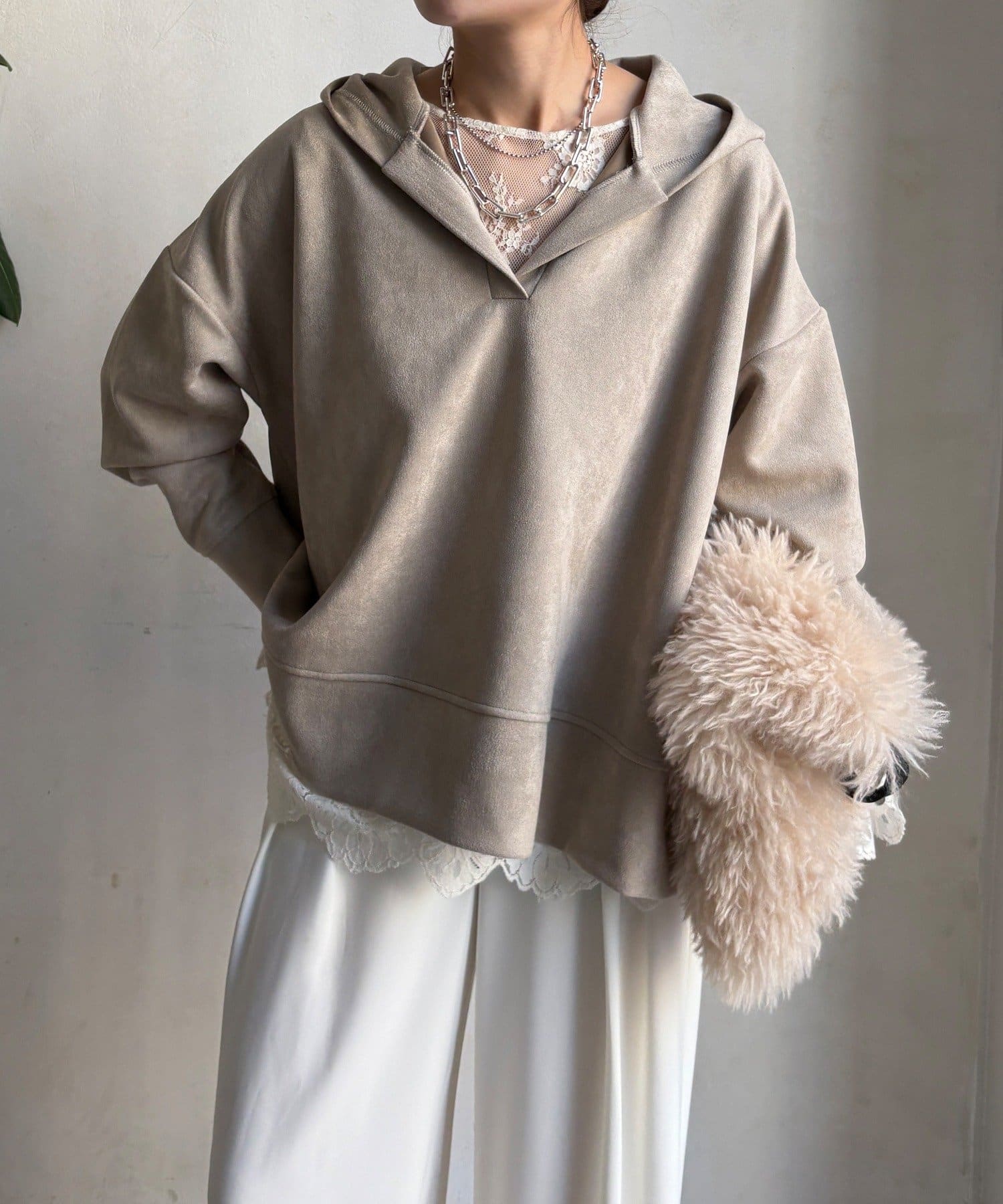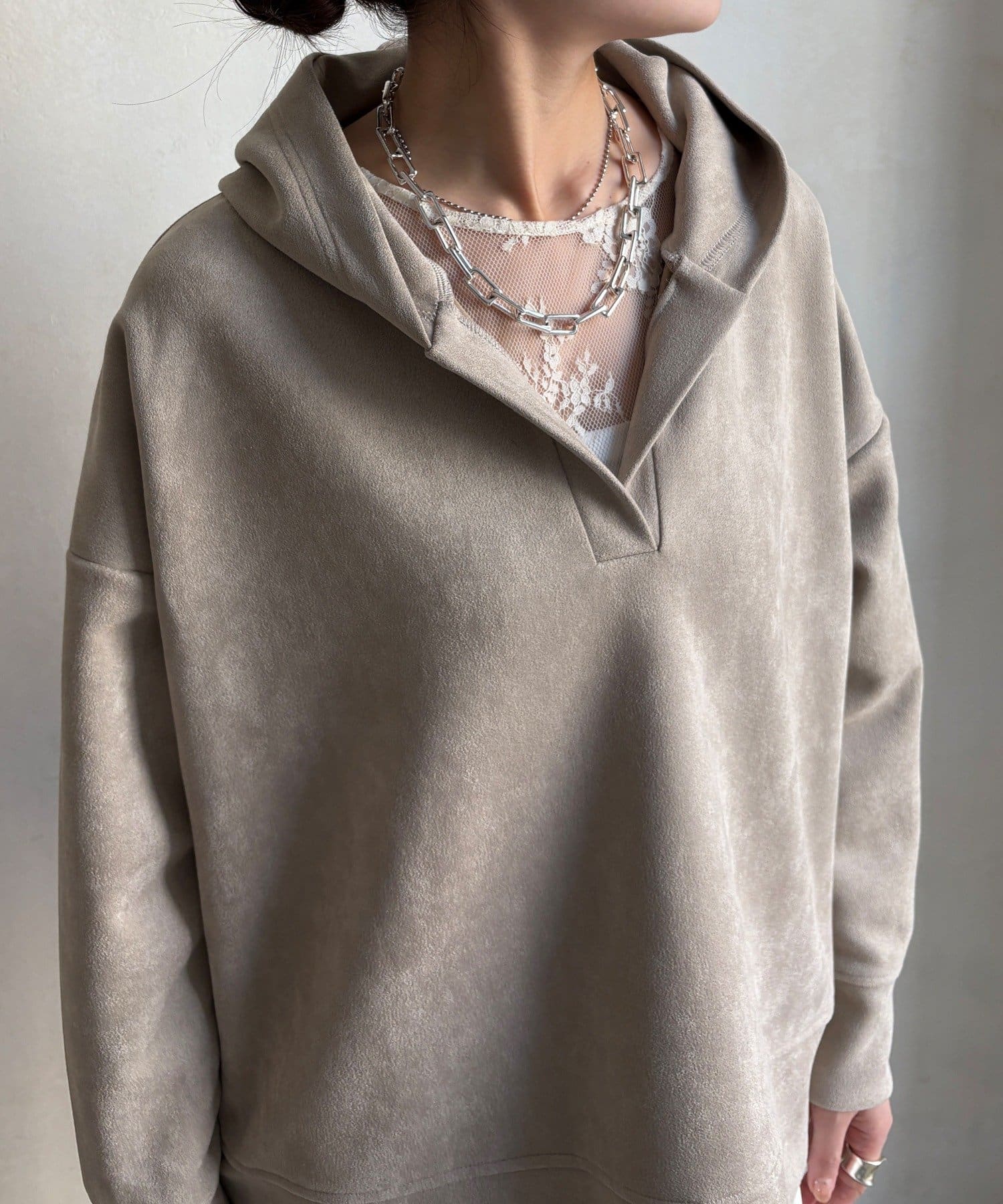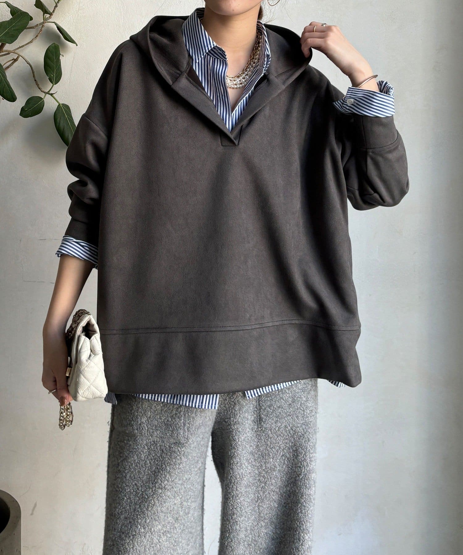 柔らかくスエードタッチな素材が大人っぽさを引き立てるオーバーサイズフーディー。