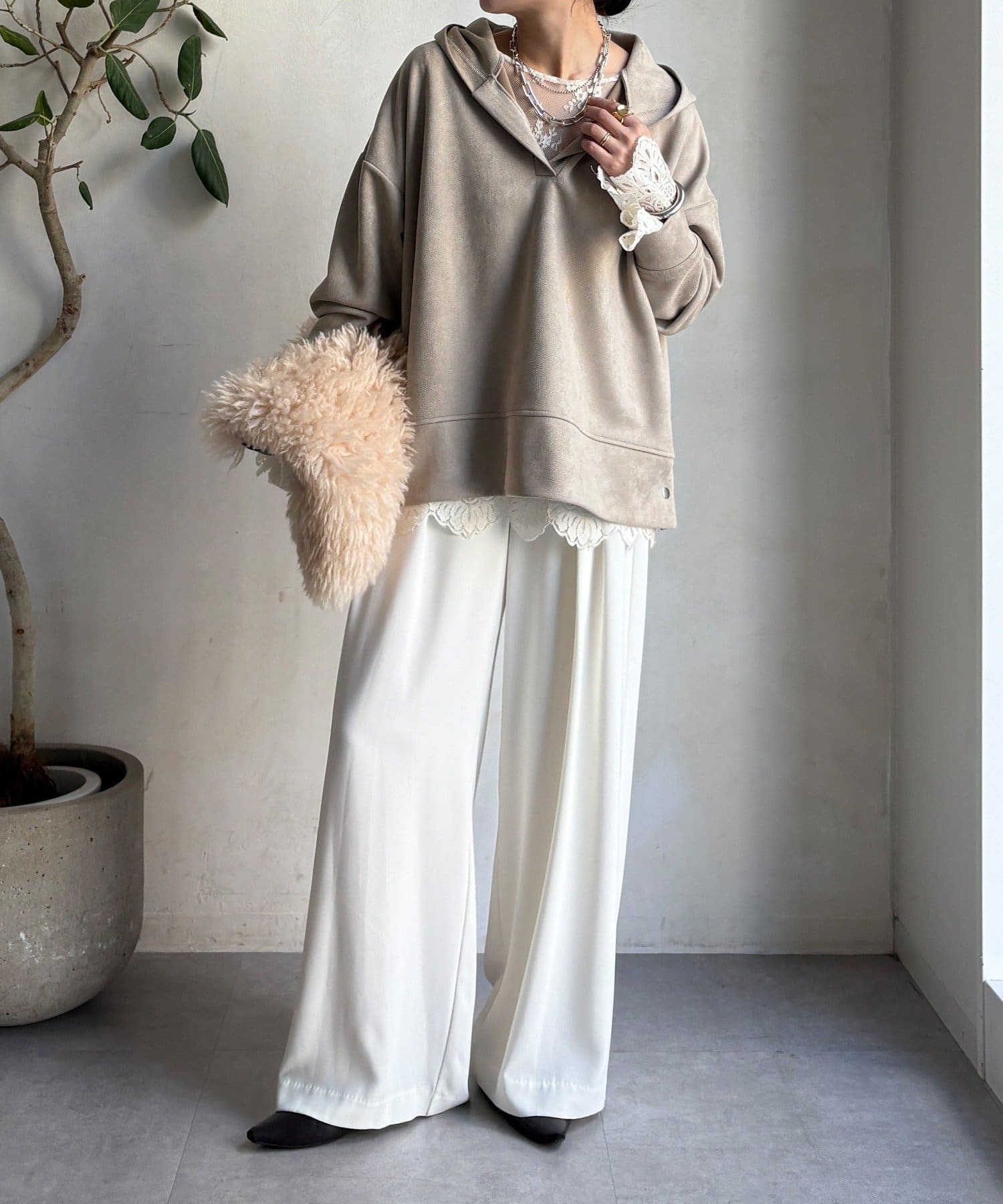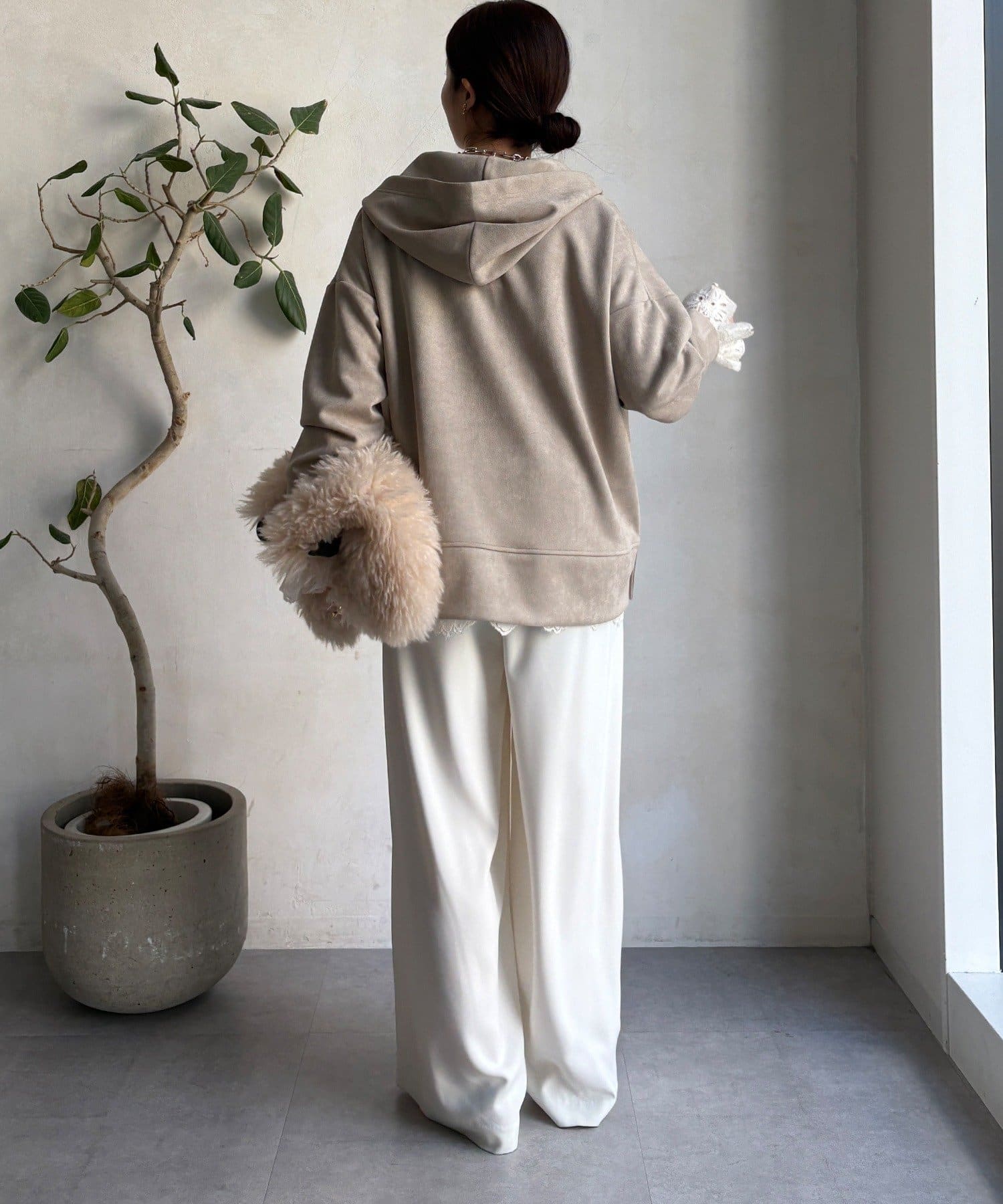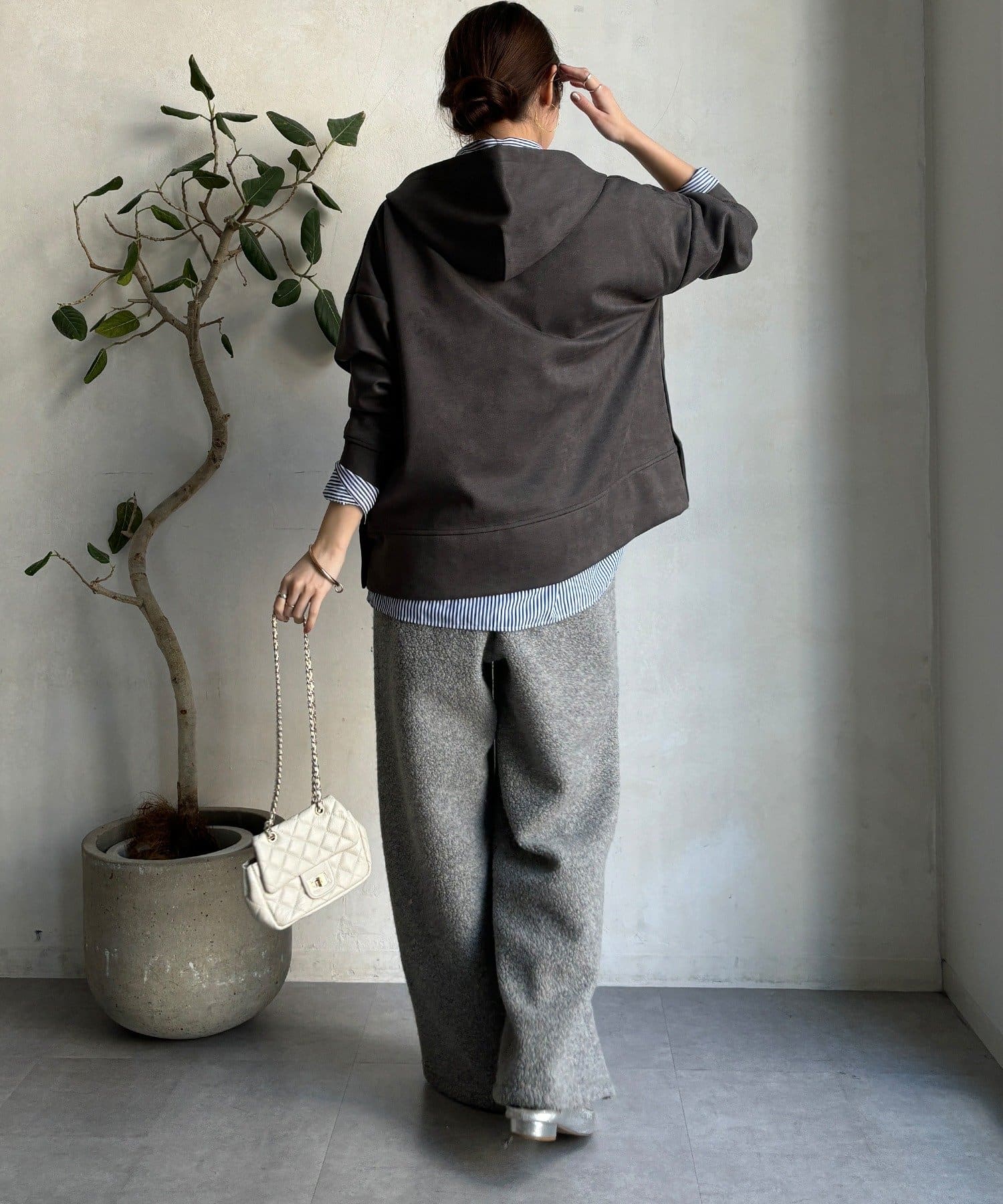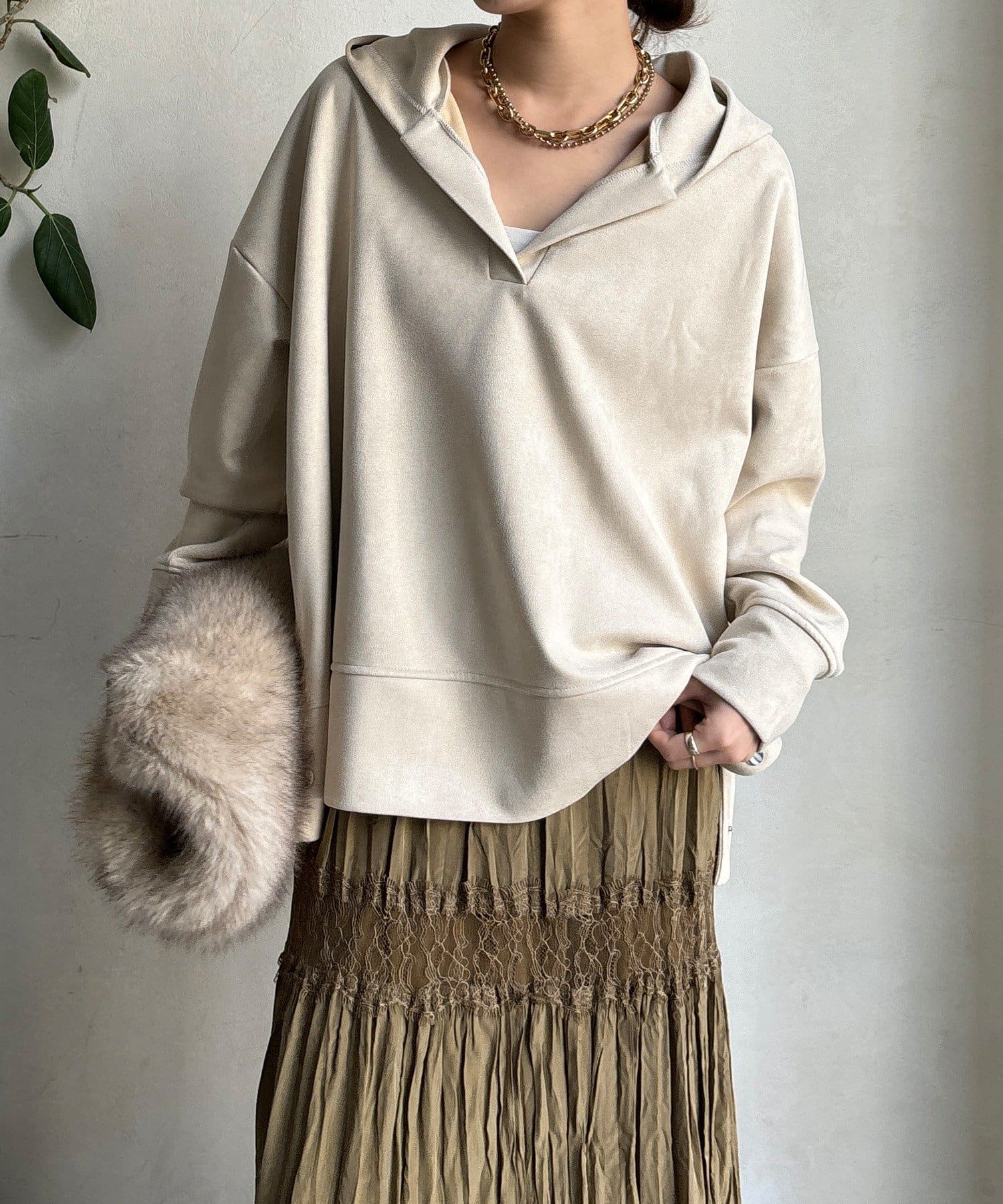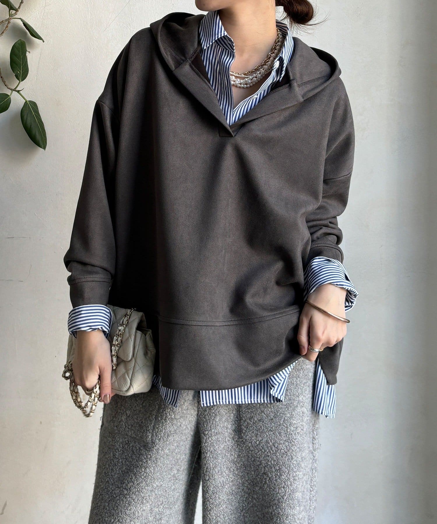 柔らかくスエードタッチな素材が大人っぽさを引き立てるオーバーサイズフーディー。