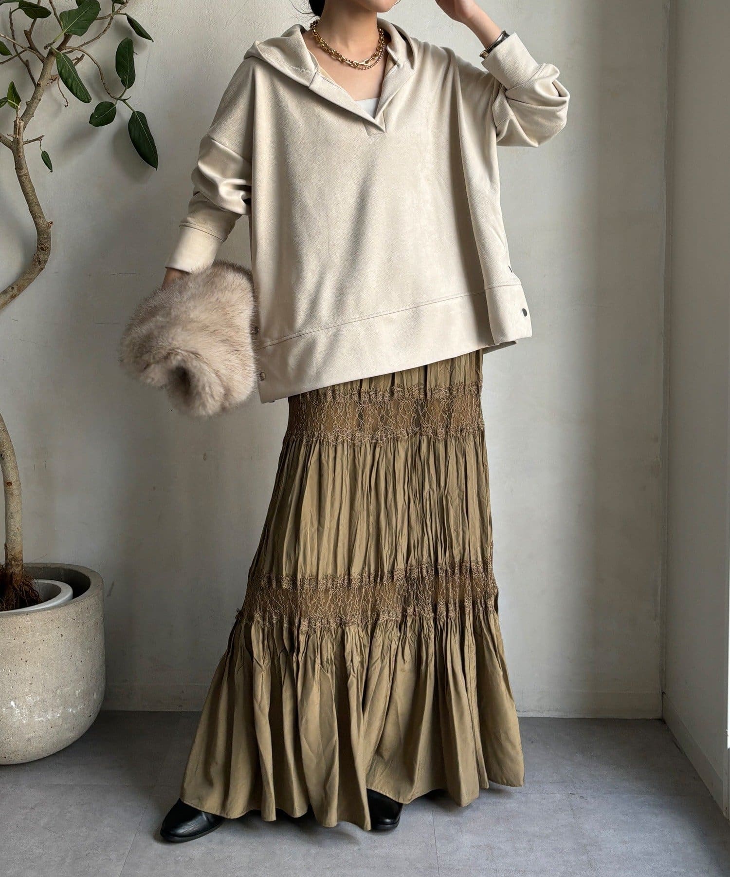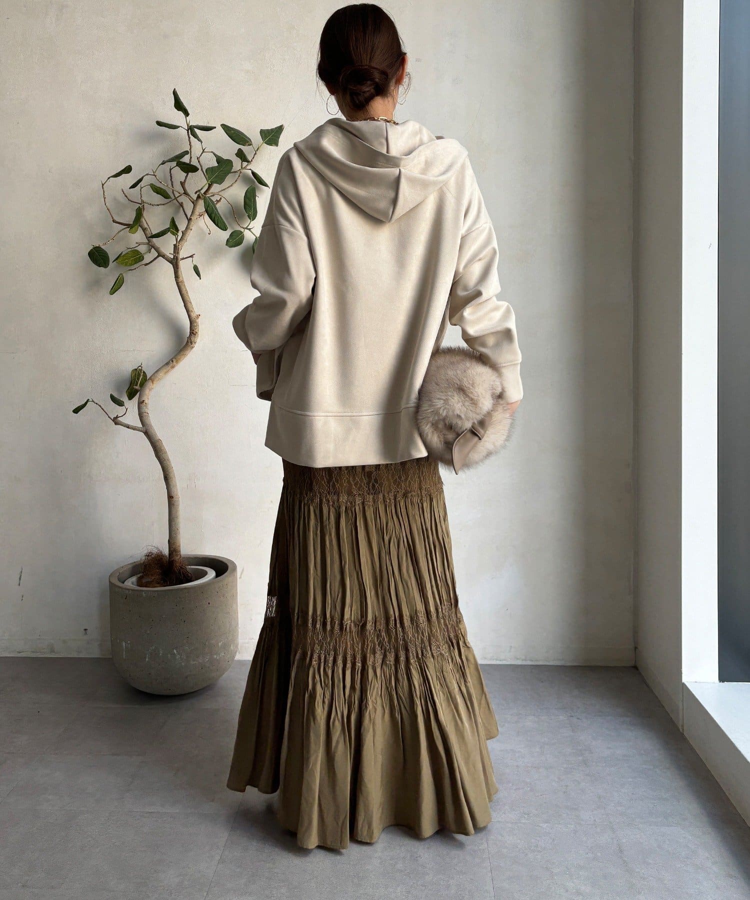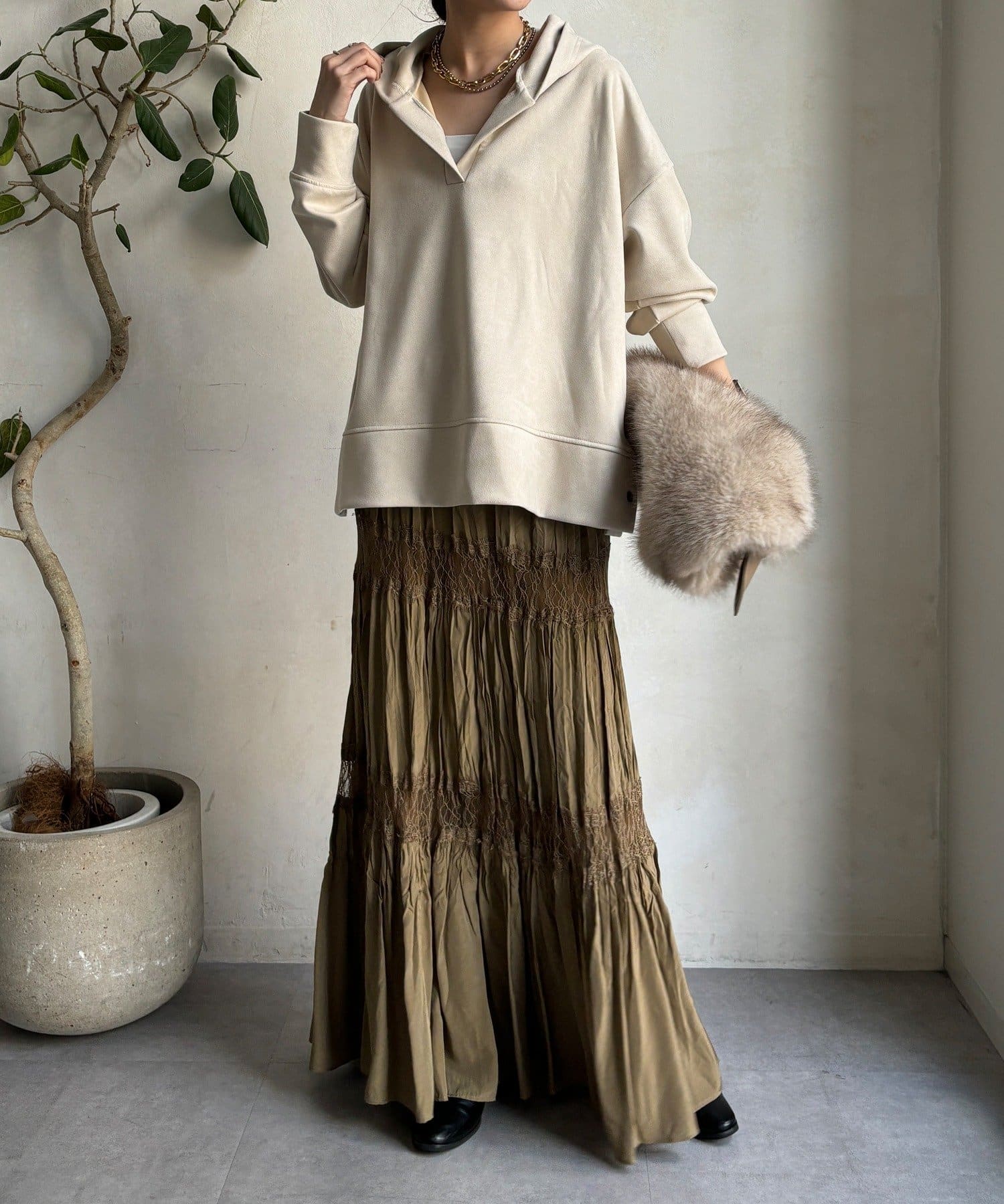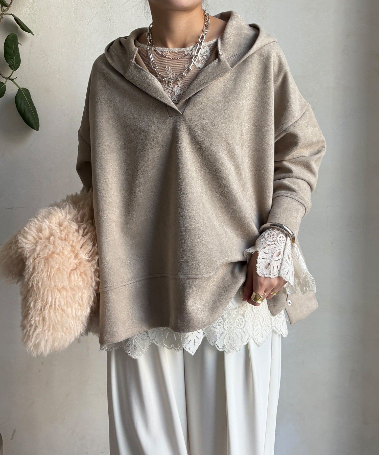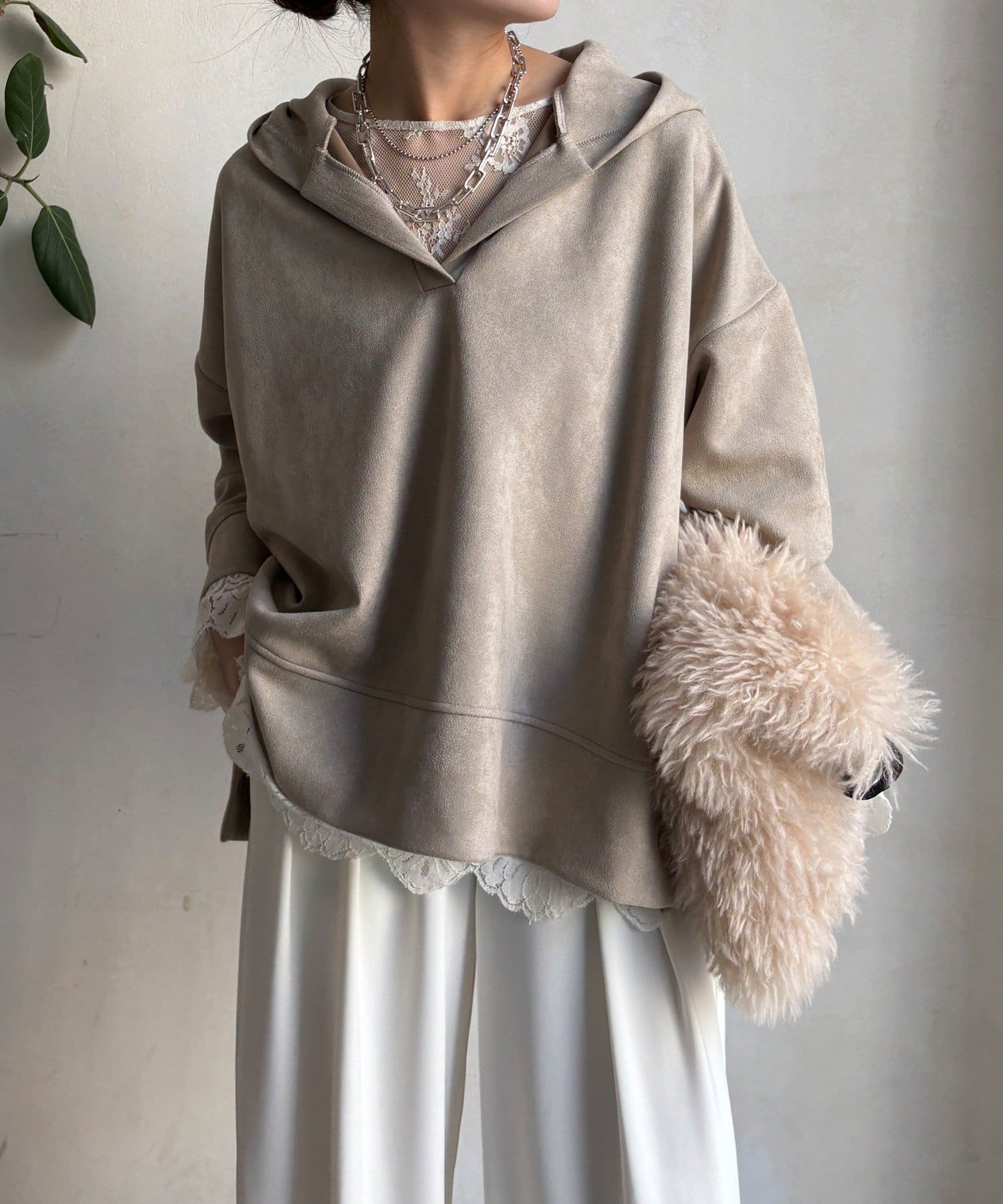 柔らかくスエードタッチな素材が大人っぽさを引き立てるオーバーサイズフーディー。